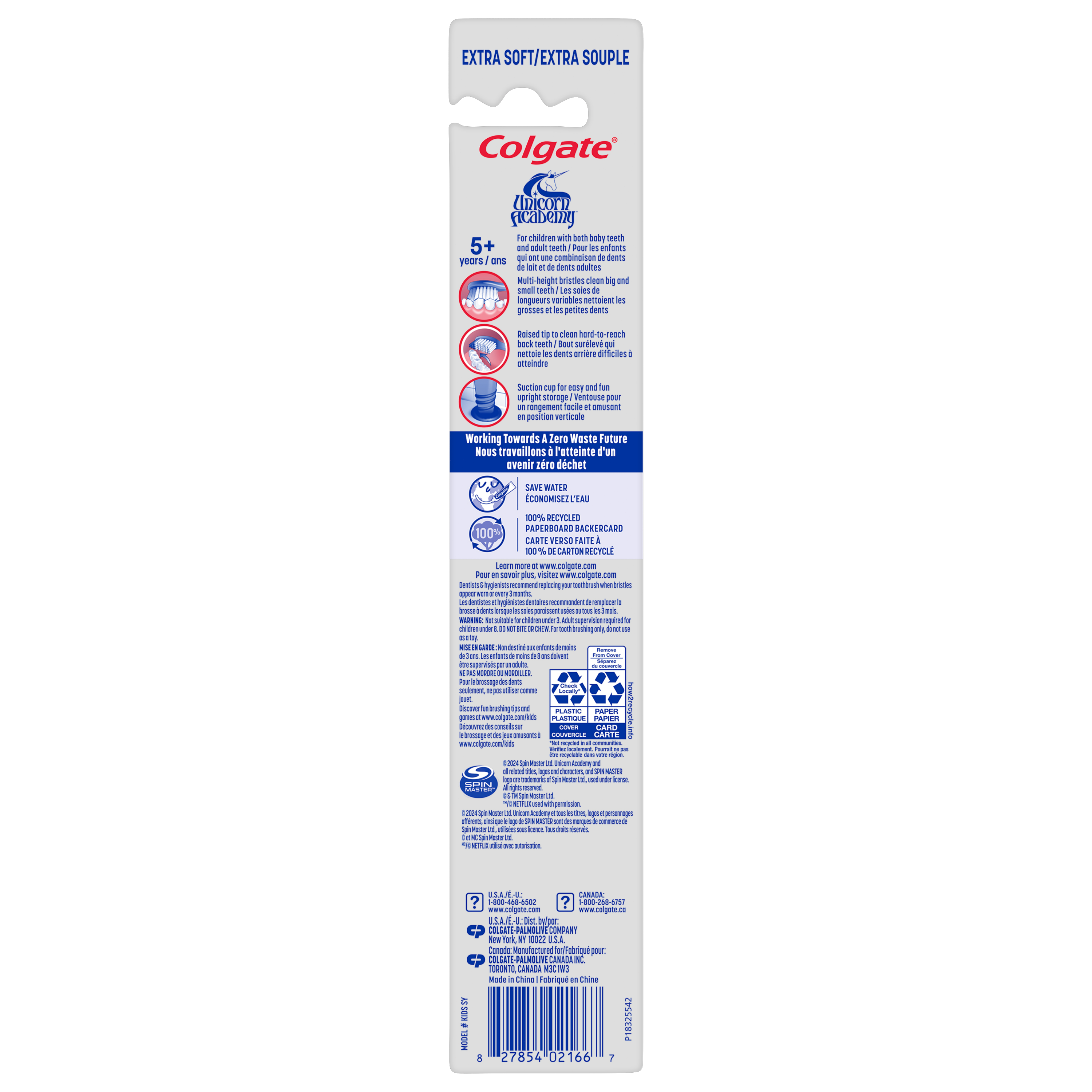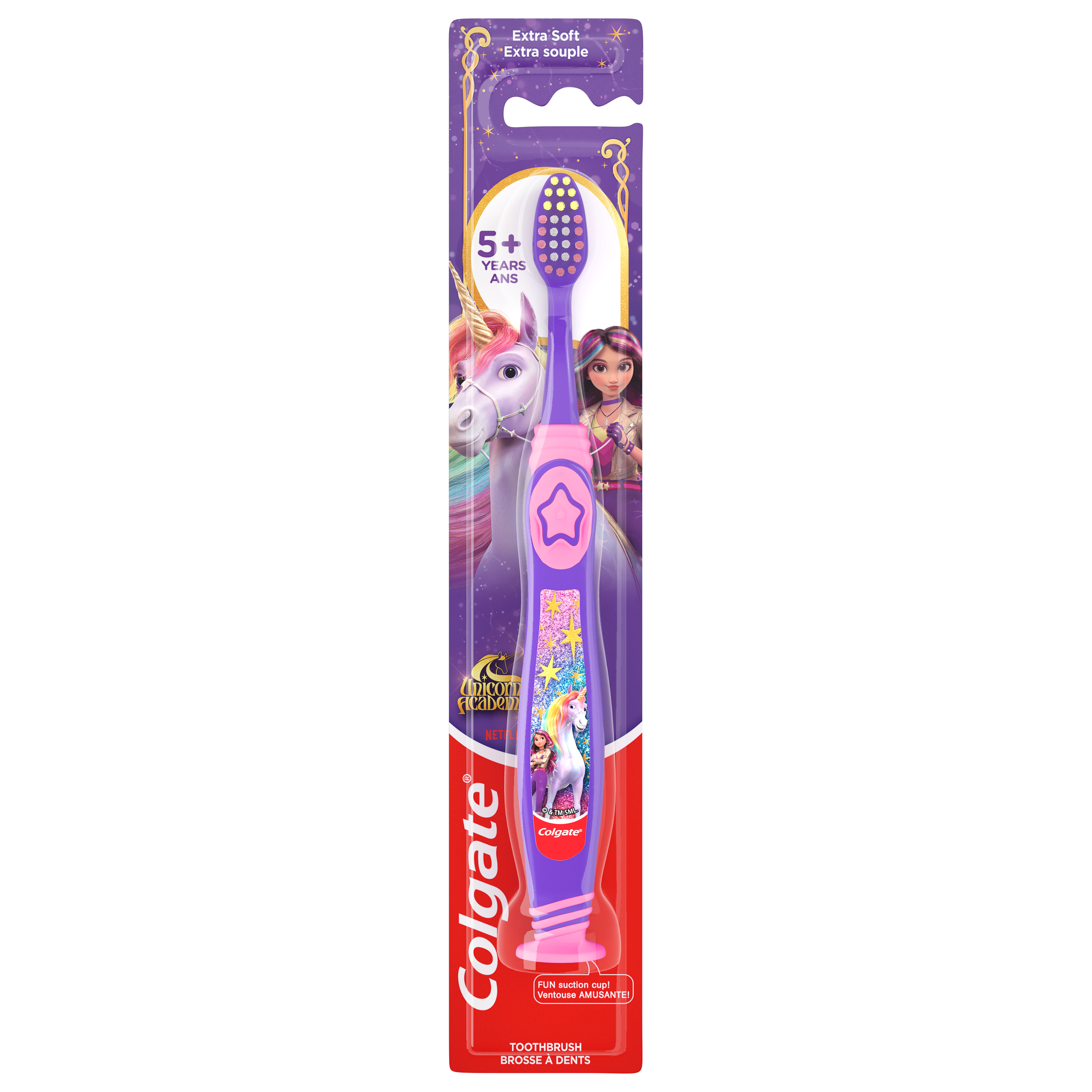 SKU 61038327 Consumer Unit - GTIN 00827854021667 Case - GTIN 10827854021664 Product Category Oral Care Product Sub Category Manual TB Product Equity (Brand) Colgate Product Sub Brand Colgate Kids Man TB Product Title Colgate Kids Manual Unicorn Toothbrush, 1 Ct Product Description The Colgate Kids Manual Unicorn Toothbrush is the perfect kids toothbrush to encourage good oral habits early on! This pink, unicorn themed childrens toothbrush is uniquely designed to make brushing fun and easy. Designed for kids ages 5 and older, the extra soft toothbrush bristles provide effective yet gentle cleaning making it a great manual toothbrush for kids. Plus, this extra soft bristled toothbrush for kids is great for children with both baby and adult teeth and the soft tongue cleaner on the back of the toothbrush head helps clean beyond teeth. The Colgate Kids Manual Unicorn Toothbrush is designed to make teeth brushing fun and easy. This kids toothbrush with suction cup features a raised tip and multi-height bristles to clean big and small teeth in hard-to-reach places, a soft tongue cleaner, a suction cup for easy and fun upright storage, a thumb rest, and a rounded handle for a comfortable grip. Keep kids engaged in their brushing habits with the Colgate Kids Manual Unicorn Toothbrush. At Colgate, we’re making kids toothbrushes more fun because we know the power of a healthy smile. Our children’s oral health initiative, Bright Smiles, Bright Futures, has impacted the lives of more than a billion children by providing free oral health education and dental care in over 80 countries. As the world leader in oral care, Colgate is committed to improving children's oral health around the world. Bullet 1 Includes one (1) individual Colgate Kids Manual Unicorn Toothbrush Bullet 2 This kids toothbrush features a thumb rest for great control when brushing and comes with a built-in suction cup for easy and fun upright storage Bullet 3 Designed for kids ages 5 and older, the extra soft bristled unicorn toothbrush gently cleans teeth and gums Bullet 4 Features a comfortable thumb grip and rounded easy-to-hold handles that are perfect for little hands to use Bullet 5 Multi-height extra soft bristled toothbrush cleans both baby teeth and adult teeth and uses a raised tip to clean hard-to-reach back teeth Bullet 6 Tongue cleaner on the back of this pink unicorn toothbrush helps clean beyond teeth Bullet 7 The small kids toothbrush head easily fits in little mouths and can help reach back teeth to help brush in hard-to-reach places