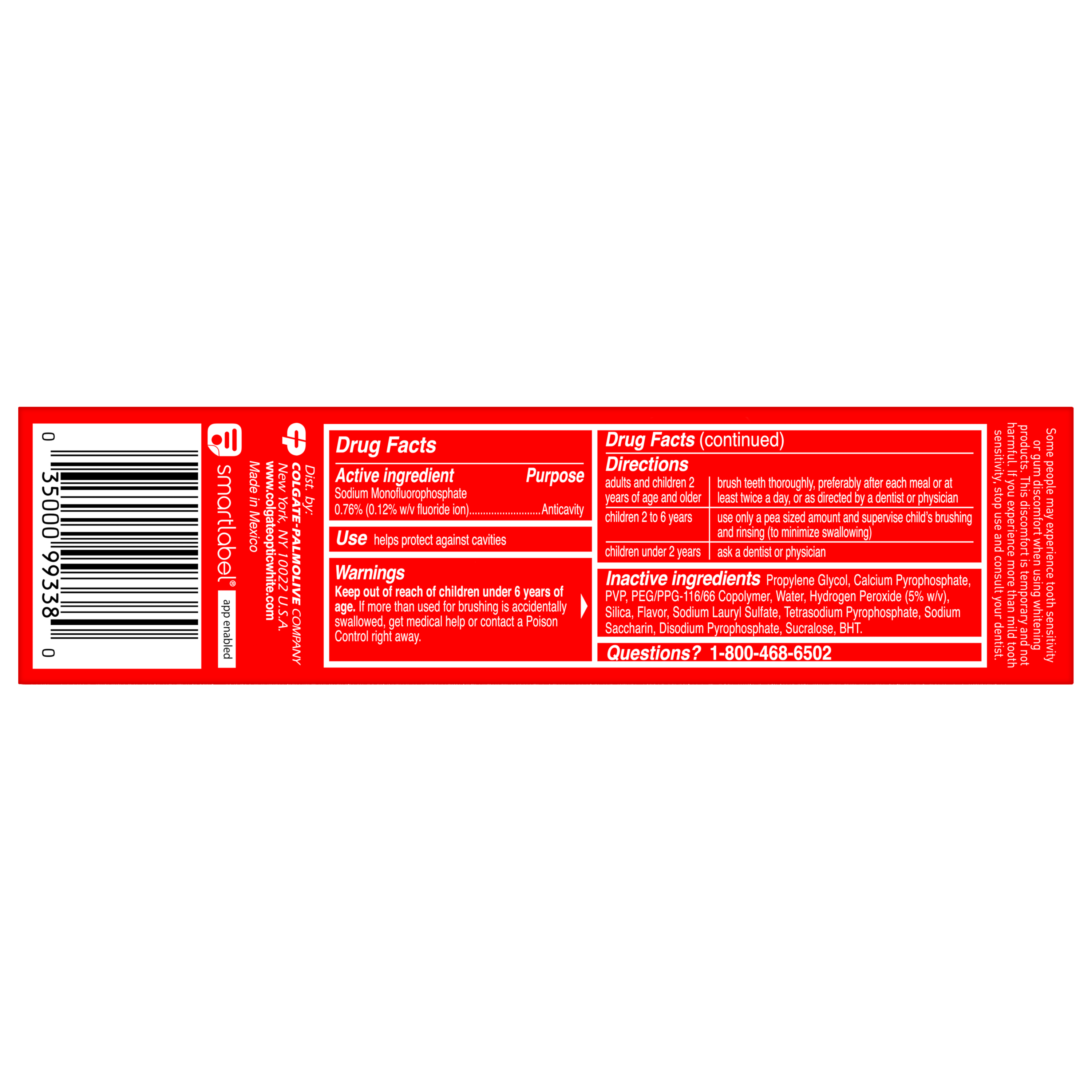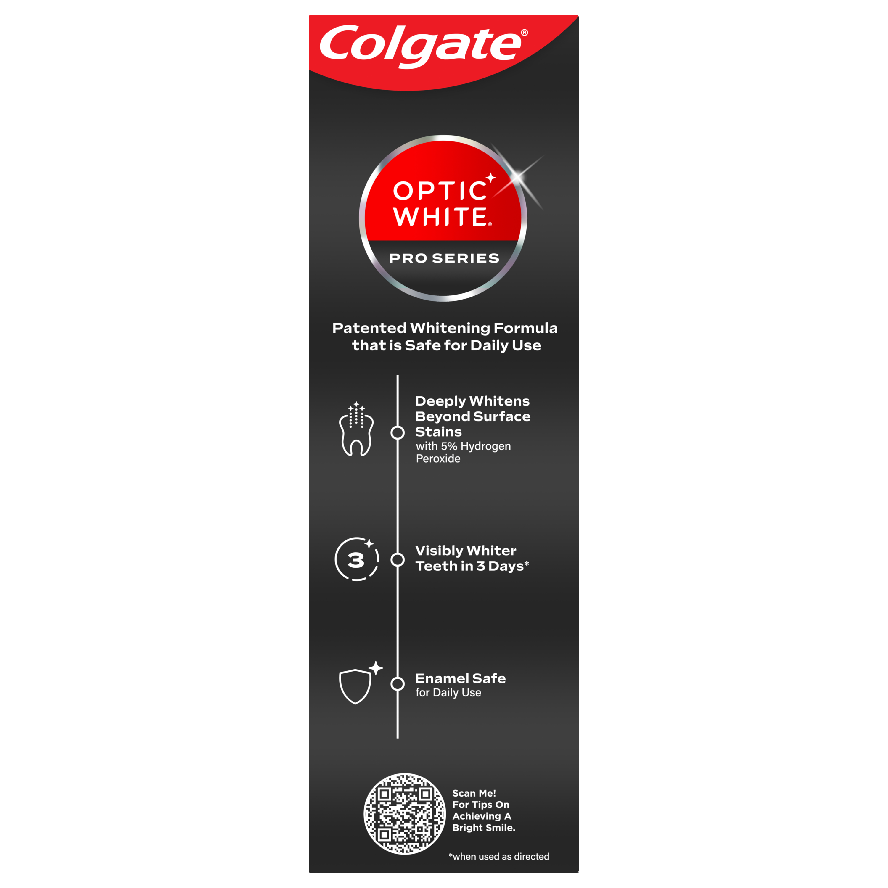 SKU 61038577 Consumer Unit - GTIN 00035000993380 Case - GTIN 10827854012068 Product Category Oral Care Product Sub Category Toothpaste Product Equity (Brand) Colgate Product Sub Brand Colgate Optic White TP Product Title Colgate Optic White Pro Series Stain Prevention Hydrogen Peroxide Toothpaste Product Description Experience visibly whiter teeth in 3 days* with Colgate Optic White Pro Series Stain Prevention Hydrogen Peroxide Toothpaste. Use this teeth whitening toothpaste with a 5% hydrogen peroxide-based formula to deeply whiten beyond surface stains. Colgate Optic White Pro Series Stain Prevention Toothpaste effectively removes tea, coffee, and wine stains so you can achieve a white smile. Colgate Optic White Pro Series Hydrogen Peroxide Toothpaste is a patented whitening toothpaste with 5% hydrogen peroxide that deeply whitens and is enamel-safe. This teeth whitening toothpaste is also an anticavity fluoride toothpaste to help prevent cavities. For whitening that works, choose the Colgate Optic White Pro Series Stain Prevention Hydrogen Peroxide Toothpaste. Reveal a smile that dazzles with Colgate Optic White Pro Series Toothpaste. Use this expert level whitening toothpaste for a vibrant glow and visibly whiter teeth*. Colgate Optic White Pro Series Hydrogen Peroxide Toothpaste is a gluten free, sugar free, and vegan toothpaste that has a refreshing mint toothpaste flavor. Unlock a bright, radiant smile with the Colgate Optic White Pro Series Stain Prevention Hydrogen Peroxide Toothpaste. *when used as directed eCommerce Copy- Long Description Experience visibly whiter teeth in 3 days* with Colgate Optic White Pro Series Stain Prevention Hydrogen Peroxide Toothpaste. Use this teeth whitening toothpaste with a 5% hydrogen peroxide-based formula to deeply whiten beyond surface stains. Colgate Optic White Pro Series Stain Prevention Toothpaste effectively removes tea, coffee, and wine stains so you can achieve a white smile. Whitening That Works Colgate Optic White Pro Series Hydrogen Peroxide Toothpaste is a patented whitening toothpaste with 5% hydrogen peroxide that deeply whitens and is enamel-safe. This teeth whitening toothpaste is also an anticavity fluoride toothpaste to help prevent cavities. For whitening that works, choose the Colgate Optic White Pro Series Stain Prevention Hydrogen Peroxide Toothpaste. Gluten free, Sugar Free, and Vegan Reveal a smile that dazzles with Colgate Optic White Pro Series Toothpaste. Use this expert level whitening toothpaste for a vibrant glow and visibly whiter teeth*. Colgate Optic White Pro Series Hydrogen Peroxide Toothpaste is a gluten free, sugar, free, and vegan toothpaste. Unlock a bright, radiant smile with the Colgate Optic White Pro Series Stain Prevention Hydrogen Peroxide Toothpaste. *when used as directed Bullet 1 Includes one (1) 3.0 oz tube of Colgate Optic White Pro Series Stain Prevention Hydrogen Peroxide Toothpaste Bullet 2 Experience visibly whiter teeth in 3 days* with Colgate Optic White Pro Series Toothpaste (*when used as directed) Bullet 3 This 5% hydrogen peroxide toothpaste uses a patented whitening formula that is safe for daily use and comes in a refreshing mint toothpaste flavor Bullet 4 Effectively removes tea, coffee and wine stains with the 5% hydrogen peroxide formula Bullet 5 Use this teeth whitening toothpaste to deeply whiten beyond surface stains Bullet 6 Colgate Optic White Pro Series Hydrogen Peroxide Toothpaste is an anticavity toothpaste made with fluoride to help fight cavities Bullet 7 This vegan toothpaste is gluten free, sugar free, and enamel-safe for daily use Bullet 8 For whitening that works, choose the Colgate Optic White Pro Series Stain Prevention Hydrogen Peroxide Toothpaste Active Ingredients Sodium Monofluorophosphate 0.76% (0.12% w/v fluoride ion) Amazon RPC B09FXXY3T5 AMZ URL https://www.amazon.com/dp/B09FXXY3T5 Walmart RPC 180232222 Walmart URL (Computed) https://www.walmart.com/ip/a/180232222 Target RPC 83388534 Target URL https://www.target.com/p/a/-/A-83388534