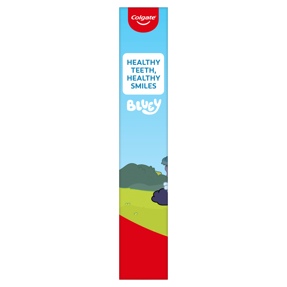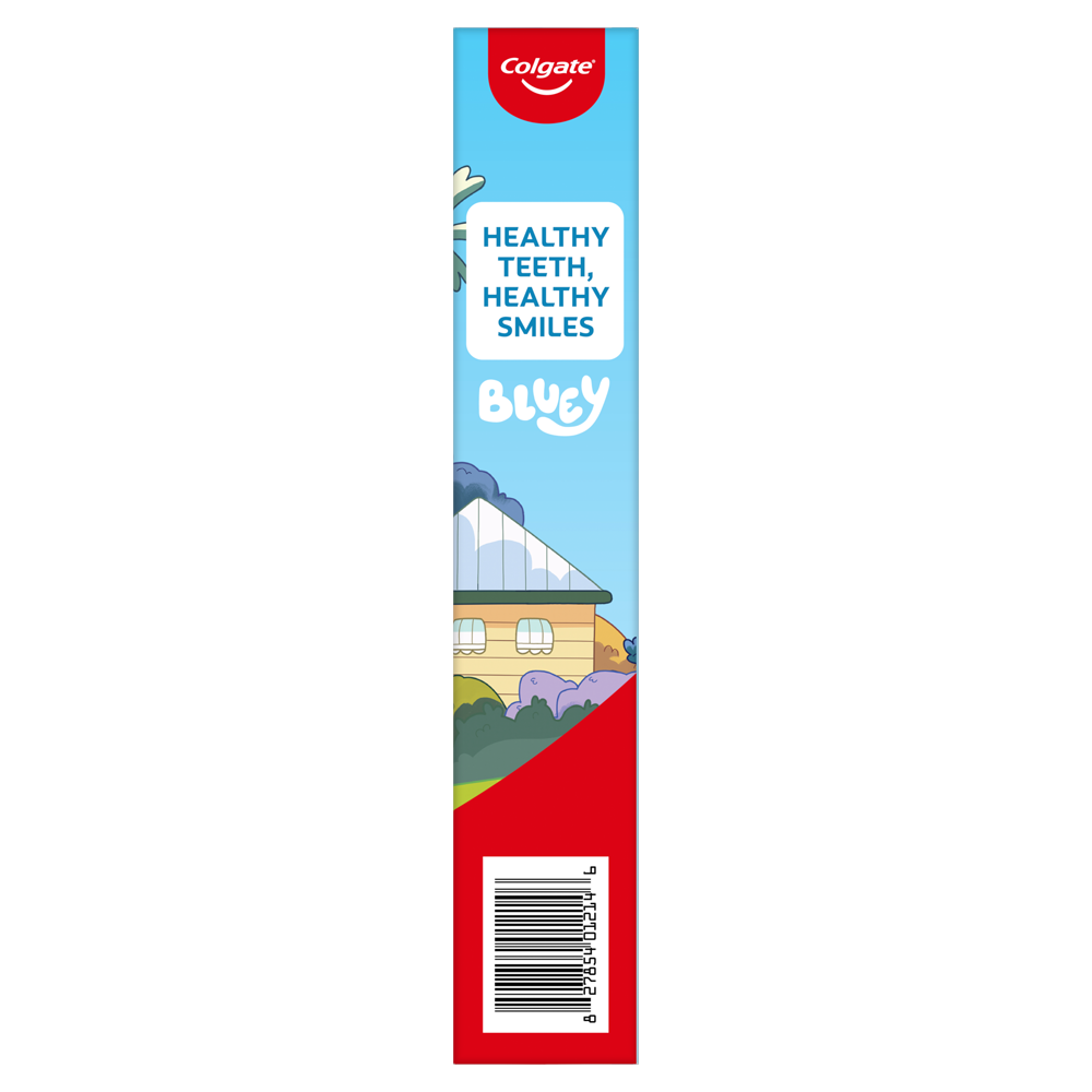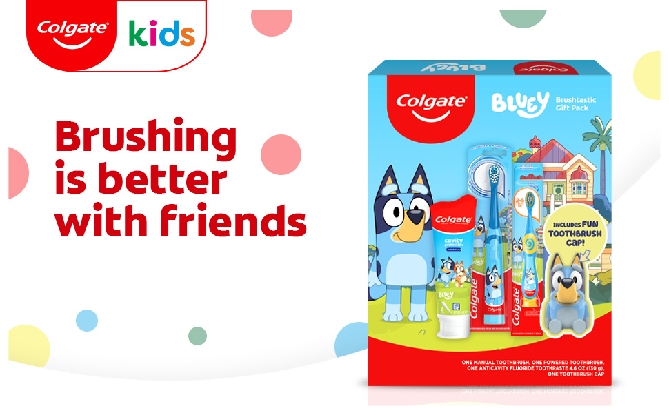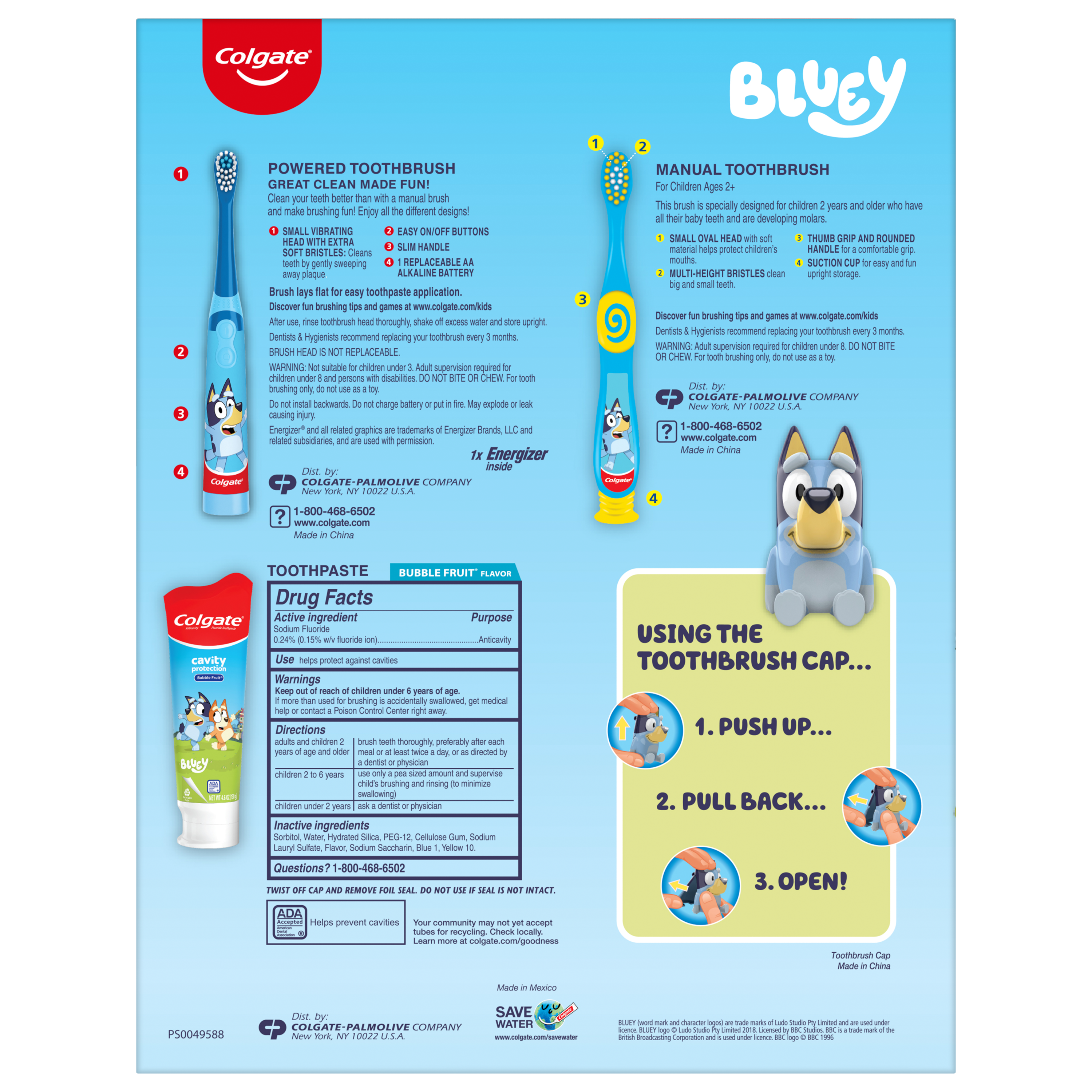 SKU 61038616 Consumer Unit - GTIN 00827854012146 Case - GTIN 10827854012143 Product Category Oral Care Product Sub Category Oral Care SUC Mixed Product Equity (Brand) Colgate Product Sub Brand Oral Care SBR Mixed Product Title Colgate Kids Toothbrush Set with Toothpaste, Bluey Gift Set, 1 manual toothbrush, one powered tootbrush and one Toothpaste Product Description Colgate Kids Toothbrush Set With Toothpaste, Bluey Gift Set, 1 Manual Toothbrush, one Powered Toothbrush and one Toothpaste Colgate is making brushing brushtastic this holiday season. The Colgate Kids Toothbrush Set With Toothpaste encourages good brushing habits while pairing kids with some of their favorite characters. Each gift pack comes with a kids battery toothbrush, a kids manual toothbrush and a kids toothpaste with a fun toothbrush cap. Choose your favorite character and get brushing! Kids Brushing Made Fun This Holiday Season Make teeth brushing fun for kids this holiday season. The Colgate kids toothbrush and toothpaste sets includes an ADA-accepted and clinically proven fluoride toothpaste to protect against cavities, reduce plaque buildup and fortify weak spots on enamel with regular brushing. Plus, its mild bubble fruit flavor tastes yummy while it works to freshen breath. Both Colgate Kids Toothbrushes have extra soft bristles that are gentle on delicate gums and growing teeth. The Colgate Kids Battery Toothbrush has a vibrating brush head to help kids brush better, while the manual toothbrush has a rounded handle and comfortable grip for when kids want to take the lead. Healthy Smiles With Colgate Bright Smiles, Bright Futures®: At Colgate, we’re making kids toothbrushes more fun because we know the power of a healthy smile. Our children’s oral health initiative, Bright Smiles, Bright Futures®, has impacted the lives of more than a billion children by providing free oral health education and dental care in over 80 countries. As the world leader in oral care, Colgate is committed to improving children's oral health around the world. Bullet 1 Each gift pack comes with a kids battery toothbrush, a kids manual toothbrush and a kids toothpaste with a fun toothbrush cap. Bullet 2 The included kids toothbrushes have extra soft bristles that sweep away plaque and clean cavity-causing bacteria from tooth surfaces. Bullet 3 The Colgate Kids Battery Toothbrush has a vibrating brush head while the manual toothbrush has a rounded handle and comfortable grip for when kids want to take the lead. Bullet 4 Kids battery toothbrush is battery operated to help kids brush better (1 AA battery included). Bullet 5 The kids cavity protection toothpaste with fluoride has a gentle formula that’s ADA-accepted and clinically proven to protect against cavities. Bullet 6 A mild bubble fruit flavor in the toothpaste tastes yummy while it works to freshen breath. Bullet 7 Give the gift of Colgate Kids and encourage good brushing habits with this special Bluey toothpaste and toothbrush set. Active Ingredients Sodium Fluoride 0.24 % (0.15% w/v fluoride ion) Amazon RPC B0D464W6CG AMZ URL https://www.amazon.com/dp/B0D464W6CG Walmart RPC 661830962 Walmart URL (Computed) https://www.walmart.com/ip/a/661830962