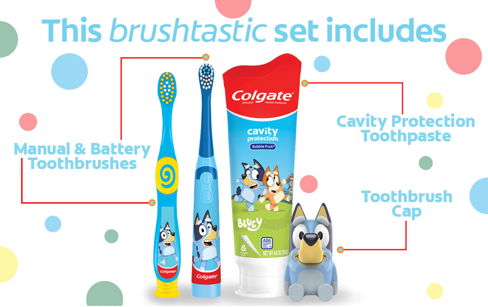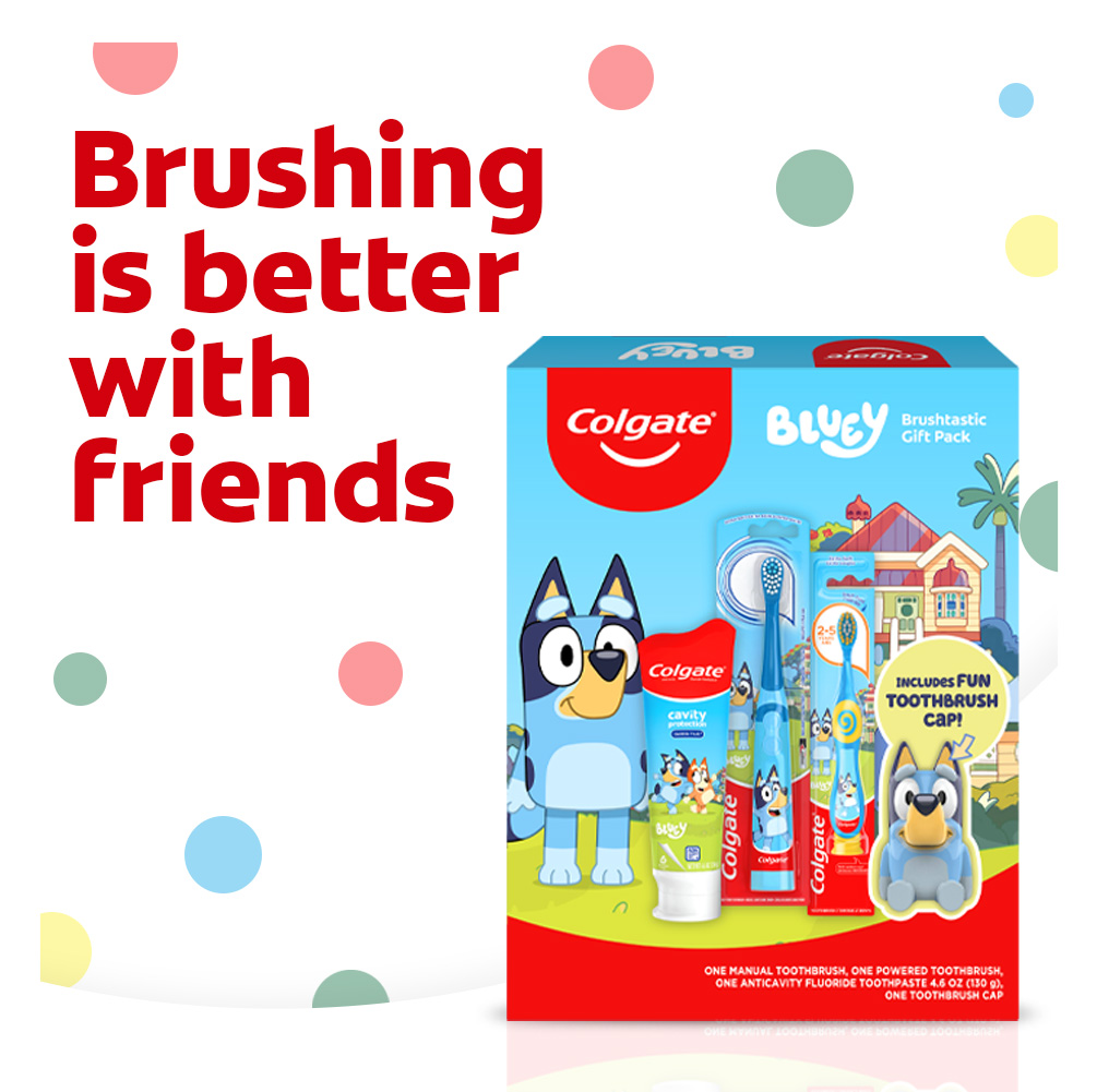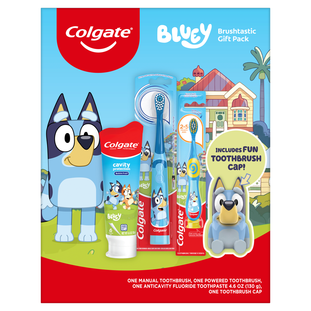 Colgate Kids Toothbrush Set with Toothpaste, Bluey Gift Set, 1 manual toothbrush, 1 powered toothbrush, 1 toothpaste, and 1 toothbrush cap