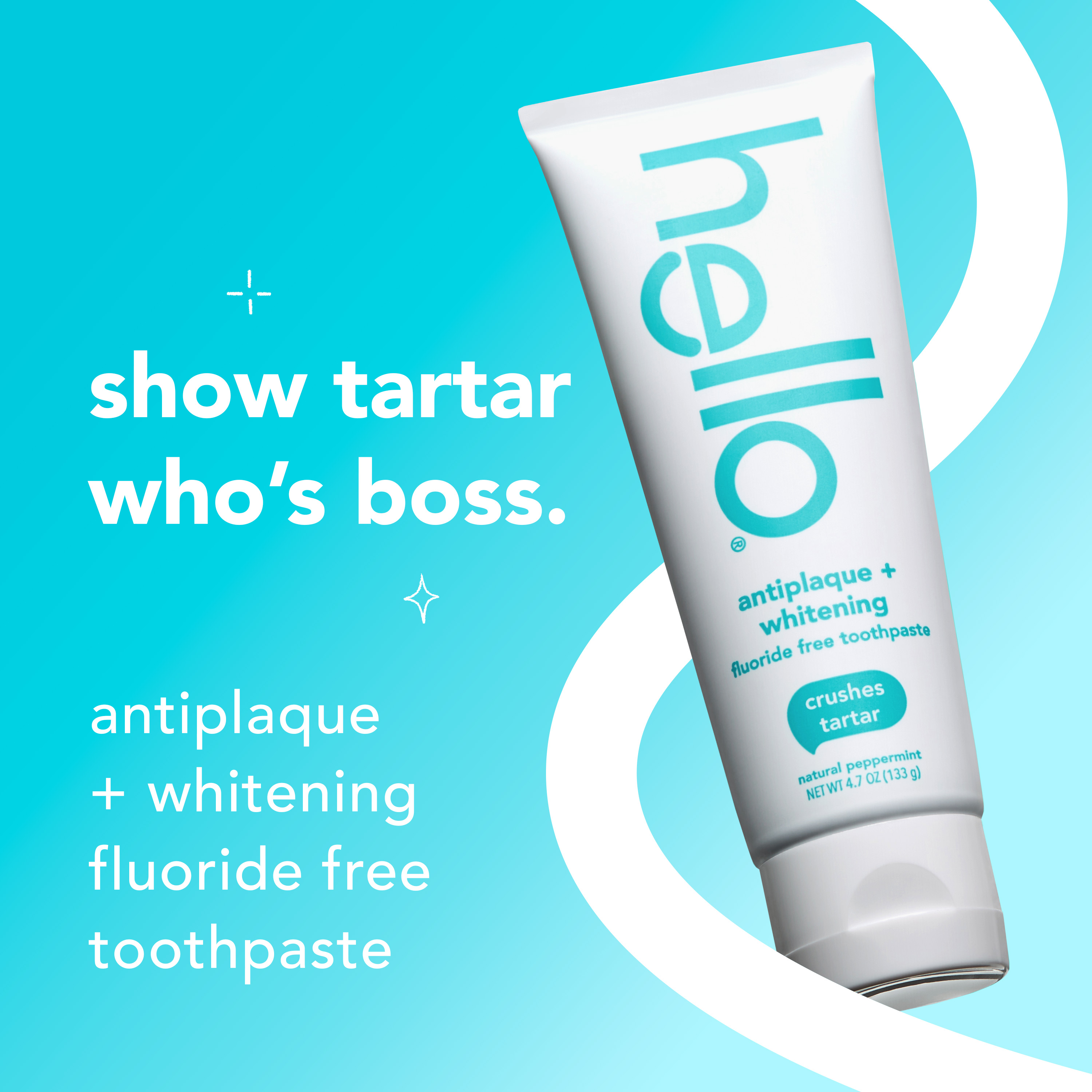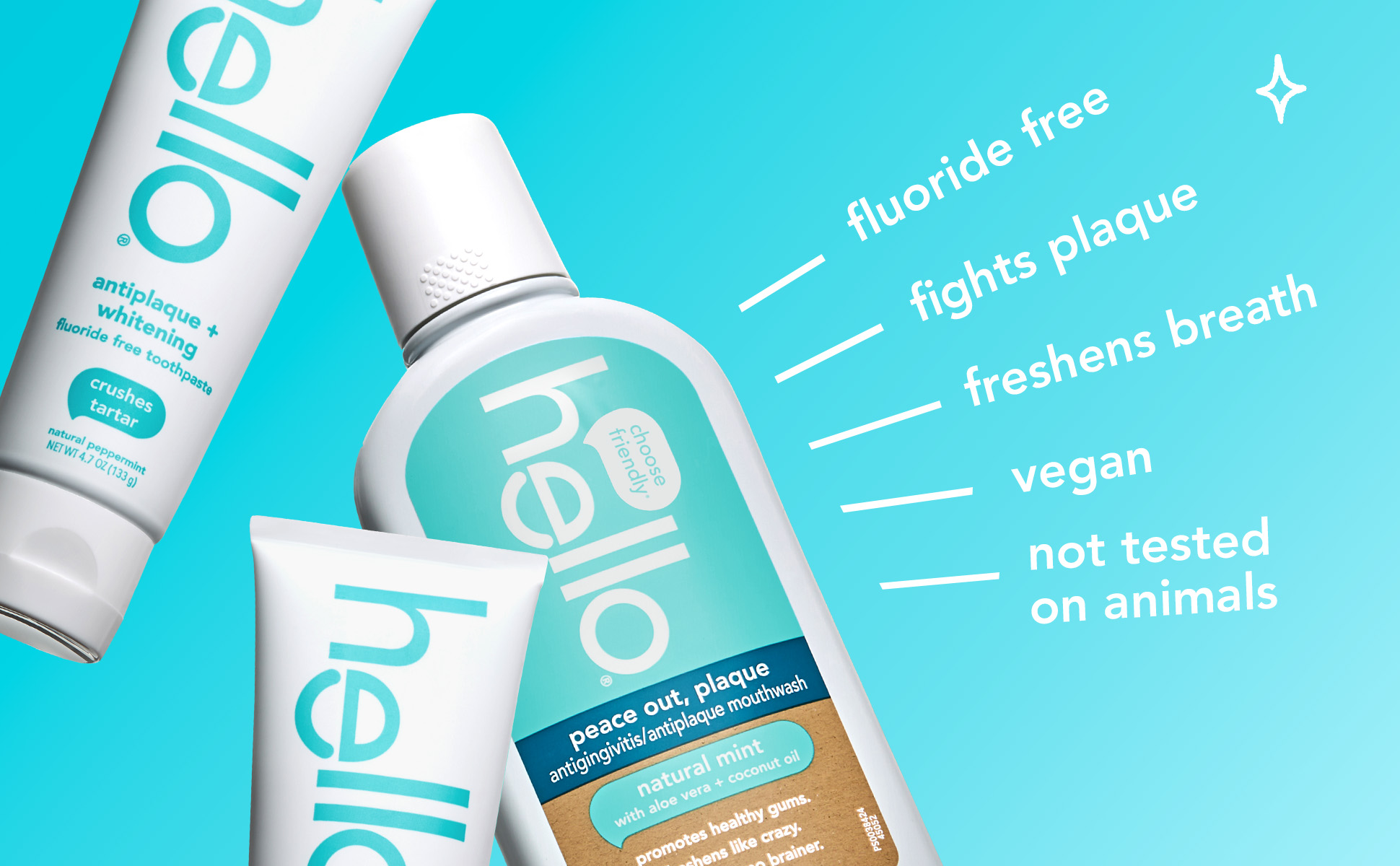 | Product Description | Say hello to a double-duty oral care combo designed to make the mundane moments magical with the hello Antiplaque Fluoride Free Whitening Toothpaste and Peace Out Plaque Alcohol Free Mouthwash* Pack. This fluoride free toothpaste pack and fluoride free mouthwash help fight plaque, freshen your breath, and brighten your smile. The fluoride free whitening toothpaste comes in a fun peppermint toothpaste flavor and is thoughtfully formulated with high quality ingredients like farm grown peppermint and coconut oil to help tame bad breath. Hello Antiplaque Fluoride Free Whitening Toothpaste can help brush away plaque so you can show tartar who’s boss, and it naturally whitens with mighty minerals by removing surface stains. This whitening toothpaste pack also includes hello Peace Out Plaque Mint Mouthwash, a no-alcohol mouthwash that kicks bad breath to the curb while also helping promote healthy gums by fighting plaque. Both are free from artificial flavors, sweeteners, SLS, dyes, and fluoride, and are not tested on animals. Give plaque the boot, promote healthy gums, freshen your breath, and smile even brighter using hello Antiplaque Fluoride Free Whitening Toothpaste and Peace Out Plaque Alcohol Free Mouthwash Pack.