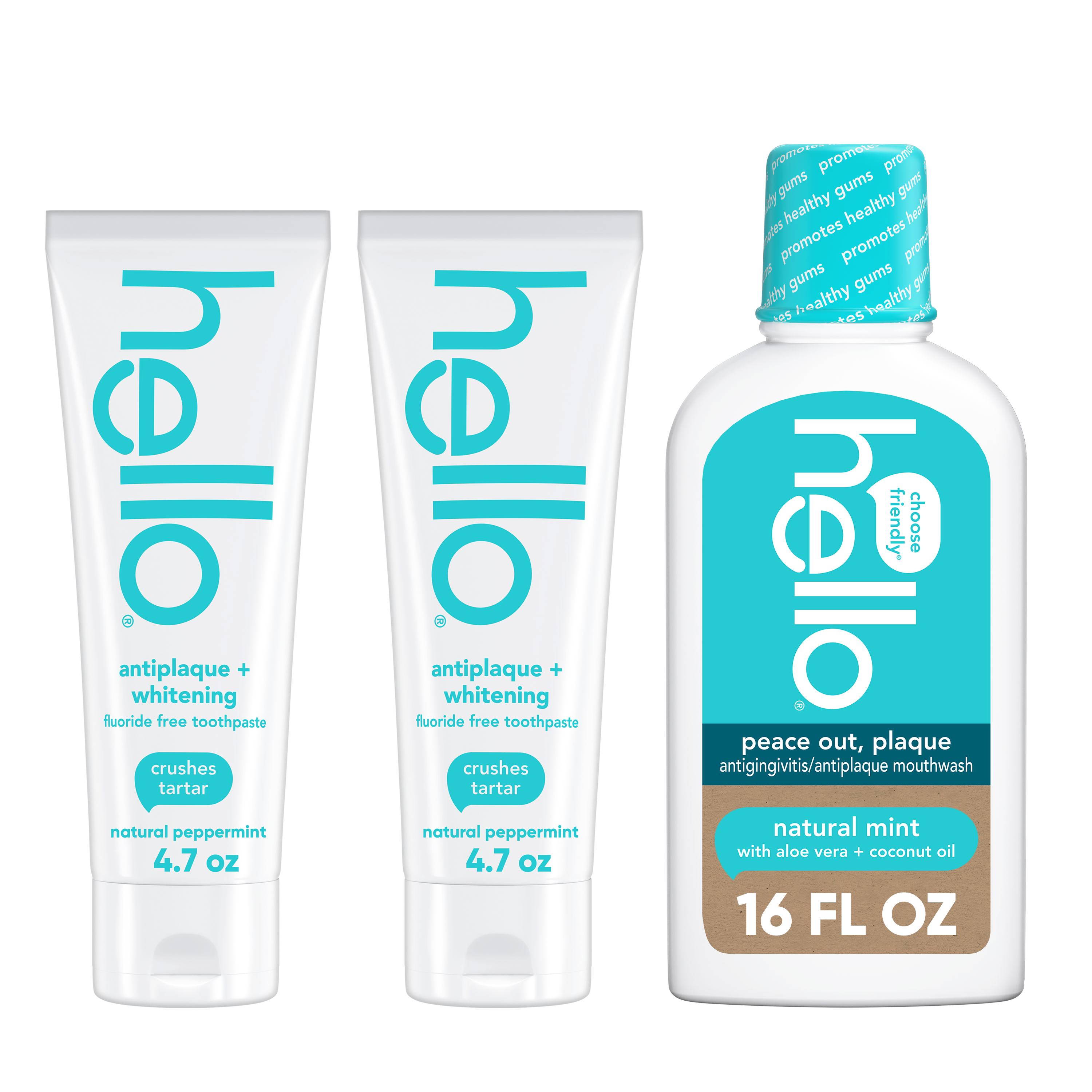| Product Title | hello Antiplaque Fluoride Free Whitening Toothpaste and Peace Out Plaque Alcohol Free Mouthwash Pack, Includes Two 4.7 Oz Fluoride Free Whitening Toothpastes and One 16 Fl Oz Fluoride Free Mouthwash |