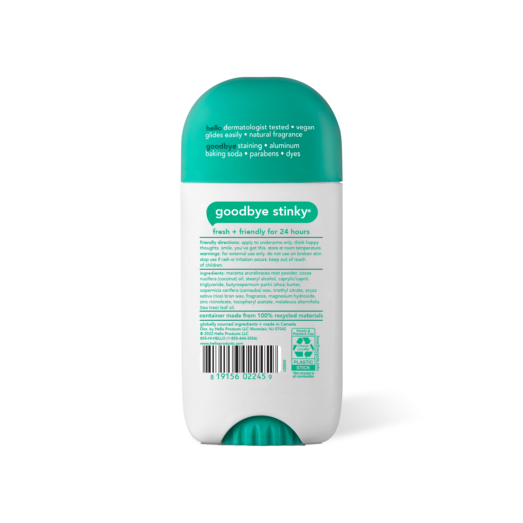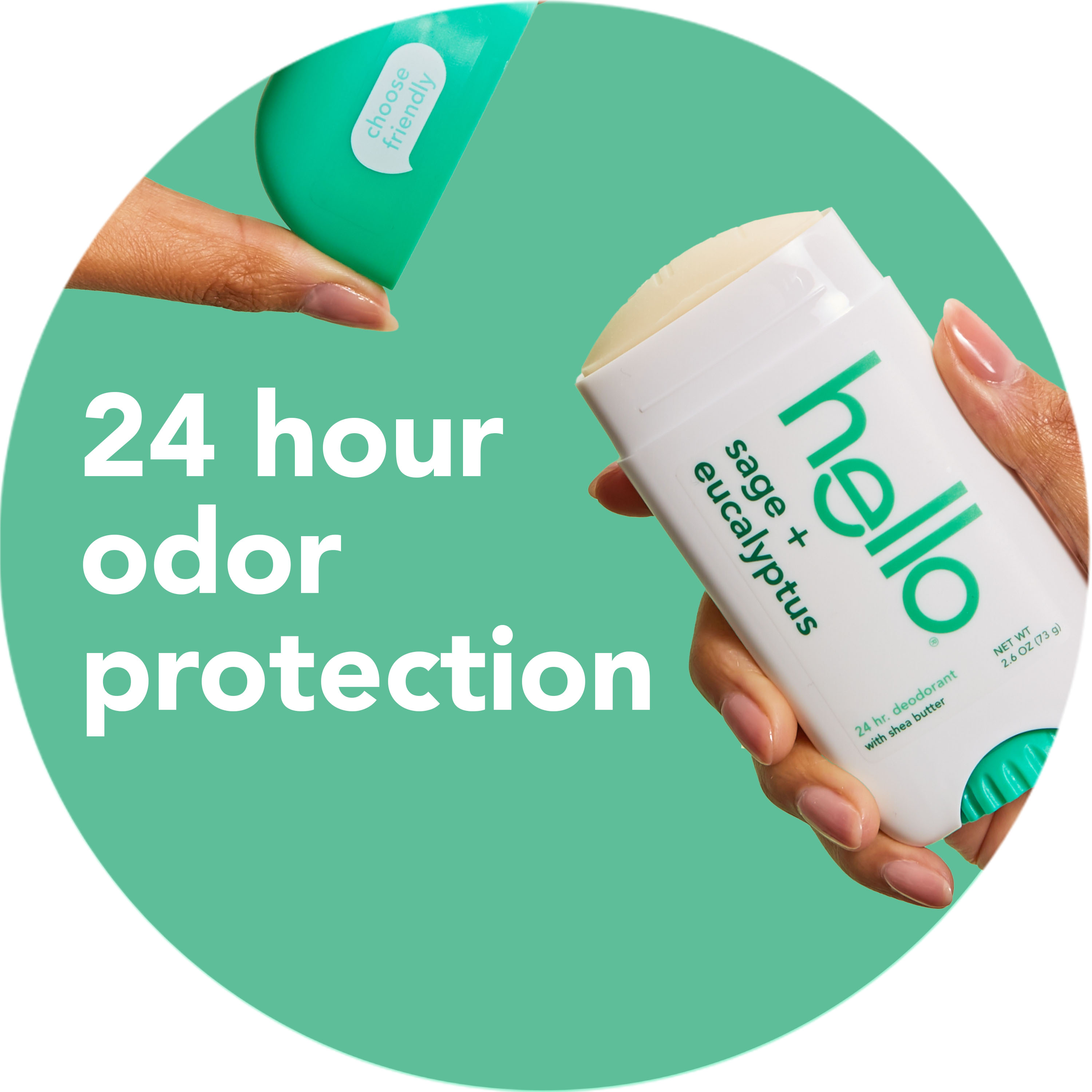| Product Description | Say hello to hello Sage + Eucalyptus Aluminum Free Deodorant. Give your pits a wake-up call with the crisp, herbal zing of sage and a refreshing blast of eucalyptus. Our 24-hour deodorant with shea butter is dermatologically tested and naturally scented to keep you feeling fresh all day. Say goodbye to aluminum, baking soda, parabens, and dyes. Plus, it glides on easily for a smooth application and won’t stain your clothes. Choose friendly with a deodorant that's not tested on animals and vegan for happy underarms. Anything less would be the pits |