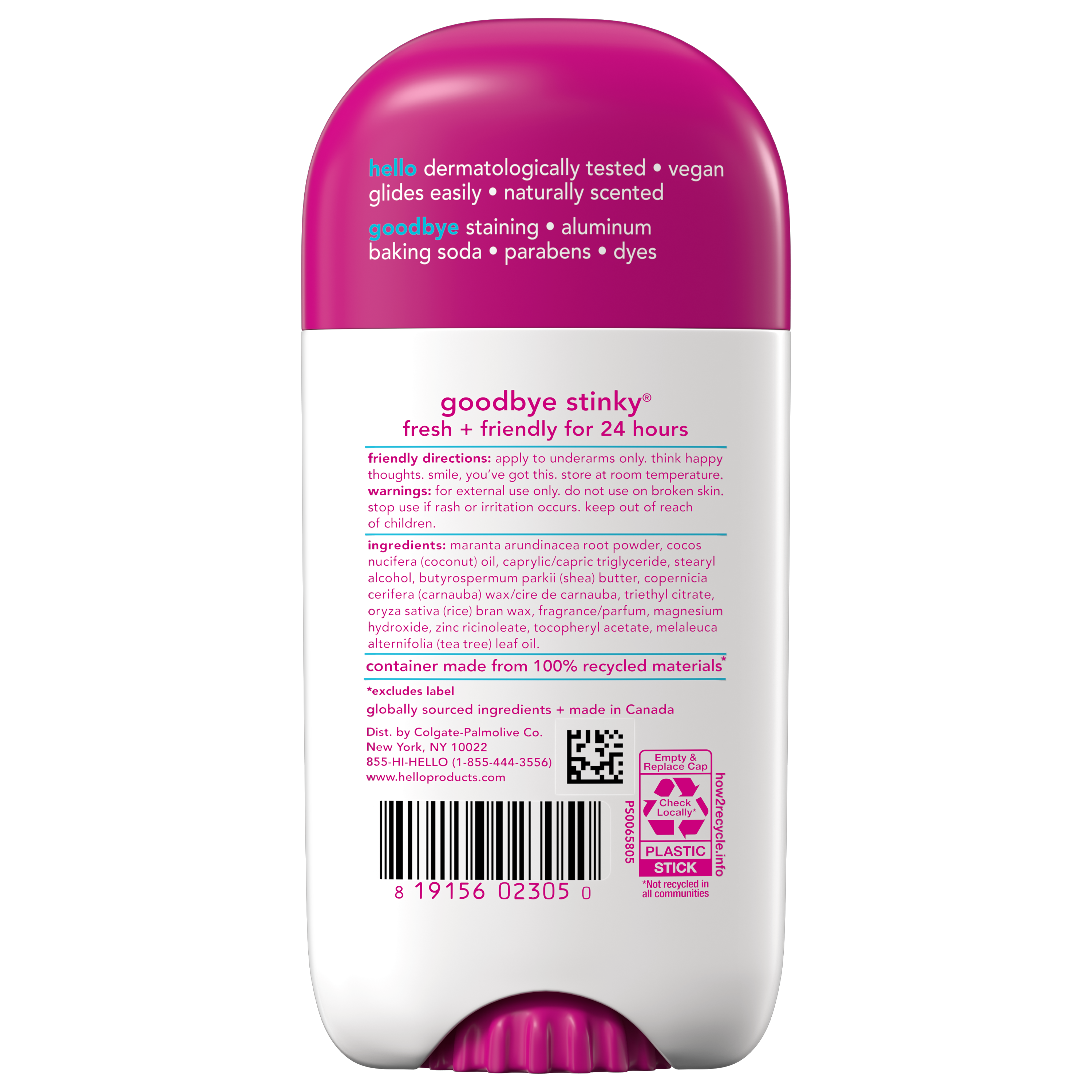 SKU 61038825 Consumer Unit - GTIN 819156023975 Case - GTIN 10819156023972 Product Category Personal Care Product Sub Category AP > Deo Product Equity (Brand) hello Product Sub Brand Hello AP/Deo Product Title hello Unicorn Aluminum Free Deodorant for Women and Men with Shea Butter, 24-Hour Freshness, Baking Soda Free Deodorant, Dermatologically Tested, 2.6 oz Stick (2 Pack) Product Description Say hello to hello Unicorn Aluminum Free Deodorant. Get swept away by this fruity fragrance that magically combines the scent of watermelon, apple, and melon all in one deo. Our 24-hour deodorant with shea butter is dermatologically tested and naturally scented to keep you feeling fresh all day. Say goodbye to aluminum, baking soda, parabens, and dyes. Plus, it glides on easily for a smooth application and won’t stain your clothes. Choose friendly with a deodorant that's not tested on animals and vegan for happy underarms. Anything less would be the pits. Bullet 1 WHAT I’M GETTING: Includes two 2.6 oz deodorant sticks of hello Unicorn Aluminum Free Deodorant for Men and Women Bullet 2 ALUMINUM FREE PROTECTION: Free of aluminum, dyes, baking soda, and parabens Bullet 3 NATURALLY SCENTED: Delight in the magically fruity fragrance of watermelon, apple, and melon Bullet 4 24-HOUR DEODORANT WITH SHEA BUTTER: Keeps you fresh + friendly for 24 hours, so you can take on the day with confidence Bullet 5 KNOW YOUR DEODORANT: Vegan and dermatologically tested Amazon RPC B0BLFNXMJ9 AMZ URL https://www.amazon.com/dp/B0BLFNXMJ9
