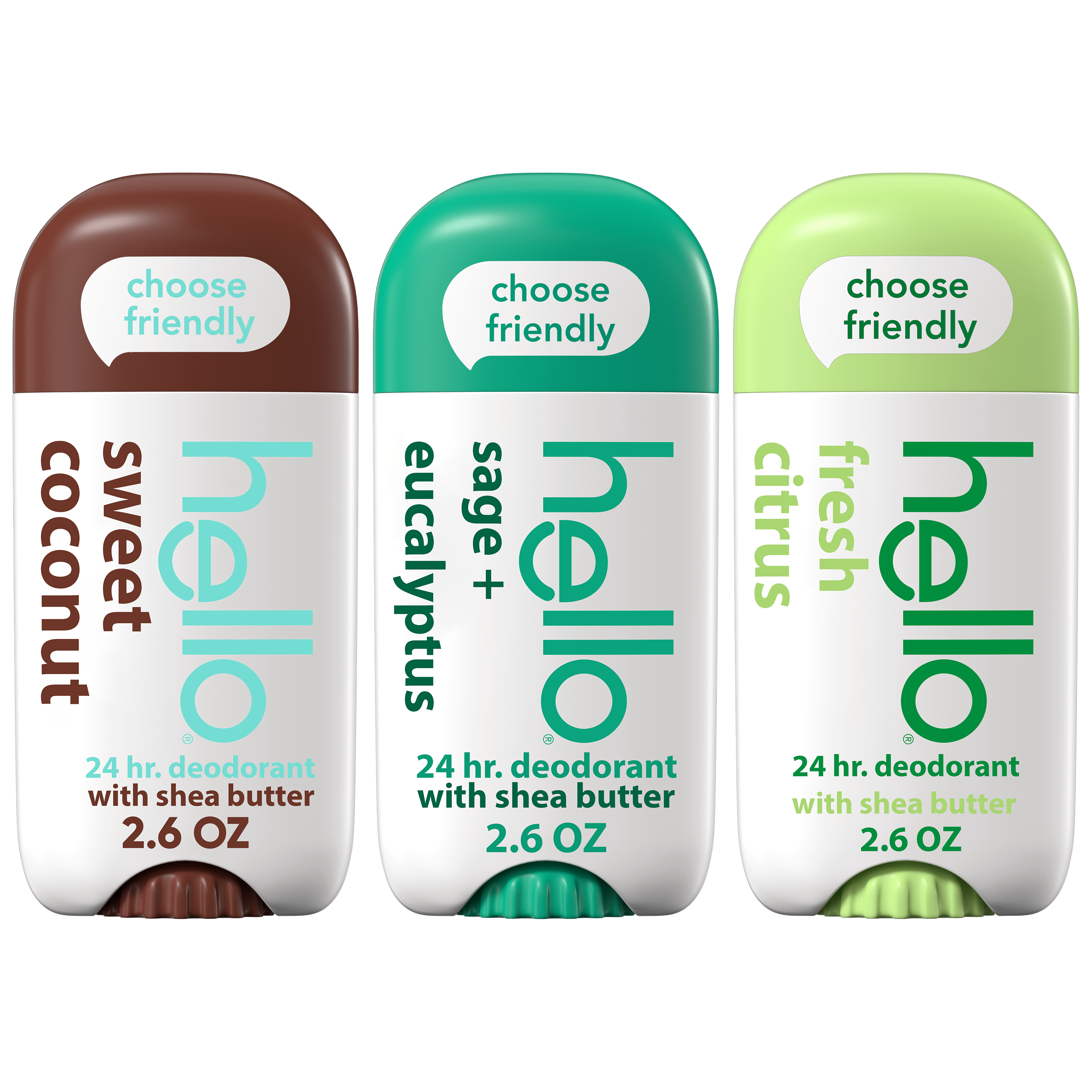 hello Deodorant Variety Pack, Aluminum Free Deodorant for Women and Men with Shea Butter, Sweet Coconut, Fresh Citrus, Sage + Eucalyptus, Baking Soda Free Deodorant, 2.6 oz Stick (3 Pack)