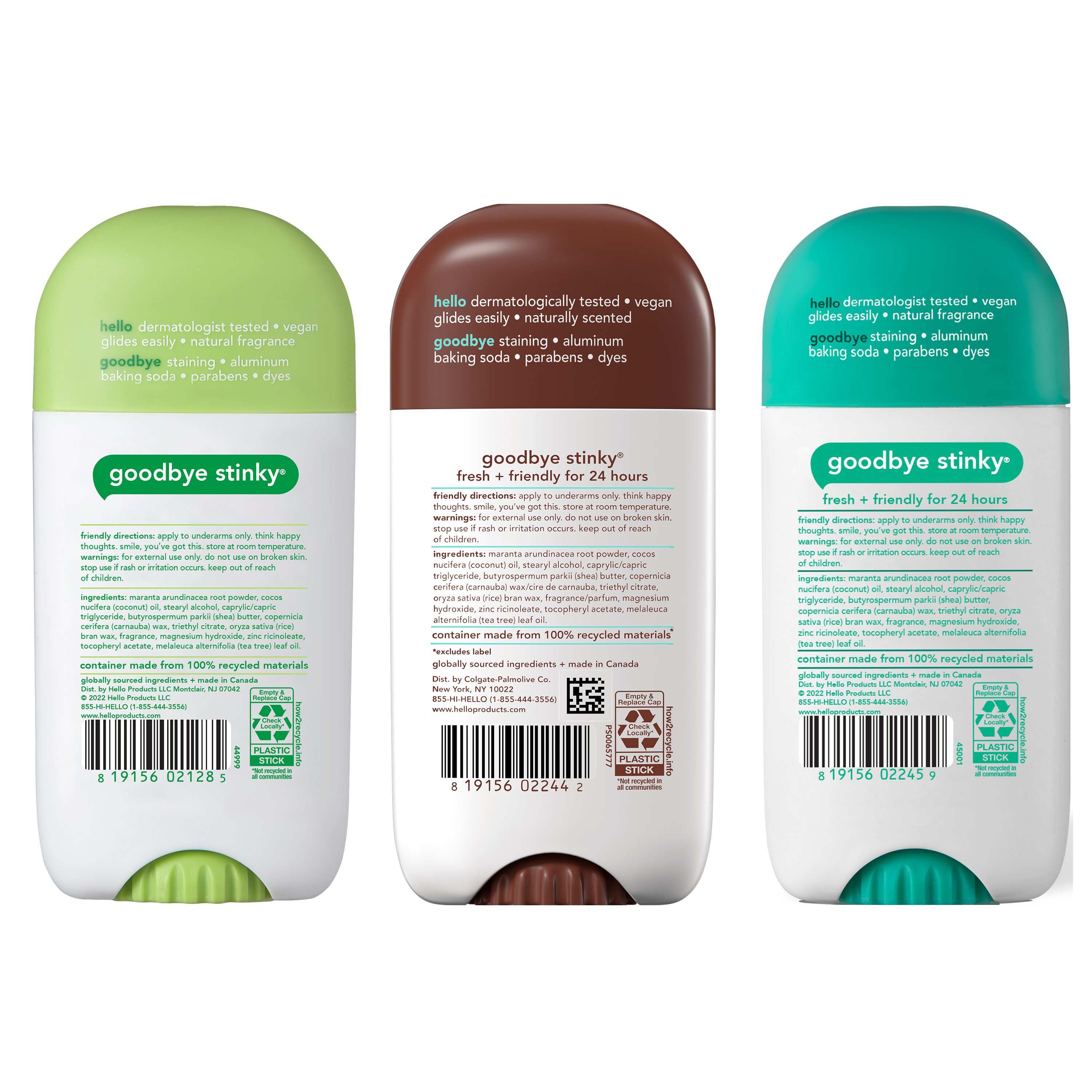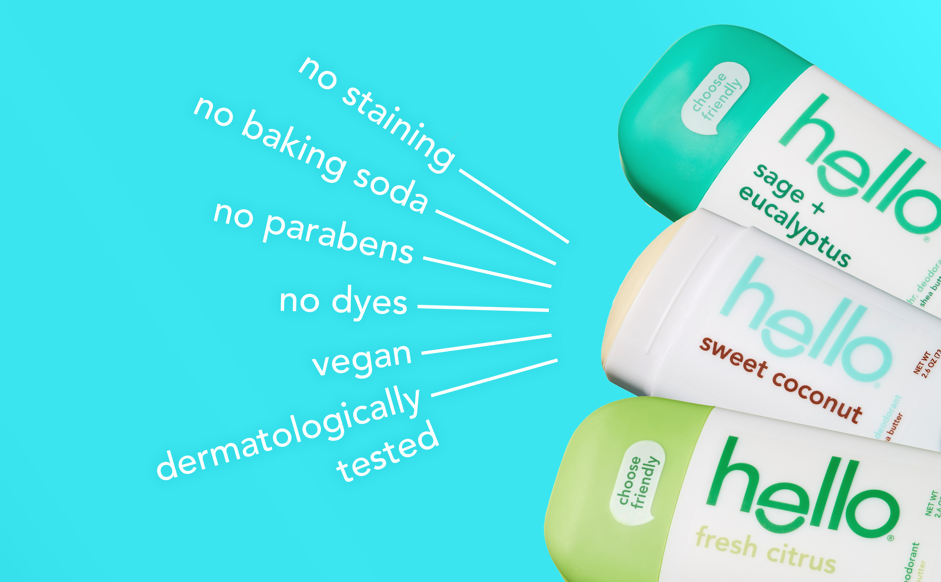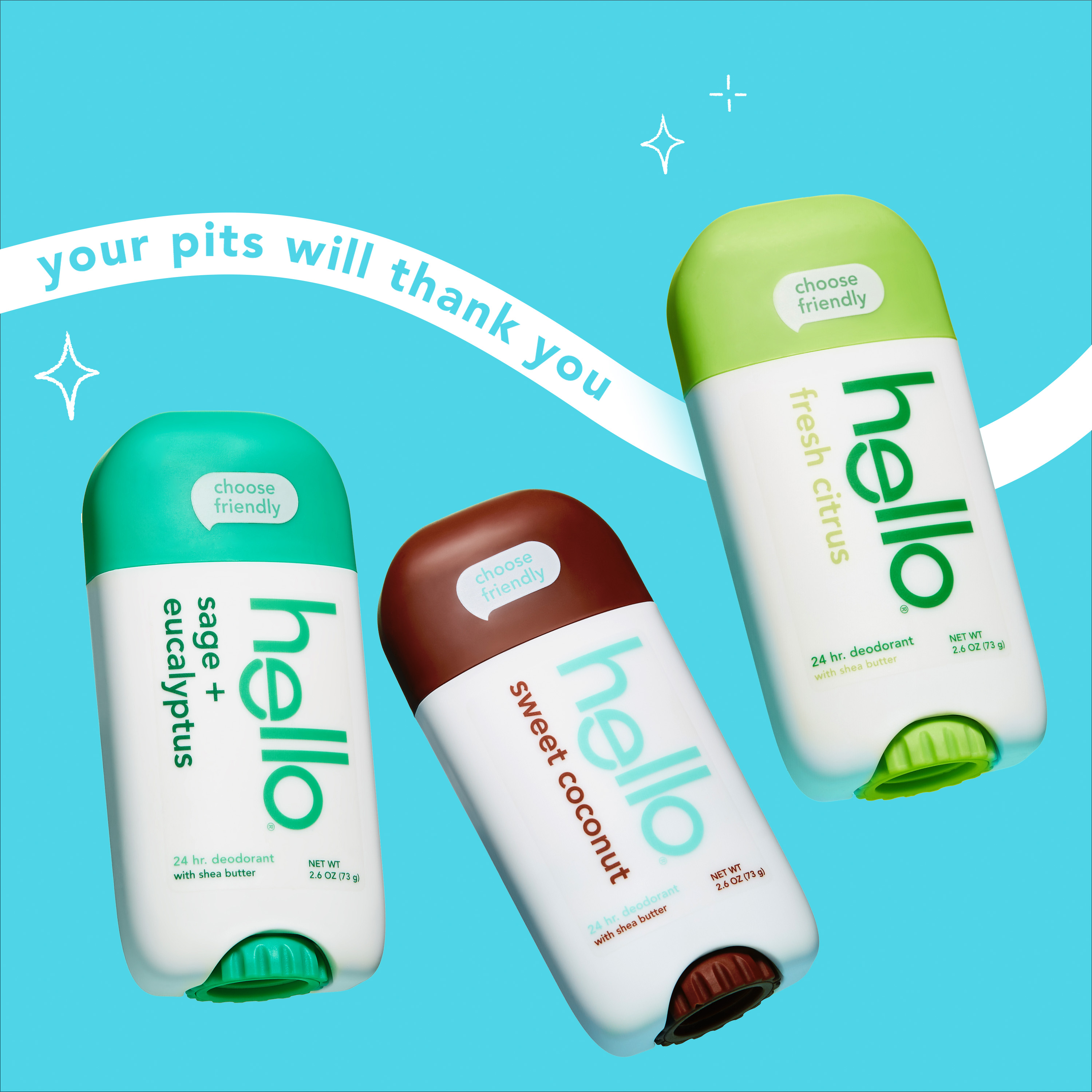 SKU 61038829 Consumer Unit - GTIN 00819156024194 Case - GTIN 10819156024191 Product Category Personal Care Product Sub Category AP > Deo Product Equity (Brand) hello Product Sub Brand Hello AP/Deo Product Title hello Deodorant Variety Pack, Aluminum Free Deodorant for Women and Men with Shea Butter, Sweet Coconut, Fresh Citrus, Sage + Eucalyptus, Baking Soda Free Deodorant, 2.6 oz Stick (3 Pack) Product Description Say hello to hello Aluminum Free Deodorant. Dive into the ultimate scent adventure with this variety pack! From creamy Sweet Coconut, to the zesty Fresh Citrus, and the cool refreshment of Sage + Eucalyptus, your pits are in for a magical ride. Our 24-hour deodorant with shea butter is dermatologically tested and naturally scented to keep you fresh all day. Formulated without aluminum, baking soda, parabens, or dyes, it's your go-to for a naturally fresh vibe. Plus, it glides on easily for a smooth application and won’t stain your clothes. Feel good about what you're wearing with a deodorant that's Leaping Bunny Certified and not tested on animals, vegan, and naturally formulated for happy underarms. Anything less would be the pits. Bullet 1 WHAT I’M GETTING: Includes three 2.6 oz deodorant sticks of hello Aluminum Free Deodorant for Men and Women, Sweet Coconut, Fresh Citrus, and Sage + Eucalyptus Bullet 2 ALUMINUM FREE PROTECTION: Free of aluminum, dyes, baking soda, and parabens Bullet 3 NATURALLY SCENTED: From creamy Sweet Coconut, to the zesty Fresh Citrus, and the cool refreshment of Sage + Eucalyptus, your pits are in for a magical ride Bullet 4 24-HOUR DEODORANT WITH SHEA BUTTER: Keeps you fresh + friendly for 24 hours, so you can take on the day with confidence Bullet 5 KNOW YOUR DEODORANT: Leaping Bunny Certified, vegan, and dermatologically tested Amazon RPC B0BN4CN95R AMZ URL https://www.amazon.com/dp/B0BN4CN95R