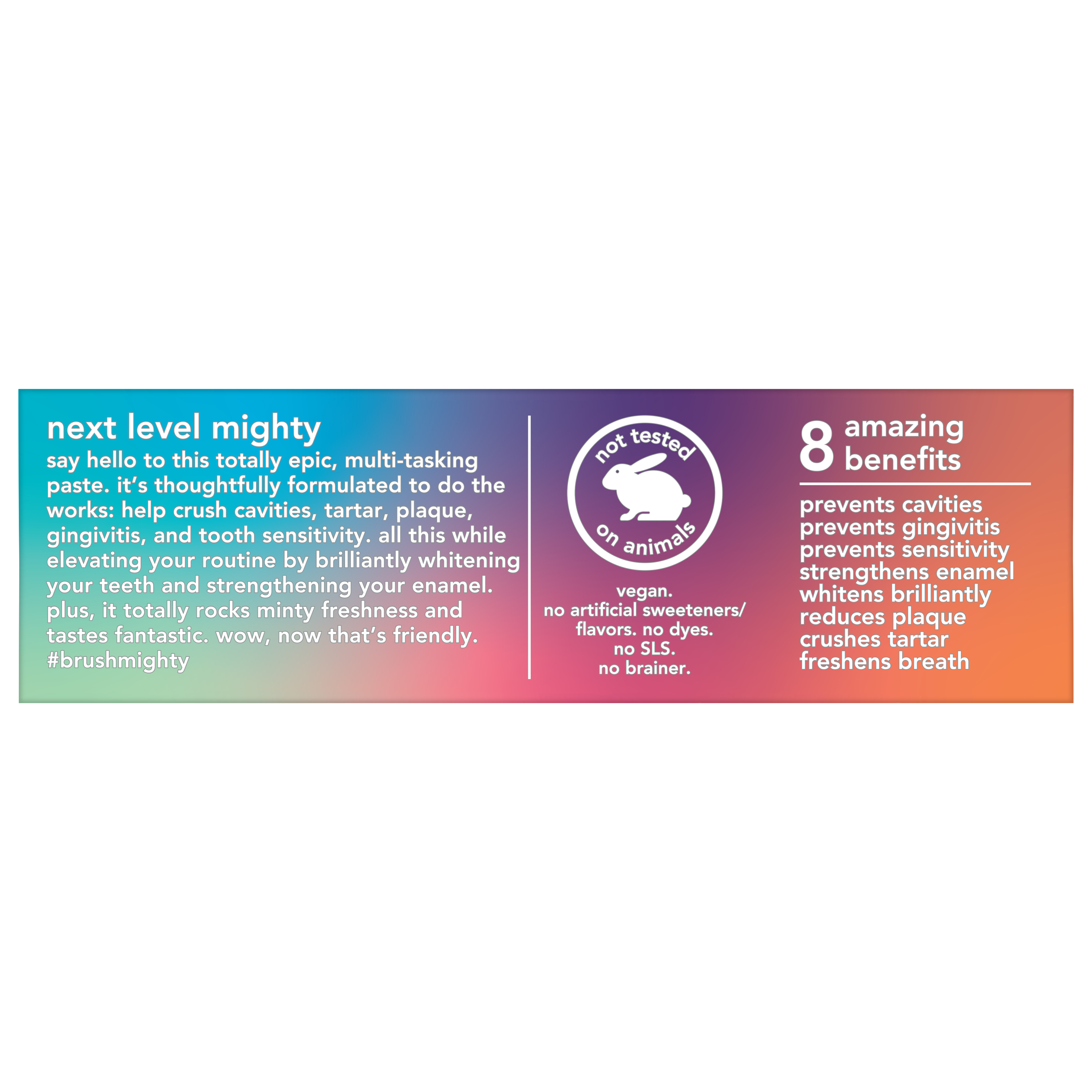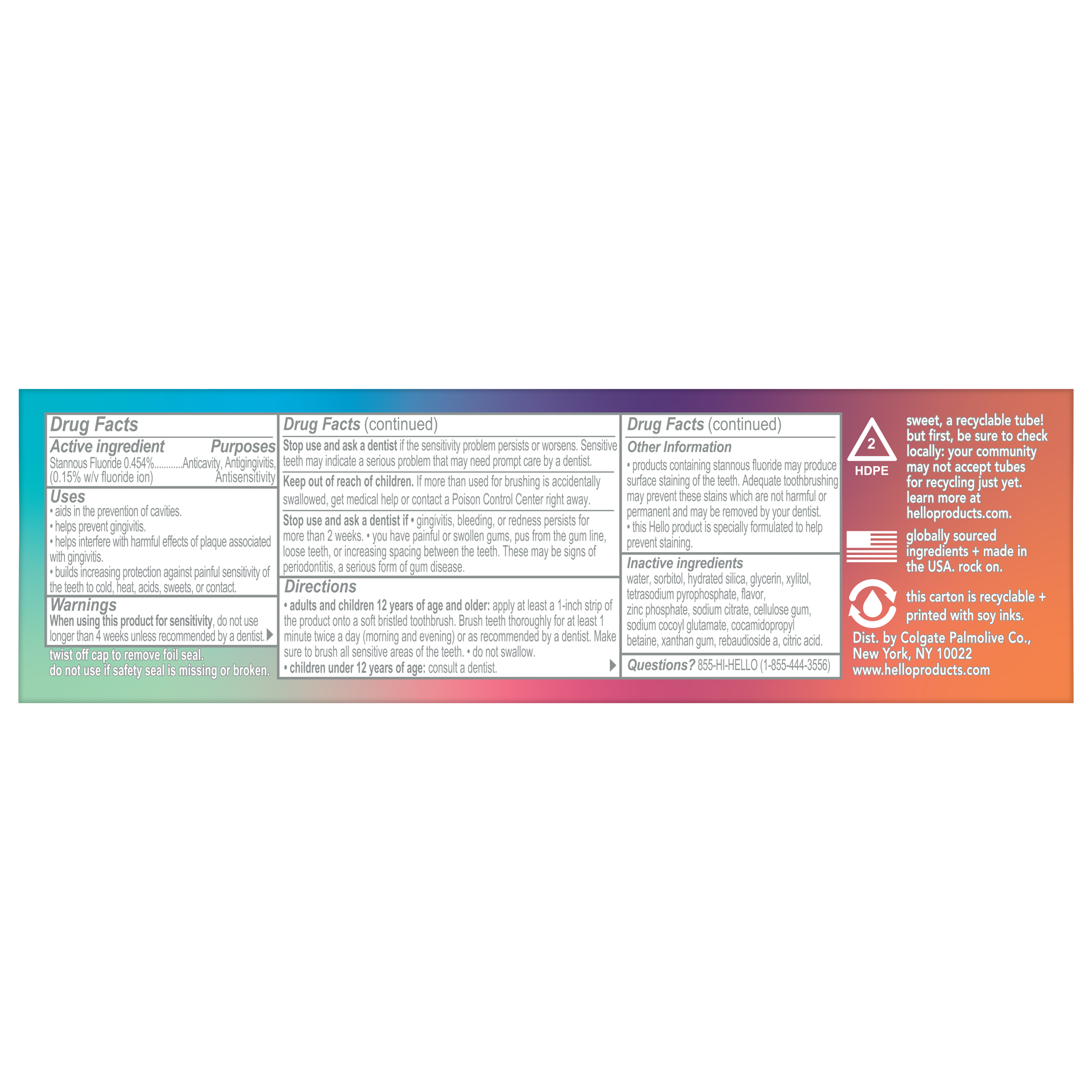 SKU 61038894 Consumer Unit - GTIN 00819156024071 Case - GTIN 10819156024078 Product Category Oral Care Product Sub Category Toothpaste Product Equity (Brand) Hello Product Sub Brand Hello Adult TP Product Title hello 8 in 1 Mighty Multi-Tasker Fluoride Toothpaste, Natural Mint Blend, 2 Count, 4.0 Oz Tubes Product Description Say hello to your new squeeze, the totally epic hello 8 in 1 Mighty Multi-Tasker Fluoride Toothpaste. This hello toothpaste pack contains two tubes of fluoride toothpaste so there’s always a friendly toothpaste ready to greet you when you need it. In addition, this SLS free toothpaste is thoughtfully formulated to help crush cavities, tartar, plaque, gingivitis, and tooth sensitivity. It does all this while brilliantly whitening your teeth and strengthening your teeth enamel. Plus, this hello toothpaste with fluoride totally rocks minty freshness and tastes fantastic. Wow, now that’s friendly. hello 8 in 1 Mighty Multi-Tasker Fluoride Toothpaste contains no artificial flavors, sweeteners, dyes, and no SLS and this anticavity toothpaste is vegan. As if that weren't enough magic for both tubes, hello fluoride toothpaste is also not tested on animals. We're serious about being friendly. Bullet 1 Includes two (2) 4.0 oz tubes of hello 8 in 1 Mighty Multi-Tasker Fluoride Toothpaste, Natural Mint Blend Bullet 2 This hello toothpaste with fluoride helps crush cavities, tartar, plaque, gingivitis, tooth sensitivity, bad breath, strengthens enamel, and whitens teeth Bullet 3 Help strengthen enamel and prevent cavities, gingivitis, and tooth sensitivity using this stannous fluoride toothpaste pack Bullet 4 Rock minty fresh breath while brilliantly whitening teeth with this multi-benefit whitening toothpaste Bullet 5 This hello SLS free toothpaste is made with no artificial flavors, sweeteners, dyes, and is not tested on animals Amazon RPC B0BN4MLGSJ AMZ URL https://www.amazon.com/dp/B0BN4MLGSJ