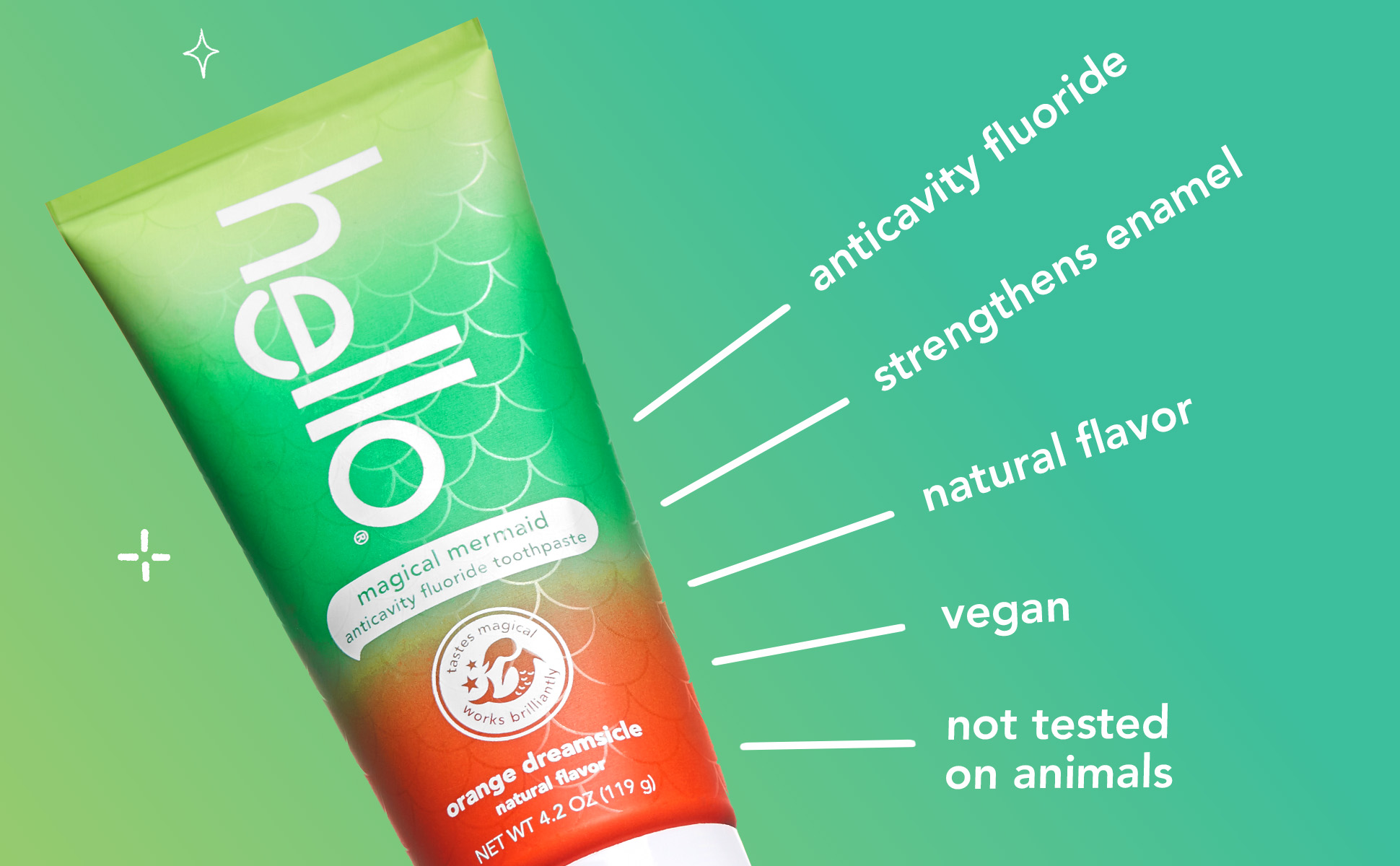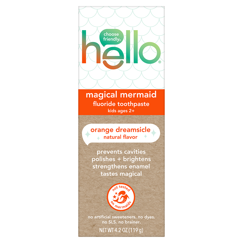 | Product Description | Say goodbye to brush time negotiations and hello to everyday yay with hello Magical Mermaid Kids Toothpaste with Fluoride. This mermaid children’s toothpaste tastes magical and works brilliantly. This kids fluoride toothpaste pack is safe for kids ages 2 and up and the orange dreamsicle kids toothpaste flavor will make them rush to brush. Hello Magical Mermaid Kids Toothpaste with Fluoride is thoughtfully formulated with natural flavor to taste like a sweet slice of summer. Formulated with fluoride, this children’s toothpaste can also help prevent cavities, strengthen enamel, and polish and brighten your little one's teeth. Don’t worry parents, we won’t tell if you decide to take a brush for yourself. We’re serious about being friendly, and about what goes into little mouths. That means making a kids toothpaste that contains no artificial sweeteners, artificial flavors, preservatives, SLS, parabens, dyes, spicy mint, and that is gluten free. Plus, this children’s toothpaste pack is and not tested on mermaids, real or imaginary. Choose friendly and brush happy with hello Magical Mermaid Kids Toothpaste with Fluoride. |