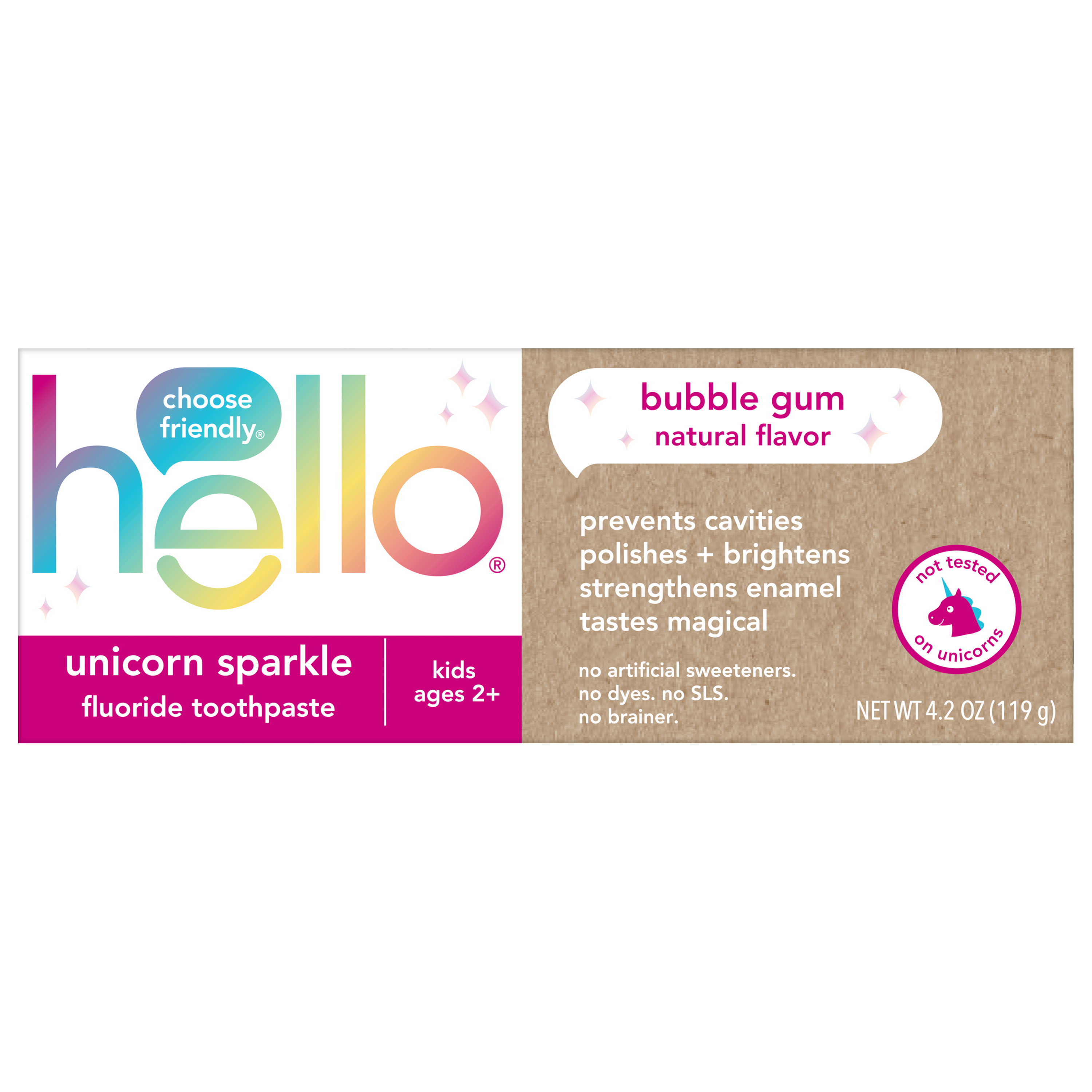 SKU 61038906 Consumer Unit - GTIN 00819156023524 Case - GTIN 10819156023521 Product Category Oral Care Product Sub Category Toothpaste Product Equity (Brand) hello Product Sub Brand Hello Kids TP Product Title hello Unicorn Sparkle Kids Toothpaste with Fluoride, Bubble Gum Toothpaste, 4.2 Oz Tube (Pack of 3) Product Description Say hello to brush time magic and celebrate more everyday yay with hello Unicorn Sparkle Kids Toothpaste with Fluoride. This unicorn sparkle children’s toothpaste tastes like rainbows and sparkles and works brilliantly. This kids fluoride toothpaste is safe for kids ages 2 and up and the magical bubble gum toothpaste flavor is a fun way to encourage regular brushing habits at an early age. Dreams Do Come True hello Unicorn Sparkle Kids Toothpaste with Fluoride is thoughtfully formulated with natural flavor, sparkles, and high quality sweeteners like xylitol and stevia. This kids toothpaste has a fun bubble gum taste making brushing more enjoyable. And because it’s formulated with fluoride, this children’s toothpaste can also help prevent cavities and strengthen enamel, all while brushing away plaque with brilliance and grace. Help polish and brighten your little ones teeth with hello Unicorn Sparkle Kids Fluoride Toothpaste. K(no)w Your Toothpaste We’re serious about being friendly, and about what goes into little mouths. That means making a kids toothpaste that contains no artificial sweeteners, artificial flavors, preservatives, SLS, parabens, dyes, spicy mint, and that is gluten free. Plus, this children’s toothpaste is not tested on animals, real or imaginary. Choose friendly and brush happy with hello Unicorn Sparkle Kids Toothpaste with Fluoride. Bullet 1 WHAT I’M GETTING: Includes three (3) 4.2 oz tubes of hello Unicorn Sparkle Kids Toothpaste with Fluoride, Bubble Gum Toothpaste for Kids Bullet 2 FIGHTS CAVITIES: This kids fluoride toothpaste is safe for children ages 2 and up and helps prevent cavities and strengthens growing teeth using fluoride Bullet 3 MAGICALLY BRILLIANT: The unicorn toothpaste tastes like bubblegum and works brilliantly as a children’s toothpaste to build good brushing habits and help brush away plaque Bullet 4 UNICORN APPROVED: hello Unicorn Sparkle Kids Toothpaste is formulated with natural flavor and also helps polish and brighten little smiles Bullet 5 NO-BRAINER: This gluten-free kids toothpaste is made with no SLS, preservatives, parabens, dyes, spicy mint, artificial sweeteners or artificial flavors Amazon RPC B09PQ61NXF AMZ URL https://www.amazon.com/dp/B09PQ61NXF Target RPC 86685901 Target URL https://www.target.com/p/a/-/A-86685901