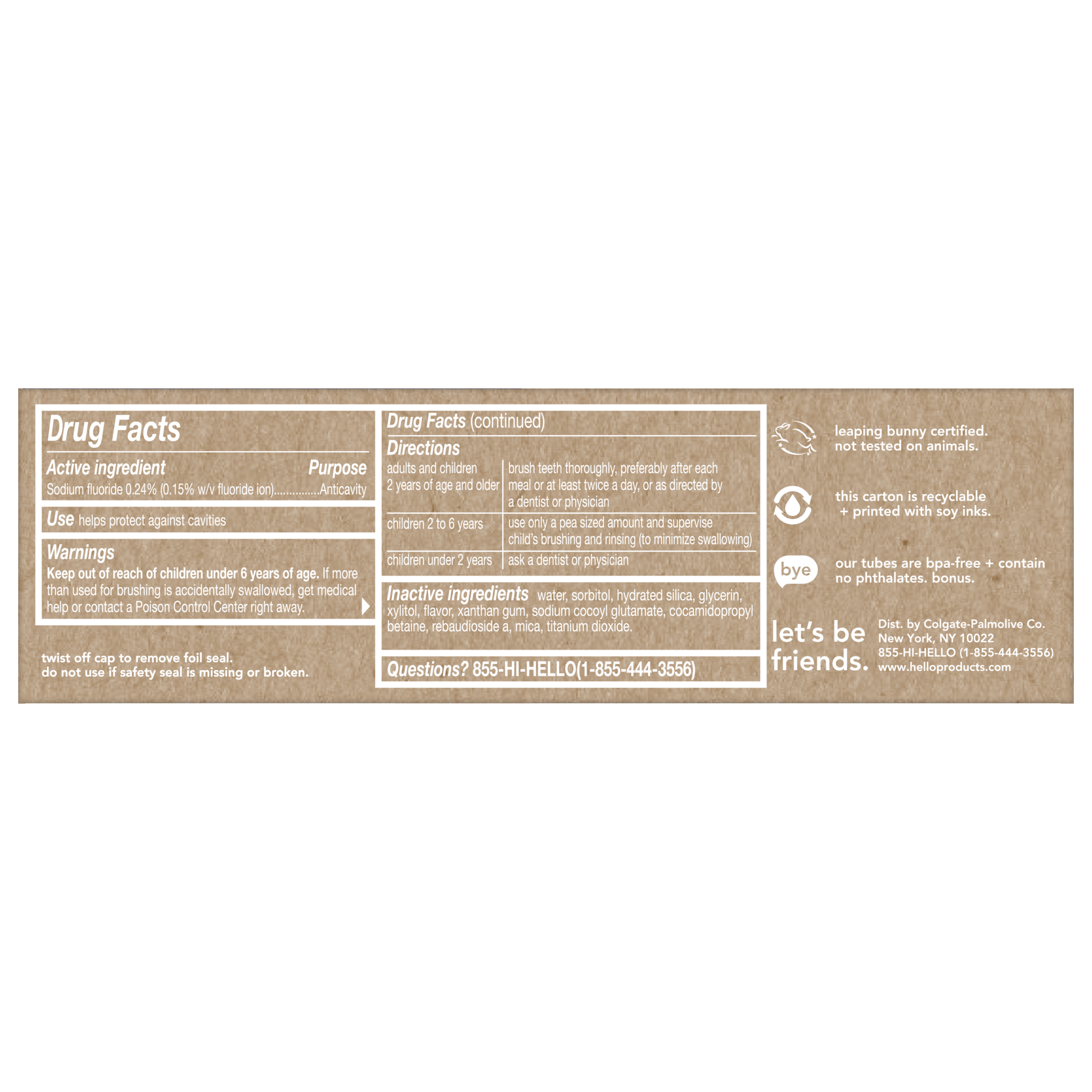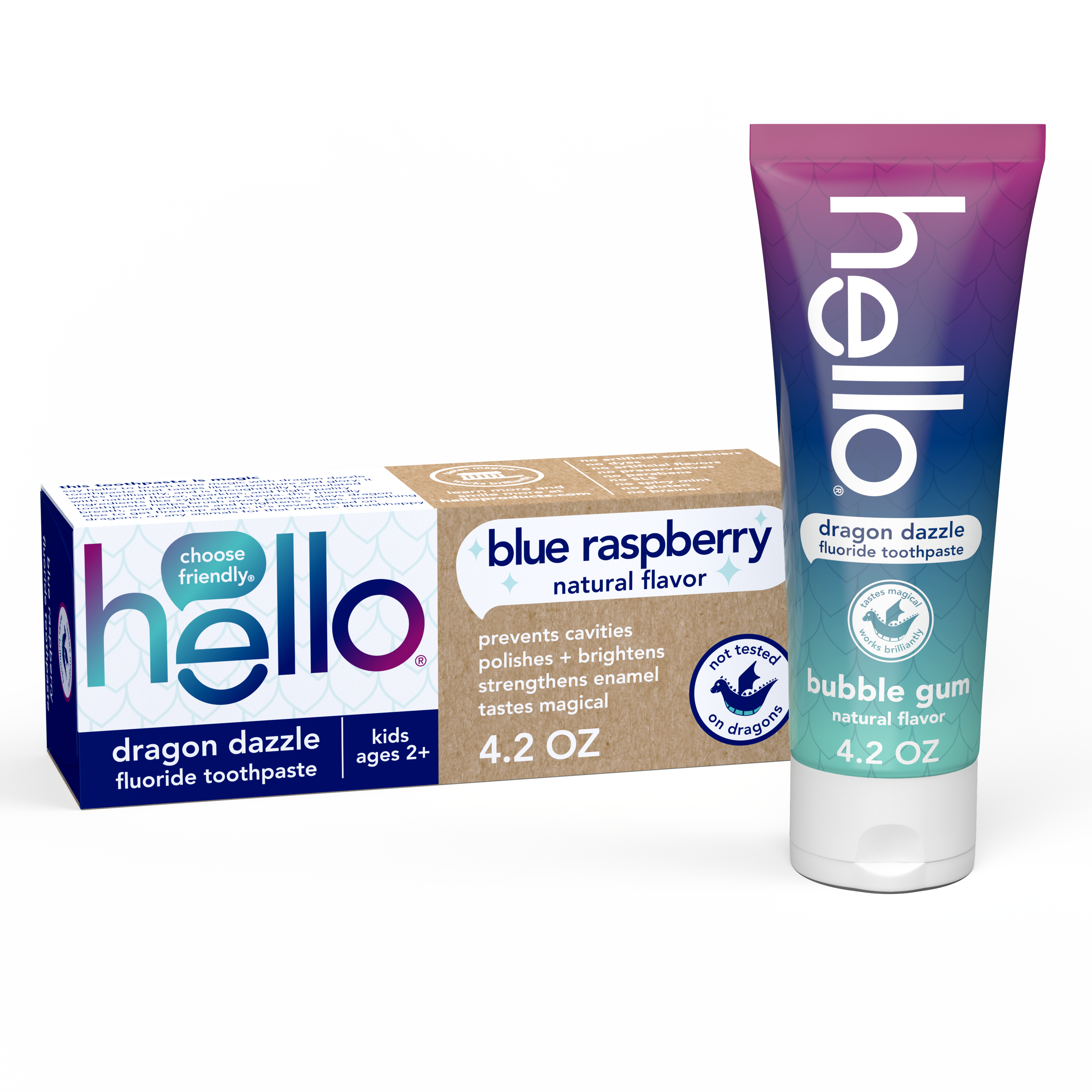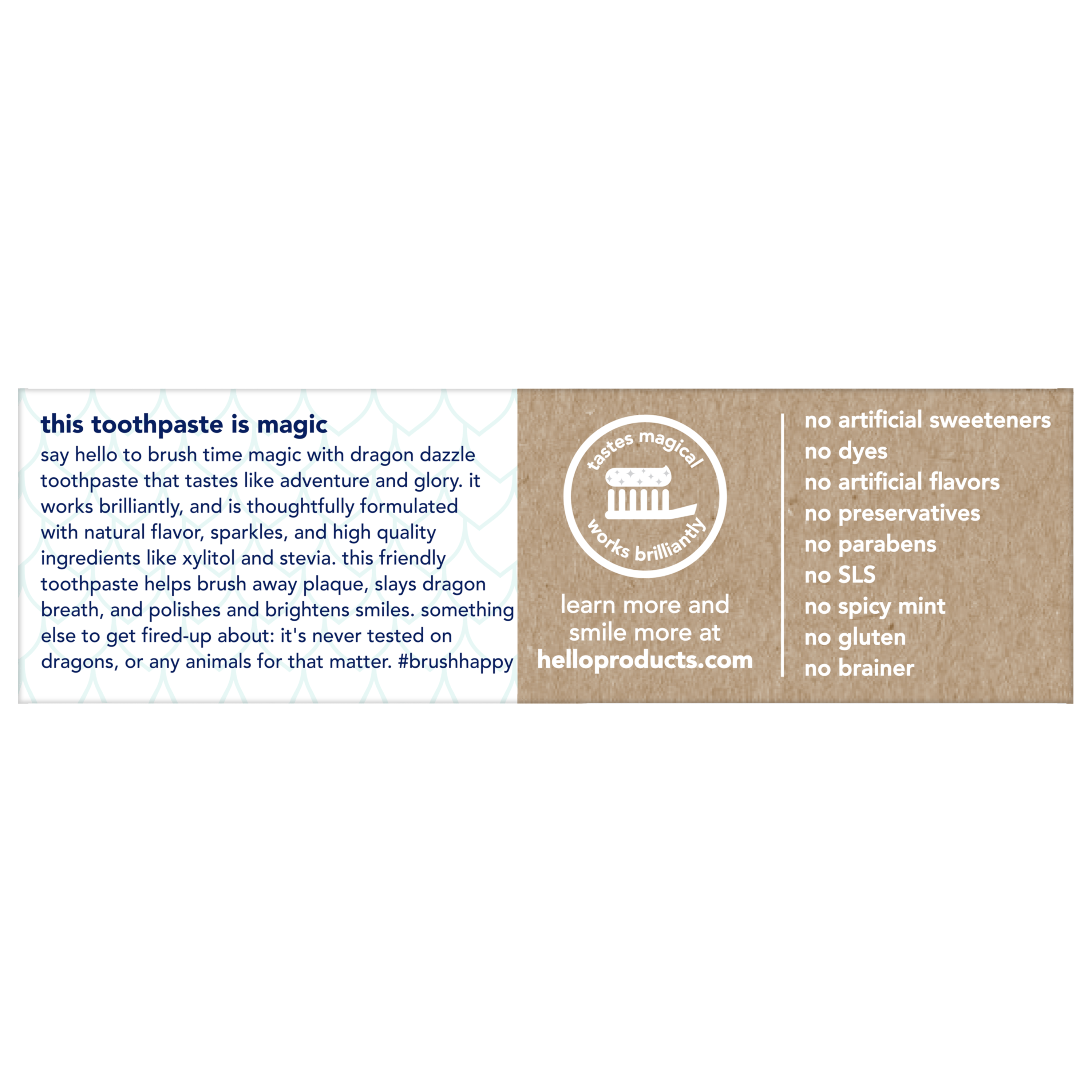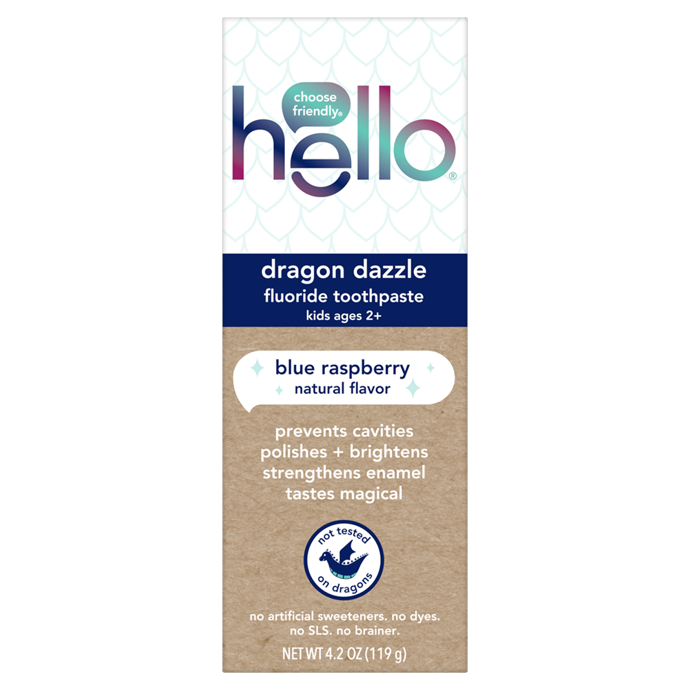 SKU 61038924 Consumer Unit - GTIN 00819156021803 Case - GTIN 20819156021807 Product Category Oral Care Product Sub Category Toothpaste Product Equity (Brand) hello Product Sub Brand Hello Kids TP Product Title hello Dragon Dazzle Kids Toothpaste with Fluoride, Blue Raspberry Toothpaste, 4.2 Oz Tube Product Description hello Dragon Dazzle Kids Toothpaste with Fluoride, Blue Raspberry Toothpaste, 4.2 Oz Tube Say hello to brush time magic and celebrate more everyday yay with hello Dragon Dazzle Kids Toothpaste with Fluoride. This dragon dazzle children’s toothpaste tastes like adventure and glory and works brilliantly. This kids fluoride toothpaste is safe for kids ages 2 and up and the blue raspberry toothpaste flavor is a fun way to encourage regular brushing habits at an early age and slay dragon breath. This Kids Toothpaste Is Magic hello Dragon Dazzle Kids Toothpaste with Fluoride is thoughtfully formulated with natural flavor, sparkles, and high quality ingredients like xylitol and stevia. This kids toothpaste has a fun blue raspberry taste making brushing more enjoyable. And because it’s formulated with fluoride, this children's toothpaste can also help prevent cavities and strengthen enamel, all while brushing away plaque with brilliance and grace. Help polish and brighten your little ones teeth with hello Dragon Dazzle Kids Fluoride Toothpaste. K(no)w Your Toothpaste We’re serious about being friendly, and about what goes into little mouths. That means making a kids toothpaste that contains no artificial sweeteners, artificial flavors, preservatives, SLS, parabens, dyes, spicy mint, and that is gluten free. Plus, this children’s toothpaste is not tested on dragons, or any animals for that matter. Choose friendly and brush happy with hello Dragon Dazzle Kids Toothpaste with Fluoride. eCommerce Copy- Long Description hello Dragon Dazzle Kids Toothpaste with Fluoride, Blue Raspberry Toothpaste, 4.2 Oz Tube Say hello to brush time magic and celebrate more everyday yay with hello Dragon Dazzle Kids Toothpaste with Fluoride. This dragon dazzle children’s toothpaste tastes like adventure and glory and works brilliantly. The kids fluoride toothpaste is safe for kids ages 2 and up and the blue raspberry toothpaste flavor is a fun way to encourage regular brushing habits at an early age and slay dragon breath. This Kid Toothpaste Is Magic hello Dragon Dazzle Kids Toothpaste with Fluoride is thoughtfully formulated with natural flavor, sparkles, and high quality ingredients like xylitol and stevia. This kids toothpaste has a fun blue raspberry taste making brushing more enjoyable. And because it’s formulated with fluoride, this children's toothpaste can also help prevent cavities and strengthen enamel, all while brushing away plaque with brilliance and grace. Help polish and brighten your little one’s teeth with hello Dragon Dazzle Kids Fluoride Toothpaste. K(no)w Your Toothpaste We’re serious about being friendly, and about what goes into little mouths. That means making a kids toothpaste that contains no artificial sweeteners, artificial flavors, preservatives, SLS, parabens, dyes, spicy mint, and that is gluten free. Plus, this children’s toothpaste is not tested on dragons, or any animals for that matter. Choose friendly and brush happy with the hello Dragon Dazzle Kids Toothpaste with Fluoride. Bullet 1 WHAT I’M GETTING: Includes one (1) 4.2 oz tube of hello Dragon Dazzle Kids Toothpaste with Fluoride, Blue Raspberry Toothpaste for Kids Bullet 2 FIGHTS CAVITIES: This kids fluoride toothpaste is safe for children ages 2 and up and helps prevent cavities and strengthens growing teeth using fluoride Bullet 3 MAGICALLY BRILLIANT: The dragon kids toothpaste tastes like magic and works brilliantly as a children’s toothpaste to build good brushing habits and help brush away plaque Bullet 4 DAZZLING BRIGHT: hello Dragon Dazzle Kids Toothpaste is formulated with natural flavor and high quality ingredients and also helps polish and brighten little teeth Bullet 5 NO BRAINER: This gluten-free blue raspberry toothpaste is made with no SLS, preservatives, parabens, dyes, spicy mint, artificial sweeteners or artificial flavors Active Ingredients Sodium Fluoride 0.24% (0.15% w/v fluoride ion) Walmart RPC 204100181 Walmart URL (Computed) https://www.walmart.com/ip/a/204100181 Target RPC 83388538 Target URL https://www.target.com/p/a/-/A-83388538 Family Dollar RPC 997379