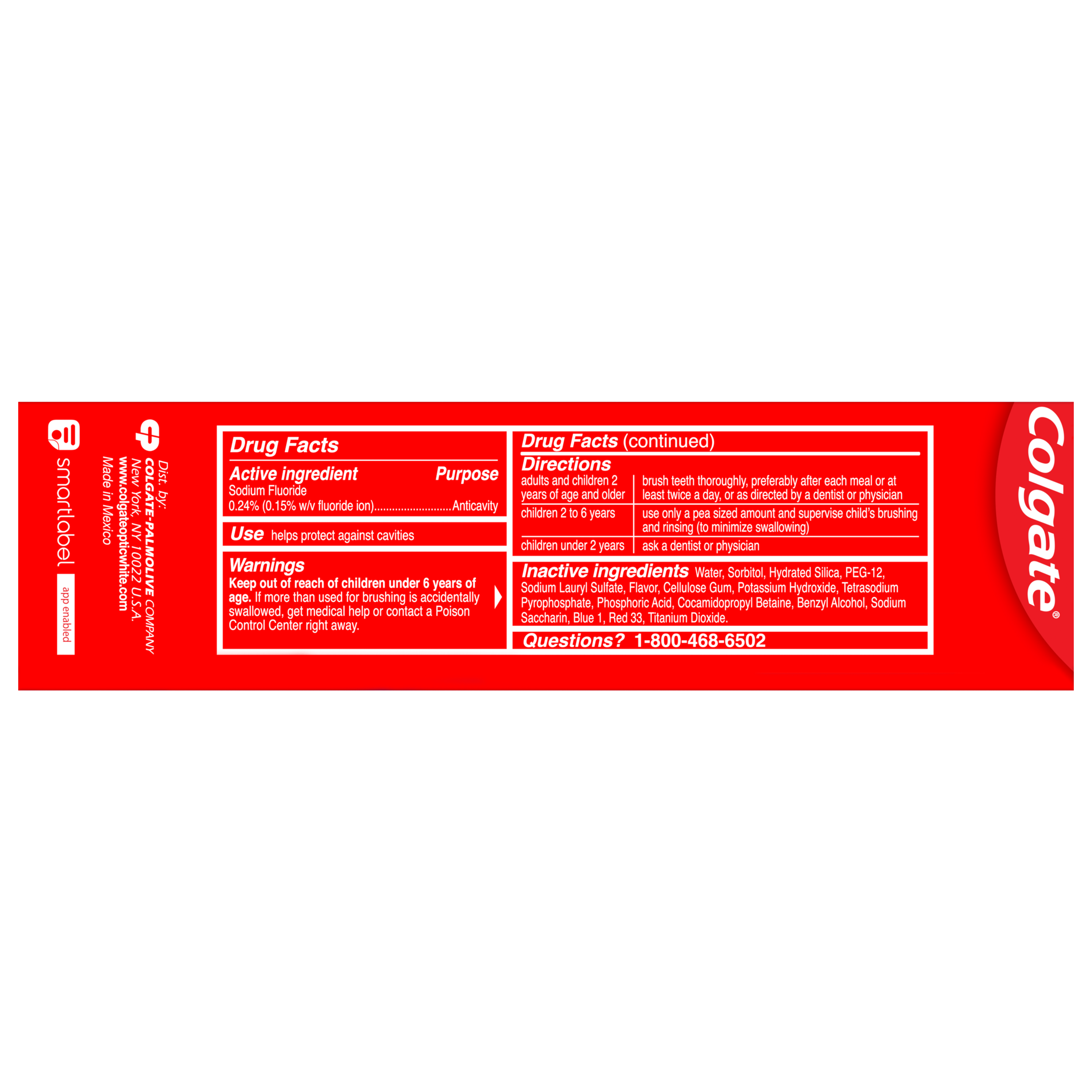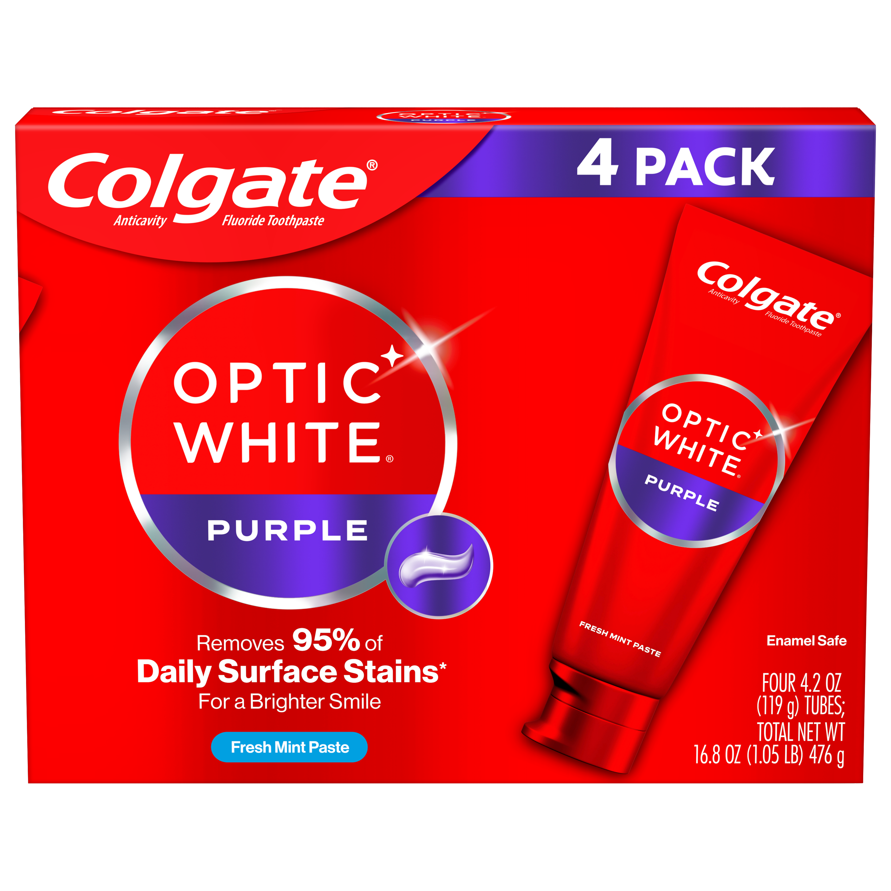 SKU 61038975 Consumer Unit - GTIN 00827854012368 Case - GTIN 10827854012365 Product Category Oral Care Product Sub Category Toothpaste Product Equity (Brand) Colgate Product Sub Brand Colgate Optic White TP Product Title Colgate Optic White Purple Toothpaste, 4.2 Oz, 4 Pack Active Ingredients Sodium Fluoride 0.24 % (0.15% w/v fluoride ion)