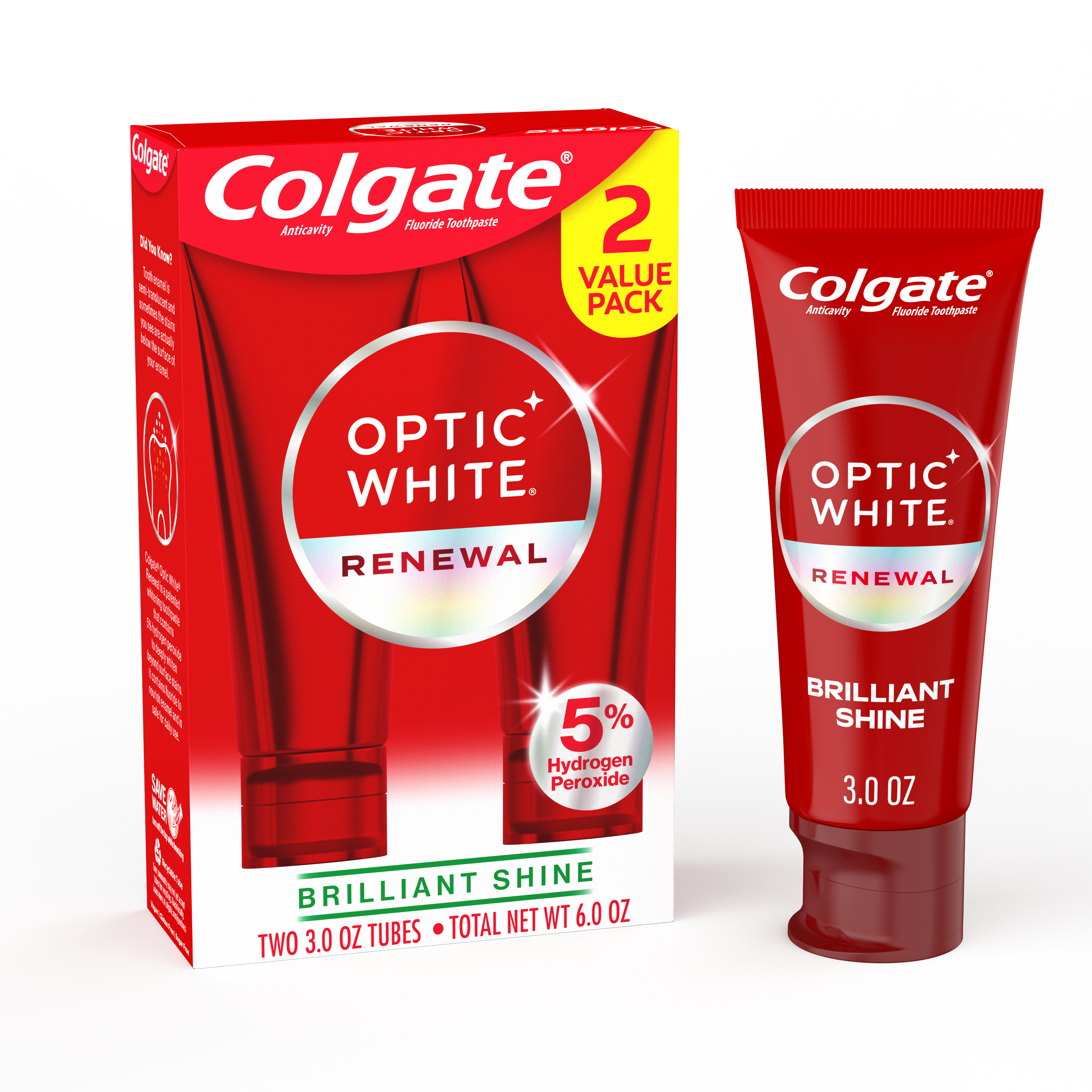 SKU 61039063 Consumer Unit - GTIN 00827854012429 Case - GTIN 10827854012426 Product Category Oral Care Product Sub Category Toothpaste Product Equity (Brand) Colgate Product Sub Brand Colgate Optic White TP Product Title Colgate Optic White Renewal Brilliant Shine 3oz 2pk eCommerce Copy- Long Description Colgate Optic White Renewal Teeth Whitening Toothpaste, Brilliant Shine, 3.0 Oz., 2 Pack Welcome a brilliantly white smile with the Colgate Optic White Renewal Teeth Whitening Toothpaste. This whitening fluoride toothpaste removes 15 years of stains* and effectively removes tea, coffee, and wine stains. The patented whitening toothpaste contains 5% hydrogen peroxide to deeply whiten beyond surface stains to help you achieve a white smile. Enamel Safe for Daily Use Colgate Optic White Renewal Brilliant Shine Toothpaste is a refreshing mint toothpaste that contains fluoride to nourish enamel and is safe for daily use. This hydrogen peroxide toothpaste is also an anticavity fluoride toothpaste to help prevent cavities. Deeply whiten beyond surface stains with the Colgate Optic White Renewal Toothpaste. Gluten free, Sugar Free, and Vegan Reveal a confident smile with the Colgate Optic White Renewal Teeth Whitening Toothpaste. Use this whitening toothpaste to nourish your enamel and deeply whiten teeth. Colgate Optic White Renewal Brilliant Shine Toothpaste is a gluten free, sugar free, and vegan toothpaste. Unlock a white smile with the Colgate Optic White Renewal Teeth Whitening Toothpaste. *when brushing twice daily for 2 weeks Active Ingredients Sodium Monofluorophosphate 1.14% (0.19% w/v fluoride ion)
