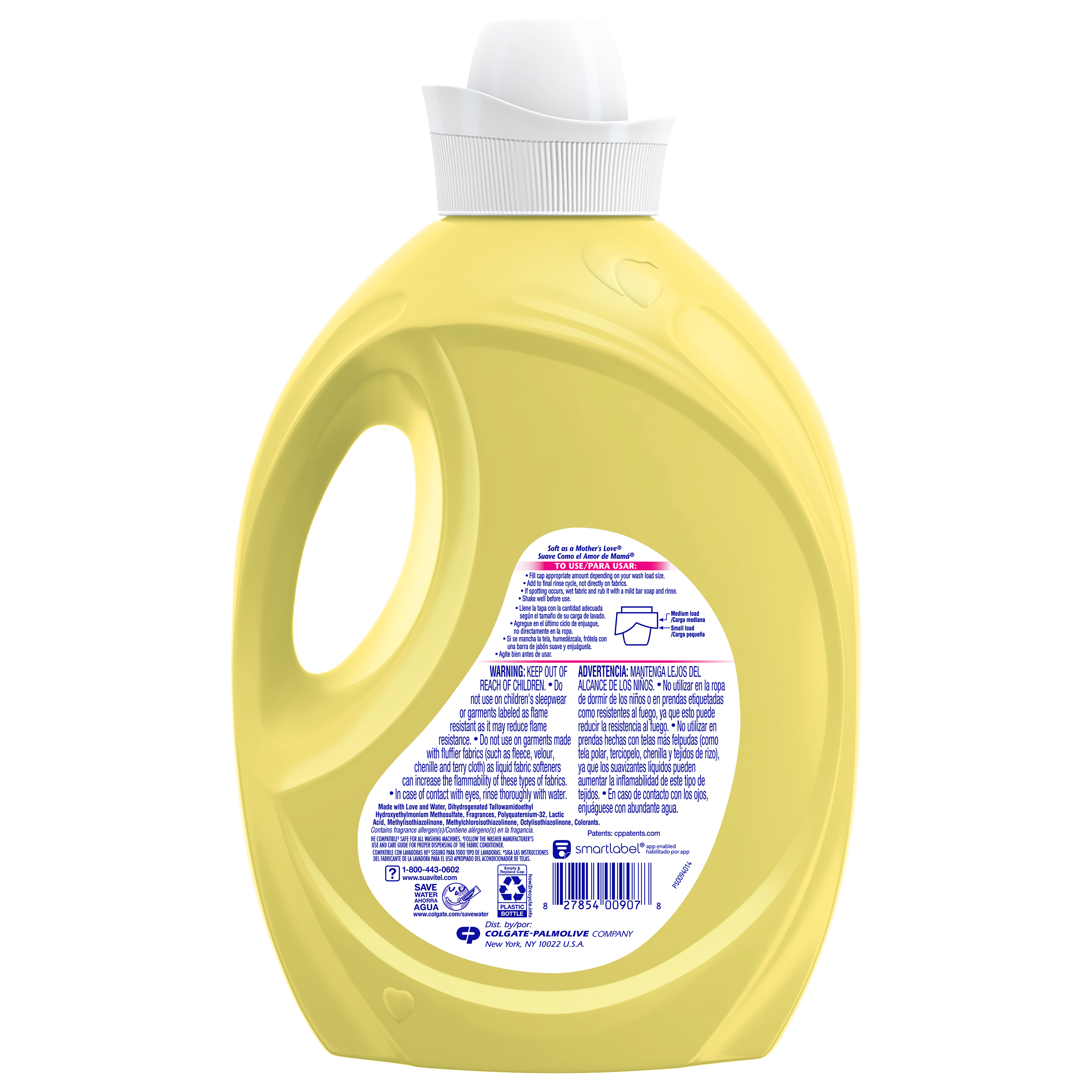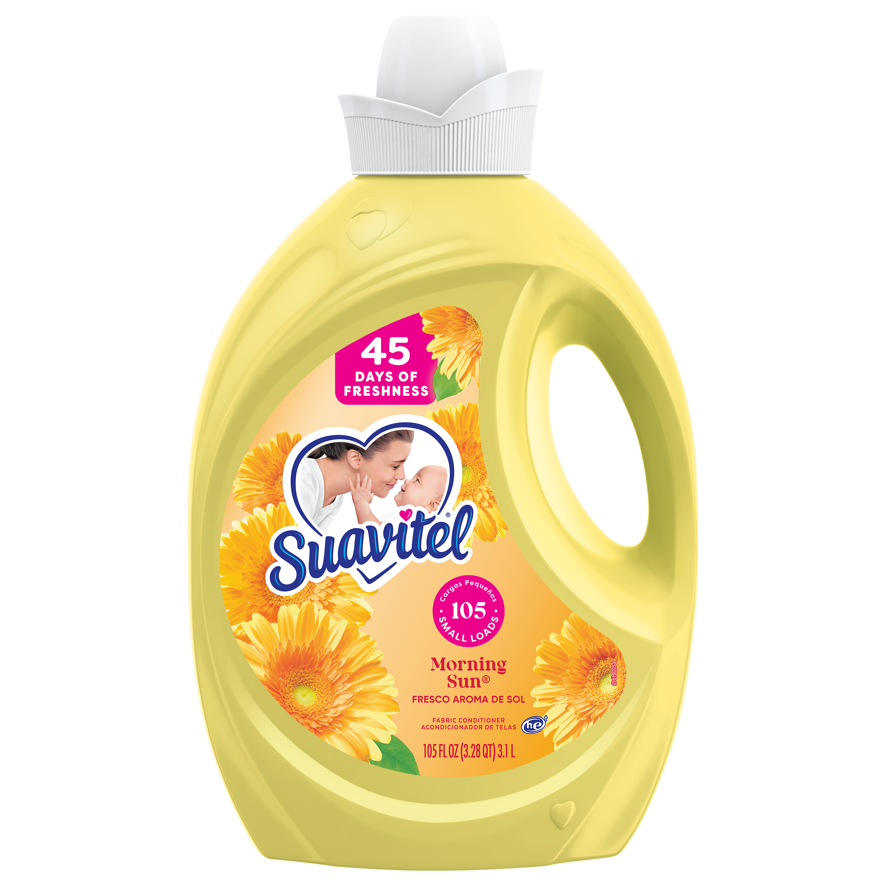 SKU 61039065 Consumer Unit - GTIN 00827854009078 Case - GTIN 10827854012440 Product Category Home Care Product Sub Category FC Liquids Product Equity (Brand) Suavitel Product Sub Brand Suavitel Liq FC Product Title Suavitel Fabric Softener, Morning Sun - 105oz eCommerce Copy- Long Description Suavitel Fabric Conditioner in Morning Sun scent is designed for busy households, with enough for 105 small loads to make frequent washing simple and convenient. Experience the light, fresh scent of a bright summer morning with every wash. Enjoy up to 45 days of freshness so your clothes, towels, and linens always smell clean and inviting between washes. Each load is wrapped in irresistible fragrance and incredible softness, leaving fabrics feeling luxuriously smooth. Our fabric softener is compatible with all washing machines, including HE models*. Suavitel cares gently for your family’s laundry and appliances. For best results, use 1 capful for small loads and more for larger loads or extra softness. Always add to the final rinse cycle, not directly on fabrics. If spotting occurs, treat with a mild bar soap and rinse. Shake well before use. Enjoy the comforting softness of a mother’s love with every wash. *Follow the washer manufacturer's use and care guide for proper dispensing of the fabric conditioner