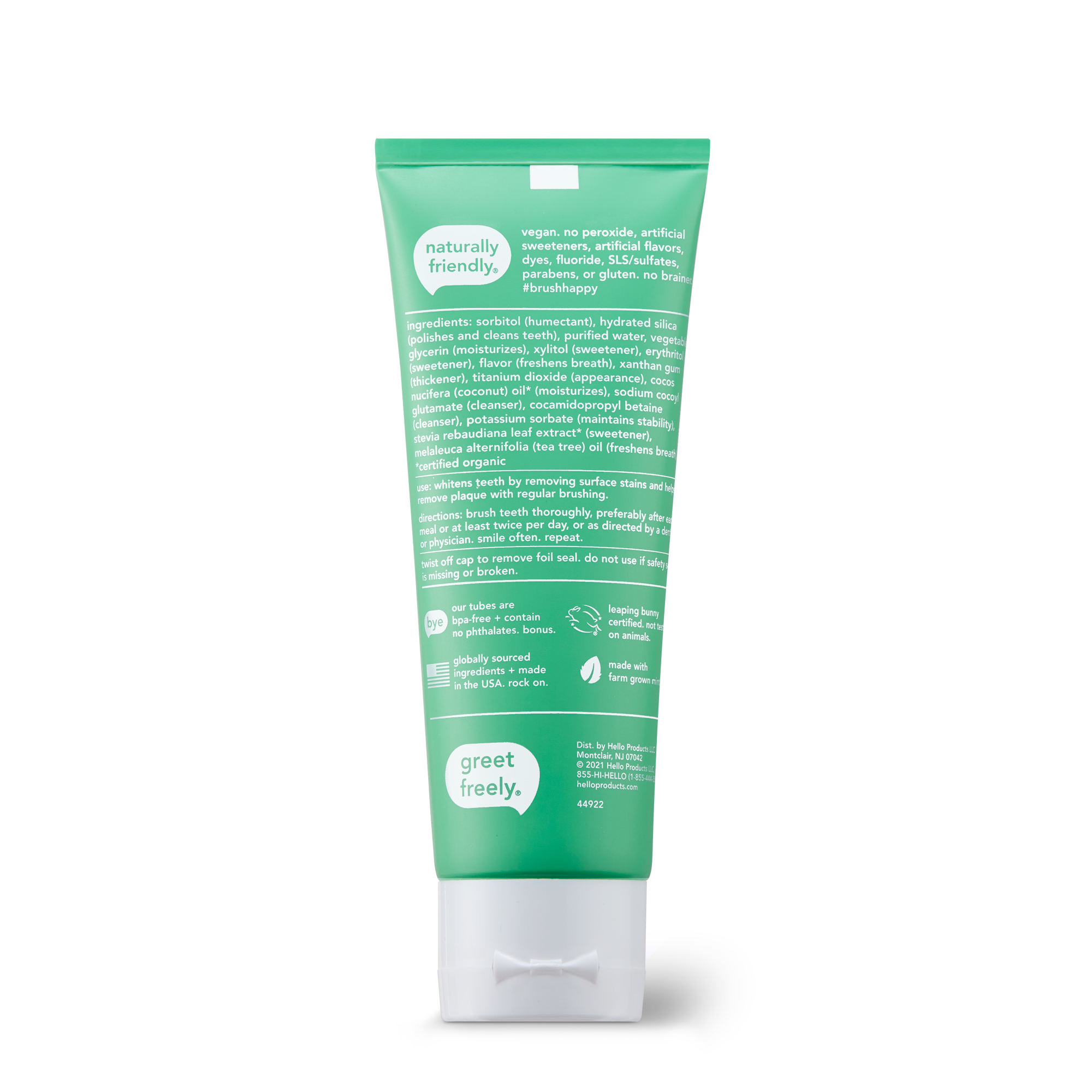 | Bullet 3 | No-BRAINER: This hello toothpaste is fluoride free and contains no artificial sweeteners, no dyes, no SLS |