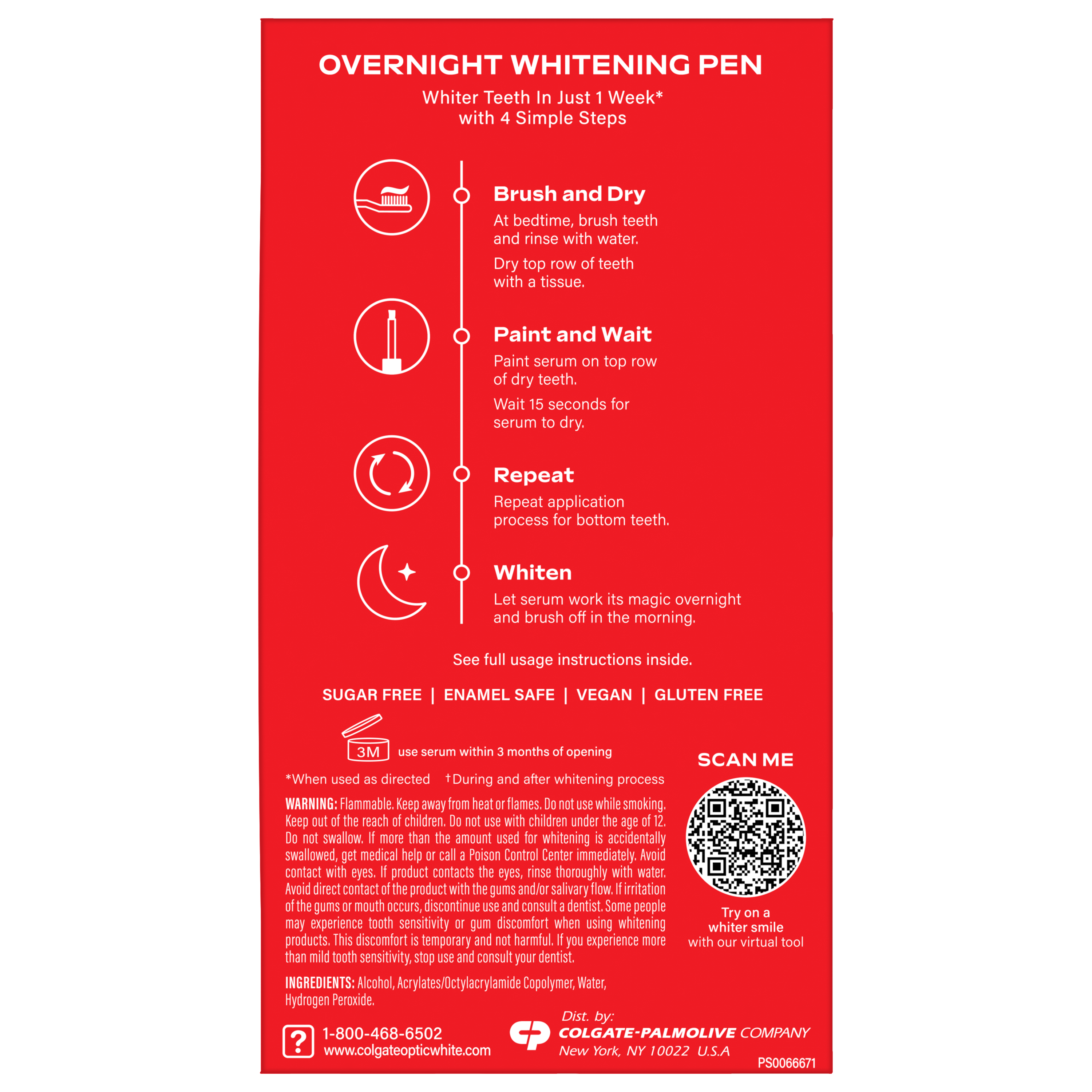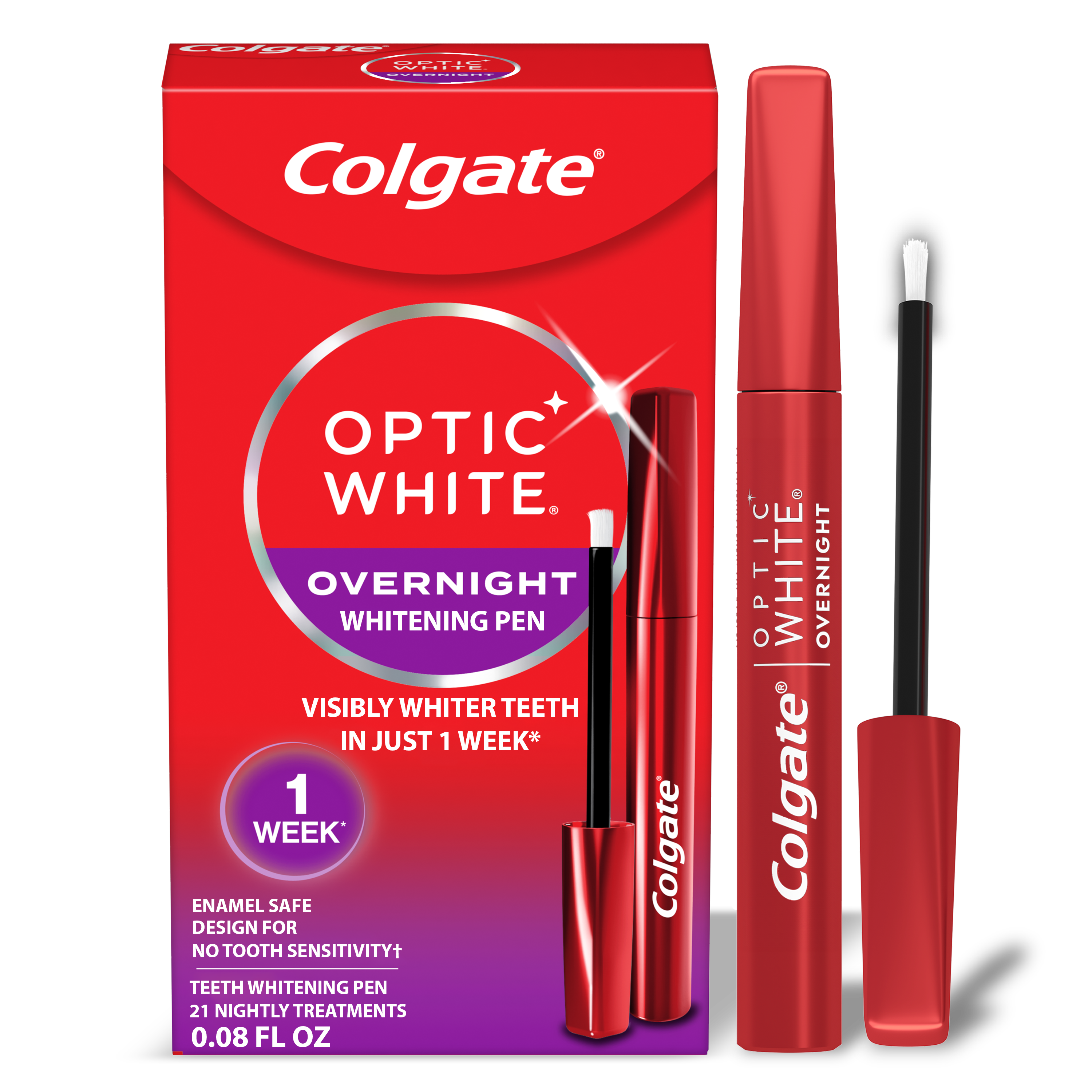SKU 61039125 Consumer Unit - GTIN 00035000970664 Case - GTIN 10035000970661 Product Category Oral Care Product Sub Category At Home Whitening Product Equity (Brand) Colgate Product Sub Brand Colgate OW Overnight Pen AHW Product Title Colgate Optic White Overnight Teeth Whitening Pen, Hydrogen Peroxide Teeth Whitening Pen, Visibly Whiter Teeth In Just 1 Week When Used as Directed, 21 Whitening Treatments, 0.08 fl oz Product Description Experience visibly whiter teeth in just 1 week* with the Colgate Optic White Overnight Teeth Whitening Pen. This Colgate whitening pen contains 21 nightly treatments and has a hydrogen peroxide-based formula that is enamel-safe and designed for no tooth sensitivity**. To use the teeth gel whitening pen, follow your regular brushing routine. Next, dry your teeth, then paint the whitening gel onto clean, dry teeth. The serum dries within seconds and will stay on your teeth overnight while you sleep. To remove the dried whitening gel serum, simply brush your teeth like normal when you wake up the next morning and enjoy a whiter smile. Repeat treatment nightly for 1-3 weeks in a row for best whitening results. Get glowing and start living your life to the brightest with the Colgate Optic White Overnight Teeth Whitening Pen. *when used as directed **during and after the whitening process eCommerce Copy- Long Description Experience visibly whiter teeth in just 1 week* with the Colgate Optic White Overnight Teeth Whitening Pen. This Colgate whitening pen contains 21 nightly treatments and has a hydrogen peroxide-based formula that is enamel-safe and designed for no tooth sensitivity**. To use the teeth gel whitening pen, follow your regular brushing routine. Next, dry your teeth, then paint the whitening gel onto clean, dry teeth. The serum dries within seconds and will stay on your teeth overnight while you sleep. To remove the dried whitening gel serum, simply brush your teeth like normal when you wake up the next morning and enjoy a whiter smile. Repeat treatment nightly for 1-3 weeks in a row for best whitening results. Get glowing and start living your life to the brightest with the Colgate Optic White Overnight Teeth Whitening Pen.