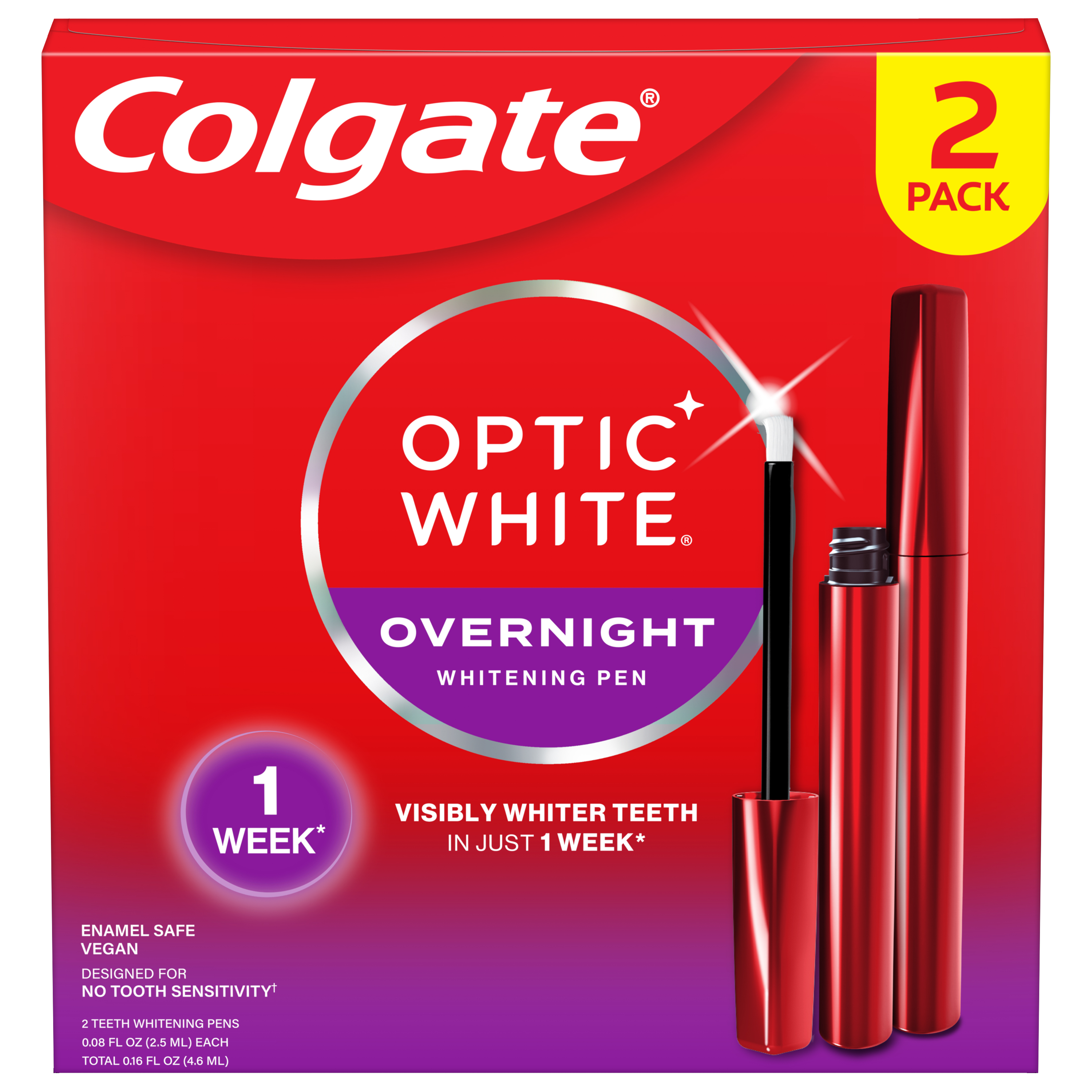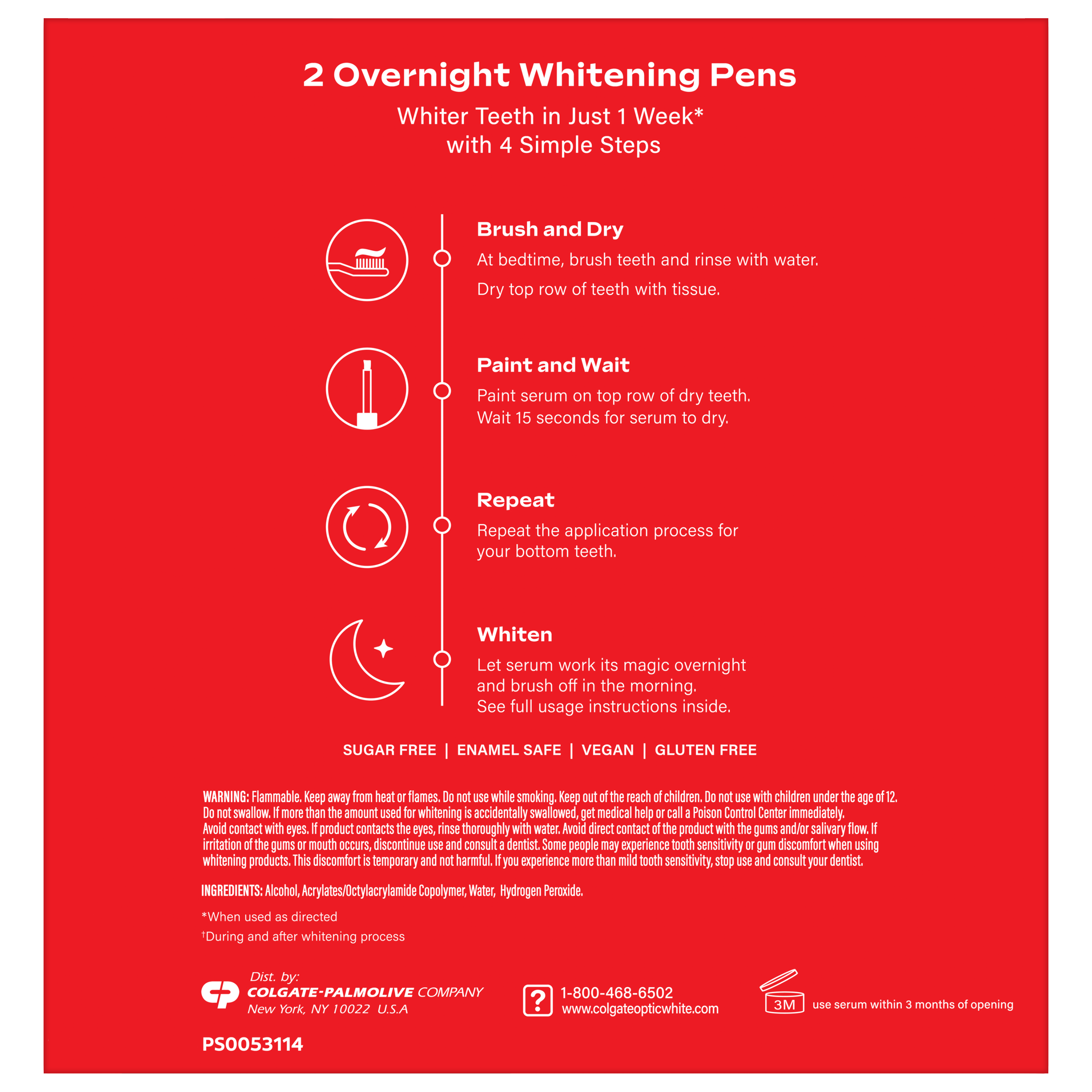 SKU 61039180 Consumer Unit - GTIN 00827854004424 Case - GTIN 10827854004421 Product Category Oral Care Product Sub Category At Home Whitening Product Equity (Brand) Colgate Product Sub Brand Colgate OW Overnight Pen AHW Product Title Colgate Optic White Overnight Teeth Whitening Pen, Hydrogen Peroxide Teeth Whitener, Visibly Whiter Teeth In Just 1 Week When Used as Directed, 21 Whitening Treatments Each, 2 Pack, 0.08 fl oz Product Description Experience visibly whiter teeth in just 1 week* with the Colgate Optic White Overnight Teeth Whitening Pen. This Colgate whitening pen double pack contains 2 pens, each with 21 nightly treatments. With a hydrogen peroxide-based formula, these pens are enamel safe and designed for no tooth sensitivity.** To use the teeth gel whitening pen, follow your regular brushing routine. Next, dry your teeth, then paint the whitening gel onto clean, dry teeth. The serum dries within seconds and will stay on your teeth overnight while you sleep. To remove the dried whitening gel serum, simply brush your teeth like normal when you wake up the next morning and enjoy a whiter smile. Repeat treatment nightly for 1-3 weeks in a row for best whitening results. Get glowing and live your life to the brightest with this 2 pack of Colgate Optic White Overnight Teeth Whitening Pens. *when used as directed **during and after the whitening process eCommerce Copy- Long Description Colgate Optic White Overnight Teeth Whitening Pen The Colgate Optic White Overnight Teeth Whitening Pen provides easy, effortless and effective teeth whitening while you sleep. Made to remove years of stains in just 1 week,* this enamel-safe, teeth whitening pen features a precision brush that dispenses a hydrogen peroxide-based whitening gel directly on the surface of each tooth. Each pen has 35 nightly uses so you can touch up when you need to and is designed for no tooth sensitivity during and after the whitening process. Effective whitening from the comfort of your own home! Just apply and let the power of the enamel safe formula work overnight. If you are looking for a brighter, whiter smile the Optic White teeth whitening formula offers an advanced whitening technology that is fast and effective, and works best when used nightly after your regular oral care routine. With Colgate Optic White, you’ll always have the confidence to soak up everything you want in life without worrying about it soaking into your teeth. Go ahead and live your life to the brightest! *When used as directed Healthy Smiles At Colgate, we make toothpaste that promotes healthy smiles. Not only because having a healthy smile is important to your overall health, but because when you have a healthy smile, you actually smile more – and that’s a powerful thing. Smiles are the simplest form of optimism, something we need now more than ever. That’s why we’re committed to raising oral healthcare standards everywhere. Bullet 1 Includes two (2) 0.08 fl oz Colgate Optic White Overnight Teeth Whitening Pens, 21 Nightly Treatments each Bullet 2 Experience visibly whiter teeth in just 1 week* using these hydrogen peroxide teeth whitening pens (*when used as directed) Bullet 3 The Colgate whitening pen features a new precision applicator to easily target the surface of each tooth with the quick-drying whitening gel formula Bullet 4 This overnight whitening pen is enamel-safe and designed for no tooth sensitivity Bullet 5 To use, dry your teeth after brushing and paint the whitening gel on each tooth, then let the gel dry overnight and brush your teeth when you wake up Bullet 6 For best whitening results, repeat the whitening treatment nightly for 1-3 weeks in a row Active Ingredients Sodium Monofluorophosphate 0.76% (0.12% w/v fluoride ion)