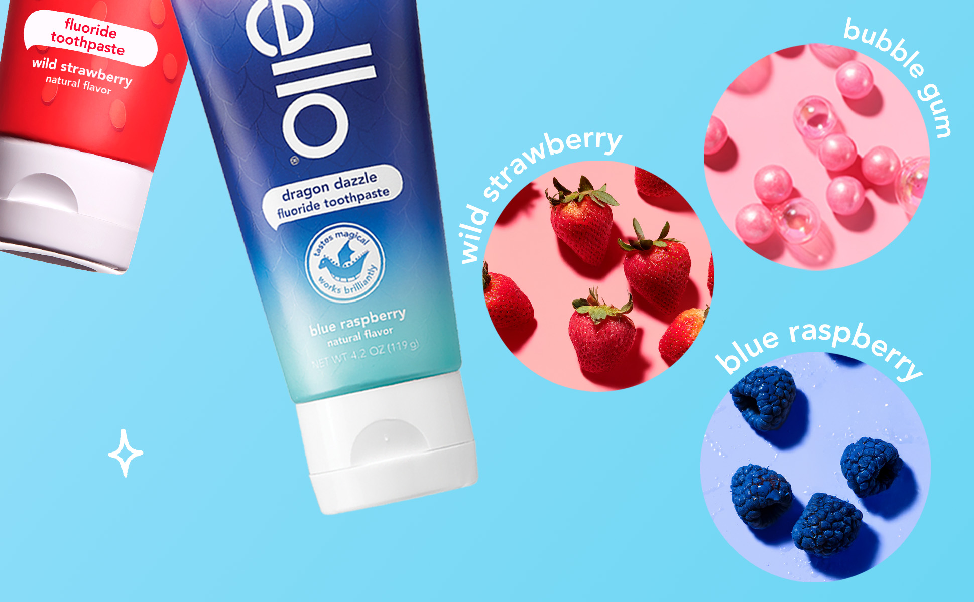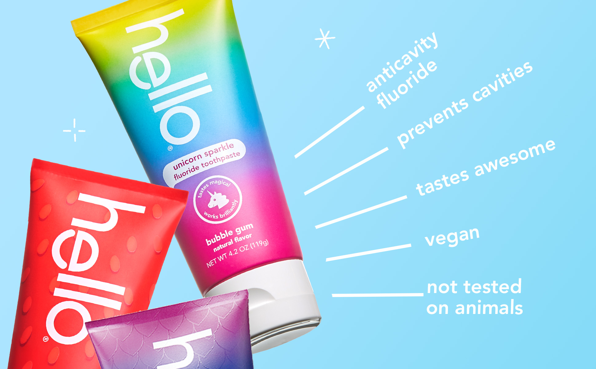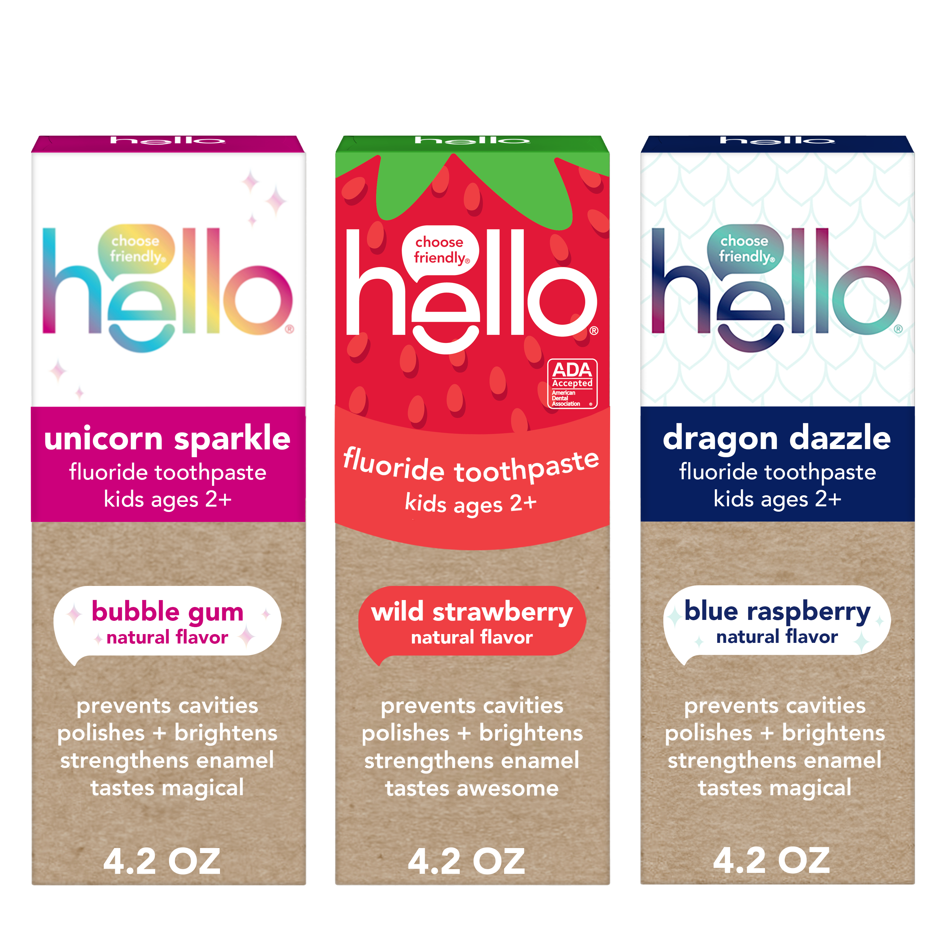 SKU 61039570 Consumer Unit - GTIN 00819156024200 Case - GTIN 10819156024207 Product Category Oral Care Product Sub Category Toothpaste Product Equity (Brand) hello Product Sub Brand Hello Kids TP Product Title hello Kids Fluoride Toothpaste Variety Pack, 3 Pack, 4.2 Oz Each Product Description Say goodbye to brush time negotiations and hello to everyday yay with hello kids toothpaste. There are 3 kids toothpaste flavors inside this toothpaste pack including Dragon Dazzle (blue raspberry toothpaste), Wild Strawberry (strawberry toothpaste), and Unicorn Sparkle (bubble gum toothpaste) that taste so delish your kids will rush to brush. These delish children’s toothpaste flavors are safe for kids ages 2 and up and are thoughtfully formulated with natural flavors. Formulated with fluoride, these child toothpaste tubes can also help prevent cavities, strengthen enamel, and help polish and brighten your little one's teeth. We’re serious about being friendly, and about what goes into little mouths. That means making a kids toothpaste that contains no artificial sweeteners, artificial flavors, preservatives, SLS, parabens, dyes, spicy mint, and that is gluten free. Plus, these children's toothpastes are Leaping Bunny Certified and not tested on animals, real or imaginary. Choose friendly and brush happy with this hello Kids Fluoride Toothpaste Variety Pack. eCommerce Copy- Long Description Say goodbye to brush time negotiations and hello to everyday yay with hello kids toothpaste. There are 3 kids toothpaste flavors inside this toothpaste pack including Dragon Dazzle (blue raspberry toothpaste), Wild Strawberry (strawberry toothpaste), and Unicorn Sparkle (bubble gum toothpaste) that taste so delish your kids will rush to brush. These delish children’s toothpaste flavors are safe for kids ages 2 and up and are thoughtfully formulated with natural flavors. Formulated with fluoride, these child toothpaste tubes can also help prevent cavities, strengthen enamel, and help polish and brighten your little one's teeth. We’re serious about being friendly, and about what goes into little mouths. That means making a kids toothpaste that contains no artificial sweeteners, artificial flavors, preservatives, SLS, parabens, dyes, spicy mint, and that is gluten free. Plus, these children's toothpastes are and not tested on animals, real or imaginary. Choose friendly and brush happy with this hello Kids Fluoride Toothpaste Variety Pack. Bullet 1 This kids fluoride toothpaste pack includes one (1) Wild Strawberry Toothpaste, one (1) Dragon Dazzle blue raspberry toothpaste, and one (1) Unicorn Sparkle bubble gum toothpaste, 4.2 oz. each Bullet 2 This kids toothpaste variety pack is safe for children ages 2 and up and helps prevent cavities and strengthens enamel in growing teeth using fluoride Bullet 3 Enjoy rocking natural flavors like wild strawberry, blue raspberry, and even a bubble gum flavored unicorn toothpaste in this kids toothpaste pack Bullet 4 hello Kids Fluoride Toothpaste Variety Pack helps polish and brighten little smiles Bullet 5 Each of these gluten-free kids toothpaste tubes contain no SLS, preservatives, parabens, dyes, spicy mint, artificial sweeteners, or artificial flavors; plus they’re Leaping Bunny Certified and not tested on animals, real or imaginary Active Ingredients Strawberry fluoride toothpaste: sodium fluoride 0.24% (0.15% w/v fluoride ion) Dragon dazzle fluoride toothpaste Active: sodium fluoride 0.24% (0.15% w/v fluoride ion) Unicorn toothpaste Active: sodium fluoride 0.24% (0.15% w/v fluoride ion) Amazon RPC B0C5B7VFW7 AMZ URL https://www.amazon.com/dp/B0C5B7VFW7