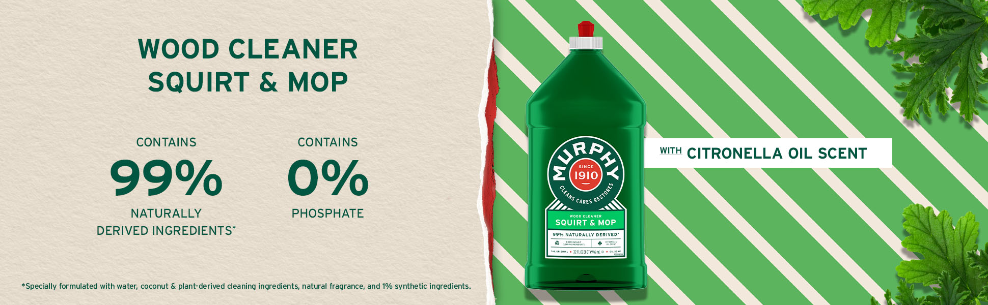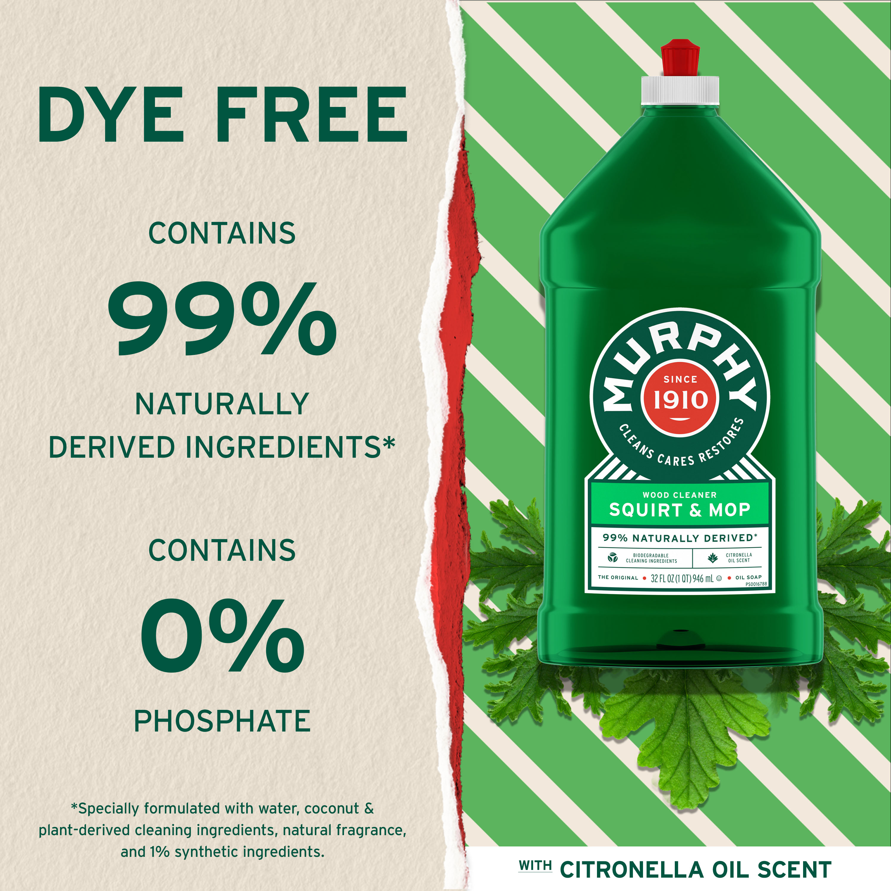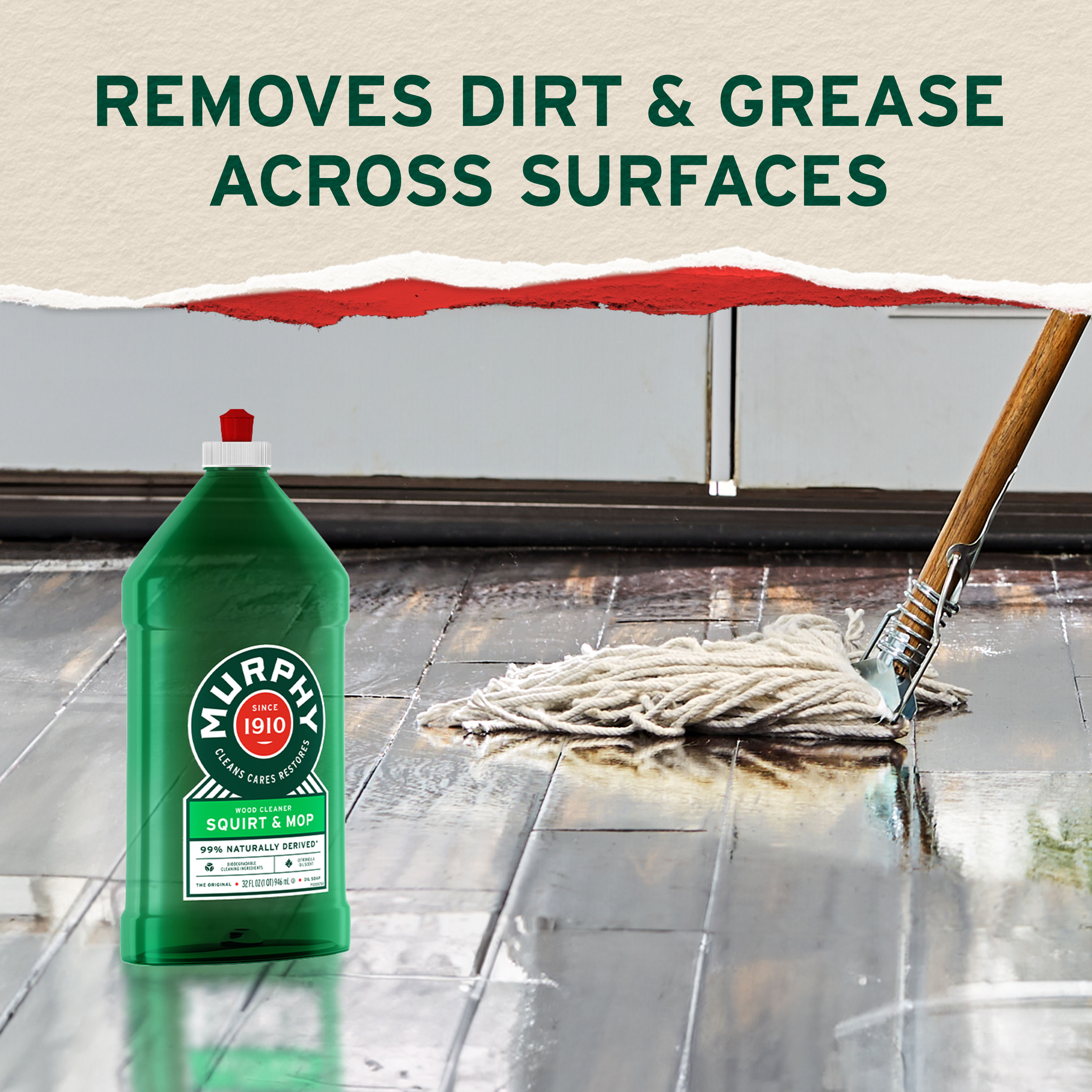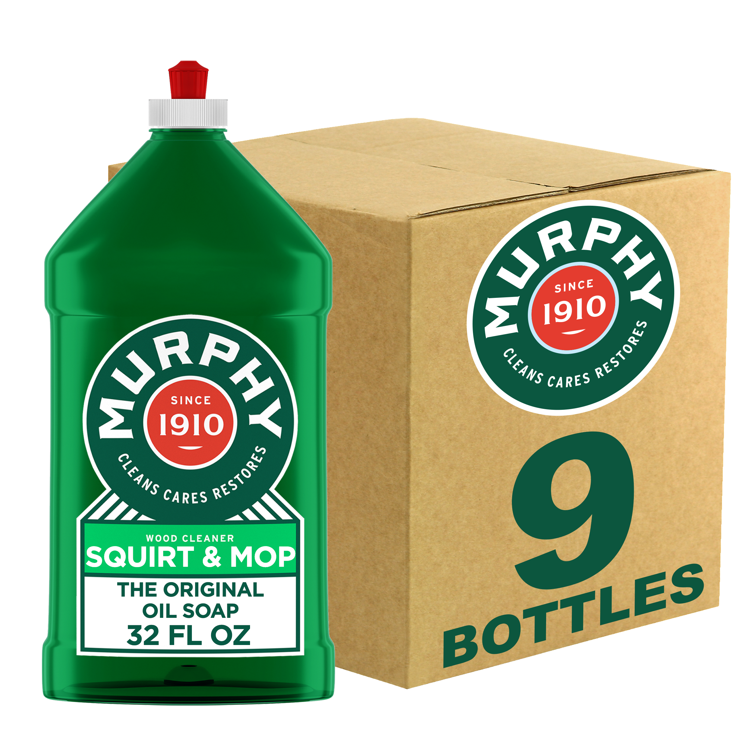 SKU 61039614 Consumer Unit - GTIN 00070481011505 Case - GTIN 10827854013096 Product Category Home Care Product Sub Category Cleaners Liquid / Gel Product Equity (Brand) Murphy Product Sub Brand Murphy Liq Cln Product Title Murphy Oil Soap Squirt and Mop Concentrated Formula, Wood Cleaner, No-Rinse Floor Cleaner, Citronella Oil Scent, 32 fl oz Bottle Product Description Murphy Oil Soap Squirt and Mop is a trusted choice for safely cleaning wood and a variety of surfaces in your home. Specially formulated to remove dirt and grease, this cleaner restores both finished wood and non-wood surfaces to their natural beauty with ease. Use on finished wood (wood floor, wood paneling, bookcases, tables, chairs, cabinets, laminate floors) and non-wood surfaces (no-wax floors, ceramic tile, painted surfaces, laundry stains, vinyl). Made with 99% natural ingredients (1), is dye free, and has 0% phosphates. Directions: squirt directly from the bottle onto the floor in a 3’ x 3’ section, avoid puddling. Using a well-wrung-out mop, clean immediately with even strokes. Move to next section of the floor and repeat. No visible residue, no rinsing required. Squirt directly from the bottle onto cloth. Wipe clean to reveal wood’s natural beauty! Whether you’re caring for wood floors, cabinets, tables, or tackling other household surfaces like ceramic tile and no-wax floors, Murphy Oil Soap is the versatile cleaner you can rely on to maintain your home’s warmth and charm. (1) Specially formulated with: water, plant-derived cleaning ingredients, natural fragrance, and 1% synthetic ingredients eCommerce Copy- Long Description Murphy Oil Soap Wood Squirt and Mop When it comes to cleaning the surfaces in your home, Murphy® Original Oil Soap Squirt and Mop is the real deal. It cleans, cares and restores both finished wood and non-wood surfaces safely and gently, with an ammonia and bleach free formula that’s 99% natural*, biodegradable and phosphate free. Murphy® Original Oil Soap is the fresh multi-purpose wood soap that cleans the new and restores the old, to maintain a beautiful shine and make your home feel even more like a home. *Specially formulated with: water, coconut & plant-derived cleaning ingredients, natural fragrance, and 1% synthetic ingredients. A Cleaner That’s As Natural As It Is Reliable For generations, Murphy® Original Oil Soap Squirt and Mop has helped families like yours clean wood to a natural shine. Today, there’s no substitute for cleaning nearly every surface in your home, from cabinets to counters to hardwood floors and more. Our 98% naturally* derived ingredients are safe to use anywhere you need it most, so bring back what matters with Murphy® Original Oil Soap. Trusted For Over 100 Years What started in Newburgh Ohio in the 1800’s as a family-owned business manufacturing oils for valves, cylinders, machines and harnesses, has evolved into one of the most dependable cleaners of the past century. With unsurpassed cleaning power and a natural approach, Murphy® Original oil soap is the all-purpose cleaner trusted since 1910, and we’re just getting started. Bullet 1 One 32 fl oz bottle of Murphy Oil Soap Squirt and Mop, Wood Cleaner, Citronella Oil Scent Bullet 2 Safely cleans wood to a natural shine Bullet 3 It removes dirt and grease across surfaces in your home Bullet 4 Made with 99% natural ingredients (1), is dye free, and has 0% phosphates Bullet 5 Use on finished wood such as wood floors, wood paneling, bookcases, tables, chairs, cabinets, and laminate floors Bullet 6 Suitable for non-wood surfaces including no-wax floors, ceramic tile, painted surfaces, laundry stains, and vinyl