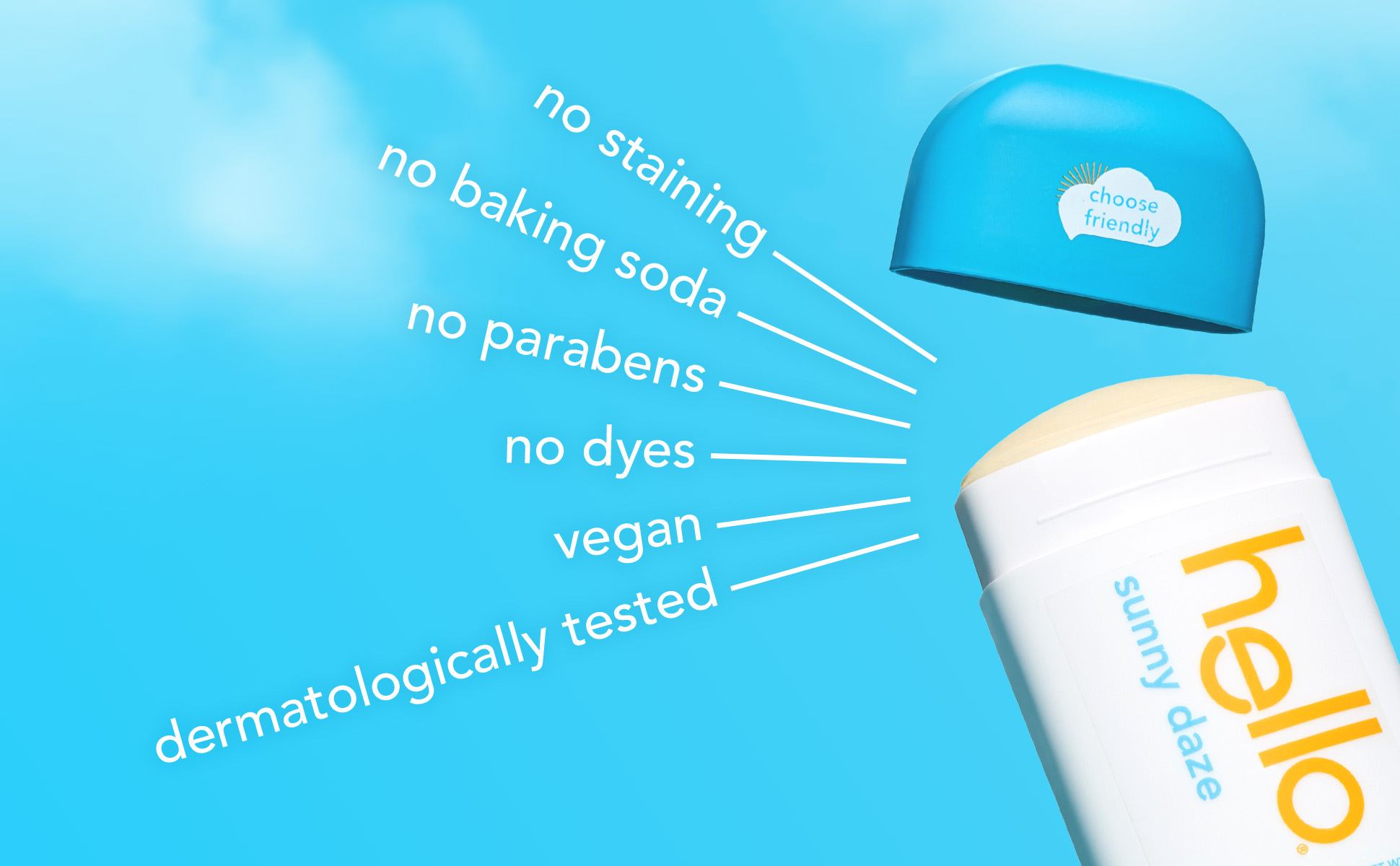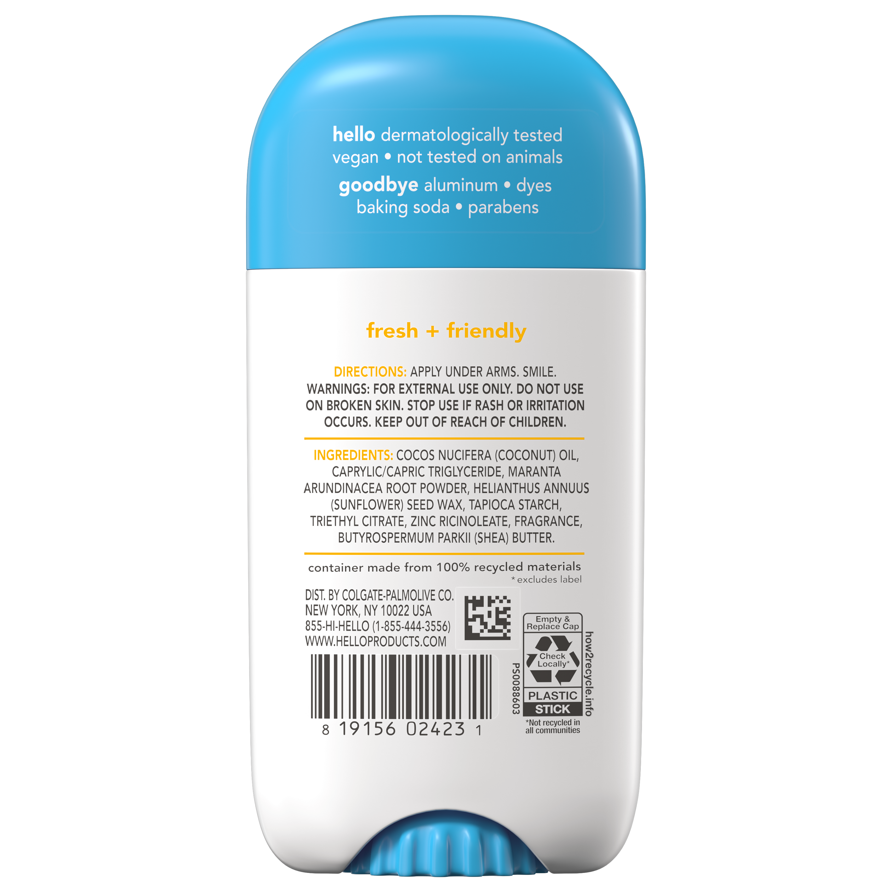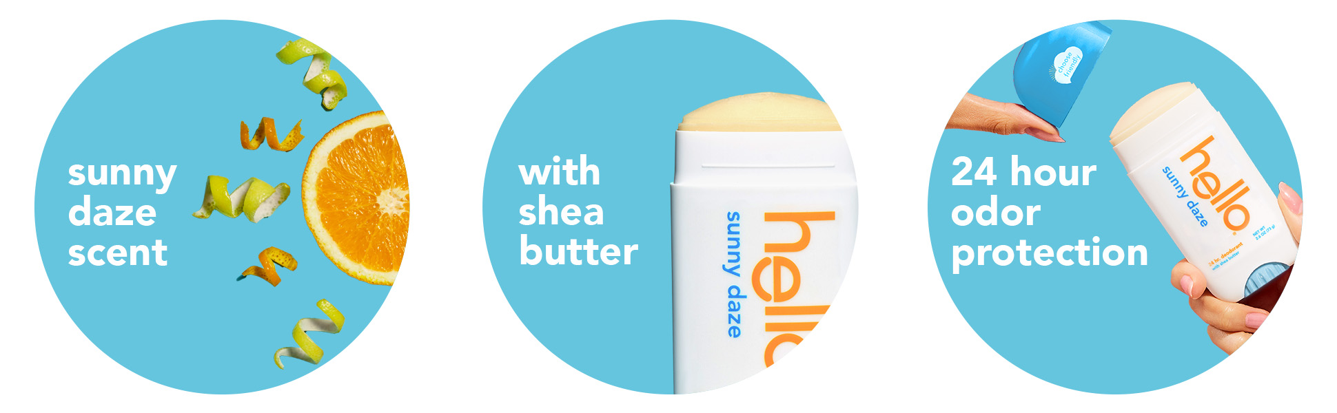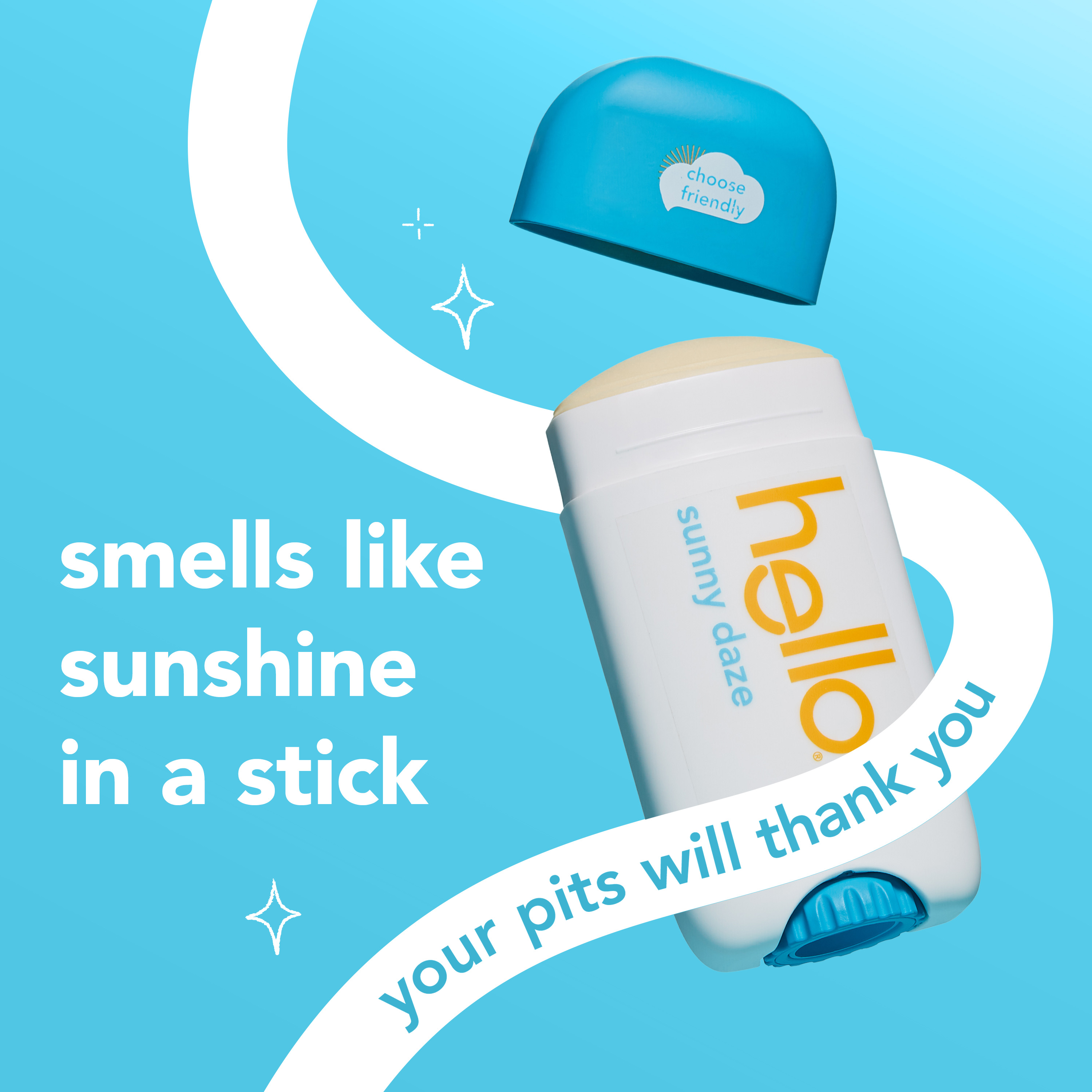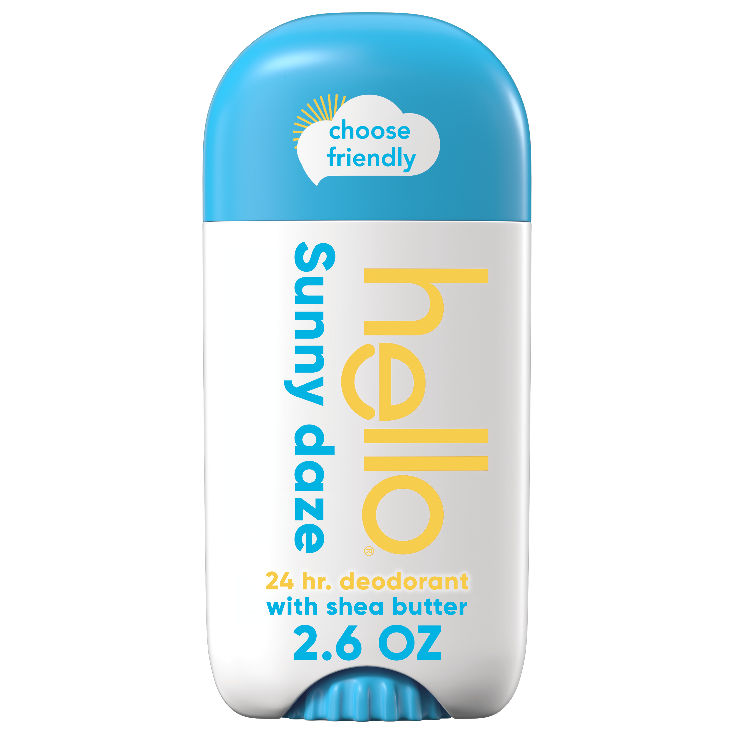 SKU 61039621 Consumer Unit - GTIN 00819156024231 Case - GTIN 10819156024238 Product Category Personal Care Product Sub Category AP > Deo Product Equity (Brand) Hello Product Sub Brand Hello AP/Deo Product Title hello Sunny Daze Aluminum Free Deodorant for Women and Men with Shea Butter, 24-Hour Freshness, Baking Soda Free Deodorant, Dermatologically Tested, 2.6 oz Deodorant Stick Product Description Say hello to hello Sunny Daze Aluminum Free Deodorant. A bright, refreshing mix of citrus, white tea, and a hint of warm vanilla will leave you smelling like sunshine. Our 24-hour deodorant with shea butter is dermatologically tested and naturally scented to keep you feeling fresh all day. Say goodbye to aluminum, baking soda, parabens, and dyes. Plus, it glides on easily for a smooth application and won’t stain your clothes. Choose friendly with a deodorant that's not tested on animals and vegan for happy underarms. Anything less would be the pits. eCommerce Copy- Long Description Say hello to hello Sunny Daze Aluminum Free Deodorant. A bright, refreshing mix of citrus, white tea, and a hint of warm vanilla will leave you smelling like sunshine. Our 24-hour deodorant with shea butter is dermatologically tested and naturally scented to keep you feeling fresh all day. Say goodbye to aluminum, baking soda, parabens,and dyes. Plus, it glides on easily for a smooth application and won’t stain your clothes. Choose friendly with a deodorant that's not tested on animals and is vegan for happy underarms. Anything less would be the pits. Bullet 1 WHAT I’M GETTING: Includes one 2.6 oz deodorant stick of hello Sunny Daze Aluminum Free Deodorant for Men and Women Bullet 2 ALUMINUM FREE PROTECTION: Free of aluminum, dyes, baking soda, and parabens Bullet 3 NATURALLY SCENTED: A bright, refreshing mix of citrus, white tea, and a hint of warm vanilla Bullet 4 24-HOUR DEODORANT WITH SHEA BUTTER: Keeps you fresh + friendly for 24 hours, so you can take on the day with confidence Bullet 5 KNOW YOUR DEODORANT: Vegan and dermatologically tested