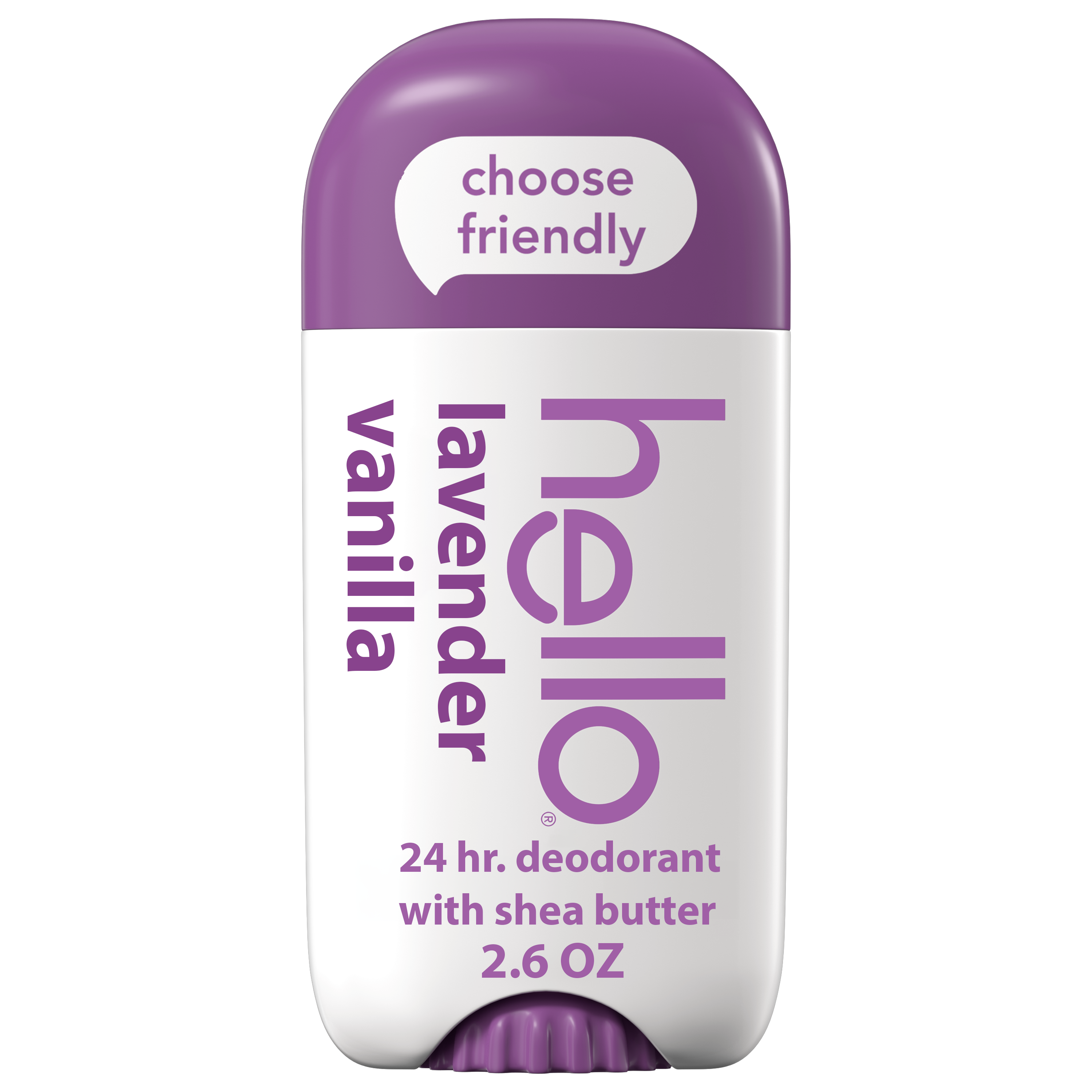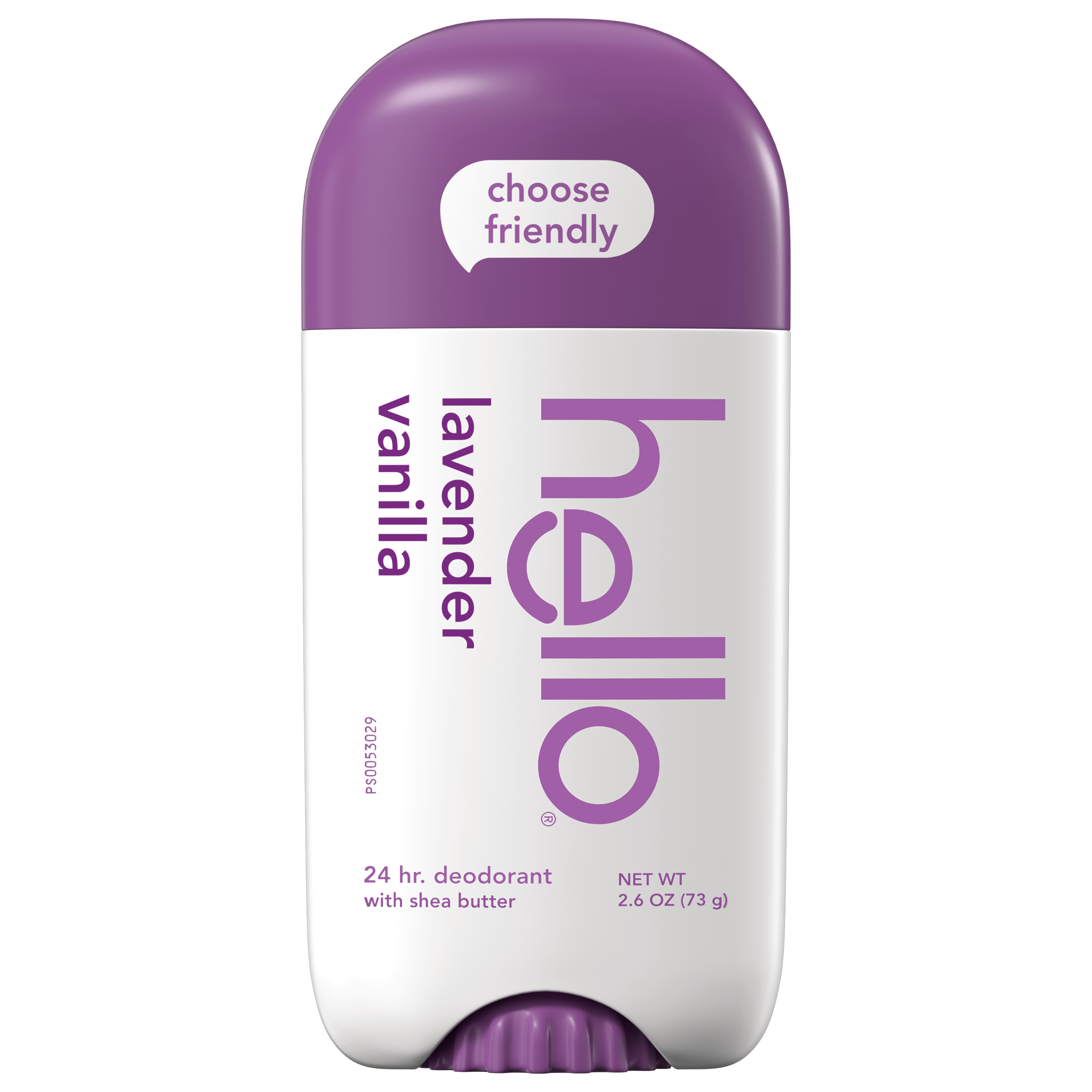 SKU 61039622 Consumer Unit - GTIN 00819156023029 Case - GTIN 10819156023026 Product Category Personal Care Product Sub Category AP > Deo Product Equity (Brand) hello Product Sub Brand Hello AP/Deo Product Title hello Lavender Vanilla Aluminum Free Deodorant for Women and Men with Shea Butter, 24-Hour Freshness, Baking Soda Free Deodorant, Dermatologically Tested, 2.6 oz Stick Product Description Say hello to hello Lavender Vanilla Aluminum Free Deodorant. The fresh scent of lavender with the soft, warm notes of vanilla are like a cozy blanket for the senses. Our 24-hour deodorant with shea butter is dermatologically tested and naturally scented to keep you feeling fresh all day. Say goodbye to aluminum, baking soda, parabens, and dyes. Plus, it glides on easily for a smooth application and won’t stain your clothes. Choose friendly with a deodorant that's not tested on animals and vegan for happy underarms. Anything less would be the pits. eCommerce Copy- Long Description Say hello to hello Lavender Vanilla Aluminum Free Deodorant. The fresh scent of lavender with the soft, warm notes of vanilla are like a cozy blanket for the senses. Our 24-hour deodorant with shea butter is dermatologically tested and naturally scented to keep you feeling fresh all day. Say goodbye to aluminum, baking soda, parabens,and dyes. Plus, it glides on easily for a smooth application and won’t stain your clothes. Choose friendly with a deodorant that's not tested on animals and is vegan for happy underarms. Anything less would be the pits. Bullet 1 WHAT I’M GETTING: Includes one 2.6 oz deodorant stick of hello Lavender Vanilla Aluminum Free Deodorant for Men and Women Bullet 2 ALUMINUM FREE PROTECTION: Free of aluminum, dyes, baking soda, and parabens Bullet 3 NATURALLY SCENTED: Take your nose on a staycation with the relaxing scent of lavender and the cozy snuggle of warm vanilla Bullet 4 24-HOUR DEODORANT WITH SHEA BUTTER: Keeps you fresh + friendly for 24 hours, so you can take on the day with confidence Bullet 5 KNOW YOUR DEODORANT: Vegan and dermatologically tested Amazon RPC B0CRHZR41C AMZ URL https://www.amazon.com/dp/B0CRHZR41C