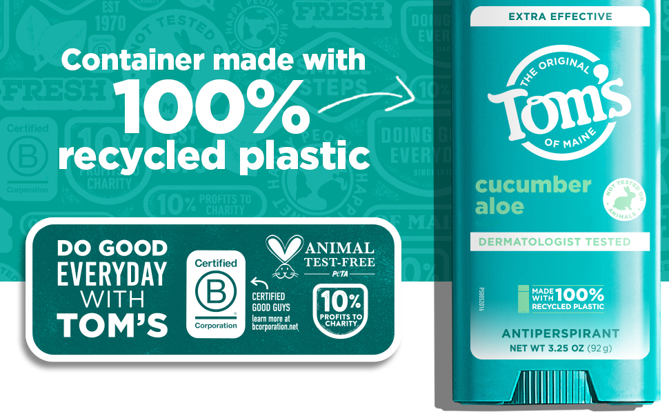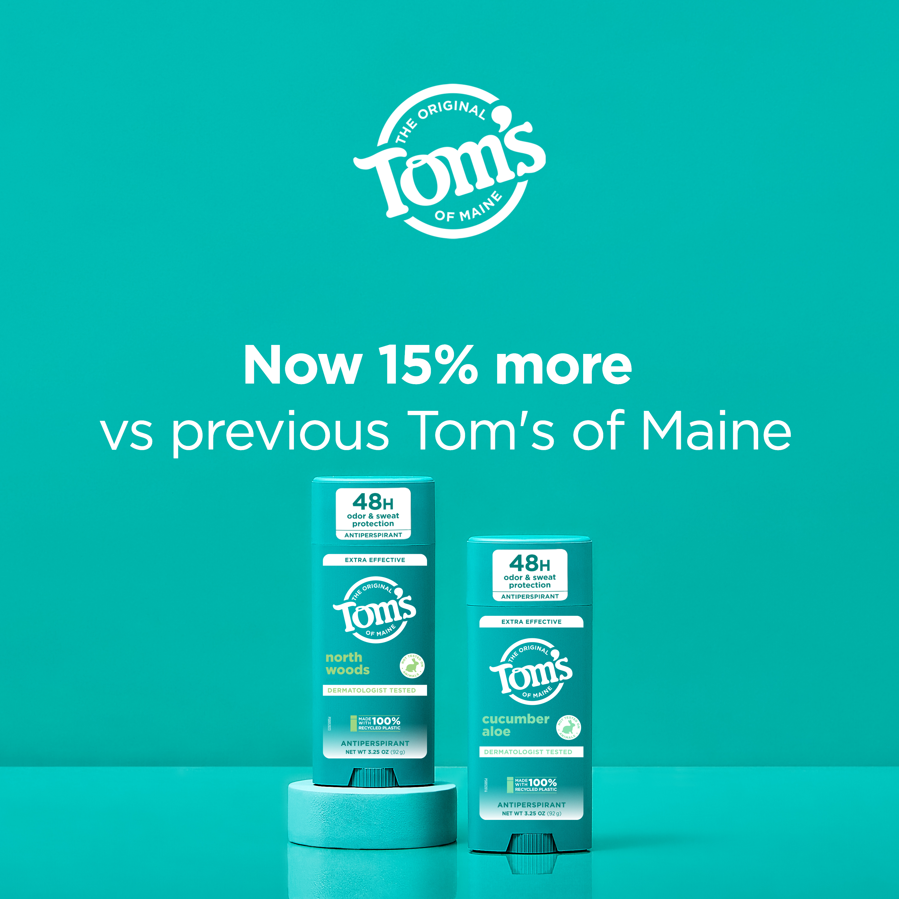 SKU 61039632 Consumer Unit - GTIN 00827854013105 Case - GTIN 10827854013102 Product Category Personal Care Product Sub Category AP > Deo Product Equity (Brand) Tom's of Maine Product Sub Brand Tom's AP/Deo Product Title Tom’s of Maine Cucumber Aloe Antiperspirant, For Women and Men, 3.25 oz (2 Pack) Product Description Tom’s of Maine antiperspirant is designed with inclusivity in mind, offering options for men, women, and really, it's for everyone, because feeling fresh and confident knows no gender boundaries. Get protection you can count on with Tom’s of Maine Cucumber Aloe antiperspirant, which offers 48 hour sweat and odor protection to keep you feeling fresh and confident. Our antiperspirant for men and women ensures all-day freshness, especially for those who aren't afraid to break a sweat! Whenever you need extra effective protection, you can rest easy knowing that our antiperspirant will do the job while being dermatologist tested and free from artificial fragrances, parabens and baking soda. What’s more, we’re not tested on animals and we’re proud to offer our product in a new, bigger size v our prior antiperspirants. The container is also made with 100% recycled plastic. At Tom’s of Maine, we’re a certified B Corporation committed to creating effective products, while giving back 10% of annual profits to charity. Smell good, feel good. eCommerce Copy- Long Description Tom’s of Maine antiperspirant is designed with inclusivity in mind, offering options for men, women, and really, it's for everyone, because feeling fresh and confident knows no gender boundaries. Get protection you can count on with Tom’s of Maine Cucumber Aloe antiperspirant, which offers 48 hour sweat and odor protection to keep you feeling fresh and confident. Our antiperspirant for men and women ensures all-day freshness, especially for those who aren't afraid to break a sweat! Whenever you need extra effective protection, you can rest easy knowing that our antiperspirant will do the job while being dermatologist tested and free from artificial fragrances, parabens and baking soda. What’s more, we’re not tested on animals and we’re proud to offer our product in a new, bigger container v. our prior antiperspirants and is made with 100% recycled plastic. At Tom’s of Maine, we’re a certified B Corporation committed to creating effective products, while giving back 10% of annual profits to charity. Smell good, feel good. Bullet 1 Two (2) 3.25 oz Tom’s of Maine Cucumber Aloe Antiperspirant, with Recycled Aluminum for men and women, it's for everyone Bullet 2 Underarm antiperspirant for everyone offers extra effective 48 hour sweat and odor protection keeping you feeling fresh and confident all day long Bullet 3 Cucumber aloe scent gives you all-day freshness Bullet 4 Dermatologist tested and has no artificial fragrances, parabens or baking soda Bullet 5 This antiperspirant is not tested on animals Amazon RPC B0CQ74BQYF AMZ URL https://www.amazon.com/dp/B0CQ74BQYF