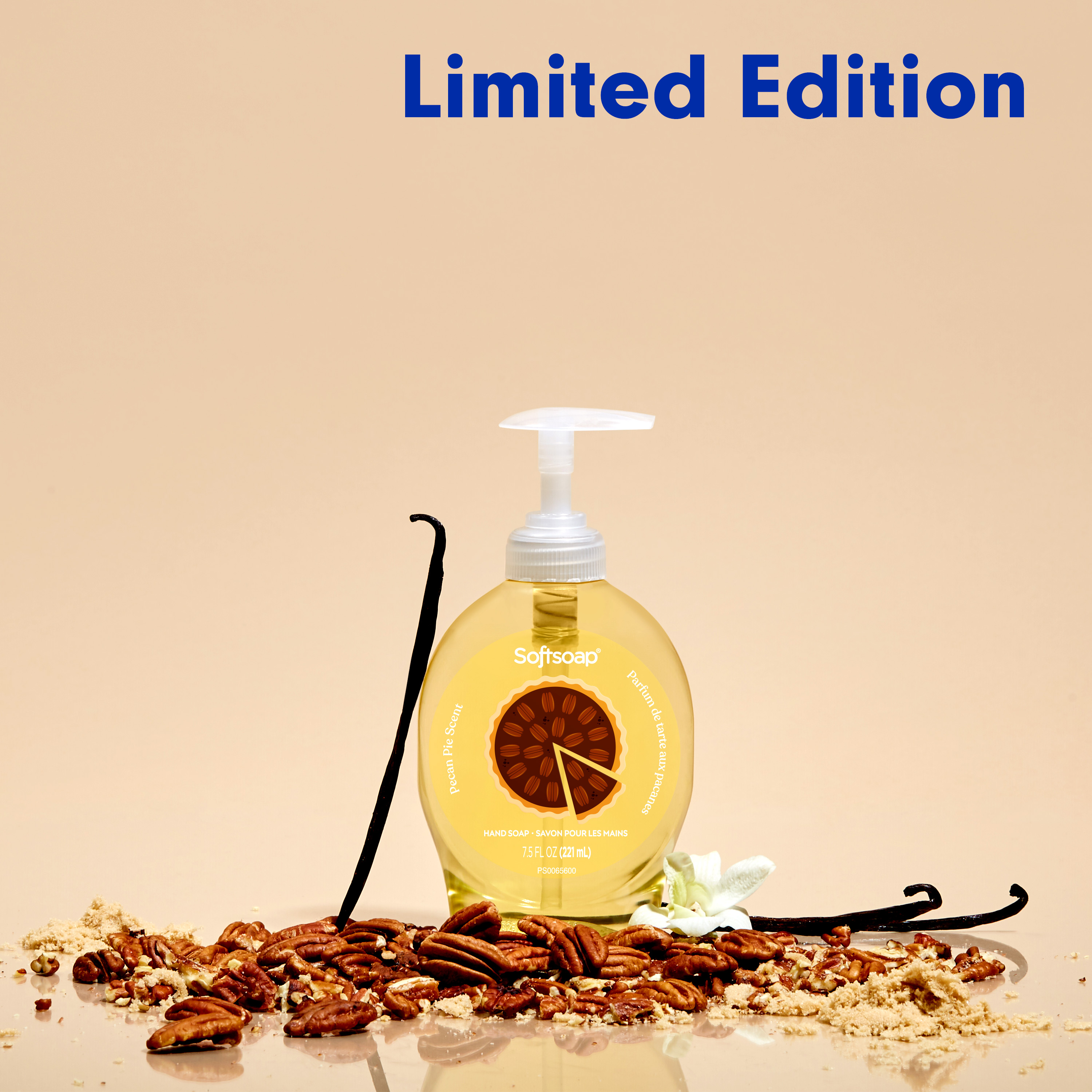 SKU 61039805 Consumer Unit - GTIN 00827854013396 Case - GTIN 10827854013393 Product Category Personal Care Product Sub Category Liquid Hand Wash Product Equity (Brand) Softsoap Product Sub Brand Softsoap LHW Product Title Softsoap Limited Edition Pecan Pie Liquid Hand Soap, Kitchen or Bathroom Hand Soap, 7.5 oz Pump Bottle Product Description Enhance your daily routine with the seasonal charm of Softsoap's Limited Edition Pecan Pie Liquid Hand Soap. As America's #1 Liquid Hand Soap brand, this special fall and winter edition captures the warm, inviting scent of pecan pie, bringing a rich and comforting aroma to your home. Inspired by the cozy spirit of the colder months, its charming packaging recalls the warmth of holiday gatherings, highlighted by the pecan pie theme. This hand soap effectively cleanses away bacteria, while its formula—free from parabens and phthalates—helps skin retain natural moisture. Ideal for use throughout the home, from kitchen to bathroom, it’s a perfect addition to any space needing a seasonal touch. Embrace the essence of fall and winter with this inviting pecan pie scent. Available for a limited time—stock up now to enjoy a little extra warmth and charm in your daily routine! (1) Based in part on data reported by Nielsen through its Market Track Service for the Liquid Hand Soap Category for the 52 week period ending 06/01/24, for the All Outlet market. Copyright © 2024 Nielsen Bullet 1 One 7.5 oz pump bottle of Softsoap Limited Edition Pecan Pie Liquid Hand Soap Bullet 2 Softsoap’s seasonal hand soap sparks joy and brightens up your day Bullet 3 This winter hand soap helps to retain skin's natural moisture Bullet 4 This scented hand soap is paraben-free and formulated without phthalates Bullet 5 Health care agencies recommend washing hands with soap and clean running water for 20 seconds to wash away dirt and bacteria Bullet 6 Versatile to use in the bathroom, as a kitchen hand soap, or any other space that needs a touch of fun Walmart RPC 5406108099 Walmart URL (Computed) https://www.walmart.com/ip/a/5406108099