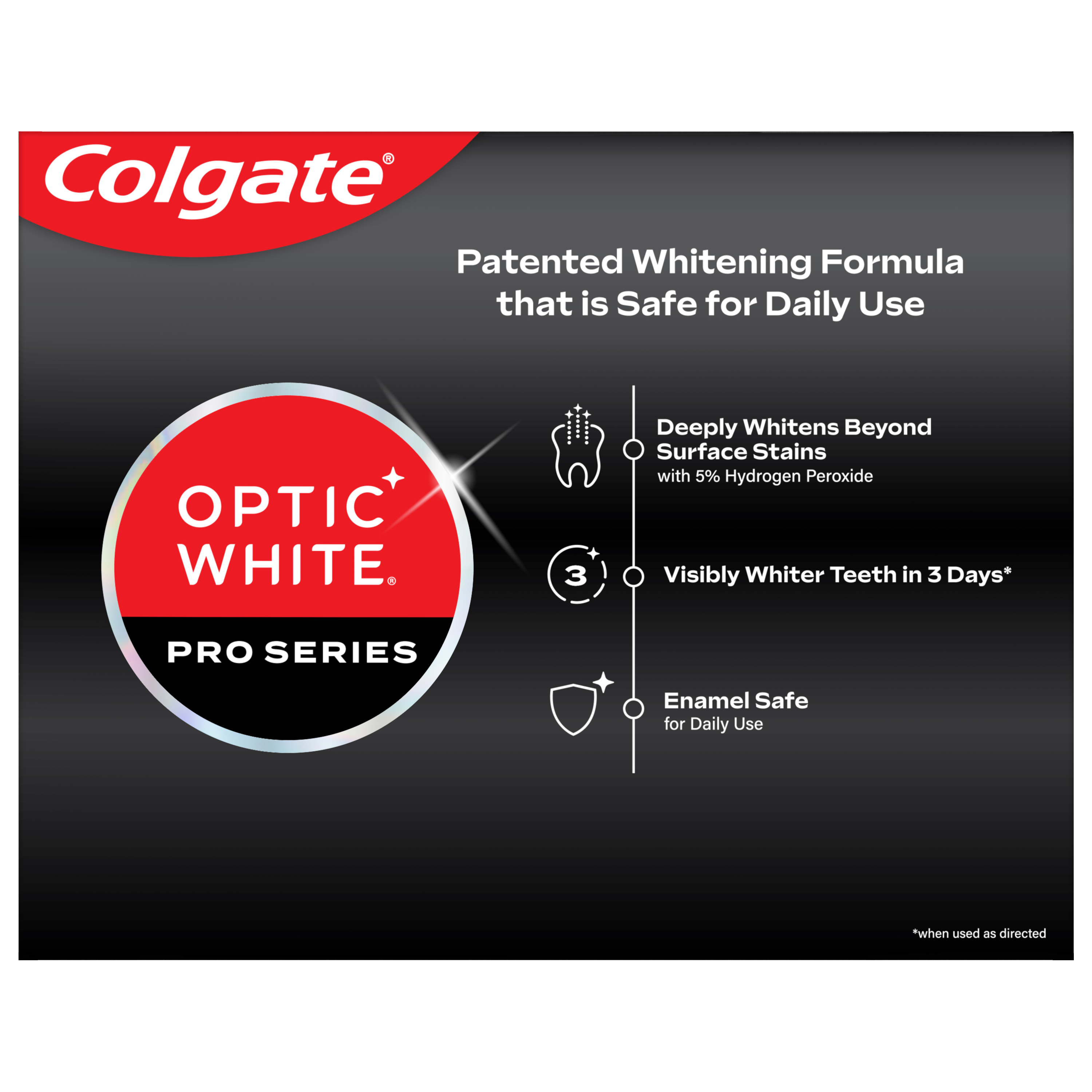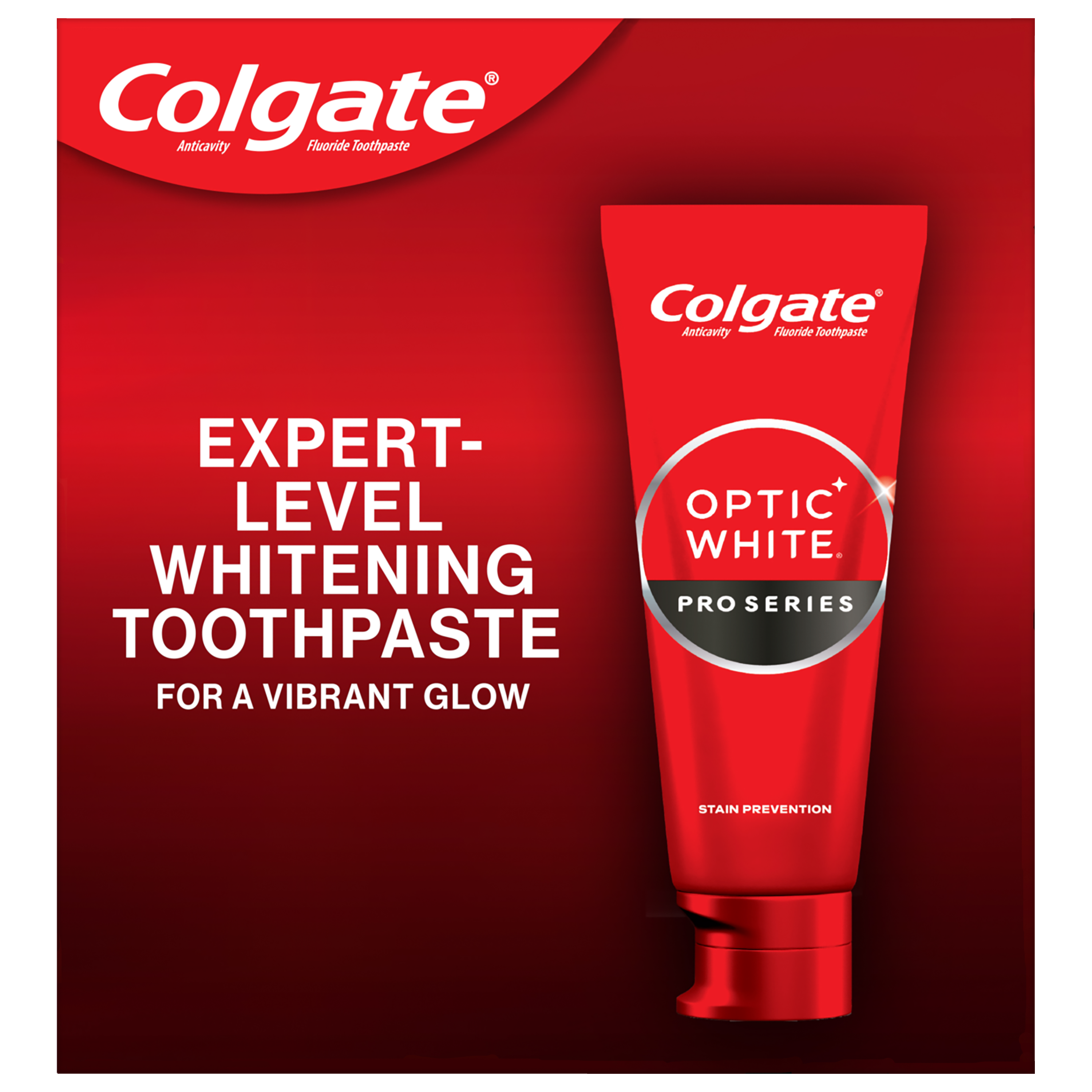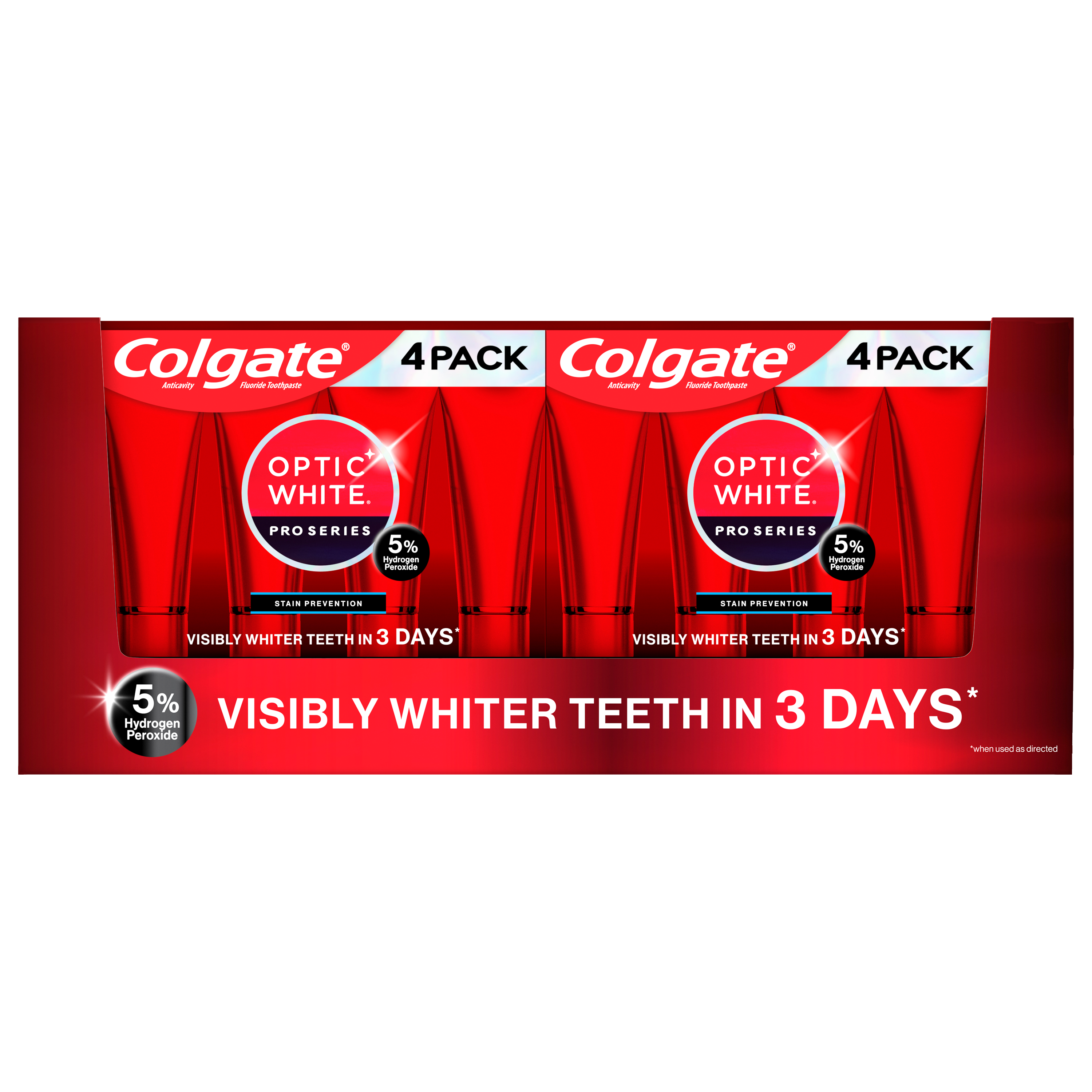SKU 61040111 Consumer Unit - GTIN 00827854999997 Product Category Oral Care Product Sub Category Toothpaste Product Equity (Brand) Colgate Product Sub Brand Colgate Optic White TP Product Title Colgate Optic White Pro Series Vividly Fresh Hydrogen Peroxide Toothpaste Product Description Experience visibly whiter teeth in 3 days* with Colgate Optic White Pro Series Vividly Fresh Hydrogen Peroxide Toothpaste. Use this teeth whitening toothpaste with a 5% hydrogen peroxide-based formula to deeply whiten beyond surface stains. Colgate Optic White Pro Series Vividly Fresh Toothpaste effectively removes tea, coffee, and wine stains so you can achieve a white smile. Colgate Optic White Pro Series Hydrogen Peroxide Toothpaste is a patented whitening toothpaste with 5% hydrogen peroxide that deeply whitens and is enamel-safe. This teeth whitening toothpaste is also an anticavity fluoride toothpaste to help prevent cavities. For whitening that works, choose the Colgate Optic White Pro Series Vividly Fresh Hydrogen Peroxide Toothpaste. Reveal a smile that dazzles with Colgate Optic White Pro Series Toothpaste. Use this expert level whitening toothpaste for a vibrant glow and visibly whiter teeth*. Colgate Optic White Pro Series Hydrogen Peroxide Toothpaste is a gluten free, sugar free, and vegan toothpaste that has a refreshing mint toothpaste flavor. Unlock a bright, radiant smile with the Colgate Optic White Pro Series Vividly Fresh Hydrogen Peroxide Toothpaste. *when used as directed eCommerce Copy- Long Description Colgate Optic White Pro Series Stain Prevention Hydrogen Peroxide Toothpaste, 3.3 oz, 4 pk Experience visibly whiter teeth in 3 days* with Colgate Optic White Pro Series Stain Prevention Hydrogen Peroxide Toothpaste. Use this teeth whitening toothpaste with a 5% hydrogen peroxide-based formula to deeply whiten beyond surface stains. Colgate Optic White Pro Series Stain Prevention Toothpaste effectively removes tea, coffee, and wine stains so you can achieve a white smile. Whitening That Works Colgate Optic White Pro Series Hydrogen Peroxide Toothpaste is a patented whitening toothpaste with 5% hydrogen peroxide that deeply whitens and is enamel-safe. This teeth whitening toothpaste is also an anticavity fluoride toothpaste to help prevent cavities. For whitening that works, choose the Colgate Optic White Pro Series Stain Prevention Hydrogen Peroxide Toothpaste. Gluten free, Sugar Free, and Vegan Reveal a smile that dazzles with Colgate Optic White Pro Series Toothpaste. Use this expert level whitening toothpaste for a vibrant glow and visibly whiter teeth*. Colgate Optic White Pro Series Hydrogen Peroxide Toothpaste is a gluten free, sugar, free, and vegan toothpaste. Unlock a bright, radiant smile with the Colgate Optic White Pro Series Stain Prevention Hydrogen Peroxide Toothpaste. *when used as directed Bullet 1 Includes one (1) 3.0 oz tube of Colgate Optic White Pro Series Vividly Fresh Hydrogen Peroxide Toothpaste, Mint Toothpaste Bullet 2 Experience visibly whiter teeth in 3 days* with Colgate Optic White Pro Series Toothpaste (*when used as directed) Bullet 3 This 5% hydrogen peroxide toothpaste uses a patented whitening formula that is safe for daily use and comes in a refreshing mint toothpaste flavor Bullet 4 Effectively removes tea, coffee and wine stains with the 5% hydrogen peroxide formula Bullet 5 Use this teeth whitening toothpaste to deeply whiten beyond surface stains Bullet 6 Colgate Optic White Pro Series Hydrogen Peroxide Toothpaste is an anticavity toothpaste made with fluoride to help fight cavities Bullet 7 This vegan toothpaste is gluten free, sugar free, and enamel-safe for daily use Bullet 8 For whitening that works, choose the Colgate Optic White Pro Series Vividly Fresh Hydrogen Peroxide Toothpaste Active Ingredients Sodium Monofluorophosphate 0.76% (0.12% w/v fluoride ion)