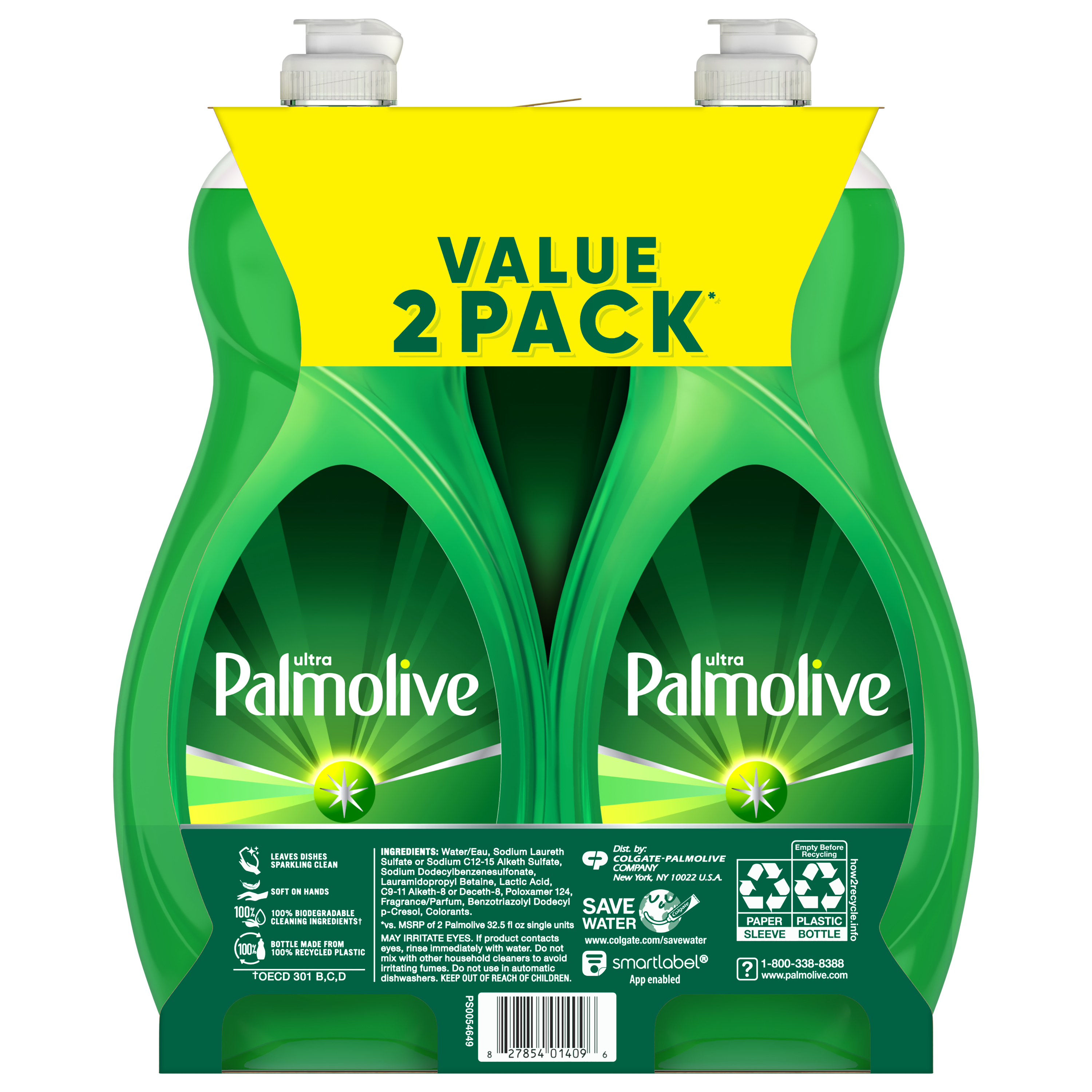 SKU 61040508 Consumer Unit - GTIN 00827854014096 Case - GTIN 10827854014093 Product Category Home Care Product Sub Category Dish Hand Product Equity (Brand) Palmolive Product Sub Brand Palmolive Ultra HD Product Title Palmolive Ultra Strength Liquid Dish Soap, 32.5 oz Bottle (2 Pack) Product Description Palmolive Ultra Strength Liquid Dish Soap is the original grease fighter you’ve known and trusted for over 50 years. This value two pack provides you with extra value for an even more satisfying and economical dishwashing experience. Our signature green dish soap instantly cuts through grease, and works to fight grease in your kitchen and beyond. It’s versatile and can tackle the toughest messes in your home, from pots and pans and BBQ grills to tires and laundry. This dishwashing liquid is so effective that stuck-on food doesn’t stand a chance. This biodegradable dish soap is designed to be tough on grease while still treating your hands gently. Palmolive Ultra dishwashing liquid is also gentle on the planet, with 100% biodegradable cleaning ingredients (1), 0% parabens and phosphates, and a bottle made with 100% recycled plastic. Experience the difference our dishwashing liquid can make: today, tomorrow, and for the next 50 years. (1) OECD 301 B, C, D eCommerce Copy- Long Description The OG: Original Green Palmolive.