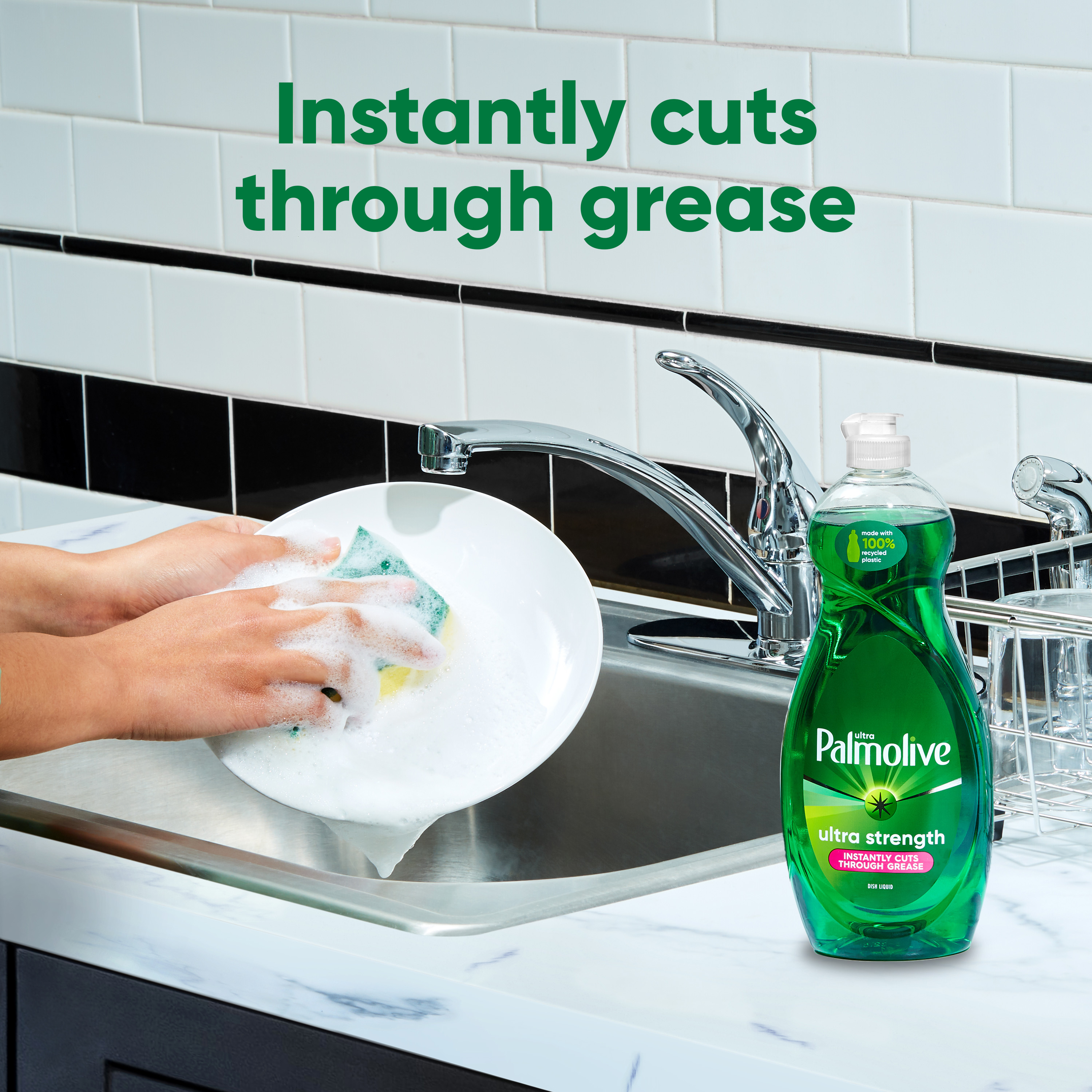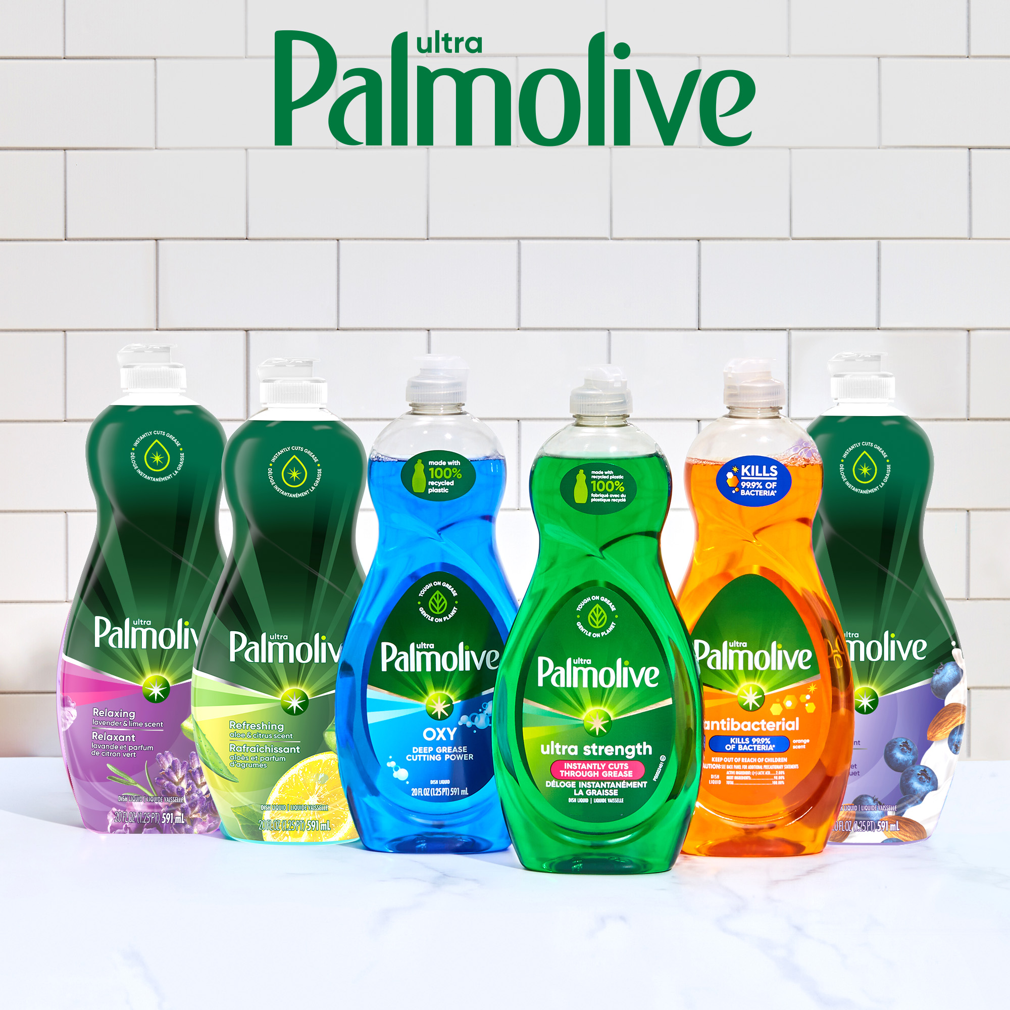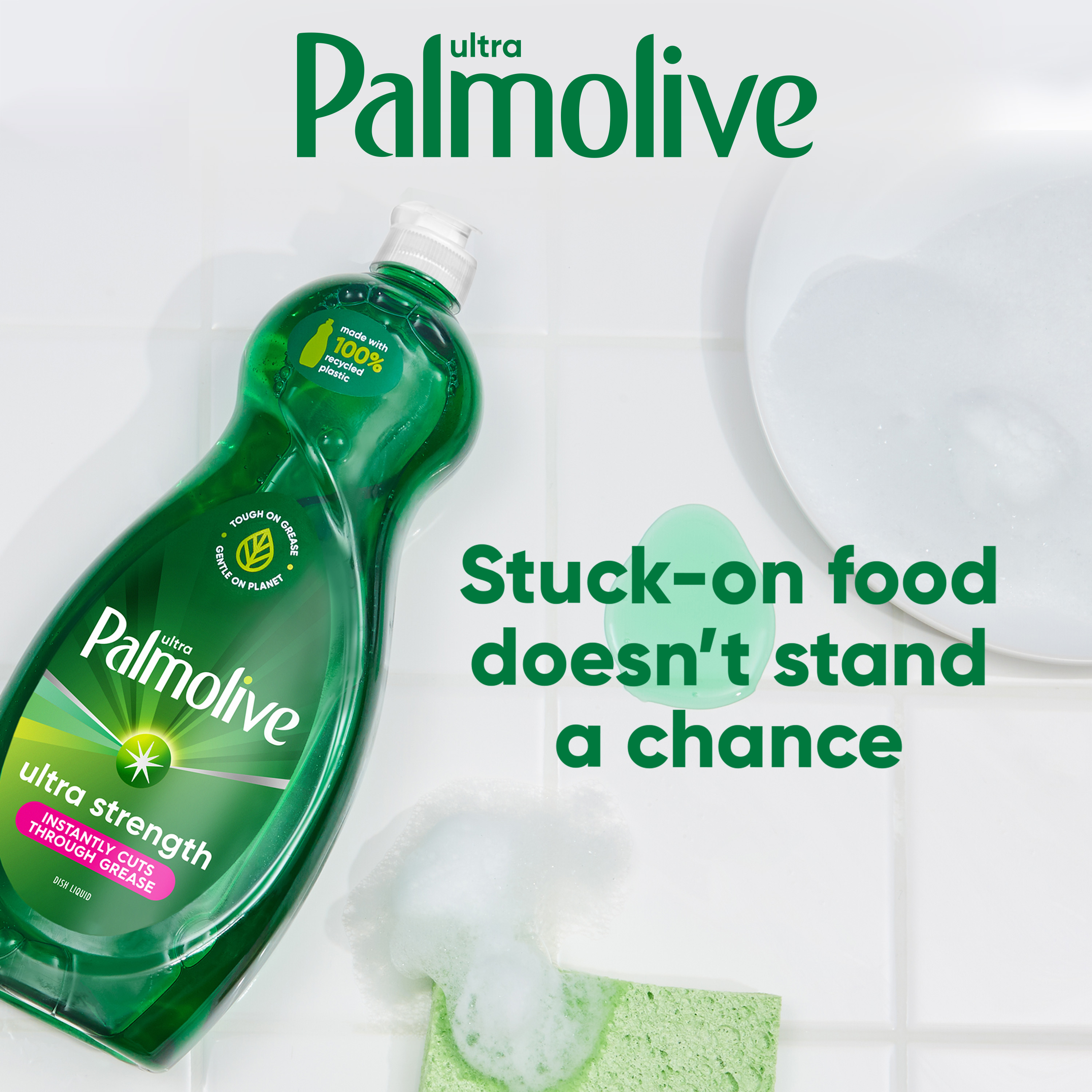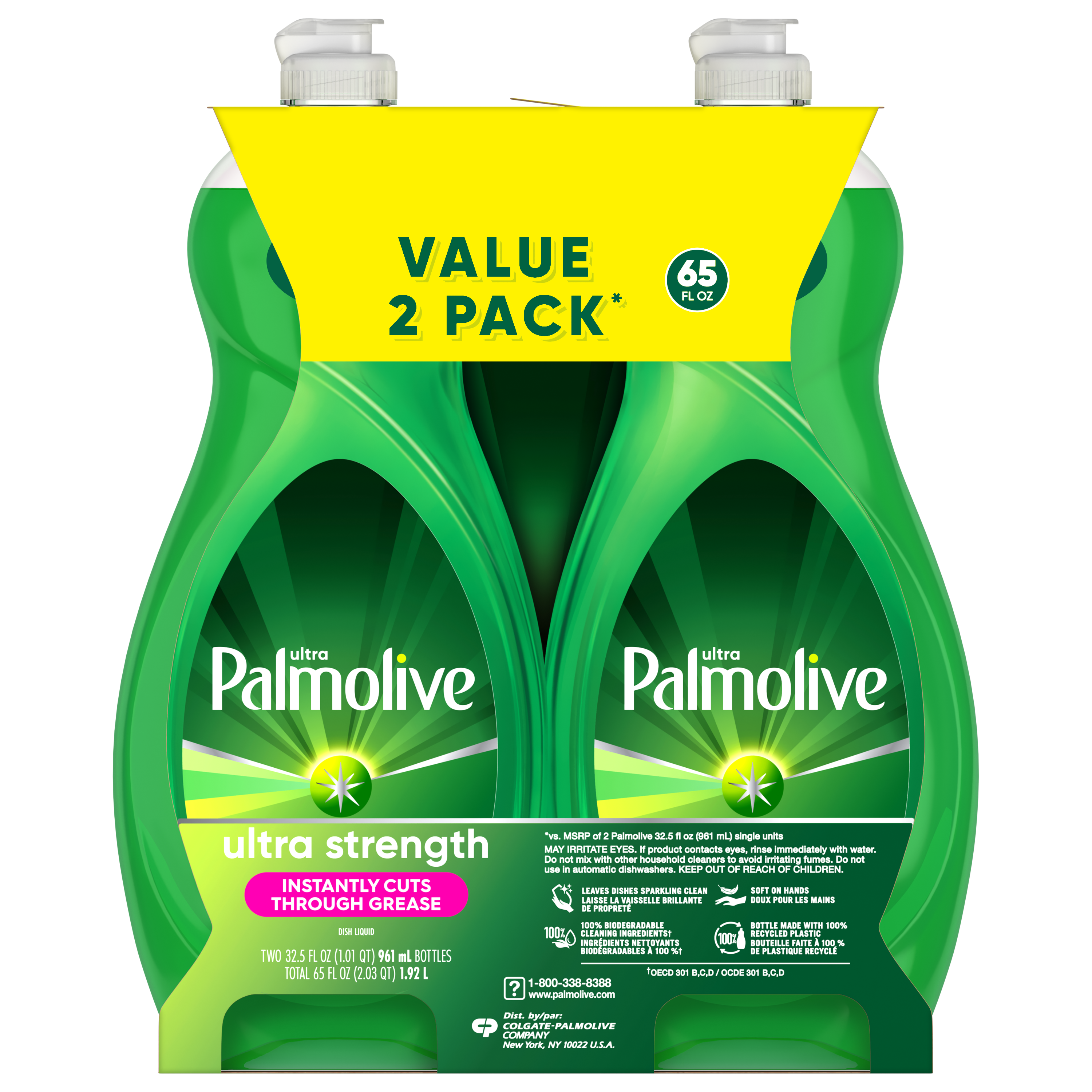 Bullet 1 Two 32.5 oz Bottles of Palmolive Ultra Strength Liquid Dish Soap Bullet 2 Our signature green dish soap instantly cuts through grease, and works to fight grease in your kitchen and beyond Bullet 3 Palmolive Ultra dishwashing liquid is also gentle on the planet, with 100% biodegradable cleaning ingredients (1), 0% parabens and phosphates, and a bottle made with 100% recycled plastic Bullet 4 This biodegradable dish soap is designed to be tough on grease while treating your hands with a gentle touch Bullet 5 It’s versatile and can tackle the toughest messes in your home, from pots and pans and BBQ grills to tires and laundry; making it a great addition to your dishwashing supplies