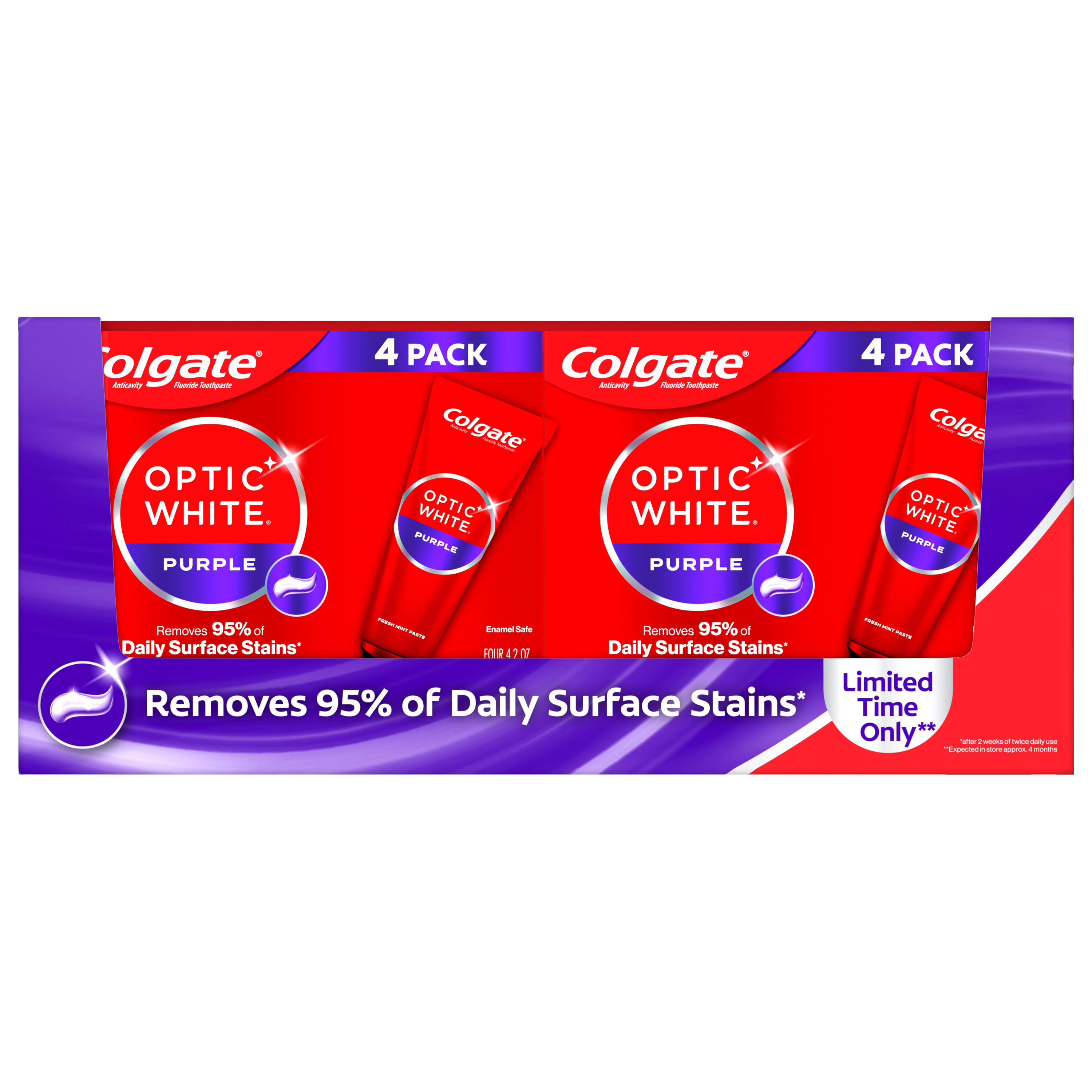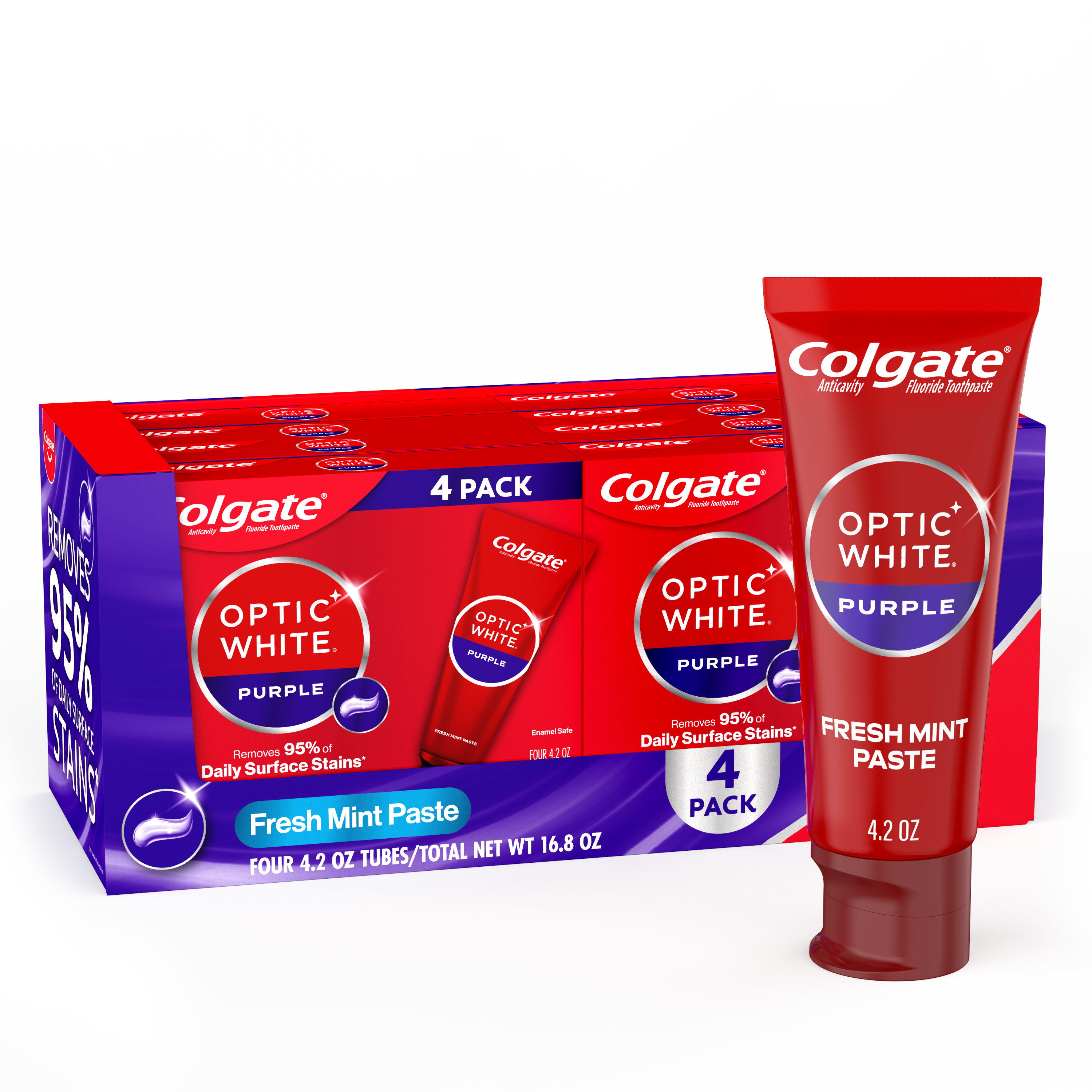 SKU 61040856 Consumer Unit - GTIN 00827854999997 Product Category Oral Care Product Sub Category Toothpaste Product Equity (Brand) Colgate Product Sub Brand Colgate Optic White TP Product Title Colgate Optic White Purple Toothpaste for Teeth Whitening, Bulk Toothpaste Pack Product Description Remove everyday surface stains for a brighter smile with the Colgate Optic White Purple Toothpaste for Teeth Whitening. This whitening stain removal toothpaste removes 95% of daily surface stains for a brighter smile.* Get ready to reveal a smile that’s ready to shine with the Colgate Optic White Purple Toothpaste Pack. The Colgate Optic White Purple Toothpaste uses a patented whitening formula to remove 95% of daily surface stains.* With micro-polishing action, this anticavity toothpaste removes 5X more surface stains.** Plus, this fluoride toothpaste comes in a Mint Paste flavor so you can enjoy minty freshness every time you brush. Colgate Optic White Purple Toothpaste is a sugar free and vegan toothpaste that is enamel-safe for daily use. Stock up on extra toothpaste with this bulk toothpaste pack from Colgate. For whitening that works, choose the Colgate Optic White Purple Toothpaste. *after 2 weeks of twice daily use **vs. ordinary, non whitening toothpaste after 2 weeks of continued use eCommerce Copy- Long Description Colgate Optic White Purple Toothpaste for Teeth Whitening is a purple fluoride toothpaste that removes 95% of daily surface stains for a brighter smile.* Get ready to reveal a smile that’s ready to shine using Colgate Optic White Purple Toothpaste. Patented Teeth Whitening Formula with Minty Freshness Colgate Optic White Purple Toothpaste uses a patented whitening formula to remove 95% of daily stains* in order to reveal a brighter smile. With special micro-polishing action at work, this anticavity toothpaste removes 5x more surface stains.** Plus, this unique purple fluoride toothpaste comes in our popular Mint Paste flavor, enabling you to enjoy minty freshness each and every time you brush your teeth. Enamel Safe Whitening That Works Colgate Optic White Purple Toothpaste is a sugar free, vegan and gluten free non-hydrogen peroxide toothpaste that is also enamel safe for daily use. The fluoride-based whitening formula in Colgate Optic White Purple is safe for everyday use so you can achieve a brighter smile every day. For whitening that works, choose Colgate Optic White Purple Toothpaste. *after 2 weeks of twice daily use **vs. ordinary, non-whitening toothpaste after 2 weeks of continued use Bullet 1 Includes four (4) 4.2 oz tubes of Colgate Optic White Purple Toothpaste for Teeth Whitening, Fluoride Toothpaste Pack Bullet 2 This purple bulk toothpaste pack removes 95% of daily surface stains for a brighter smile* (*after 2 weeks of twice daily use) Bullet 3 The refreshing Mint Paste flavor helps freshen your breath every time you brush with this mint toothpaste Bullet 4 Removes 5X more surface stains with micro-polishing action** (**vs. ordinary, non whitening toothpaste after 2 weeks of continued use) Bullet 5 This vegan toothpaste is gluten free, sugar free, and enamel-safe for daily use Bullet 6 Colgate Optic White Purple Toothpaste is an anticavity toothpaste made with a fluoride based formula Bullet 7 For whitening that works, choose the Colgate Optic White Purple Toothpaste Active Ingredients Sodium Fluoride 0.24 % (0.15% w/v fluoride ion)