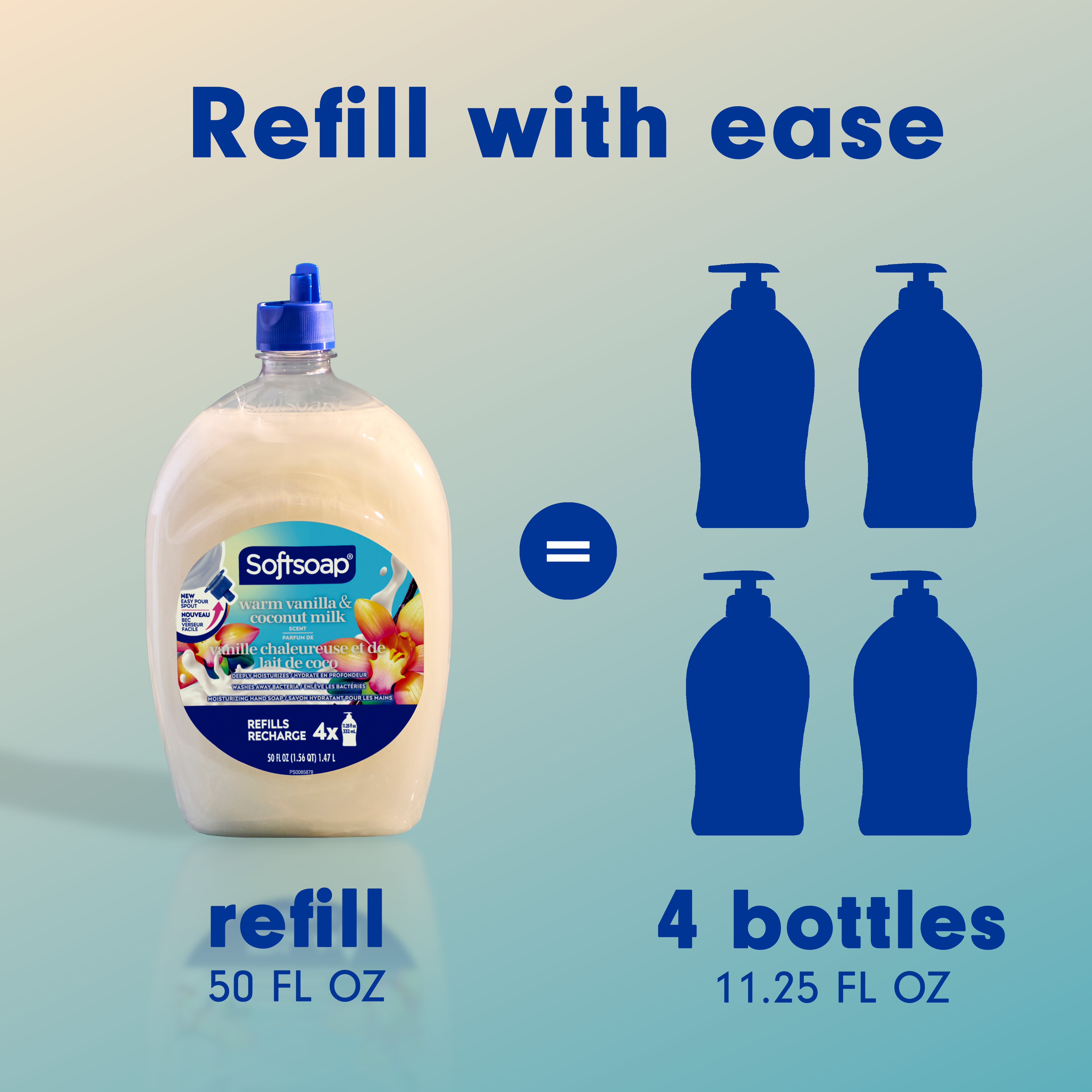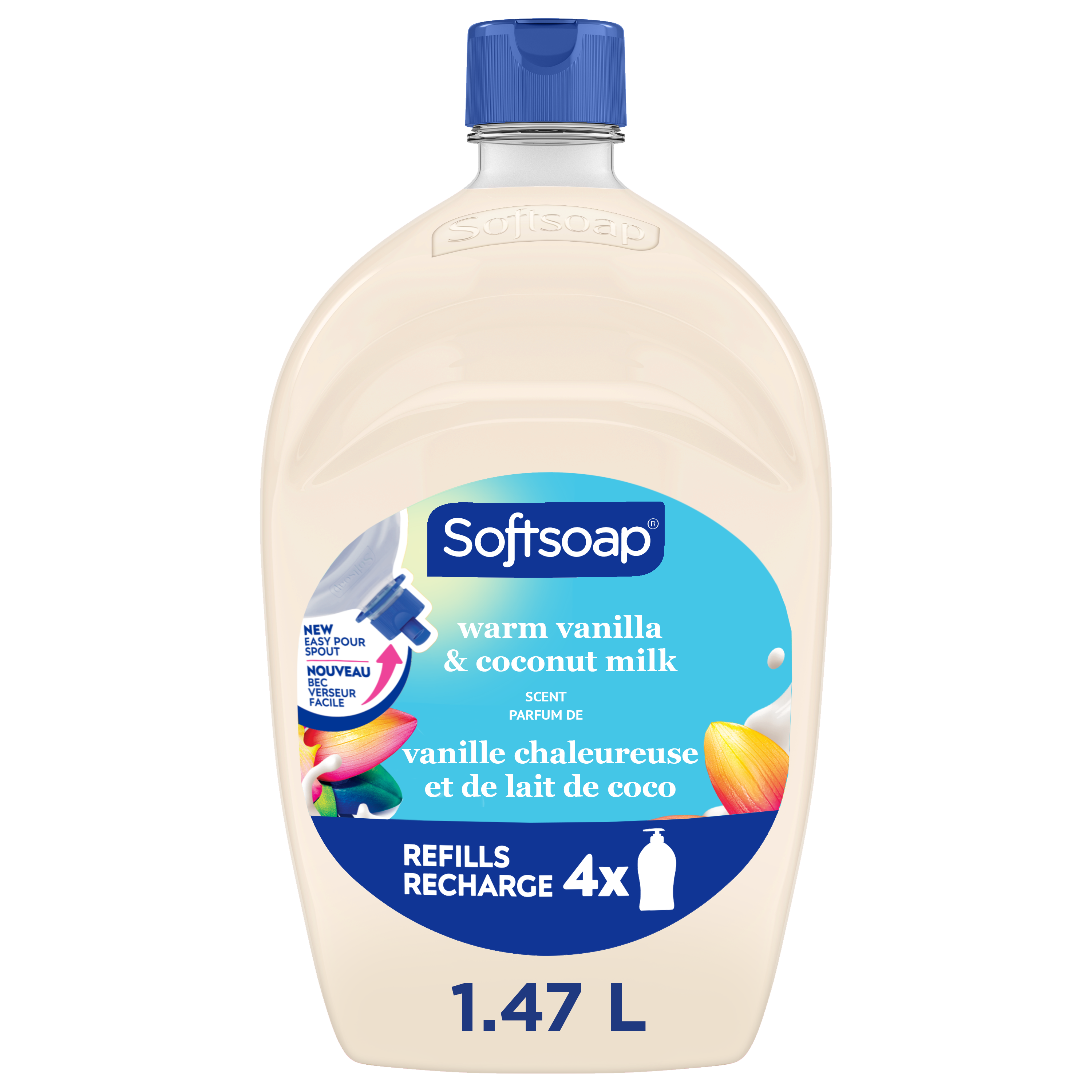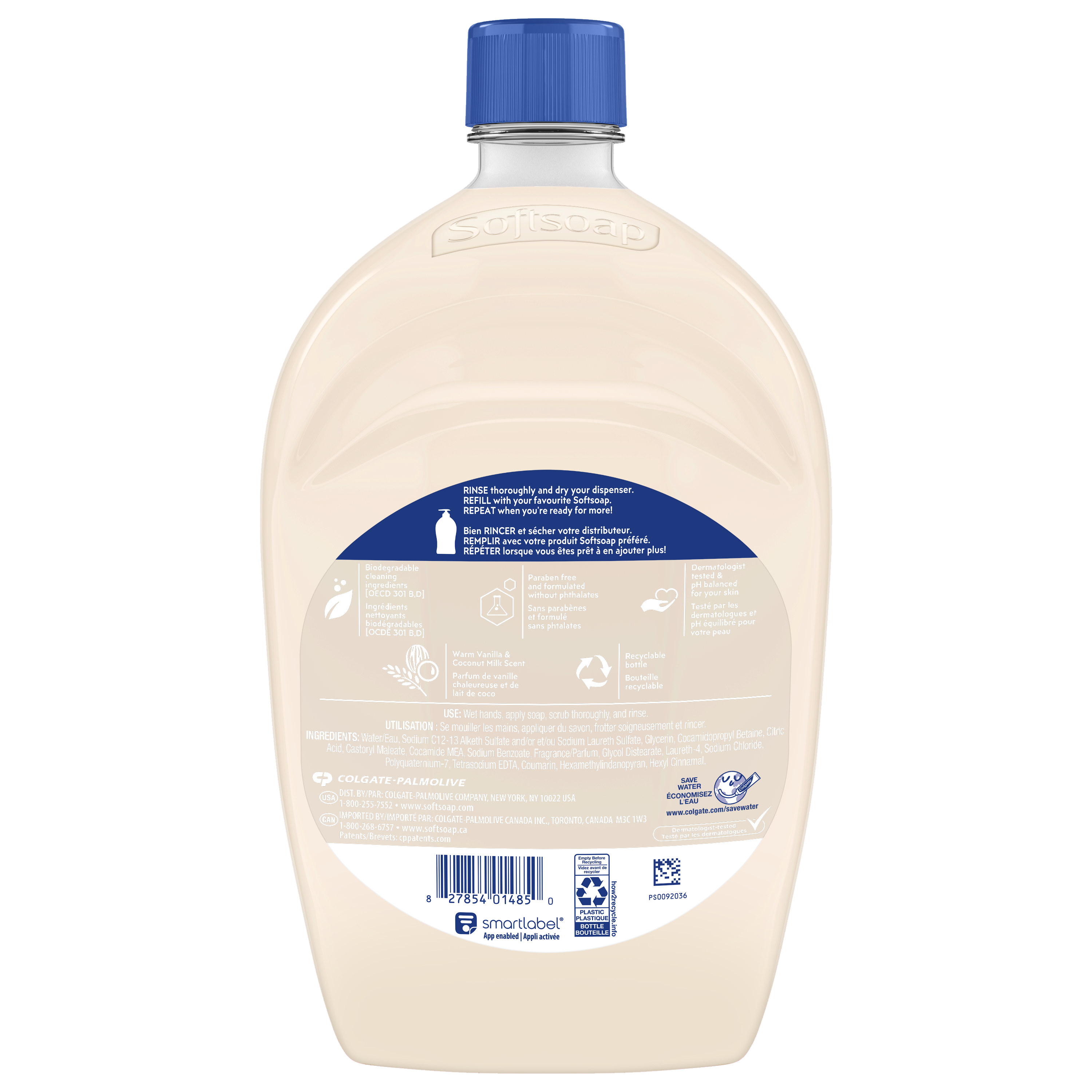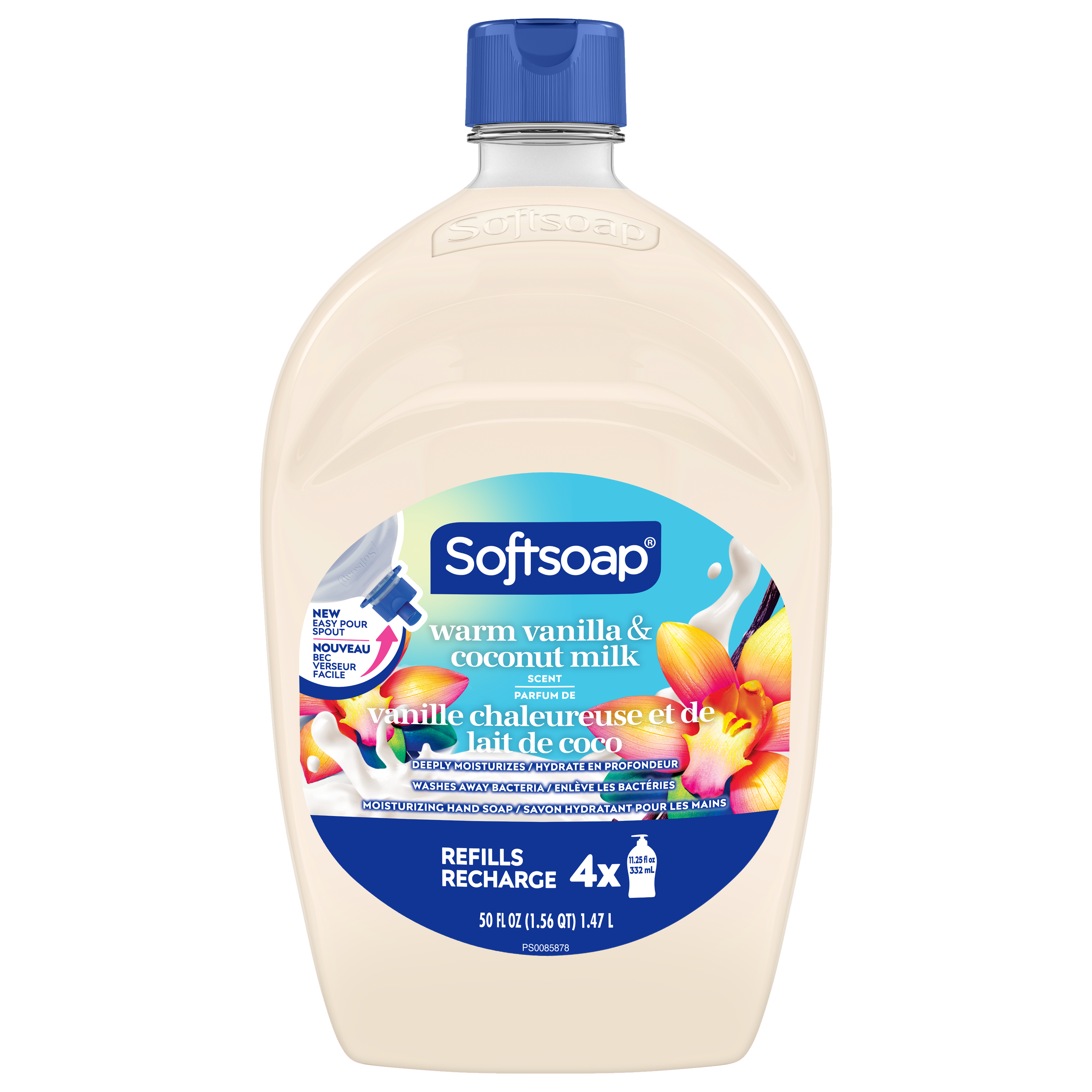 SKU 61041506 Consumer Unit - GTIN 00827854014850 Case - GTIN 10827854014857 Product Category Personal Care Product Sub Category Liquid Hand Wash Product Equity (Brand) Softsoap Product Sub Brand Softsoap LHW Product Title Softsoap Moisturizing Liquid Hand Soap, Kitchen and Bathroom Hand Soap, Warm Vanilla and Coconut Milk Scent, 50 fl oz Refill Product Description Keep your favorite Softsoap Moisturizing Liquid Hand Soap stocked and ready for use. From the #1 liquid hand soap brand (1) comes a deeply moisturizing hand soap with a Warm Vanilla and Coconut Milk scent. This scented hand soap deeply moisturizes to hydrate dry skin, all while effectively washing away bacteria for clean and fresh hands. The creamy formula hydrates dry skin, leaving your hands feeling soft and smooth. Our dermatologist-tested formula retains skin’s natural moisture and is formulated without parabens and phthalates. This liquid hand soap is one you’ll want to keep on your sink to infuse every small moment with joy. (1) Based in part on data reported by Nielsen through its Market Track Service for the Liquid Hand Soap Category for the 52 week period ending 02/14/25, for the All Outlet market. Copyright © 2025 Nielsen. Bullet 1 One 50 fl oz refill bottle of Softsoap Moisturizing Liquid Hand Soap, Warm Vanilla and Coconut Milk Scent Bullet 2 Softsoap is the #1 liquid hand soap brand (1) Bullet 3 The Warm Vanilla and Coconut Milk scent creates a refreshing and enjoyable handwashing experience Bullet 4 Our hand soap refill is mess free making it versatile to use in the bathroom or as a kitchen hand soap Bullet 5 Our dermatologist-tested formula retains skin’s natural moisture and is formulated without parabens and phthalates Bullet 6 The creamy formula hydrates dry skin, leaving your hands feeling soft and smooth