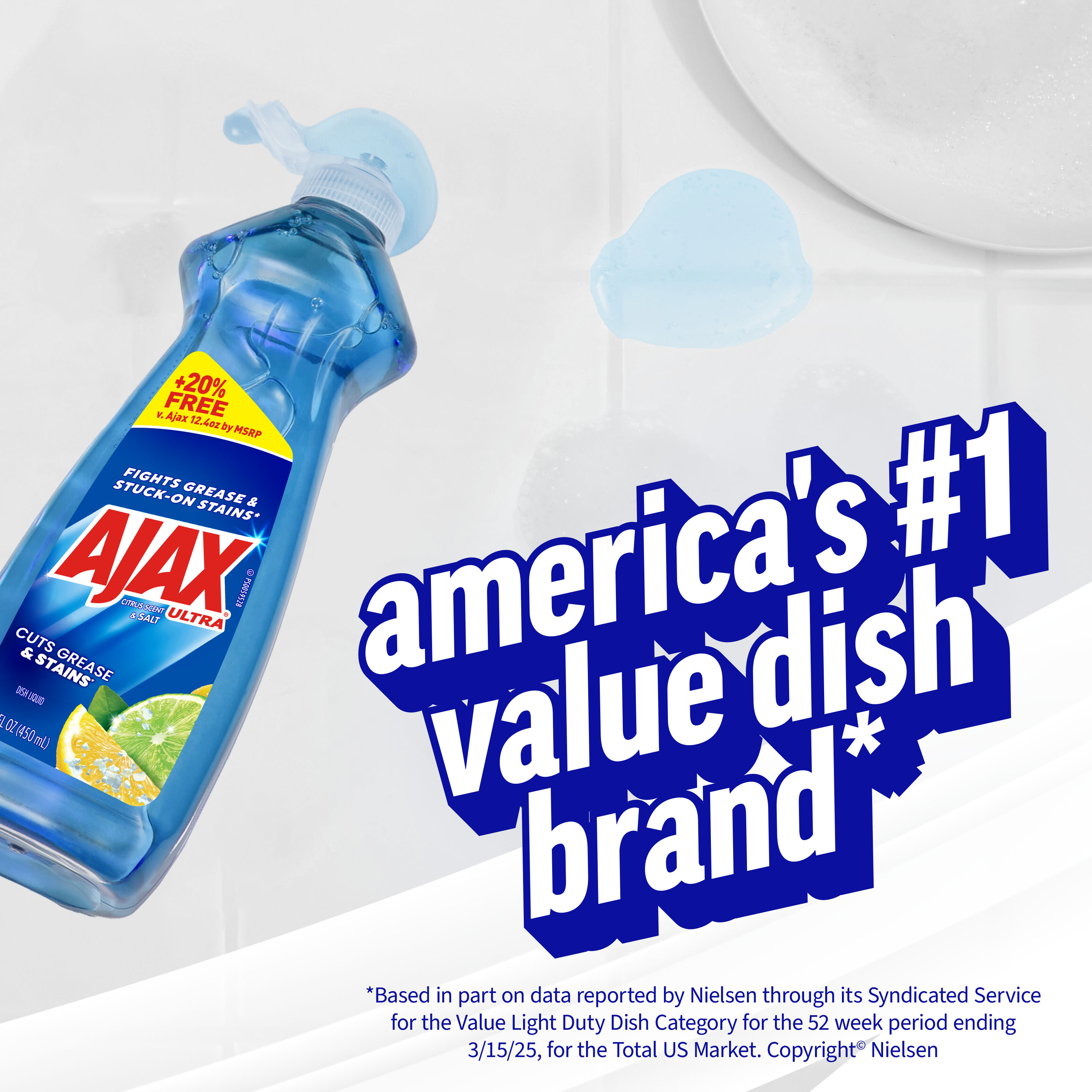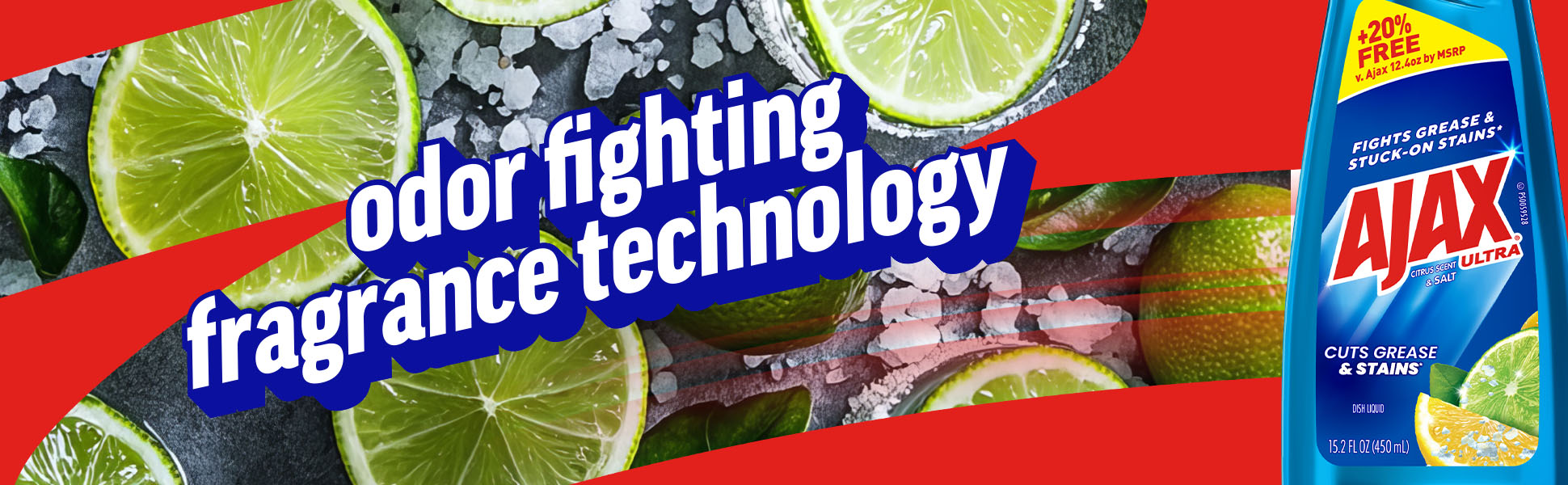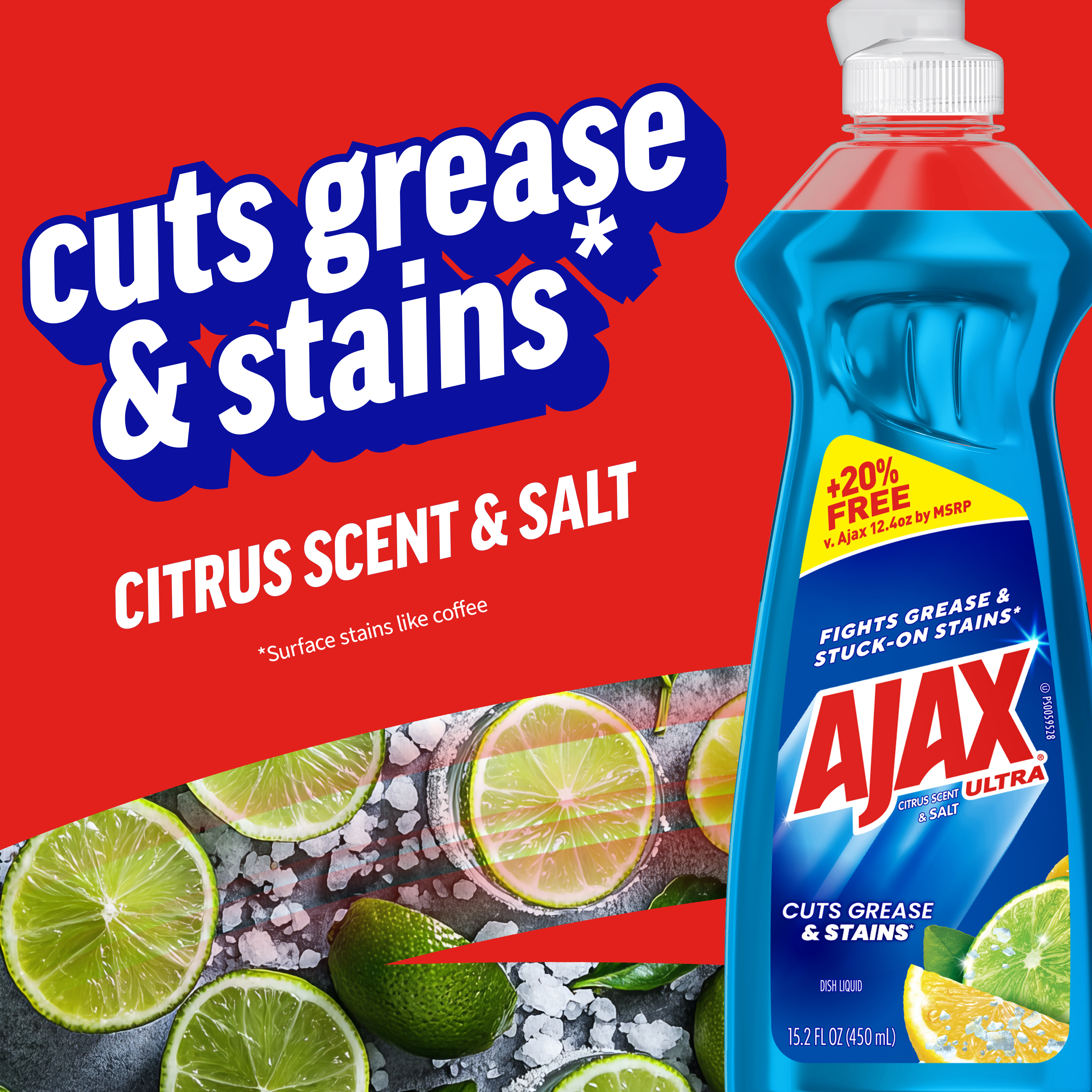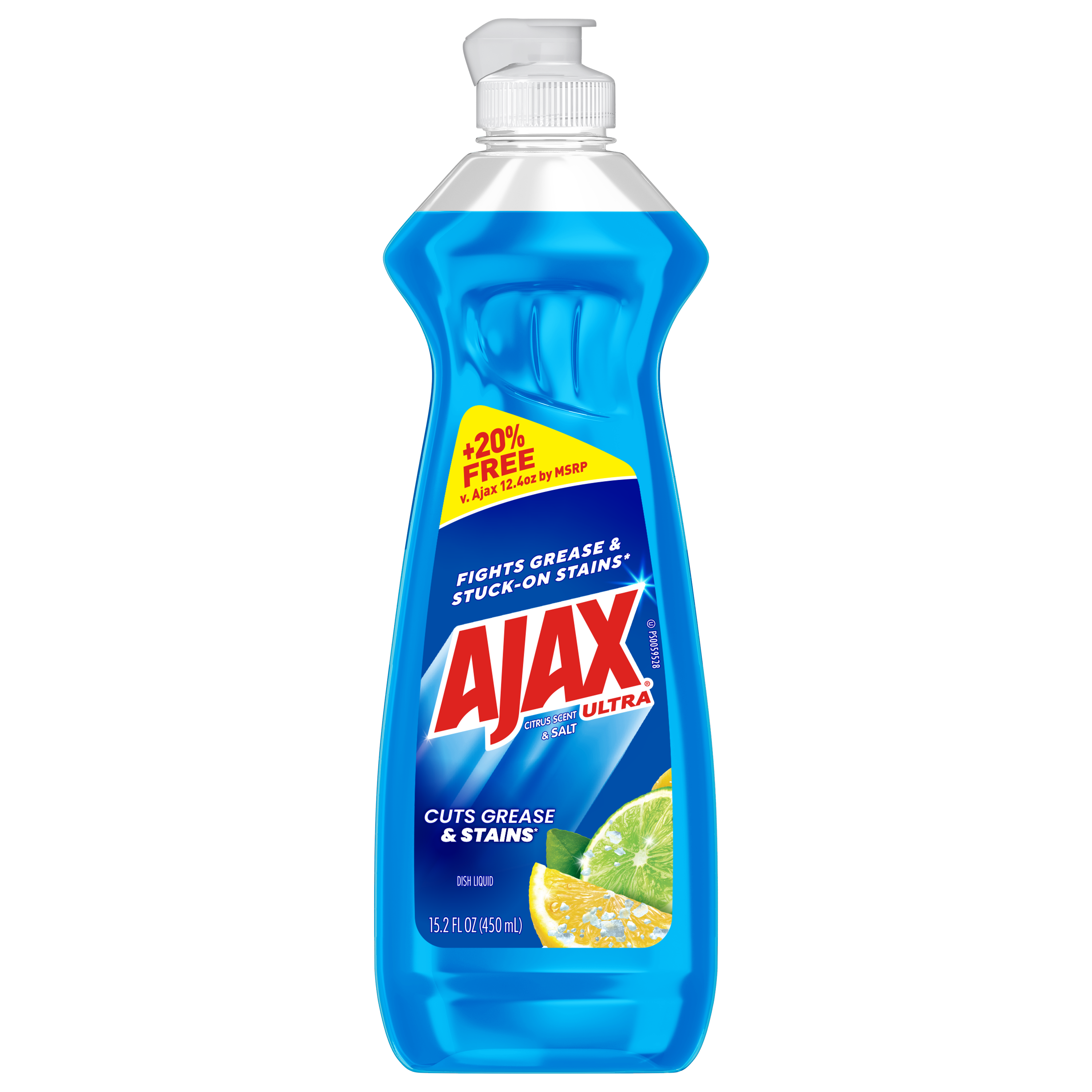 SKU 61041841 Consumer Unit - GTIN 00827854015406 Case - GTIN 10827854015403 Product Category Home Care Product Sub Category Dish Hand Product Equity (Brand) Ajax Product Sub Brand Ajax HD Product Title Ajax Ultra Liquid Dish Soap Citrus Scent and Salt, Cuts Grease and Stains, 15.2 oz Bottle Product Description Boost your dishwashing experience with Ajax Ultra Liquid Dish Soap. We have combined your favorite citrus scent with the efficacy of Ajax that cuts grease and stains. This blue dish soap easily dissolves stuck on grease with a delightful burst of citrus freshness. Enhance your cleaning arsenal by harnessing the natural power of salt, a versatile cleaner that effortlessly tackles tough stains and grime, leaving surfaces sparkling clean. This dishwashing liquid is made with naturally inspired fragrances, zero parabens and no phosphates. Get more cleaning power for your buck with Ajax Ultra Liquid Dish Soap, offering +20% free compared to Ajax 12.4 oz by MSRP, ensuring you get extra value with every bottle. The power of Ajax Ultra goes beyond the sink. This versatile kitchen dish soap allows you to pre-treat laundry, wash tires, and wipe down appliances. Life is tough, but you're tougher! We understand that life isn’t easy. You work hard—heck, REALLY hard. You tackle big and small tough jobs, without looking for applause. That’s why we at Ajax recognize you, the everyday heroes, who step up at the end of a long day and get the dishes done. Because, let’s face it, at the end of the day a clean home is a happy home. Leave the grime to us so you can get back to what really matters! Bullet 1 One 15.2 oz Bottle of Ajax Ultra Dish Soap Citrus Scent and Salt, Cuts Grease and Stains Bullet 2 This liquid dish soap brings a freshness to your kitchen with a burst of citrus Bullet 3 This blue dish soap provides a pleasant and powerful cleaning experience Bullet 4 Enhance your cleaning arsenal by harnessing the natural power of salt, a versatile cleaner that effortlessly tackles tough stains and grime Bullet 5 This dishwashing liquid is made with naturally inspired fragrances, zero parabens and no phosphates Bullet 6 The power of Ajax kitchen dish soap goes beyond the sink. This versatile dish soap liquid allows you to pre-treat laundry, wash tires, and wipe down appliances Bullet 7 Life is tough, but Ajax applauds your resilience with a delightful twist that adds a burst of citrus freshness to your cleaning routine Dollar Tree RPC 388869