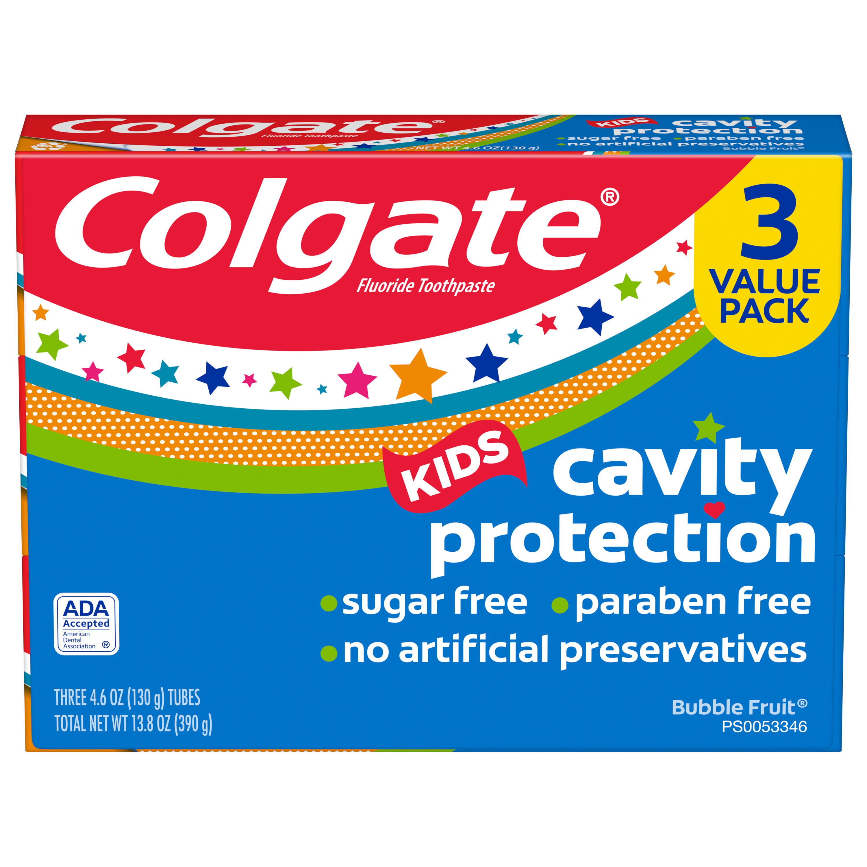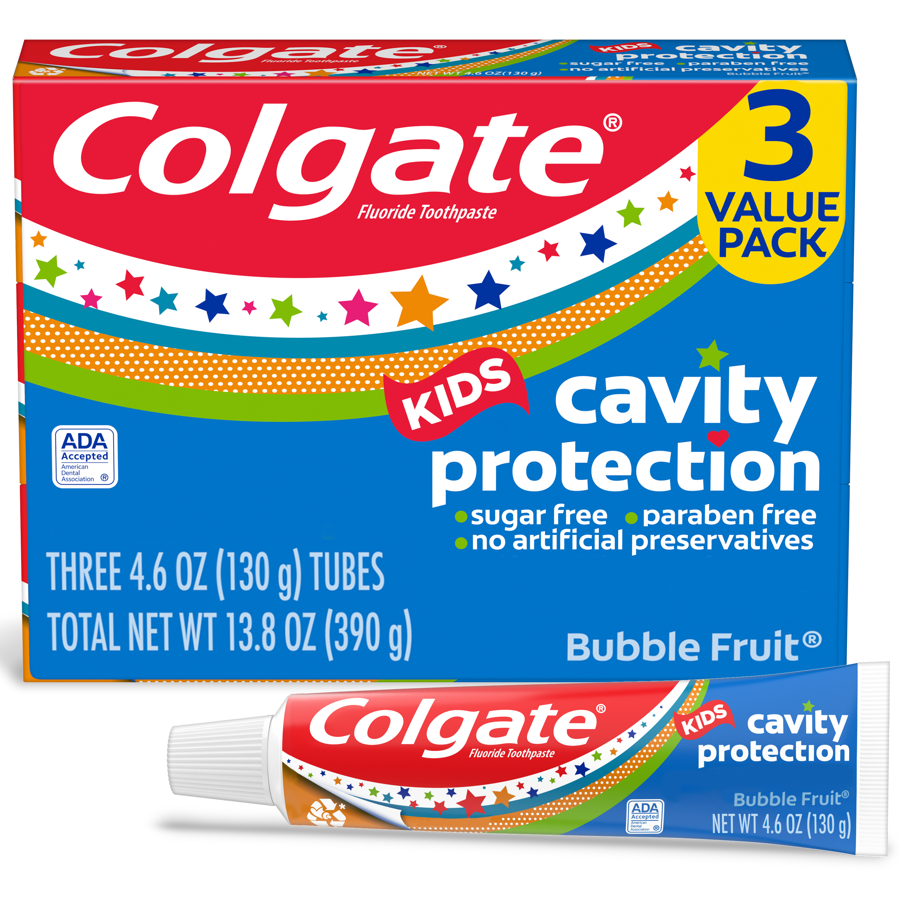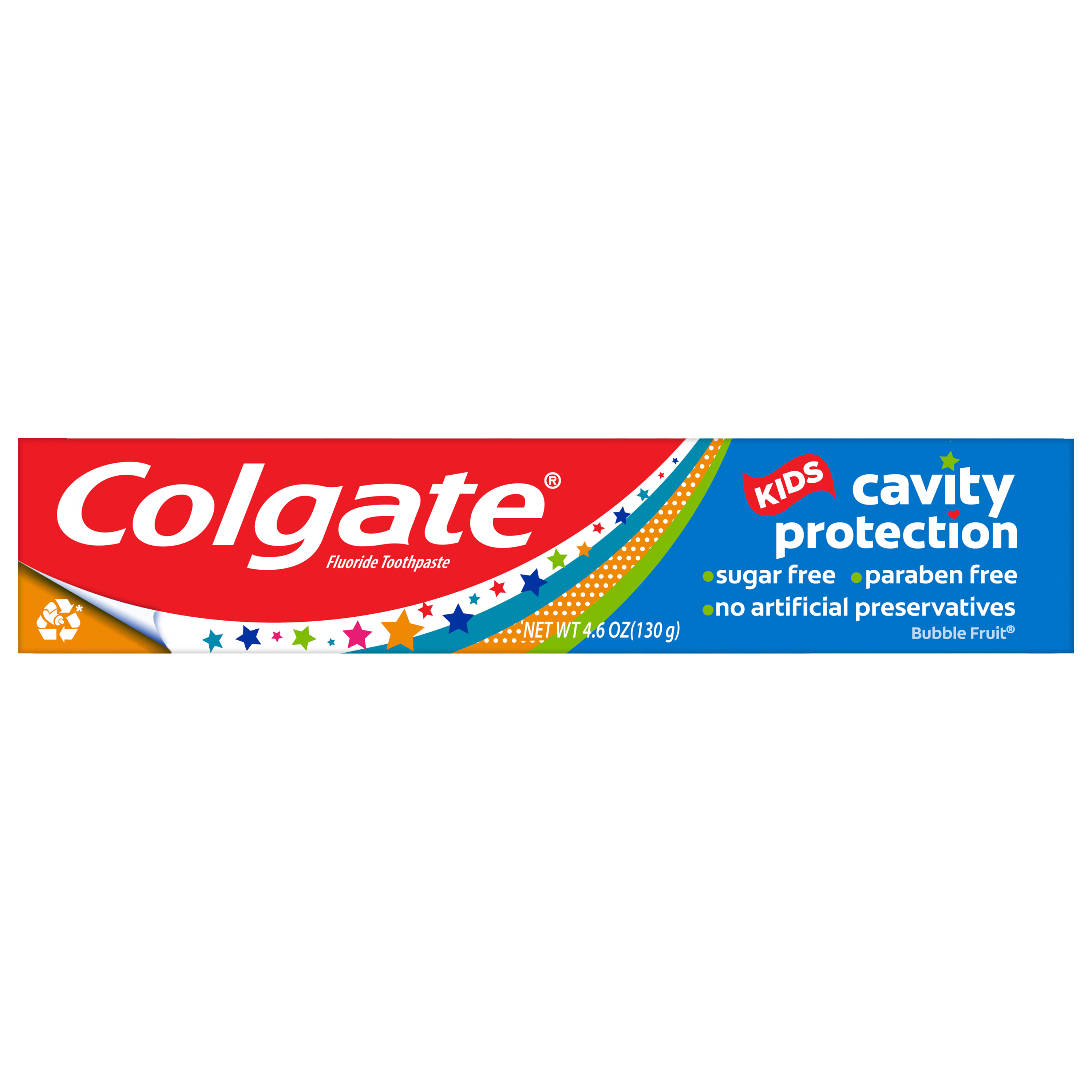 SKU 61041940 Consumer Unit - GTIN 00827854015369 Case - GTIN 10827854015366 Product Category Oral Care Product Sub Category Toothpaste Product Equity (Brand) Colgate Product Sub Brand Colgate Kids TP Product Title Colgate Kids Cavity Protection Toothpaste, Bubble Fruit, 4.6oz 3pk Active Ingredients Sodium Fluoride 0.24 % (0.15% w/v fluoride ion) Walmart RPC 5164703761 Walmart URL (Computed) https://www.walmart.com/ip/a/5164703761