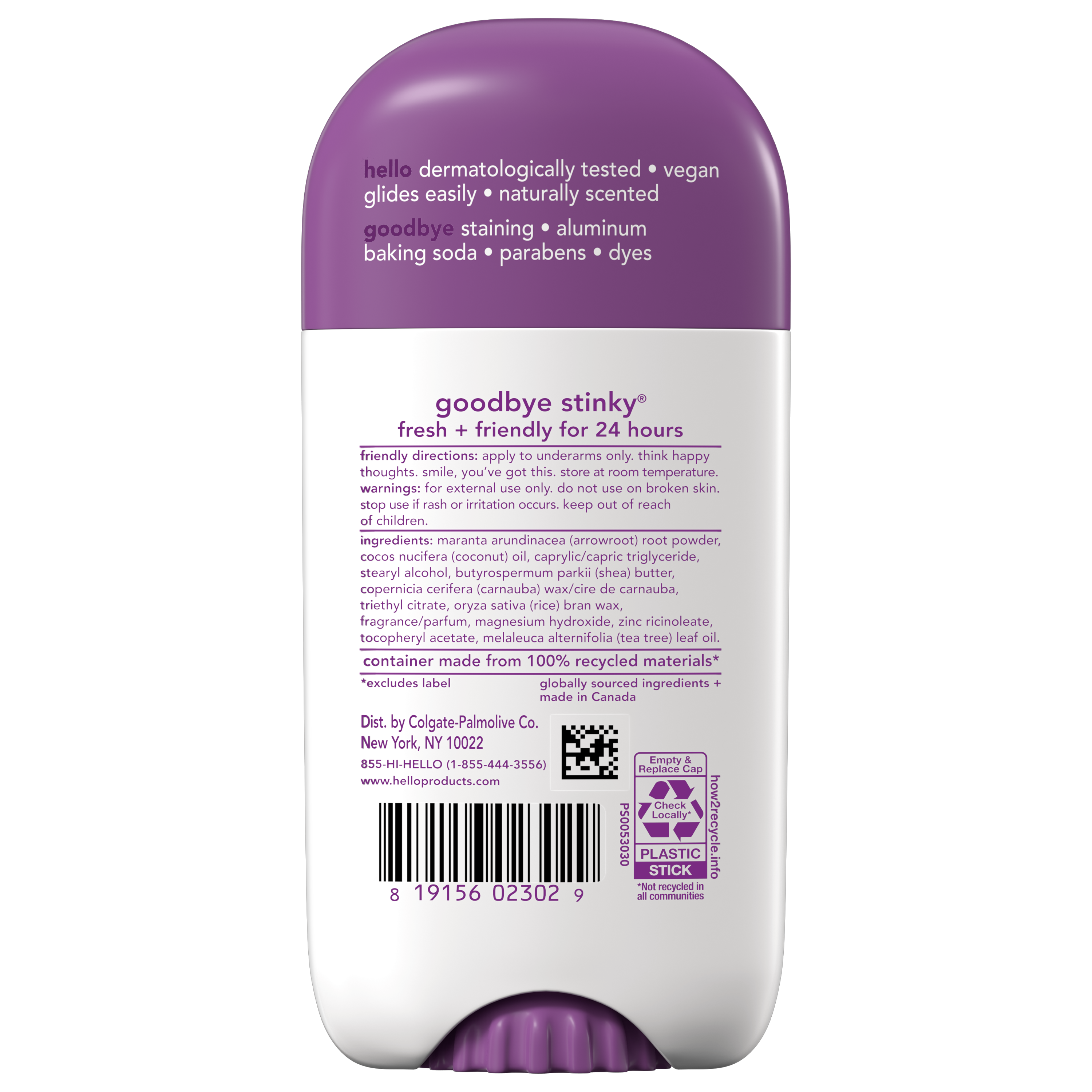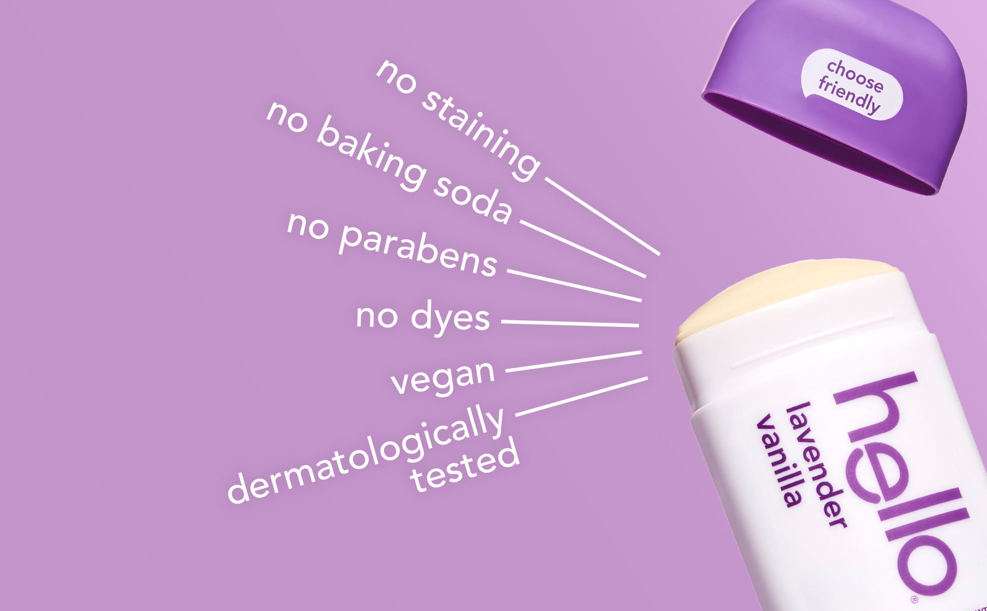 SKU 61043818 Consumer Unit - GTIN 00827854016335 Case - GTIN 10827854016332 Product Category Personal Care Product Sub Category AP > Deo Product Equity (Brand) Hello Product Sub Brand Hello AP/Deo Product Title hello Lavender Vanilla Aluminum Free Deodorant for Women and Men with Shea Butter, 24-Hour Freshness, Baking Soda Free Deodorant, Dermatologically Tested, 2.6 oz Stick (2 Pack) Product Description Say hello to hello Lavender Vanilla Aluminum Free Deodorant. The fresh scent of lavender with the soft, warm notes of vanilla are like a cozy blanket for the senses. Our 24-hour deodorant with shea butter is dermatologically tested and naturally scented to keep you feeling fresh all day. Say goodbye to aluminum, baking soda, parabens, and dyes. Plus, it glides on easily for a smooth application and won’t stain your clothes. Choose friendly with a deodorant that's not tested on animals and vegan for happy underarms. Anything less would be the pits Bullet 1 WHAT I’M GETTING: Includes two 2.6 oz deodorant sticks of hello Lavender Vanilla Aluminum Free Deodorant for Men and Women Bullet 2 ALUMINUM FREE PROTECTION: Free of aluminum, dyes, baking soda, and parabens Bullet 3 NATURALLY SCENTED: Take your nose on a staycation with the relaxing scent of lavender and the cozy snuggle of warm vanilla Bullet 4 24-HOUR DEODORANT WITH SHEA BUTTER: Keeps you fresh + friendly for 24 hours, so you can take on the day with confidence Bullet 5 KNOW YOUR DEODORANT: Vegan and dermatologically tested Amazon RPC B0CRHZQ9HZ AMZ URL https://www.amazon.com/dp/B0CRHZQ9HZ
