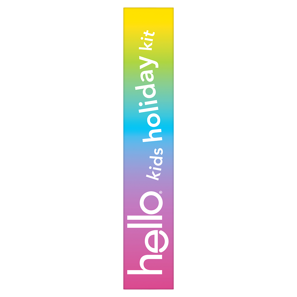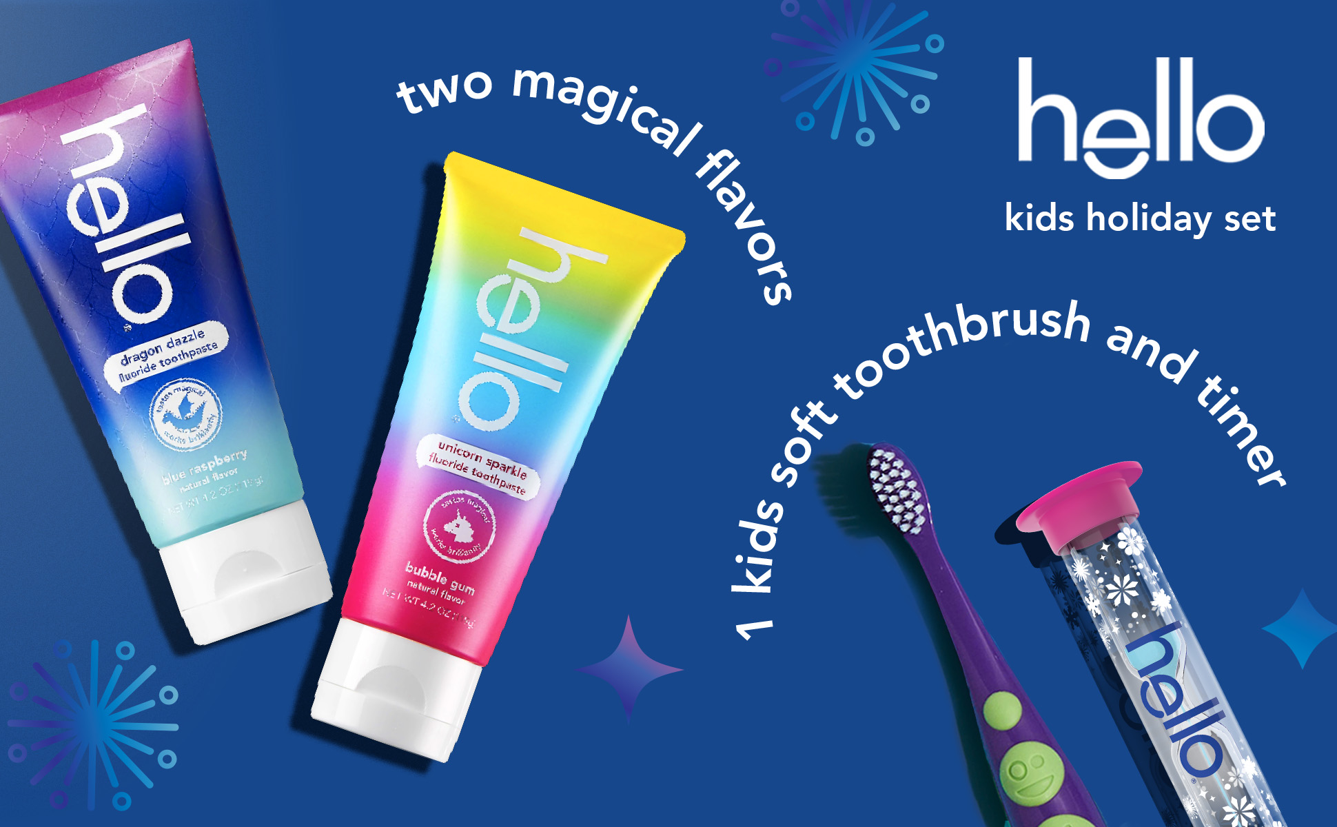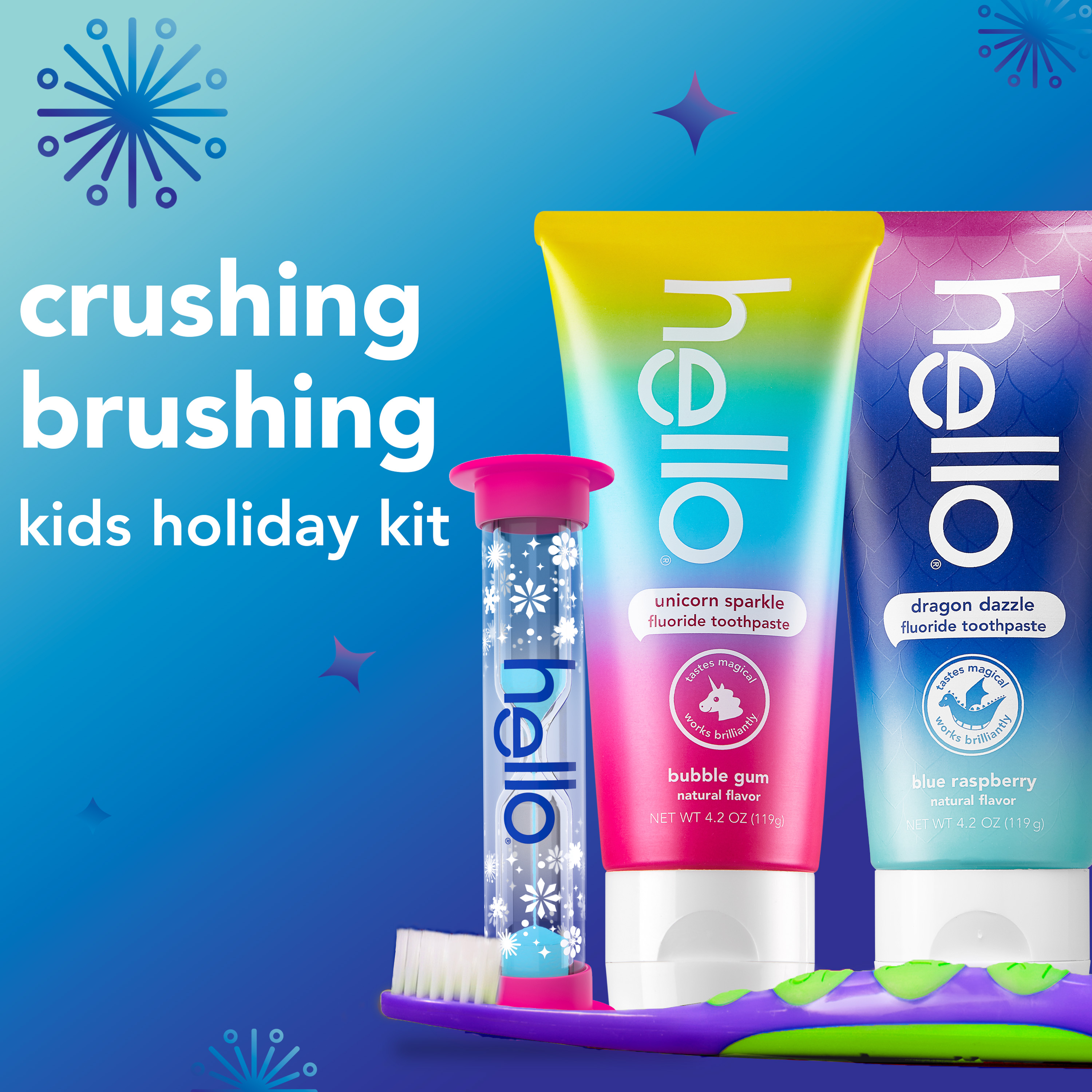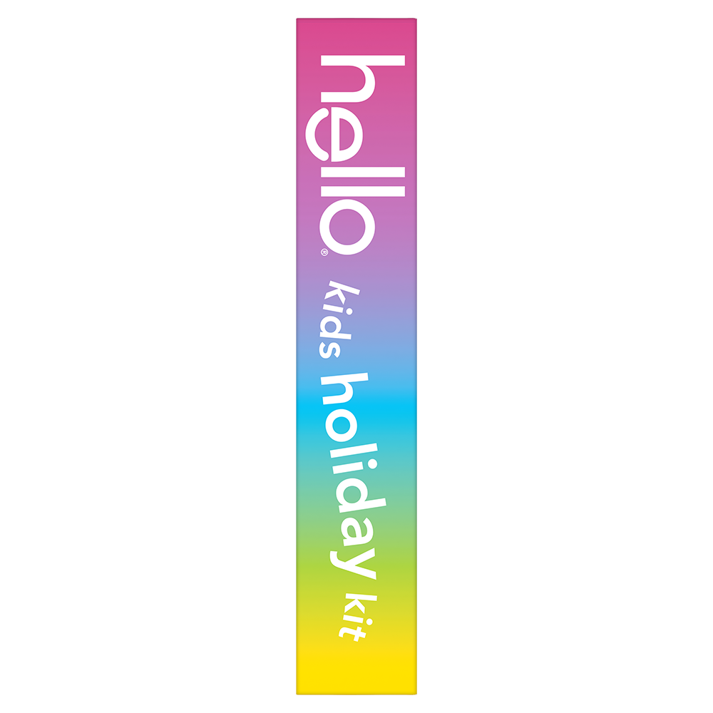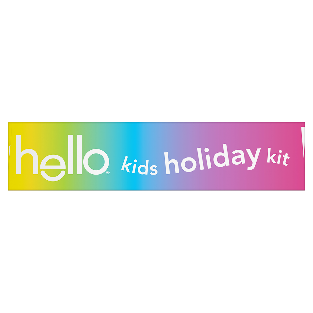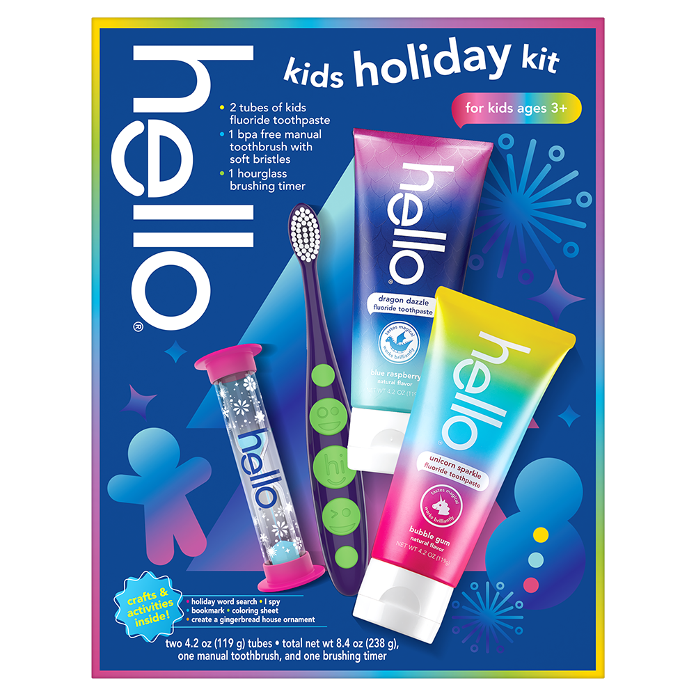 SKU 61043929 Consumer Unit - GTIN 00827854016472 Case - GTIN 10827854016479 Product Category Oral Care Product Sub Category Toothpaste Product Equity (Brand) Hello Product Sub Brand Hello Kids TP Product Title hello Kids Toothbrush and Kids Toothpaste Holiday Gift Set Product Description Say hello to brush time magic this holiday season with the hello Kids Toothbrush and Kids Toothpaste Holiday Gift Set. The all-in-one toothbrush and toothpaste kids gift set for ages 3+ features a BPA-free soft bristled kids toothbrush, 2 kids toothpastes with fluoride (bubble gum and blue raspberry flavors), and an hourglass toothbrush timer. And as an extra bonus, each kids gift set also includes fun holiday crafts and activities on the inside of the box like a coloring sheet, a word search, a build-your-own gingerbread house ornament, and more. This all-in-one toothbrush kit will get your kiddos excited to brush their teeth and help them start good habits early. The soft bristled kid toothbrush features a wide, grippy handle that’s perfect for little hands to hold. Plus, the delightfully flavored bubble gum unicorn toothpaste and dragon dazzle blue raspberry toothpaste flavors taste magical and are formulated with fluoride to help prevent cavities and strengthen enamel. Each holiday gift set also includes a fun, flippable kids toothbrush timer to help ensure your child brushes long enough to make their pearlies nice and white. The kids fluoride toothpaste inside this holiday gift set contains no artificial sweeteners, no artificial flavors, no preservatives, no spicy mint, no dyes, no SLS, no parabens, no gluten, and each kids toothpaste flavor is vegan. hello toothpaste is not tested on animals either. Choose everyday yay this holiday season with the hello Kids Toothbrush and Kids Toothpaste Holiday Gift Set. eCommerce Copy- Long Description hello Kids Toothbrush and Kids Toothpaste Holiday Gift Set Say hello to brush time magic this holiday season with the hello Kids Toothbrush and Kids Toothpaste Holiday Gift Set. The all-in-one toothbrush and toothpaste kids gift set for ages 3+ features a BPA-free soft bristled kids toothbrush, 2 kids toothpastes with fluoride (bubblegum and blue raspberry flavors), and an hourglass toothbrush timer. And as an extra bonus, each kids gift set also includes fun holiday crafts and activities on the inside of the box like a coloring sheet, a word search, a build-your-own gingerbread house ornament, and more. Tastes Like Magic This all-in-one toothbrush kit will get your kiddos excited to brush their teeth and help them start good habits early. The soft bristled kid toothbrush features a wide, grippy handle that’s perfect for little hands to hold. Plus, the delightfully flavored bubblegum unicorn toothpaste and dragon dazzle blue raspberry toothpaste flavors taste magical and are formulated with fluoride to help prevent cavities and strengthen enamel. Each holiday gift set also includes a fun, flippable kids toothbrush timer to help ensure your child brushes long enough to make their pearlies nice and white. Only The Good Stuff Allowed The kids fluoride toothpaste inside this holiday gift set contains no artificial sweeteners, no artificial flavors, no preservatives, no spicy mint, no dyes, no SLS, no parabens, no gluten, and each kids toothpaste flavor is vegan. hello toothpaste is not tested on animals (Leaping Bunny Certified) either. Choose everyday yay this holiday season with the hello Kids Toothbrush and Kids Toothpaste Holiday Gift Set. Bullet 1 What I'm Getting: (1) manual kids toothbrush, two (2) 4.2 oz kids fluoride toothpaste tubes, and one (1) flippable toothbrush timer Bullet 2 Merry Brushing: The BPA-free soft kid toothbrush is safe for ages 3+ and features a wide, grippy handle that’s perfect for little hands Bullet 3 Tastes Magical: Bubble gum and blue raspberry toothpaste flavors are formulated with fluoride to help prevent cavities and strengthen teeth enamel Bullet 4 Exciting Activities: This holiday kit includes additional crafts inside like a build-your-own gingerbread house ornament, a coloring sheet, and more Bullet 5 Everyday Yay: Add some holiday magic to your child’s daily teeth brushing habit with the hello Kids Toothbrush and Kids Toothpaste Holiday Gift Set Active Ingredients Sodium Fluoride 0.24% (0.15% w/v fluoride ion) Amazon RPC B0DJ1QGR78 AMZ URL https://www.amazon.com/dp/B0DJ1QGR78 Walmart RPC 670258528 Walmart URL (Computed) https://www.walmart.com/ip/a/670258528 Target RPC 91915785 Target URL https://www.target.com/p/a/-/A-91915785