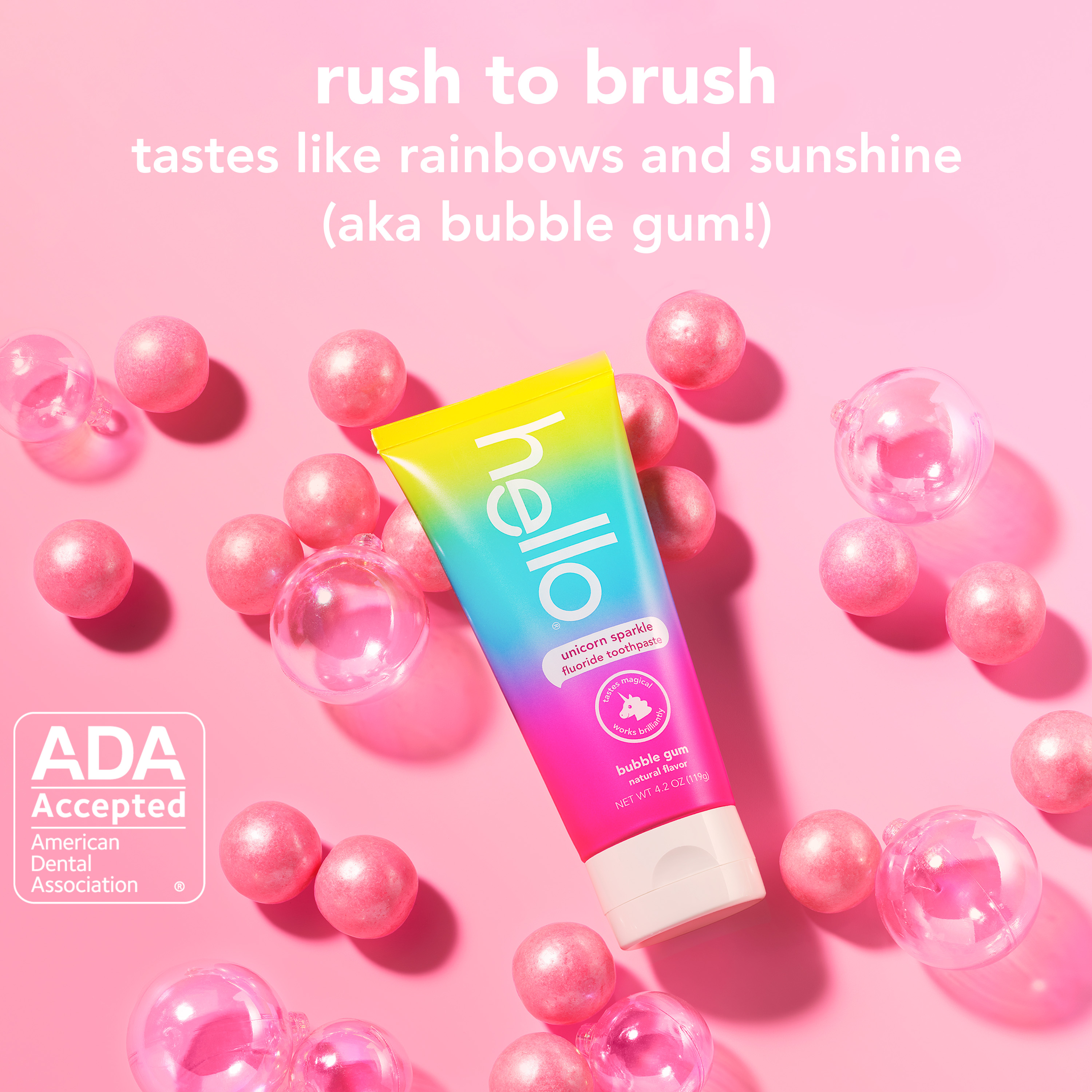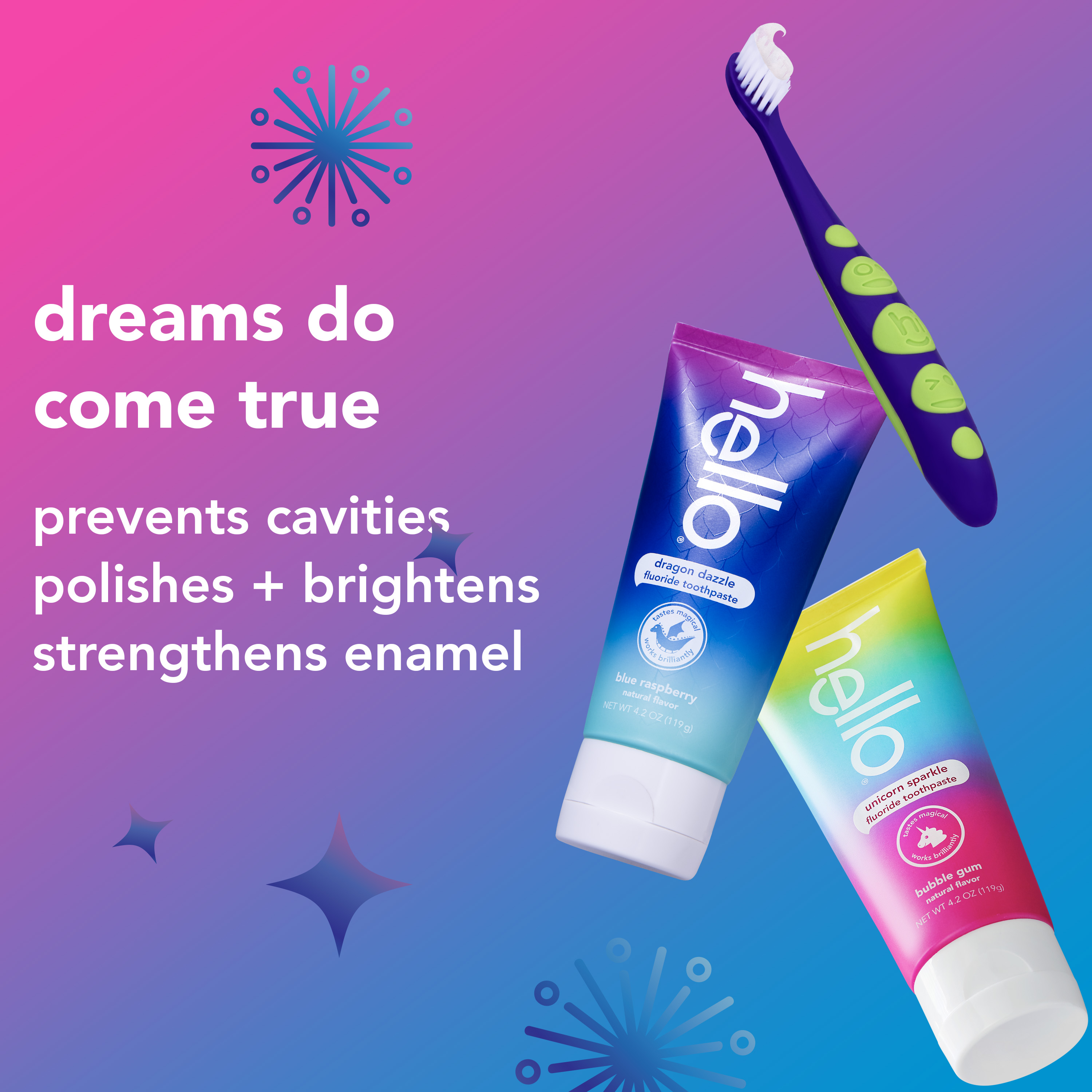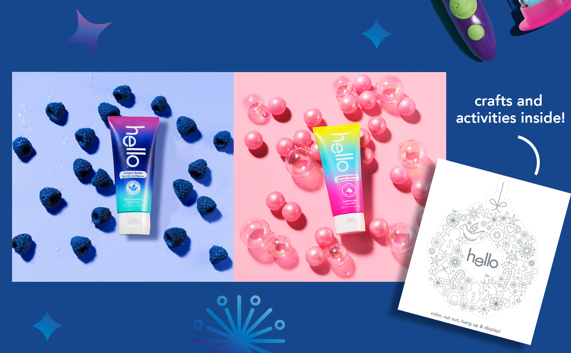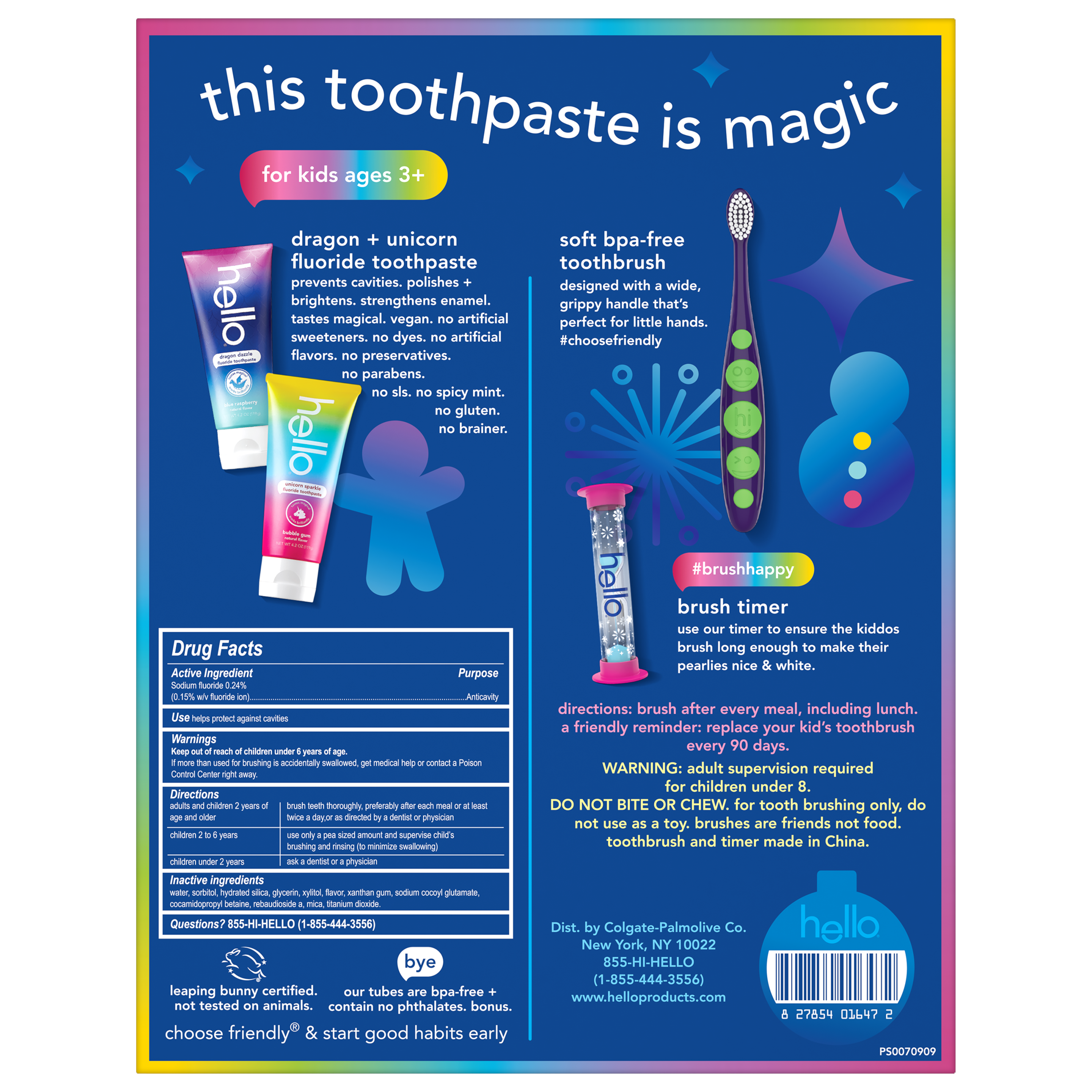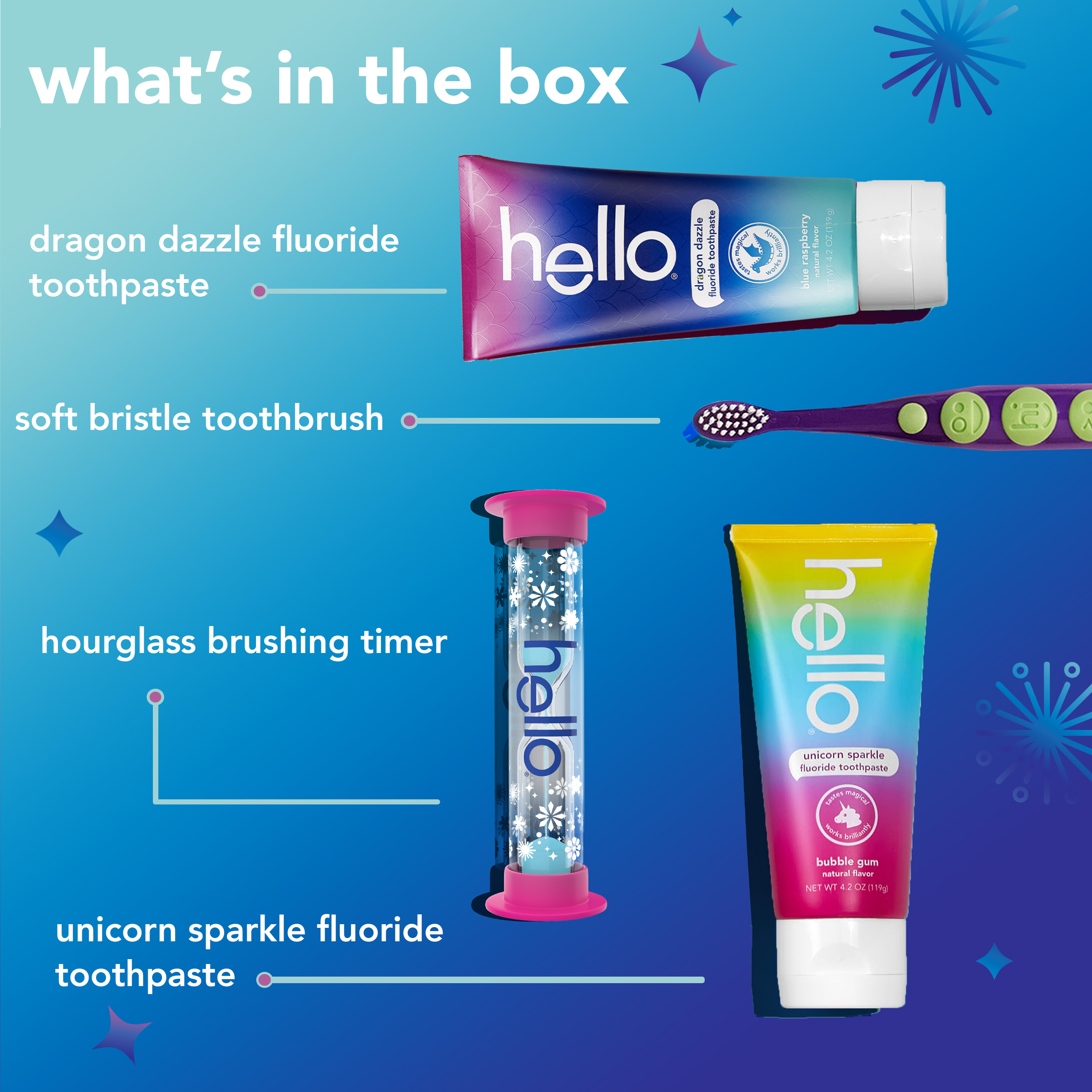 SKU 61043929 Consumer Unit - GTIN 00827854016472 Case - GTIN 10827854016479 Product Category Oral Care Product Sub Category Toothpaste Product Equity (Brand) Hello Product Sub Brand Hello Kids TP Product Title hello Kids Toothbrush and Kids Toothpaste Holiday Gift Set Product Description Say hello to brush time magic this holiday season with the hello Kids Toothbrush and Kids Toothpaste Holiday Gift Set. The all-in-one toothbrush and toothpaste kids gift set for ages 3+ features a BPA-free soft bristled kids toothbrush, 2 kids toothpastes with fluoride (bubble gum and blue raspberry flavors), and an hourglass toothbrush timer. And as an extra bonus, each kids gift set also includes fun holiday crafts and activities on the inside of the box like a coloring sheet, a word search, a build-your-own gingerbread house ornament, and more. This all-in-one toothbrush kit will get your kiddos excited to brush their teeth and help them start good habits early. The soft bristled kid toothbrush features a wide, grippy handle that’s perfect for little hands to hold. Plus, the delightfully flavored bubble gum unicorn toothpaste and dragon dazzle blue raspberry toothpaste flavors taste magical and are formulated with fluoride to help prevent cavities and strengthen enamel. Each holiday gift set also includes a fun, flippable kids toothbrush timer to help ensure your child brushes long enough to make their pearlies nice and white. The kids fluoride toothpaste inside this holiday gift set contains no artificial sweeteners, no artificial flavors, no preservatives, no spicy mint, no dyes, no SLS, no parabens, no gluten, and each kids toothpaste flavor is vegan. hello toothpaste is not tested on animals either. Choose everyday yay this holiday season with the hello Kids Toothbrush and Kids Toothpaste Holiday Gift Set. eCommerce Copy- Long Description hello Kids Toothbrush and Kids Toothpaste Holiday Gift Set Say hello to brush time magic this holiday season with the hello Kids Toothbrush and Kids Toothpaste Holiday Gift Set. The all-in-one toothbrush and toothpaste kids gift set for ages 3+ features a BPA-free soft bristled kids toothbrush, 2 kids toothpastes with fluoride (bubblegum and blue raspberry flavors), and an hourglass toothbrush timer. And as an extra bonus, each kids gift set also includes fun holiday crafts and activities on the inside of the box like a coloring sheet, a word search, a build-your-own gingerbread house ornament, and more. Tastes Like Magic This all-in-one toothbrush kit will get your kiddos excited to brush their teeth and help them start good habits early. The soft bristled kid toothbrush features a wide, grippy handle that’s perfect for little hands to hold. Plus, the delightfully flavored bubblegum unicorn toothpaste and dragon dazzle blue raspberry toothpaste flavors taste magical and are formulated with fluoride to help prevent cavities and strengthen enamel. Each holiday gift set also includes a fun, flippable kids toothbrush timer to help ensure your child brushes long enough to make their pearlies nice and white. Only The Good Stuff Allowed The kids fluoride toothpaste inside this holiday gift set contains no artificial sweeteners, no artificial flavors, no preservatives, no spicy mint, no dyes, no SLS, no parabens, no gluten, and each kids toothpaste flavor is vegan. hello toothpaste is not tested on animals (Leaping Bunny Certified) either. Choose everyday yay this holiday season with the hello Kids Toothbrush and Kids Toothpaste Holiday Gift Set. Bullet 1 What I'm Getting: (1) manual kids toothbrush, two (2) 4.2 oz kids fluoride toothpaste tubes, and one (1) flippable toothbrush timer Bullet 2 Merry Brushing: The BPA-free soft kid toothbrush is safe for ages 3+ and features a wide, grippy handle that’s perfect for little hands Bullet 3 Tastes Magical: Bubble gum and blue raspberry toothpaste flavors are formulated with fluoride to help prevent cavities and strengthen teeth enamel Bullet 4 Exciting Activities: This holiday kit includes additional crafts inside like a build-your-own gingerbread house ornament, a coloring sheet, and more Bullet 5 Everyday Yay: Add some holiday magic to your child’s daily teeth brushing habit with the hello Kids Toothbrush and Kids Toothpaste Holiday Gift Set Active Ingredients Sodium Fluoride 0.24% (0.15% w/v fluoride ion) Amazon RPC B0DJ1QGR78 AMZ URL https://www.amazon.com/dp/B0DJ1QGR78 Walmart RPC 670258528 Walmart URL (Computed) https://www.walmart.com/ip/a/670258528 Target RPC 91915785 Target URL https://www.target.com/p/a/-/A-91915785