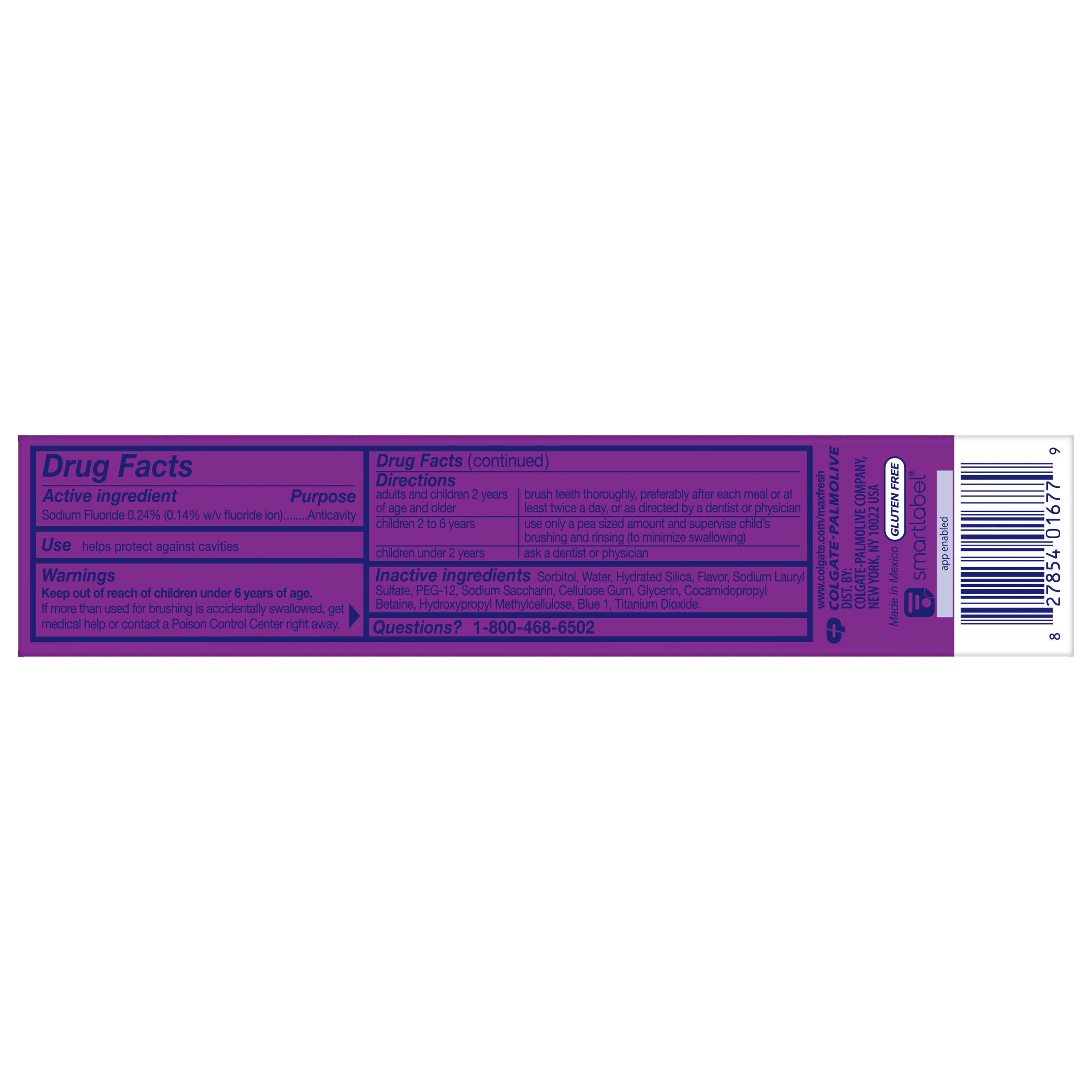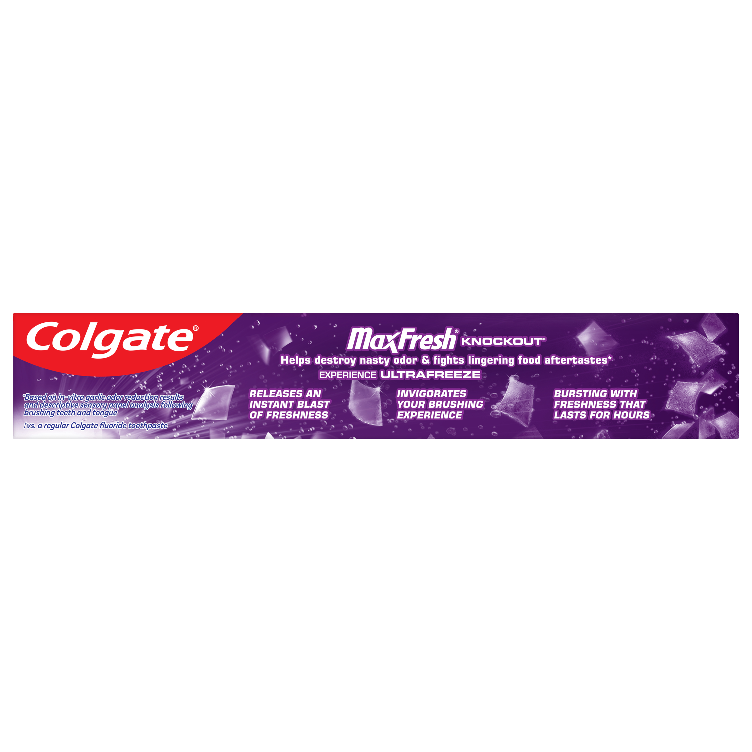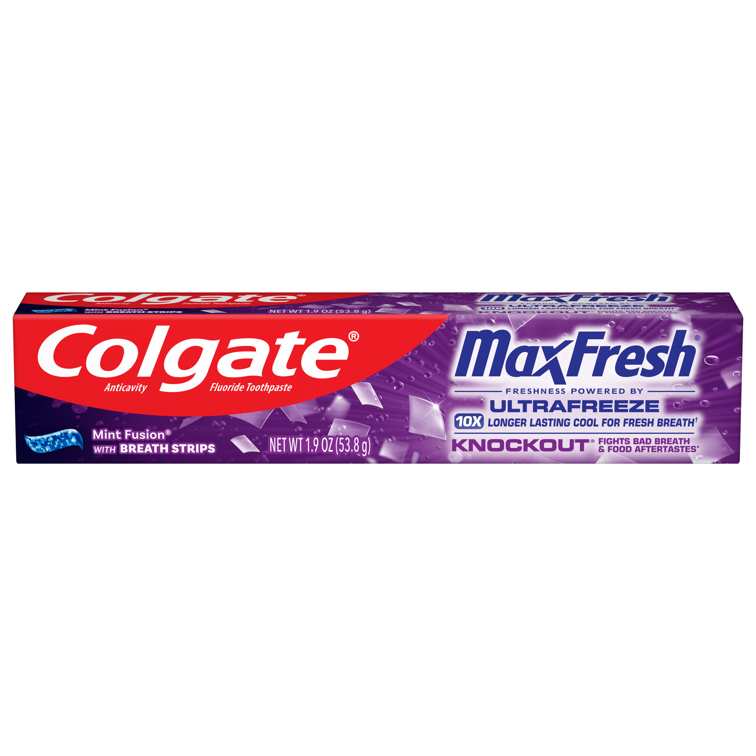 SKU 61044119 Consumer Unit - GTIN 00827854016779 Case - GTIN 10827854016776 Product Category Oral Care Product Sub Category Toothpaste Product Equity (Brand) Colgate Product Sub Brand Colgate Max Fresh TP Product Title Colgate MaxFresh Knockout Mint Toothpaste, Travel Toothpaste, 1.9 oz Product Description Release an instant blast of freshness and help destroy nasty odors with Colgate MaxFresh Knockout Mint Toothpaste. Powered by Ultrafreeze, this invigorating travel-size fresh breath toothpaste offers 10X longer-lasting cool for fresh breath* and fights lingering food aftertastes**. This minty travel toothpaste, with the help of Ultrafreeze and hundreds of mini breath strips, is bursting with freshness that lasts for hours. Colgate MaxFresh Knockout Toothpaste comes in a powerful minty toothpaste flavor that invigorates the brushing experience. The unique formula, with odor neutralizing technology, helps destroy even the nastiest odors and keeps your breath fresh for hours.** However, it’s more than just a travel size toothpaste for bad breath, Colgate MaxFresh Knockout Mint Toothpaste is also a fluoride toothpaste and helps prevent cavities. With its refreshing minty flavor and hundreds of mini breath strips, Colgate MaxFresh Knockout Toothpaste leaves your breath feeling fresh for hours. Plus, the fluoride-based formula helps fight cavities. Get long-lasting fresh breath with Colgate MaxFresh Knockout Mint Toothpaste. *vs. a regular Colgate fluoride toothpaste **based on in-vitro garlic odor reduction results and descriptive sensory panel analysis following brushing teeth and tongue eCommerce Copy- Long Description Release an instant blast of freshness and help destroy nasty odors with Colgate® Max Fresh Knockout Mint Toothpaste. Powered by Ultrafreeze, this invigorating fresh breath toothpaste offers 10X longer-lasting cool for fresh breath* and fights lingering food aftertastes**. This minty toothpaste, with the help of Ultrafreeze and hundreds of breath strips, unleashes a powerful rush of freshness for long-lasting fresh breath. Colgate® Max Fresh Knockout Toothpaste comes in a powerful minty toothpaste flavor that invigorates the brushing experience. The unique formula, with odor neutralizing technology, helps destroy even the nastiest odors and keeps your breath fresh for hours.** However, it’s more than just a toothpaste for bad breath, Colgate® Max Fresh Knockout Mint Toothpaste is also a fluoride toothpaste and helps prevent cavities. Get long-lasting fresh breath with Colgate® Max Fresh Knockout Mint Toothpaste. *vs. a regular Colgate® fluoride toothpaste **based on in-vitro garlic odor reduction results and descriptive sensory panel analysis following brushing teeth and tongue Bullet 1 Includes one (1) 1.9 oz tube of Colgate MaxFresh Knockout Mint Toothpaste, Travel Toothpaste Bullet 2 Colgate MaxFresh Knockout Toothpaste provides 10X longer-lasting cool for fresh breath* and helps destroy strong odors and food aftertastes** Bullet 3 Fluoride toothpaste formula helps fight cavities Bullet 4 This mini toothpaste, powered by Ultrafreeze, is bursting with freshness that lasts for hours Bullet 5 Release an instant blast of freshness with Colgate MaxFresh Knockout Mint Toothpaste for Bad Breath Walmart RPC 15077966453 Walmart URL (Computed) https://www.walmart.com/ip/a/15077966453