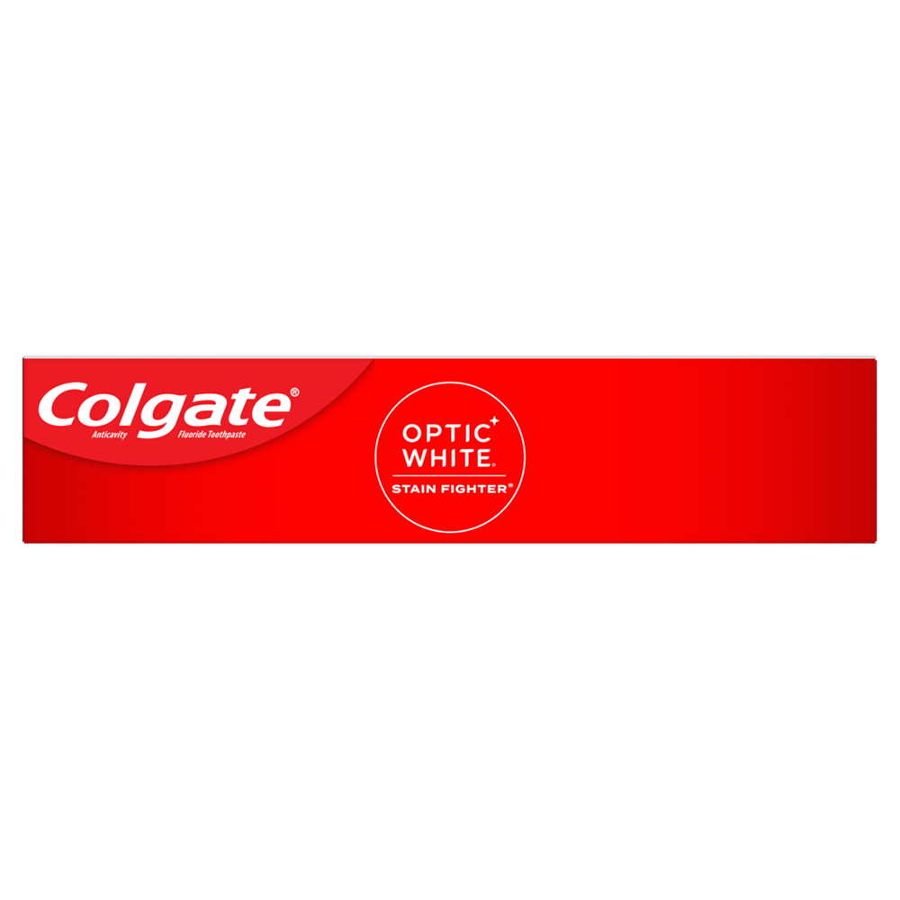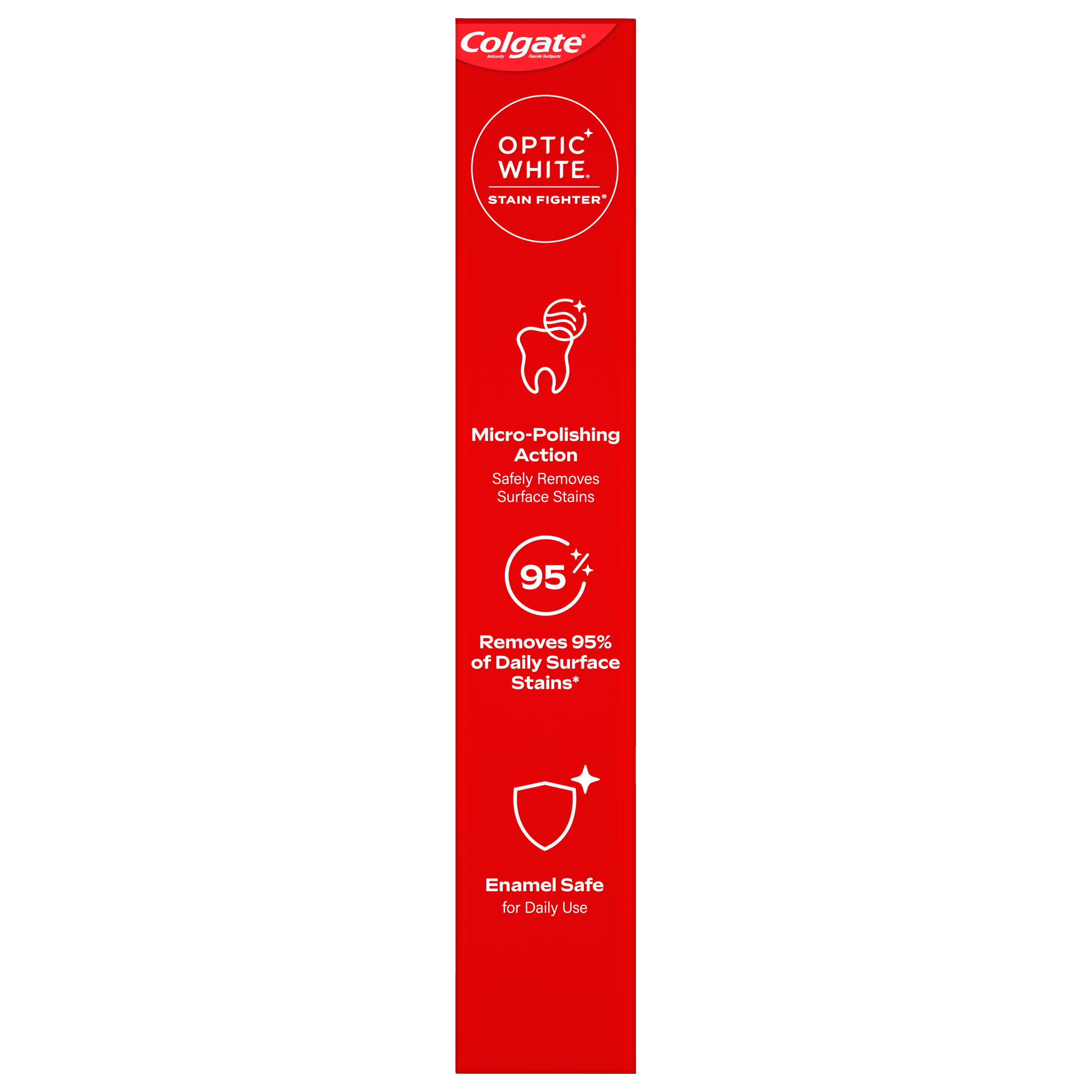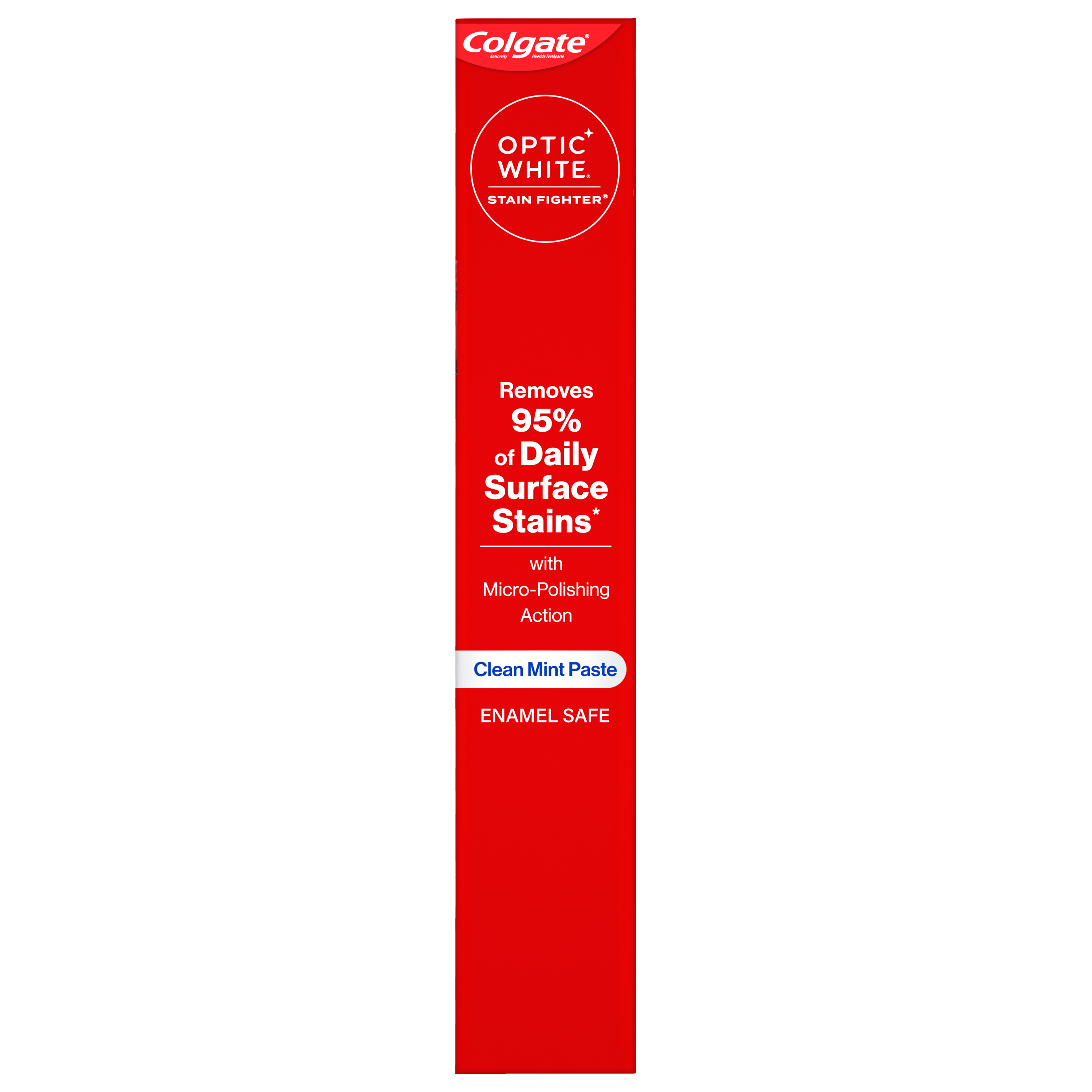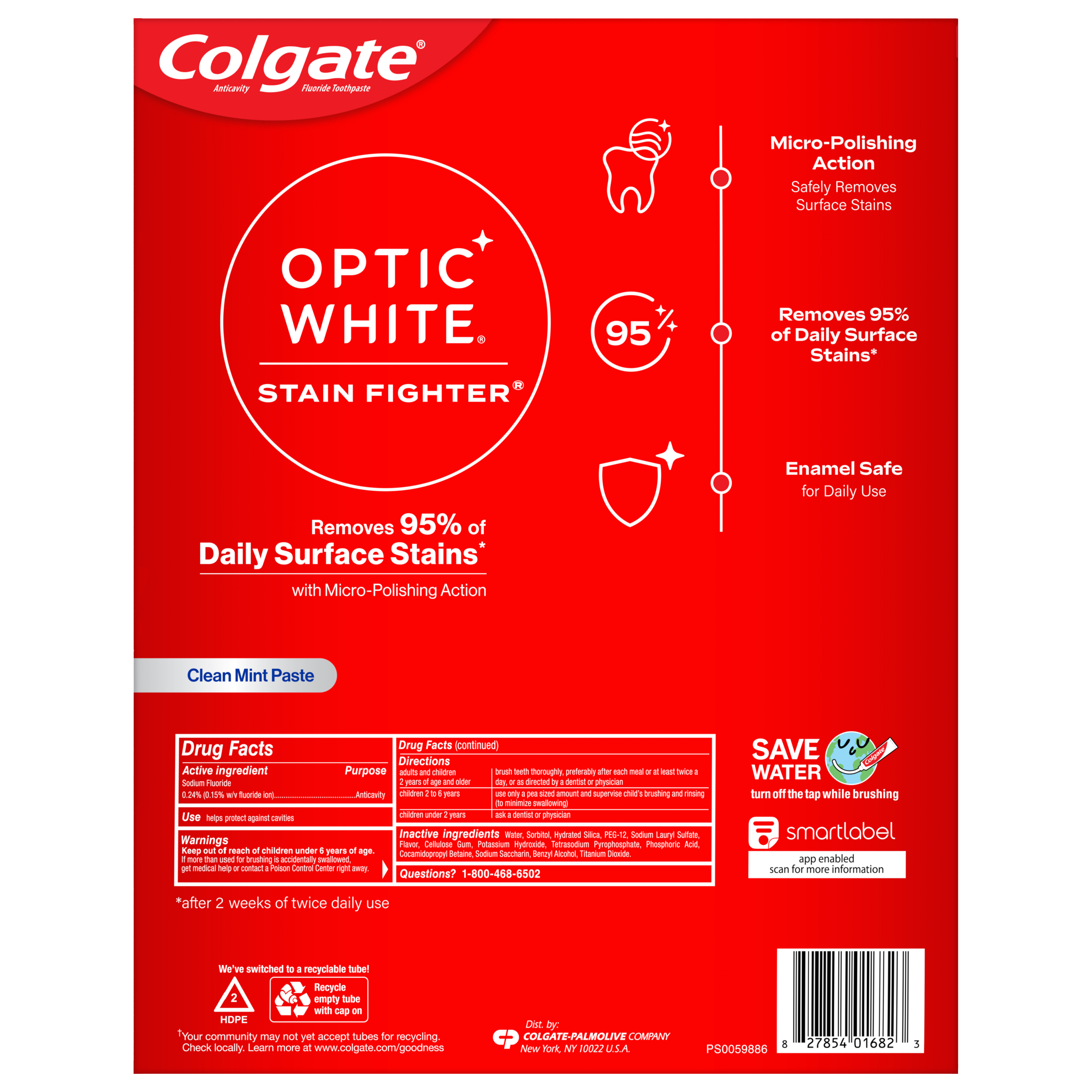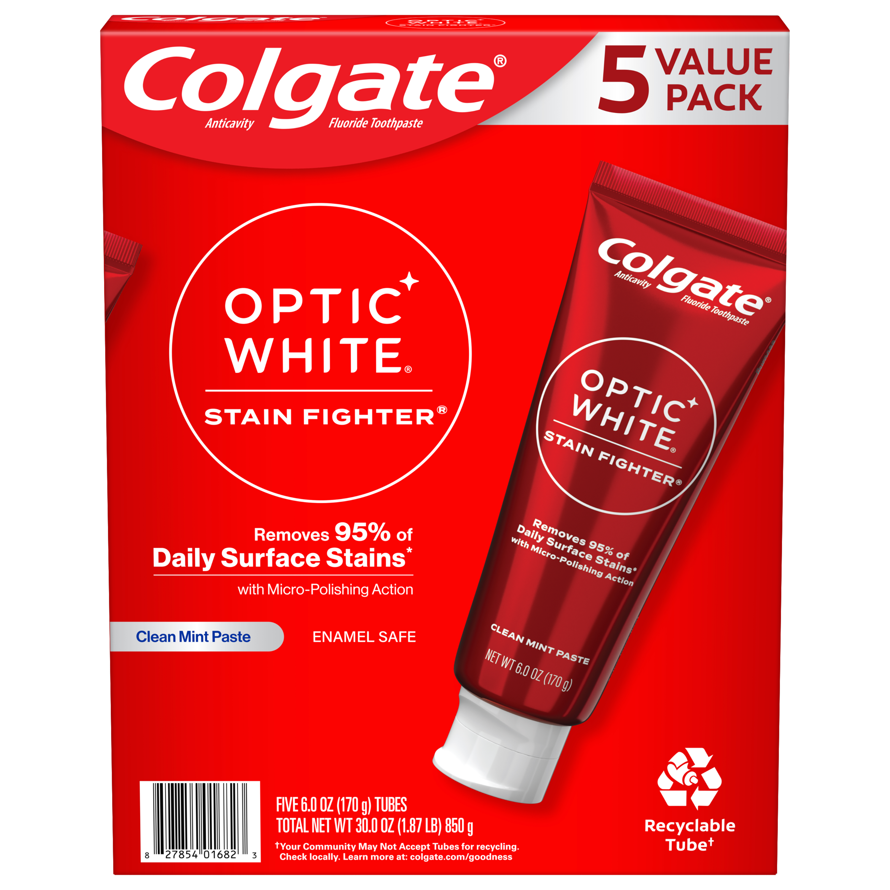 SKU 61044129 Consumer Unit - GTIN 00827854016823 Case - GTIN 10827854016820 Product Category Oral Care Product Sub Category Toothpaste Product Equity (Brand) Colgate Product Sub Brand Colgate Optic White TP Product Title Colgate Optic White Stain Fighter Teeth Whitening Toothpaste Pack, Clean Mint Paste Product Description Remove everyday surface stains for a brighter smile with the Colgate Optic White Stain Fighter Teeth Whitening Toothpaste Pack. This whitening toothpaste for adults removes 95% of daily surface stains for a brighter smile.* Get ready to reveal a smile that’s ready to shine with the Colgate Optic White Whitening Stain Removal Toothpaste Pack. The Colgate Optic White Stain Fighter Whitening Toothpaste uses a patented whitening formula to remove 95% of daily surface stains*. Using micro-polishing action, this anticavity toothpaste removes 5X more surface stains.** Plus, this fluoride toothpaste comes in a refreshing Clean Mint paste flavor so you can enjoy minty freshness every time you brush. Colgate Optic White Stain Fighter Teeth Whitening Toothpaste is a fluoride-based vegan toothpaste that is sugar free, gluten free, and enamel-safe for daily use. For whitening that works, choose the Colgate Optic White Stain Fighter Whitening Stain Removal Toothpaste Pack. *after 2 weeks of twice daily use **vs. ordinary, non whitening toothpaste after 2 weeks of continued use Bullet 1 Includes five (5) 6.0 oz tubes of Colgate Optic White Stain Fighter Teeth Whitening Toothpaste, Anticavity Fluoride Toothpaste Bullet 2 This pack of teeth whitening toothpaste for adults removes 95% of daily surface stains for a brighter smile* (*after 2 weeks of twice daily use) Bullet 3 The refreshing Clean Mint Paste flavor helps freshen your breath every time you brush with this mint toothpaste Bullet 4 Removes 5X more surface stains with micro-polishing action** (**vs. ordinary, non whitening toothpaste after 2 weeks of continued use) Bullet 5 This vegan toothpaste pack is gluten free, sugar free, and enamel-safe for daily use Bullet 6 Colgate Optic White Stain Fighter Toothpaste is an anticavity toothpaste made with a fluoride based formula Bullet 7 For whitening that works, choose the Colgate Optic White Stain Fighter Whitening Stain Removal Toothpaste Pack Active Ingredients Sodium Fluoride 0.24 % (0.15% w/v fluoride ion)