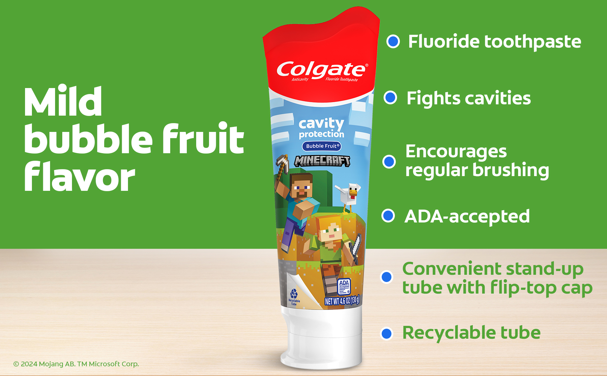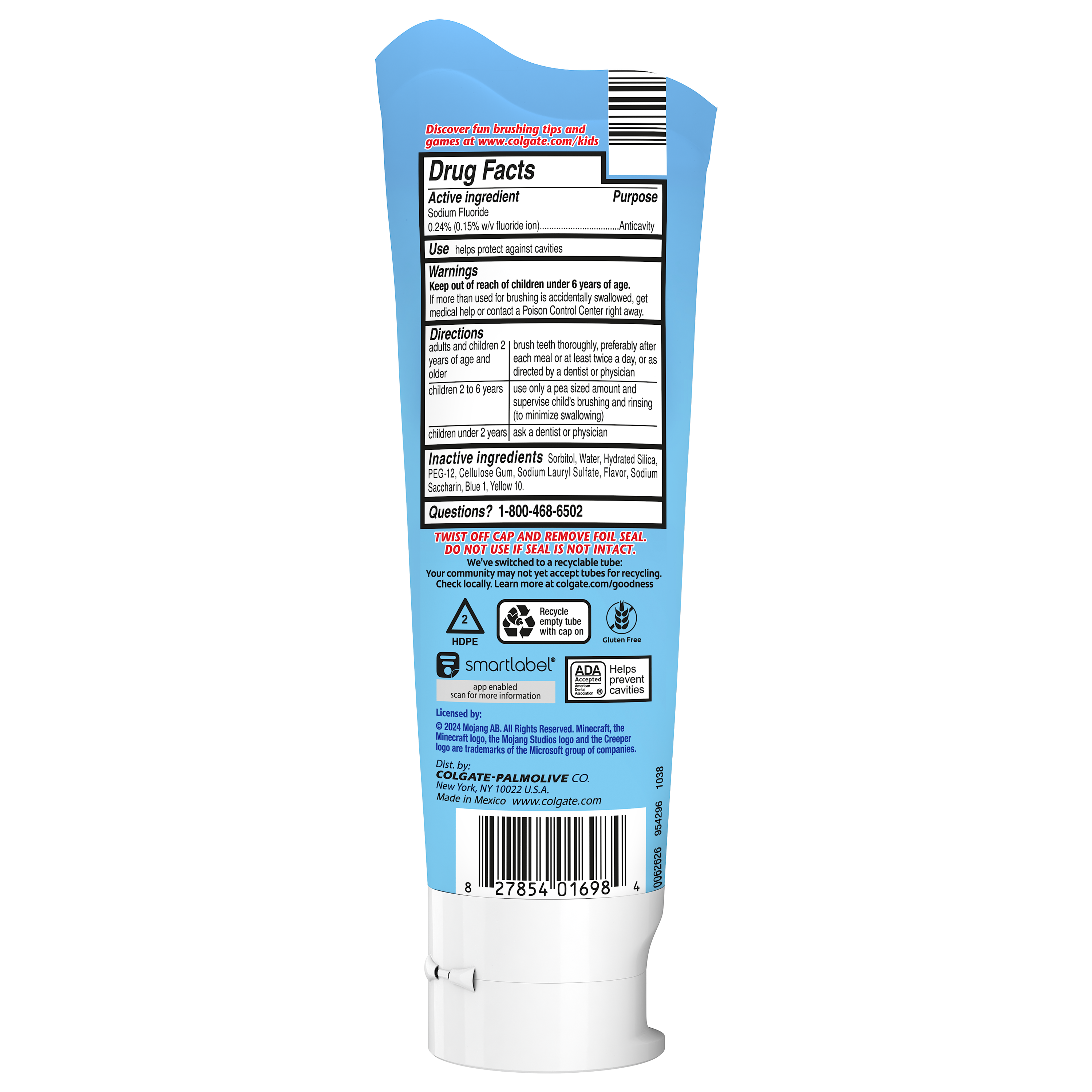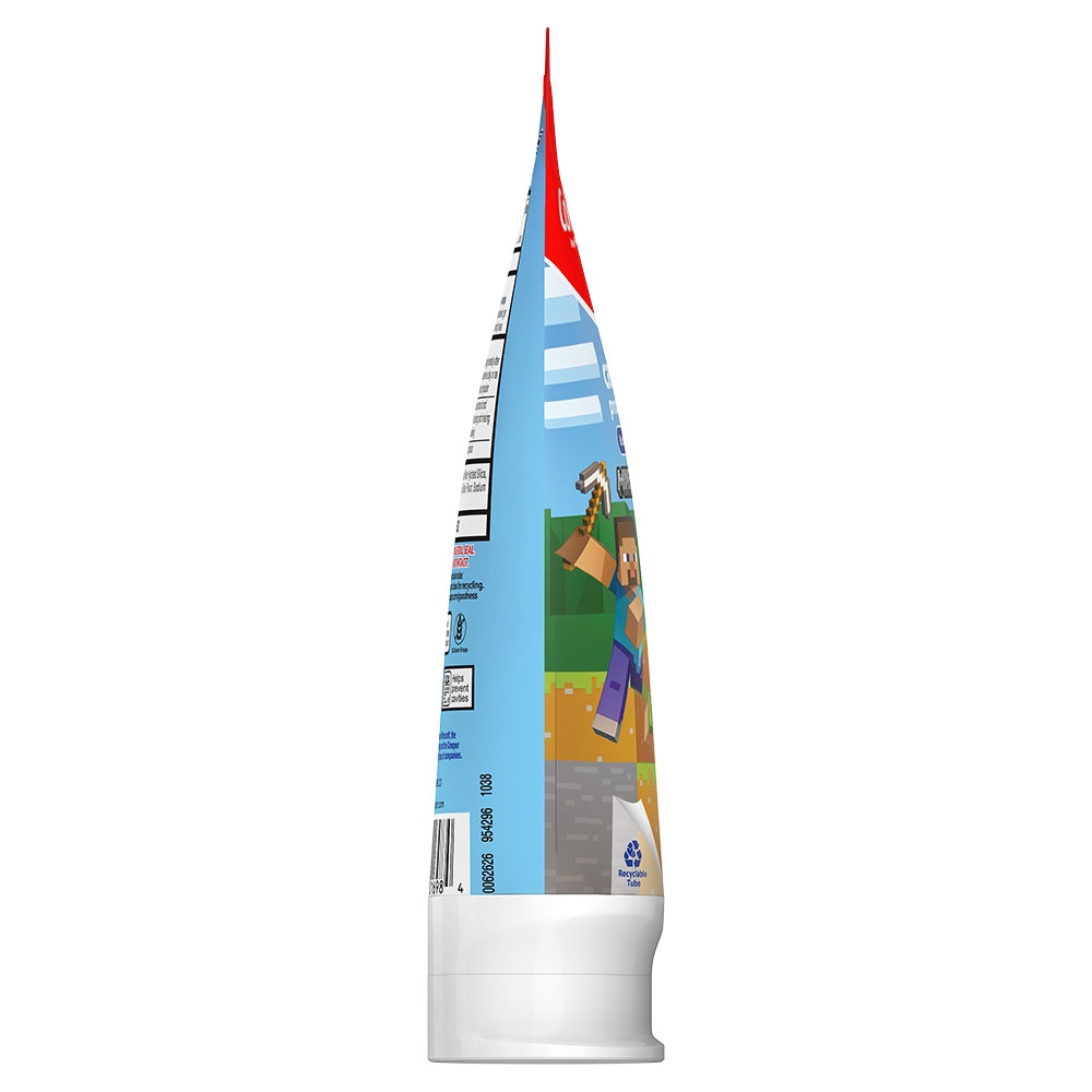 SKU 61044170 Consumer Unit - GTIN 00827854016984 Case - GTIN 10827854016981 Product Category Oral Care Product Sub Category Toothpaste Product Equity (Brand) Colgate Product Sub Brand Colgate Kids TP Product Title Colgate Minecraft Kids Toothpaste with Fluoride, Mild Bubble Fruit Flavor, 4.6 oz Product Description Turn regular brushing time into a fun Minecraft adventure using Colgate Kids Minecraft Toothpaste with Fluoride. Designed for children ages 2 and older, this kids anticavity toothpaste offers a Mild Bubble Fruit bubblegum toothpaste flavor that makes brushing teeth fun. This Minecraft themed childrens toothpaste comes in a stand-up tube with a flip-top cap for easy opening, closing, and storage on the counter. The fluoride kids toothpaste offers cavity protection and is an ADA accepted toothpaste for kids. This Colgate kids toothpaste contains fluoride, a clinically proven ingredient that fights cavities and provides cavity protection for developing teeth. In addition to fighting cavities, this kids fluoride toothpaste also helps strengthen teeth and is gentle on kids’ tooth enamel. Plus, parents will appreciate this kids cavity protection toothpaste is sugar free, gluten free, paraben free, and vegan. Make brushing feel like an awesome Minecraft adventure with the Colgate Minecraft Kids Toothpaste with Fluoride. This kids fluoride toothpaste is ideal for parents who want an effective anticavity toothpaste for their young kids or toddlers. Help build healthy oral care habits with Colgate Minecraft Kids Toothpaste with Fluoride. eCommerce Copy- Long Description Fun Flavored Toothpaste Loved by Kids When it comes to dental care, encouraging children to start brushing early and regularly is important. As their oral health care needs are evolving, Colgate Kids Toothpaste with Fluoride, Anticavity & Cavity Protection Toothpaste, For Ages 2+, Minecraft, Mild Bubble Fruit Flavor made especially for kids 2 and up offers an enamel safe children’s toothpaste formula that works on developing teeth. This kids anticavity toothpaste offers cavity and enamel protection, convenient tube packaging and a fun flavor making brushing enjoyable for a lifetime of bright smiles. Furthermore, the ADA Council of Scientistic Affairs' Acceptance of Colgate for Kids toothpaste is based on its finding that the product is effective in helping to prevent and reduce tooth decay, when used as directed. Healthy Smiles With Colgate At Colgate, we make toothpaste that promotes healthy smiles. Not only because having a healthy smile is important to your overall health, but because when you have a healthy smile, you actually smile more – and that’s a powerful thing. Smiles are the simplest form of optimism, something we need now more than ever. That’s why we’re committed to raising oral healthcare standards everywhere. Bullet 1 Includes one (1) 4.6 oz tube of Colgate Minecraft Kids Toothpaste with Fluoride in an exciting Mild Bubble Fruit bubblegum toothpaste flavor Bullet 2 This fluoride toothpaste for kids is clinically proven to fight against cavities and help strengthen teeth Bullet 3 You can use this fluoride-formulated Minecraft toothpaste for children ages 2 and up Bullet 4 The Mild Bubble Fruit flavor delivers a bubblegum toothpaste flavor that kids love and encourages healthy oral care habits Bullet 5 This kids anticavity toothpaste is gluten free, sugar free, paraben free, and vegan Bullet 6 The childrens toothpaste comes in a stand-up tube with a flip-top cap for easy opening, closing, and storage on the counter Bullet 7 Colgate Minecraft Fluoride Kids Toothpaste is an ADA accepted toothpaste that is gentle on kids’ tooth enamel Active Ingredients Sodium Fluoride 0.24 % (0.15% w/v fluoride ion) Amazon RPC B0DHW556F9 AMZ URL https://www.amazon.com/dp/B0DHW556F9 Walmart RPC 9026752813 Walmart URL (Computed) https://www.walmart.com/ip/a/9026752813