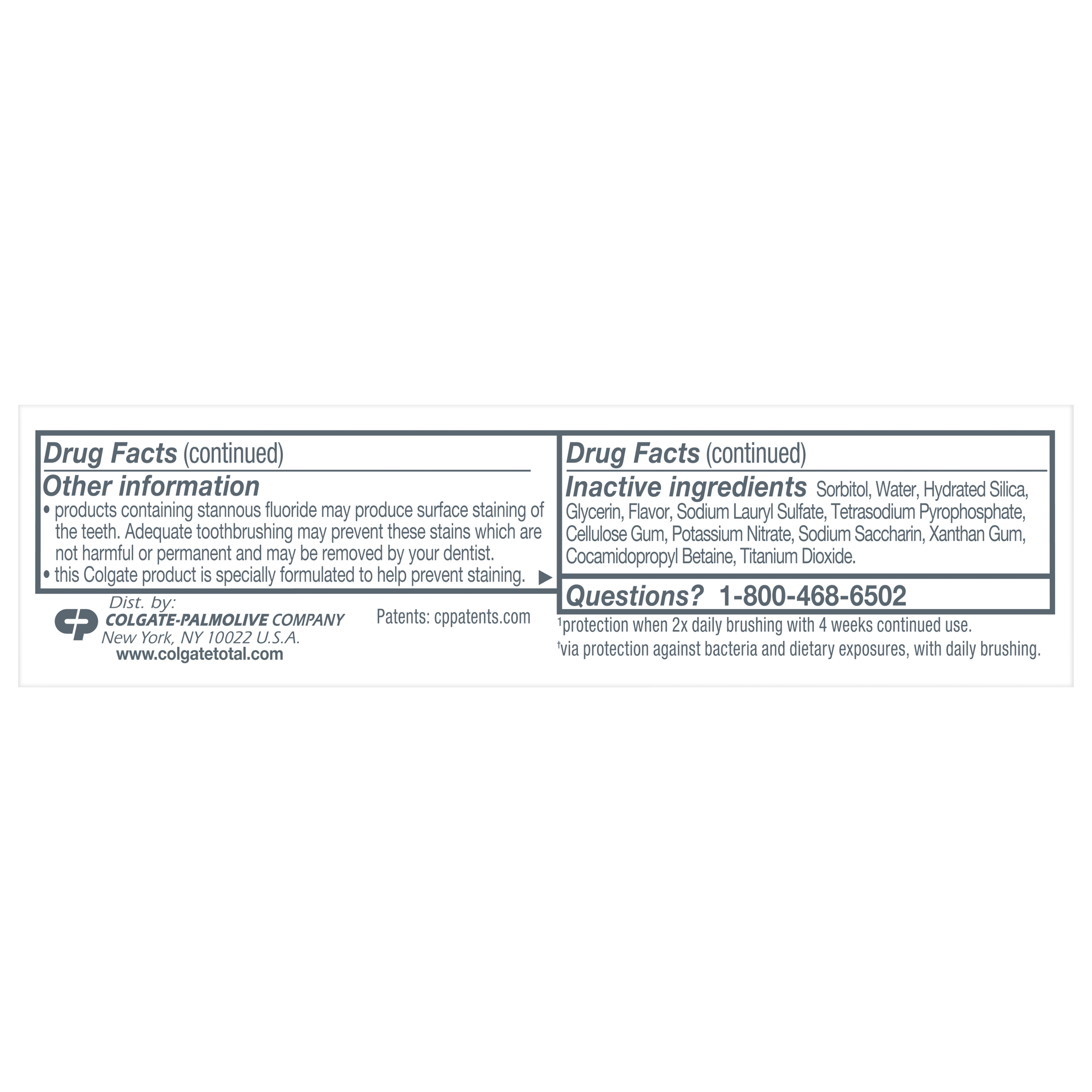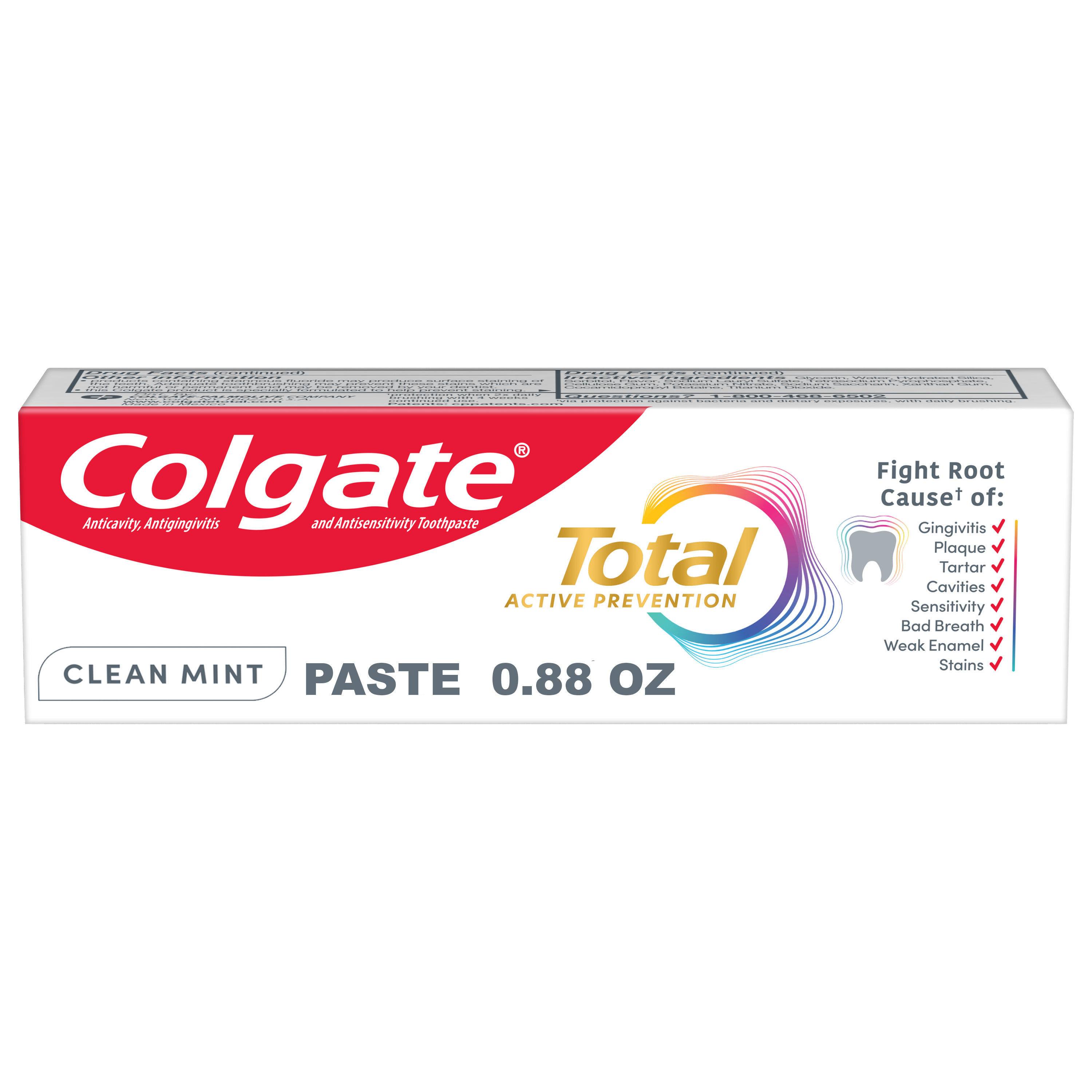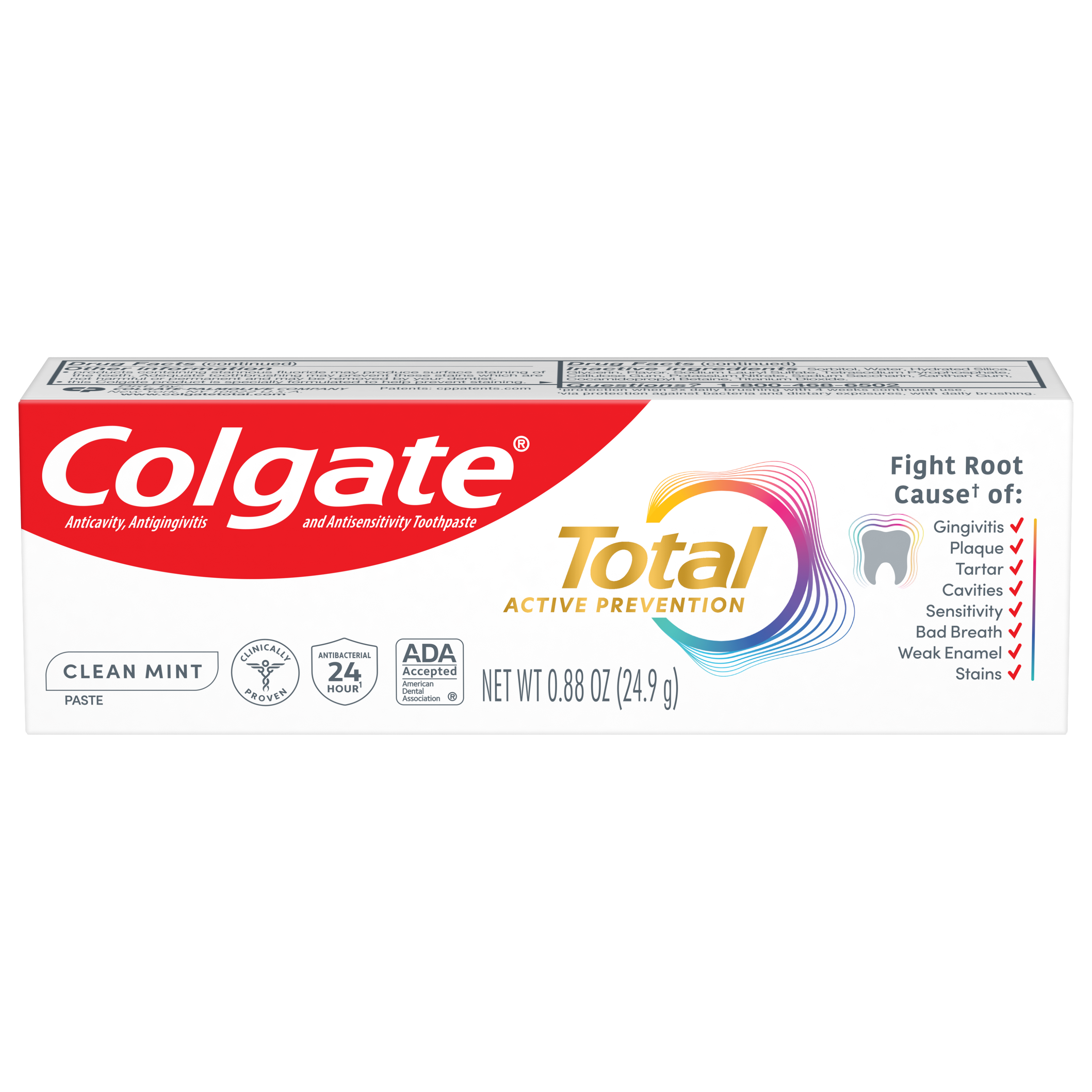 SKU 61044324 Consumer Unit - GTIN 00035000459862 Case - GTIN 10035000459869 Product Category Oral Care Product Sub Category Toothpaste Product Equity (Brand) Colgate Product Sub Brand Colgate Total TP Product Title Colgate Total Active Prevention Clean Mint Toothpaste, Travel Size Toothpaste, 0.88 oz Product Description Help stop oral health problems* before they start with Colgate Total Active Prevention Clean Mint Toothpaste. This travel size anticavity toothpaste fights bacteria, the root cause of many oral health issues such as gingivitis, tartar, plaque, stains, weak enamel, sensitivity, bad breath, and cavities. This science-backed fluoride toothpaste uses a unique, clinically-proven stannous fluoride formula to help fight plaque bacteria. Plus, this mint toothpaste blends peppermint and spearmint together for a mild cooling effect and helps minimize bad breath. Colgate Total Active Prevention Clean Mint Fluoride Toothpaste can help improve your oral health by tackling many oral health issues* before they begin. This Colgate Total anticavity toothpaste offers 24 hours of long-lasting antibacterial protection when brushing twice daily with 4 weeks of continued use. Feel secure knowing that Colgate Total Active Prevention Clean Mint Toothpaste has your cavities, gingivitis, and sensitivity prevention needs covered for a healthy and confident smile. *such as cavities and gingivitis **vs. non-antibacterial fluoride toothpaste with 3 months of continued use eCommerce Copy- Long Description Colgate Total® SF Clean Mint Toothpaste has a breakthrough formula that fights bacteria on teeth, tongue, cheeks and gums for whole mouth health. Colgate Total® with stannous fluoride also offers more benefits than ever including sensitivity relief, improved enamel strength* and odor neutralization* (*based on in vitro studies). Bullet 1 Includes one (1) 0.88 oz travel size tube of Colgate Total Active Prevention Clean Mint Toothpaste Bullet 2 Fights bacteria, the root cause of many common oral health issues like gingivitis, plaque, weak enamel, tartar, sensitivity, bad breath, and cavities Bullet 3 This travel size toothpaste uses a clinically proven formula to help stop oral health issues before they start* Bullet 4 The Clean Mint fluoride toothpaste formula helps freshen breath and removes surface stains Bullet 5 This anticavity toothpaste offers long-lasting 24 hours of antibacterial protection when brushing twice daily with 4 weeks of continued use Bullet 6 For superior prevention** against sensitivity, plaque, gingivitis, and tartar, choose Colgate Total Active Prevention Toothpaste Active Ingredients Stannous Fluoride 0.454% (0.15 w/v fluoride ion)
