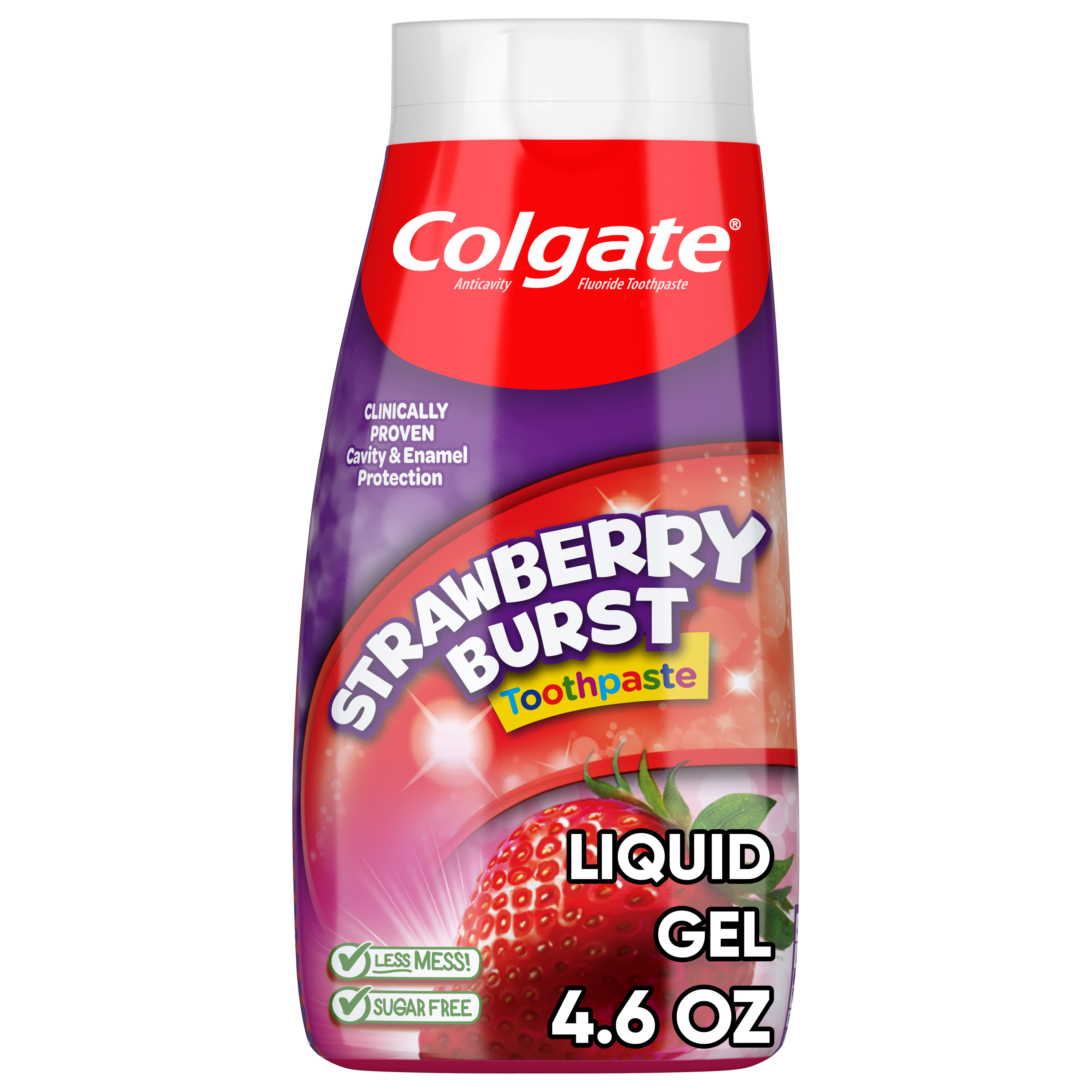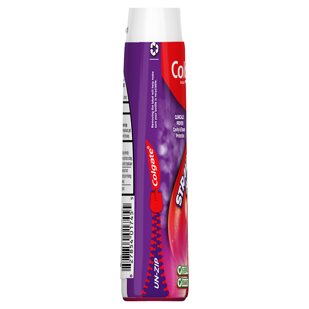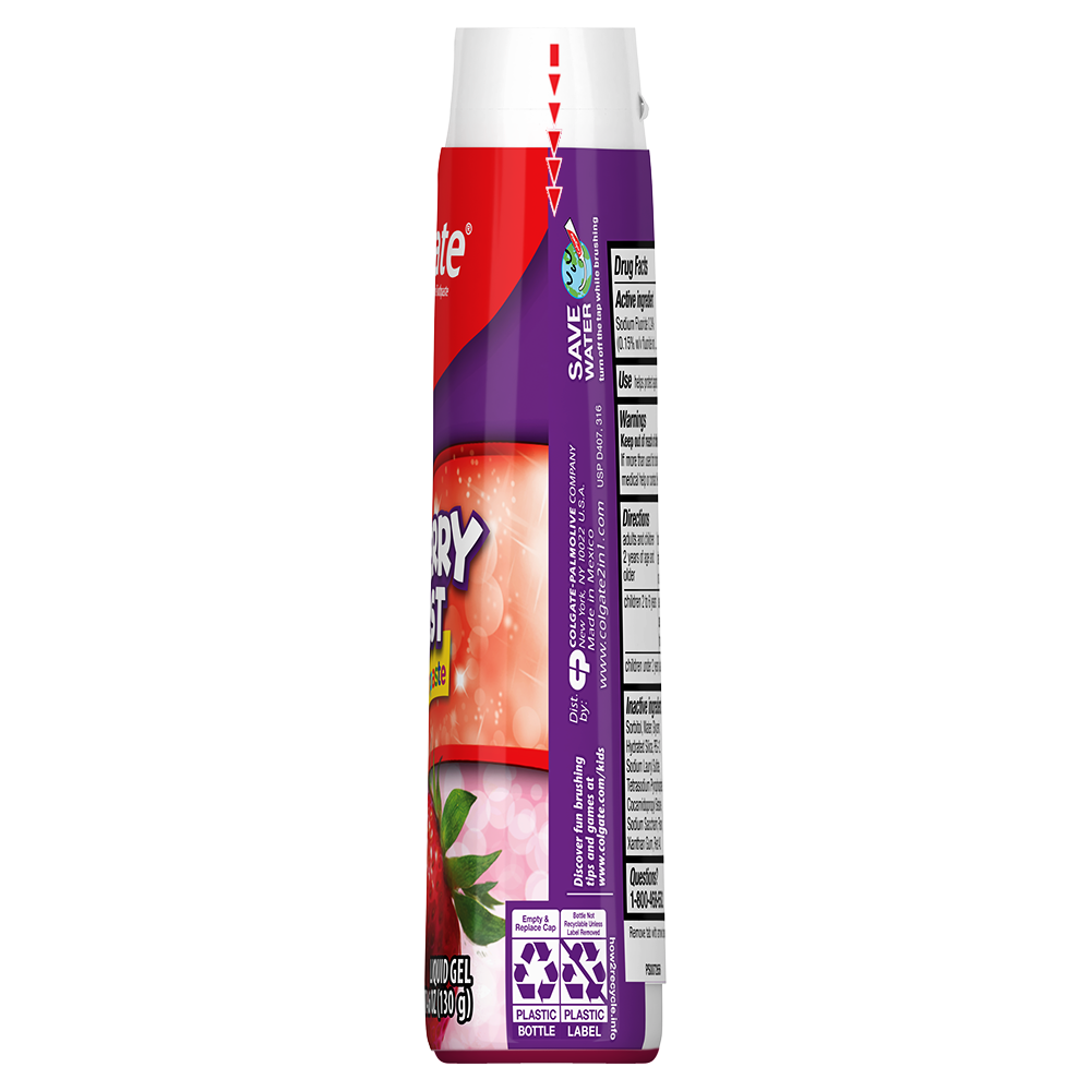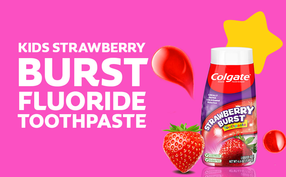 SKU 61044443 Consumer Unit - GTIN 00827854017455 Case - GTIN 10827854017452 Product Category Oral Care Product Sub Category Toothpaste Product Equity (Brand) Colgate Product Sub Brand Colgate 2 in 1 TP Product Title Colgate Kids Fluoride Toothpaste, Strawberry Burst, 4.6 oz Product Description Colgate Kids Fluoride Toothpaste, Strawberry Burst is a strawberry flavored fluoride toothpaste for kids that makes brushing enjoyable and encourages your child to maintain a daily oral care routine. Formulated in liquid gel form, this kids fluoride toothpaste provides clinically proven cavity and enamel protection and freshens the mouth with a burst of strawberry flavor loved by kids. This flavored strawberry toothpaste is also sugar-free and gluten-free. When it comes to dental care, encouraging children to start brushing early and regularly is important. Colgate Kids Fluoride Toothpaste makes brushing fun. This easy-to-dispense gel toothpaste offers cavity and enamel protection, a fun, refreshing flavor, colorful packaging and a lifetime of bright smiles. At Colgate, we make toothpaste that promotes healthy smiles. Not only because having a healthy smile is important to your overall health, but because when you have a healthy smile, you actually smile more—and that’s a powerful thing. Smiles are the simplest form of optimism, something we need now more than ever. That’s why we’re committed to raising oral healthcare standards everywhere. eCommerce Copy- Long Description Colgate Fluoride Toothpaste, Strawberry Burst is a kids fluoride toothpaste that makes brushing enjoyable and encourages your child to maintain a daily oral care routine. Formulated in liquid gel form, this kids fluoride toothpaste provides clinically proven cavity and enamel protection and freshens the mouth with a burst of strawberry flavor loved by kids. The strawberry flavored toothpaste is also sugar- and gluten-free. Bullet 1 Includes one (1) 4.6 oz tube of Colgate Kids Fluoride Toothpaste, Strawberry Burst Bullet 2 Fluoride toothpaste for kids helps protect growing teeth from harmful plaque buildup Bullet 3 Clinically proven fluoride formula helps fight cavities and provides enamel protection Bullet 4 Easy-to-dispense gel toothpaste makes morning and nighttime brushing quick and easy Bullet 5 Enjoy the exciting Strawberry Burst flavor for a fun and fruity way to encourage regular brushing Active Ingredients Sodium Fluoride 0.24 % (0.15% w/v fluoride ion) Amazon RPC B0DJ3N9C5Q AMZ URL https://www.amazon.com/dp/B0DJ3N9C5Q Walmart RPC 9115051958 Walmart URL (Computed) https://www.walmart.com/ip/a/9115051958
