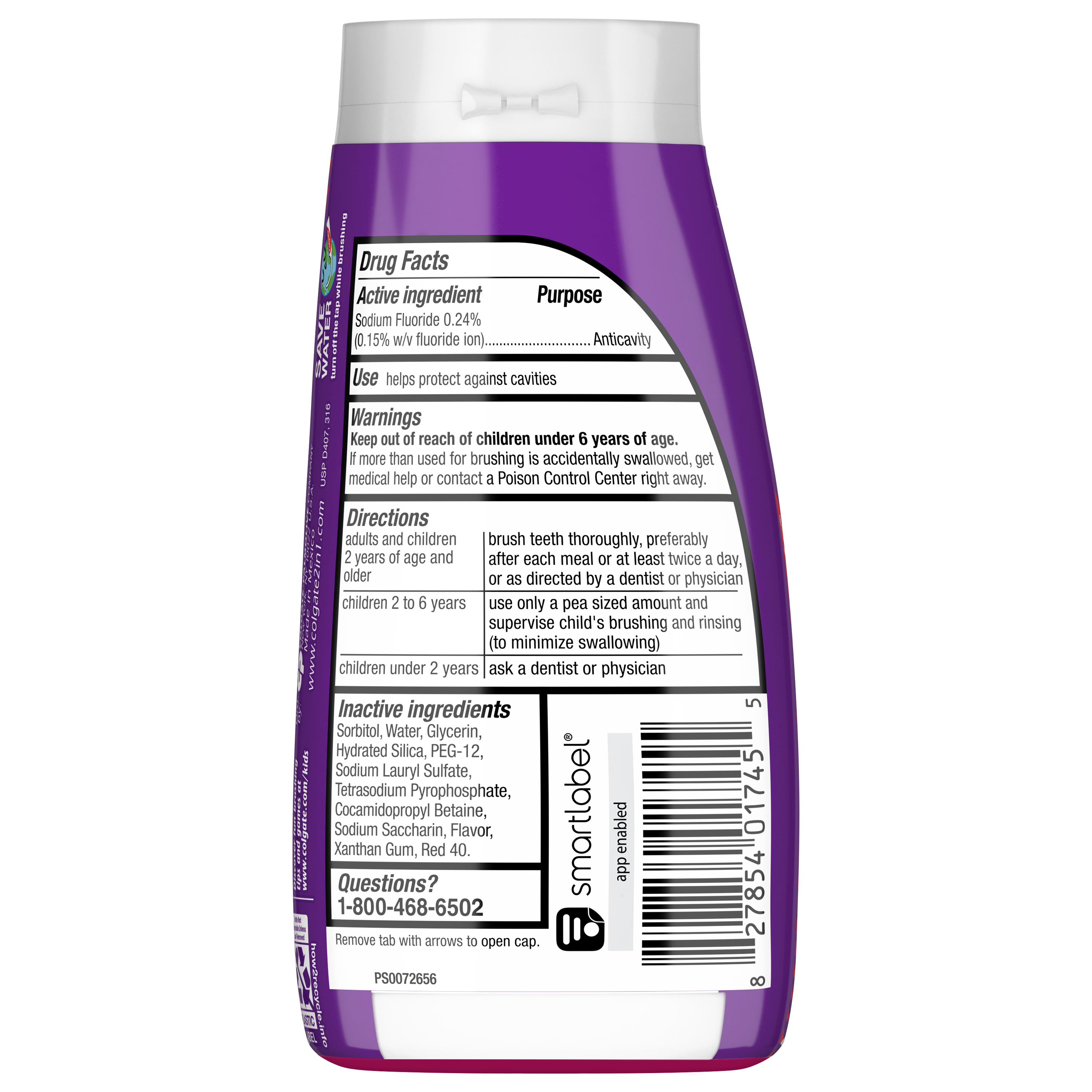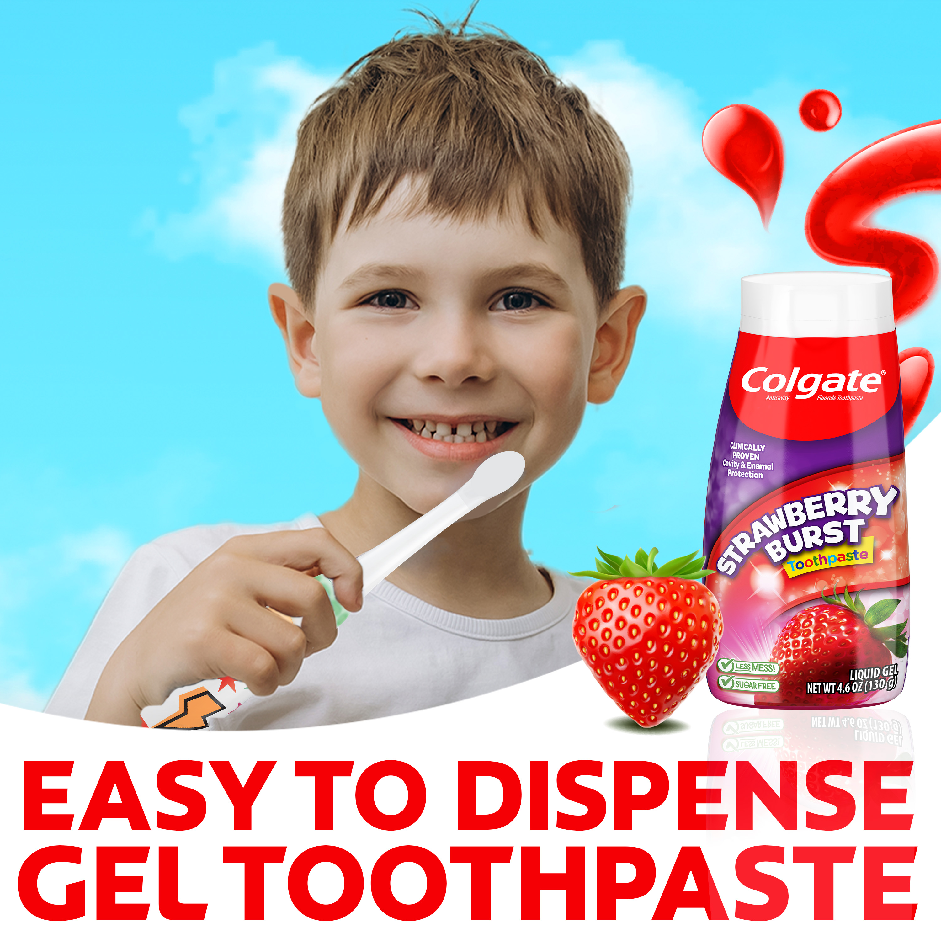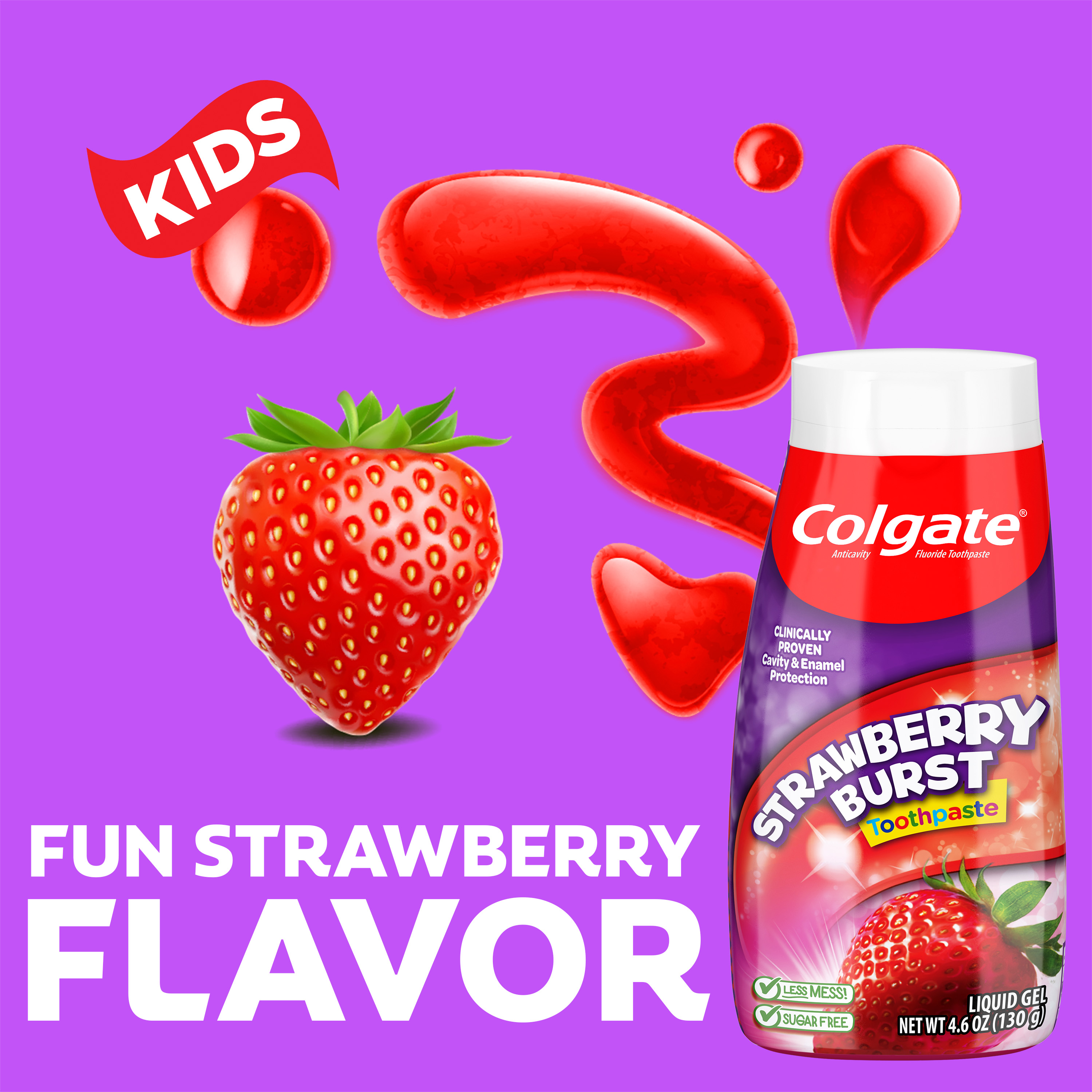 SKU 61044443 Consumer Unit - GTIN 00827854017455 Case - GTIN 10827854017452 Product Category Oral Care Product Sub Category Toothpaste Product Equity (Brand) Colgate Product Sub Brand Colgate 2 in 1 TP Product Title Colgate Kids Fluoride Toothpaste, Strawberry Burst, 4.6 oz Product Description Colgate Kids Fluoride Toothpaste, Strawberry Burst is a strawberry flavored fluoride toothpaste for kids that makes brushing enjoyable and encourages your child to maintain a daily oral care routine. Formulated in liquid gel form, this kids fluoride toothpaste provides clinically proven cavity and enamel protection and freshens the mouth with a burst of strawberry flavor loved by kids. This flavored strawberry toothpaste is also sugar-free and gluten-free. When it comes to dental care, encouraging children to start brushing early and regularly is important. Colgate Kids Fluoride Toothpaste makes brushing fun. This easy-to-dispense gel toothpaste offers cavity and enamel protection, a fun, refreshing flavor, colorful packaging and a lifetime of bright smiles. At Colgate, we make toothpaste that promotes healthy smiles. Not only because having a healthy smile is important to your overall health, but because when you have a healthy smile, you actually smile more—and that’s a powerful thing. Smiles are the simplest form of optimism, something we need now more than ever. That’s why we’re committed to raising oral healthcare standards everywhere. eCommerce Copy- Long Description Colgate Fluoride Toothpaste, Strawberry Burst is a kids fluoride toothpaste that makes brushing enjoyable and encourages your child to maintain a daily oral care routine. Formulated in liquid gel form, this kids fluoride toothpaste provides clinically proven cavity and enamel protection and freshens the mouth with a burst of strawberry flavor loved by kids. The strawberry flavored toothpaste is also sugar- and gluten-free. Bullet 1 Includes one (1) 4.6 oz tube of Colgate Kids Fluoride Toothpaste, Strawberry Burst Bullet 2 Fluoride toothpaste for kids helps protect growing teeth from harmful plaque buildup Bullet 3 Clinically proven fluoride formula helps fight cavities and provides enamel protection Bullet 4 Easy-to-dispense gel toothpaste makes morning and nighttime brushing quick and easy Bullet 5 Enjoy the exciting Strawberry Burst flavor for a fun and fruity way to encourage regular brushing Active Ingredients Sodium Fluoride 0.24 % (0.15% w/v fluoride ion) Amazon RPC B0DJ3N9C5Q AMZ URL https://www.amazon.com/dp/B0DJ3N9C5Q Walmart RPC 9115051958 Walmart URL (Computed) https://www.walmart.com/ip/a/9115051958