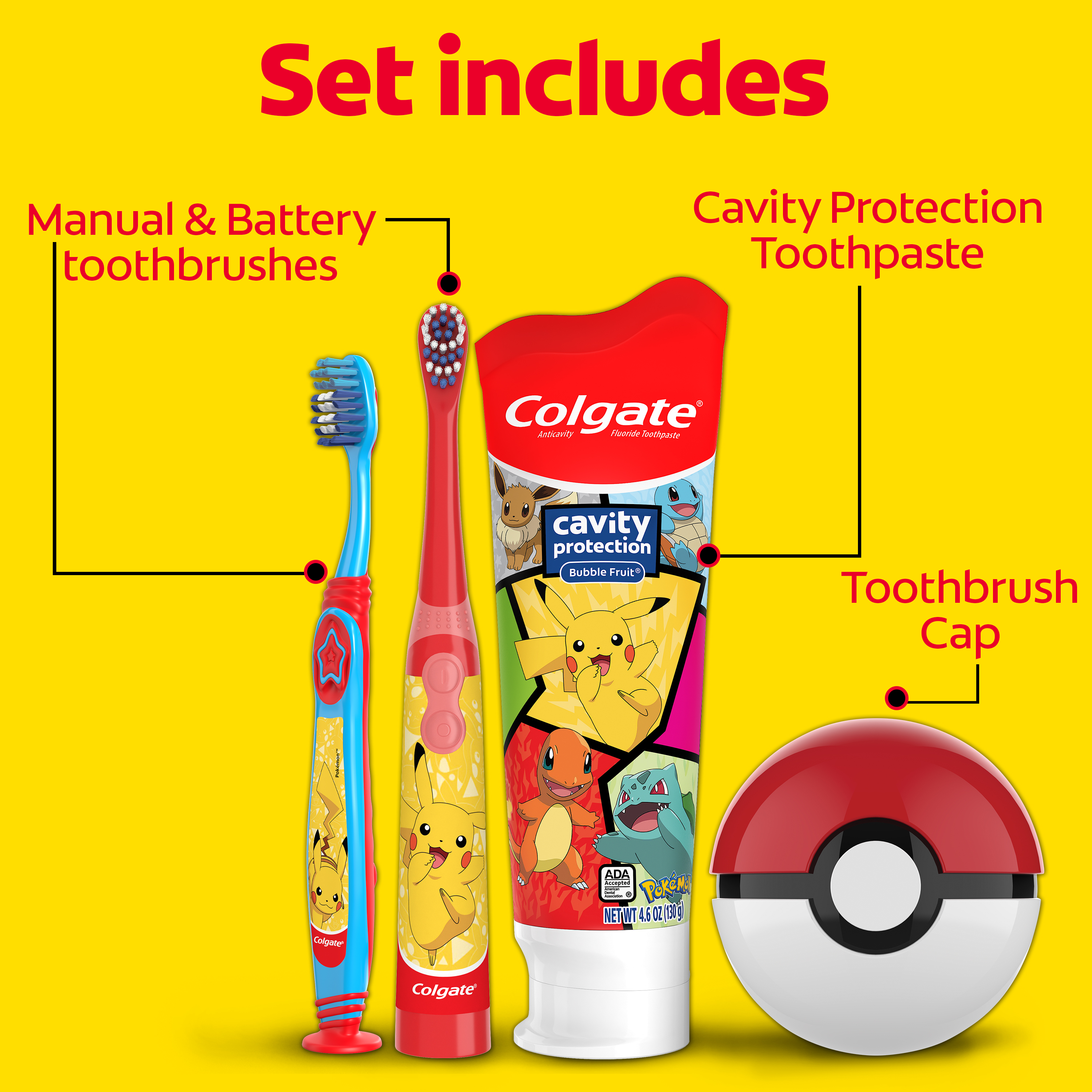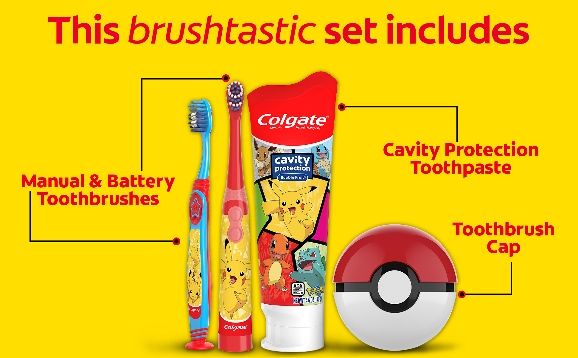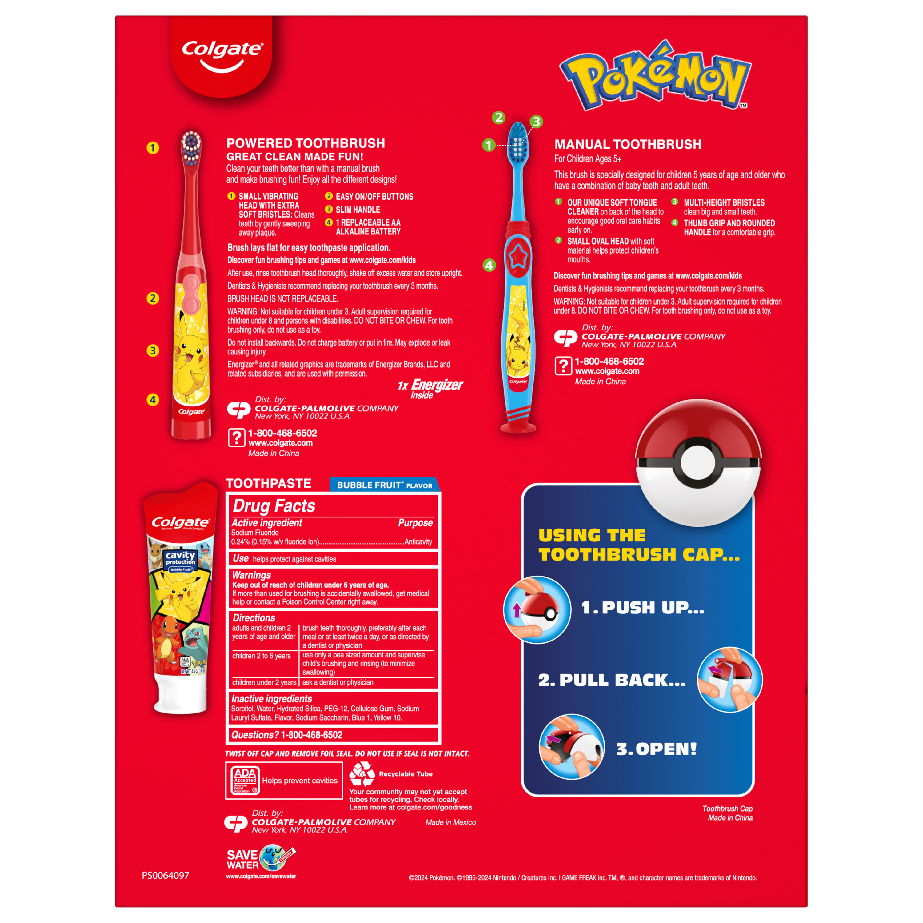 SKU 61044444 Consumer Unit - GTIN 00827854017462 Case - GTIN 10827854017469 Product Category Oral Care Product Sub Category Oral Care SUC Mixed Product Equity (Brand) Oral Care BEQ Mixed Product Sub Brand Oral Care SBR Mixed Product Title Colgate Kids Pokemon Toothbrush and Kids Toothpaste Gift Set Product Description Make brushing brushtastic with this fun Colgate Pokemon gift set. This Pokemon-themed Colgate Kids toothbrush set comes with a battery powered Pokemon toothbrush, a manual kids toothbrush, and a kids fluoride toothpaste with a fun Pokemon-themed cap. Make teeth brushing fun for kids using this Pokemon kids gift set. This Colgate Kids toothbrush and kids toothpaste set includes an ADA-accepted fluoride toothpaste to protect against cavities, fortify weak spots on enamel, and reduce plaque buildup with regular brushing. Plus, its mild Bubble Fruit flavor tastes yummy while it works to freshen breath. Both Colgate Kids Toothbrushes in this gift set have extra soft bristles that are gentle on delicate gums and growing teeth. The Colgate Kids battery toothbrush has a vibrating brush head to help kids brush well, while the manual toothbrush has a rounded handle and comfortable grip for small hands. At Colgate, we’re making kids toothbrushes fun because we know the power of a healthy smile. Our children’s oral health initiative, Bright Smiles, Bright Futures, has impacted the lives of more than a billion children by providing free oral health education and dental care in over 80 countries. As the world leader in oral care, Colgate is committed to improving children's oral health around the world. Bullet 1 The Pokemon gift set includes one (1) kids manual toothbrush, one (1) kids toothpaste and one (1) kids battery toothbrush with AA battery Bullet 2 The kids battery powered Pokemon toothbrush and manual toothbrush use extra soft bristles to help remove plaque buildup and cavity-causing bacteria Bullet 3 The Colgate Kids Battery Powered Toothbrush has a vibrating brush head while the manual toothbrush has a rounded handle and comfortable grip for little hands Bullet 4 A mild Bubble Fruit flavor in the kids fluoride toothpaste tastes yummy and works to freshen breath Bullet 5 This Colgate Kids cavity protection toothpaste with fluoride is ADA-accepted and uses a fluoride formula that helps fight cavities Active Ingredients Sodium Fluoride 0.24 % (0.15% w/v fluoride ion) Walmart RPC 670258526 Walmart URL (Computed) https://www.walmart.com/ip/a/670258526