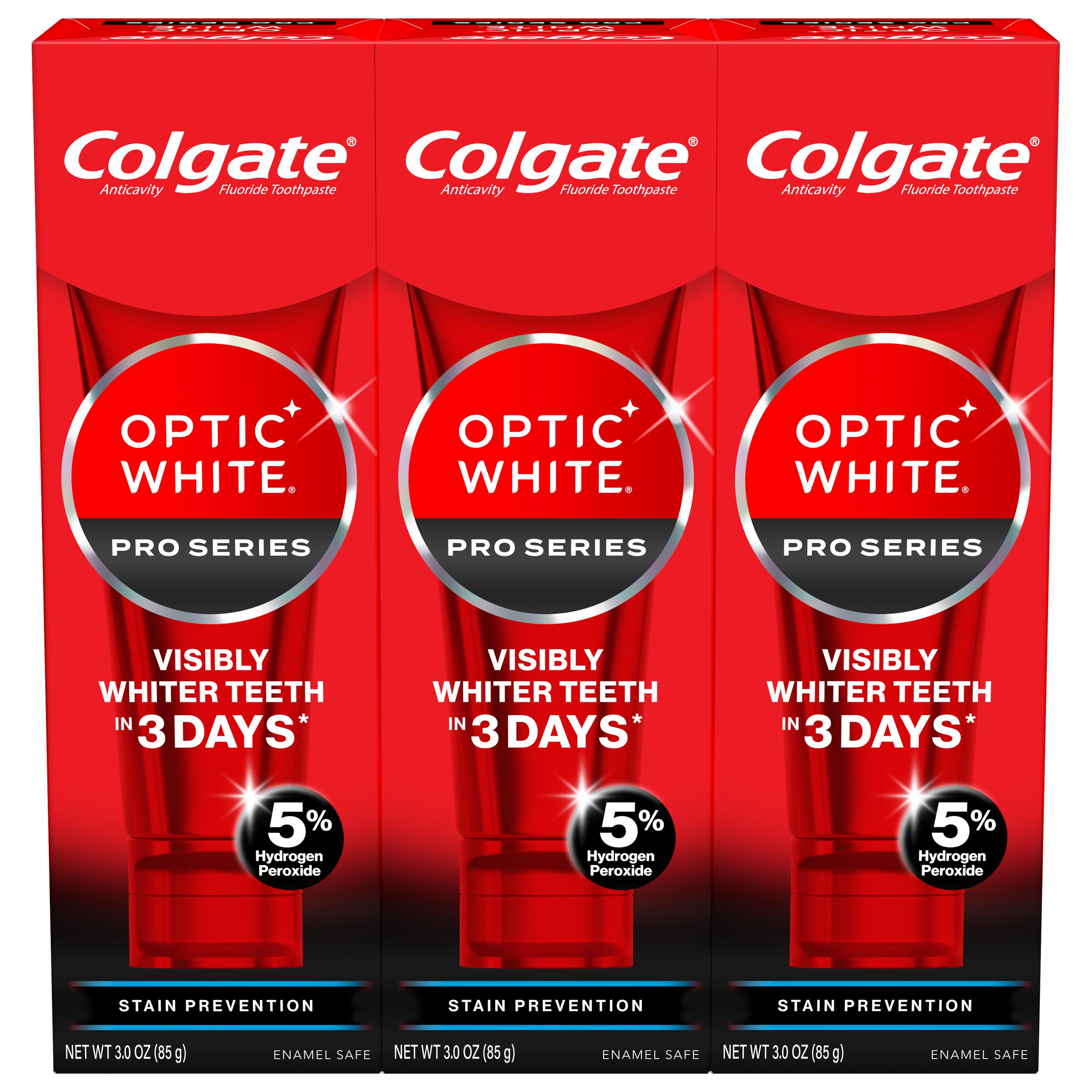 | Product Description | Experience visibly whiter teeth in 3 days* with Colgate Optic White Pro Series Stain Prevention Hydrogen Peroxide Toothpaste. Use this 3 pack of teeth whitening toothpaste with a 5% hydrogen peroxide-based formula to deeply whiten beyond surface stains. Colgate Optic White Pro Series Stain Prevention Toothpaste effectively removes tea, coffee, and wine stains so you can achieve a white smile. Colgate Optic White Pro Series Hydrogen Peroxide Toothpaste is a patented whitening toothpaste with 5% hydrogen peroxide that deeply whitens and is enamel-safe. This teeth whitening toothpaste is also an anticavity fluoride toothpaste to help prevent cavities. For whitening that works, choose the Colgate Optic White Pro Series Stain Prevention Hydrogen Peroxide Toothpaste. Reveal a smile that dazzles with Colgate Optic White Pro Series Toothpaste. Use this expert level whitening toothpaste for a vibrant glow and visibly whiter teeth*. Colgate Optic White Pro Series Hydrogen Peroxide Toothpaste is a gluten free, sugar free, and vegan toothpaste that has a refreshing mint toothpaste flavor. Unlock a bright, radiant smile with the Colgate Optic White Pro Series Stain Prevention Hydrogen Peroxide Toothpaste.
