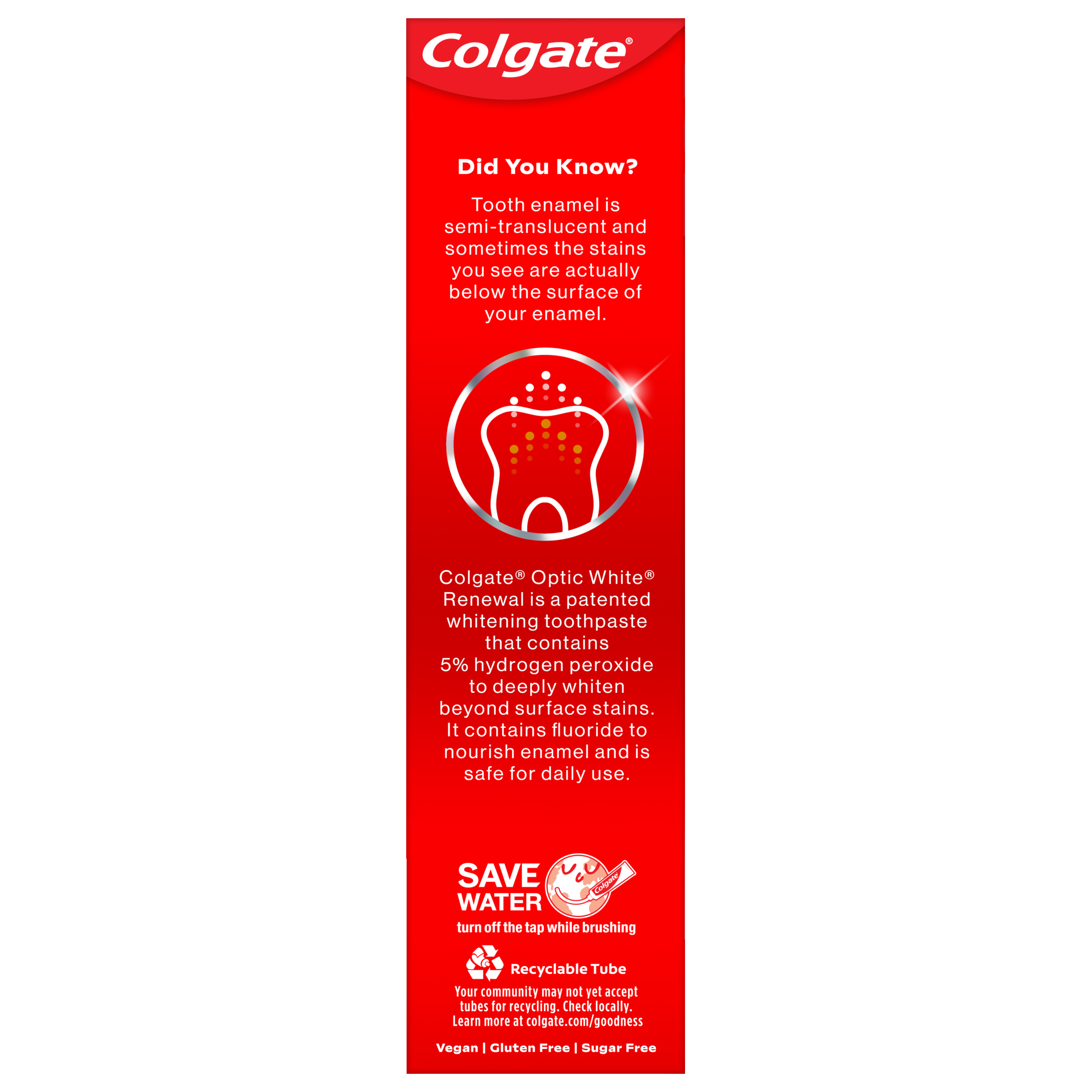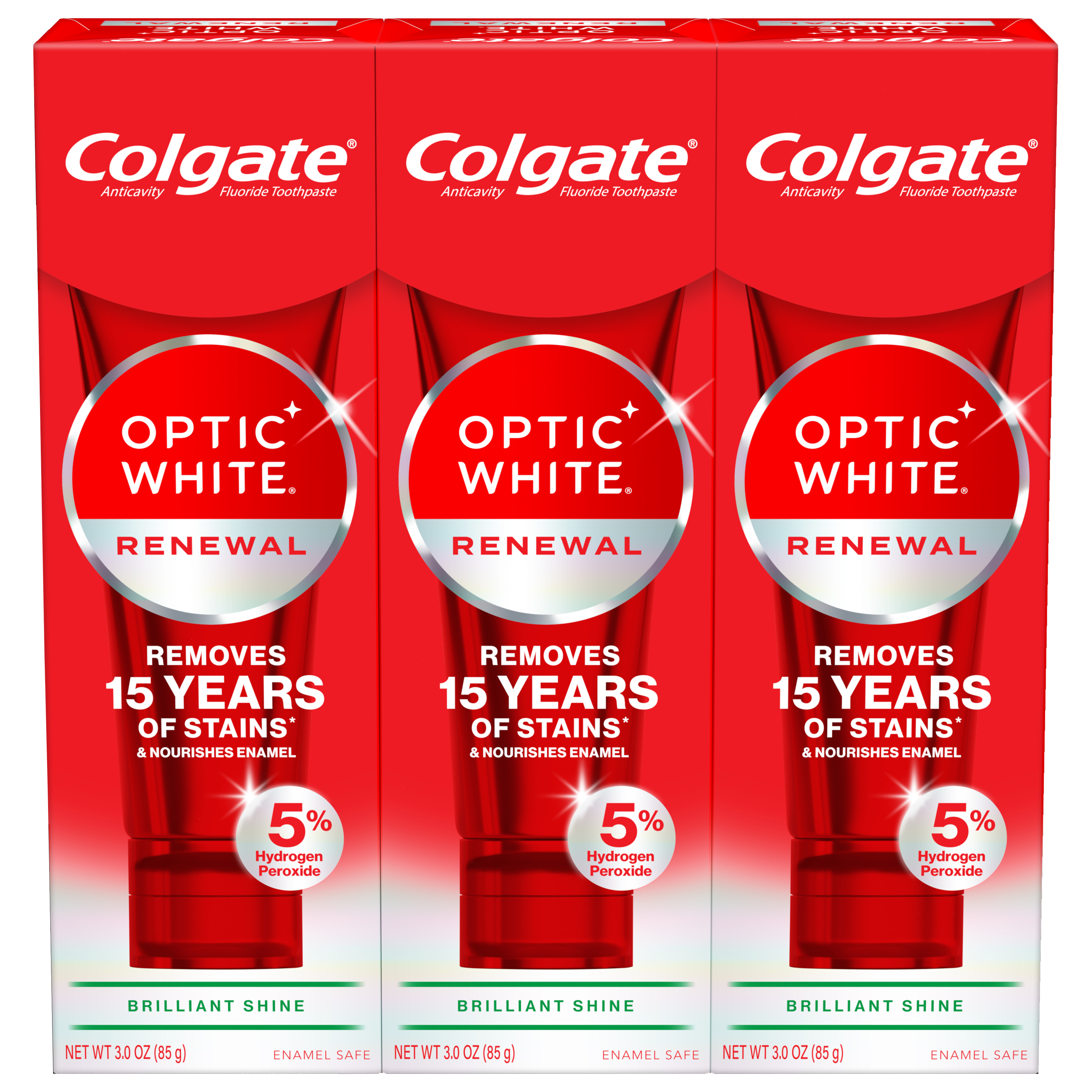 | Product Description | Welcome a brilliantly white smile with the Colgate Optic White Renewal Teeth Whitening Toothpaste. This 3 pack of whitening fluoride toothpaste removes 15 years of stains* and effectively removes tea, coffee, and wine stains. The patented whitening toothpaste contains 5% hydrogen peroxide to deeply whiten beyond surface stains to help you achieve a white smile. Colgate Optic White Renewal Brilliant Shine Toothpaste is a whitening toothpaste that contains fluoride to nourish enamel and is enamel-safe for daily use. This teeth whitening toothpaste is also an anticavity fluoride toothpaste to help prevent cavities. Deeply whiten beyond surface stains with the Colgate Optic White Renewal Toothpaste. Reveal a confident smile with the Colgate Optic White Renewal Teeth Whitening Toothpaste. Use this powerful whitening toothpaste to nourish your enamel and deeply whiten teeth. Colgate Optic White Renewal Brilliant Shine Toothpaste is a mint toothpaste that is gluten free, sugar free, and vegan. Unlock a white smile with the Colgate Optic White Renewal Teeth Whitening Toothpaste.