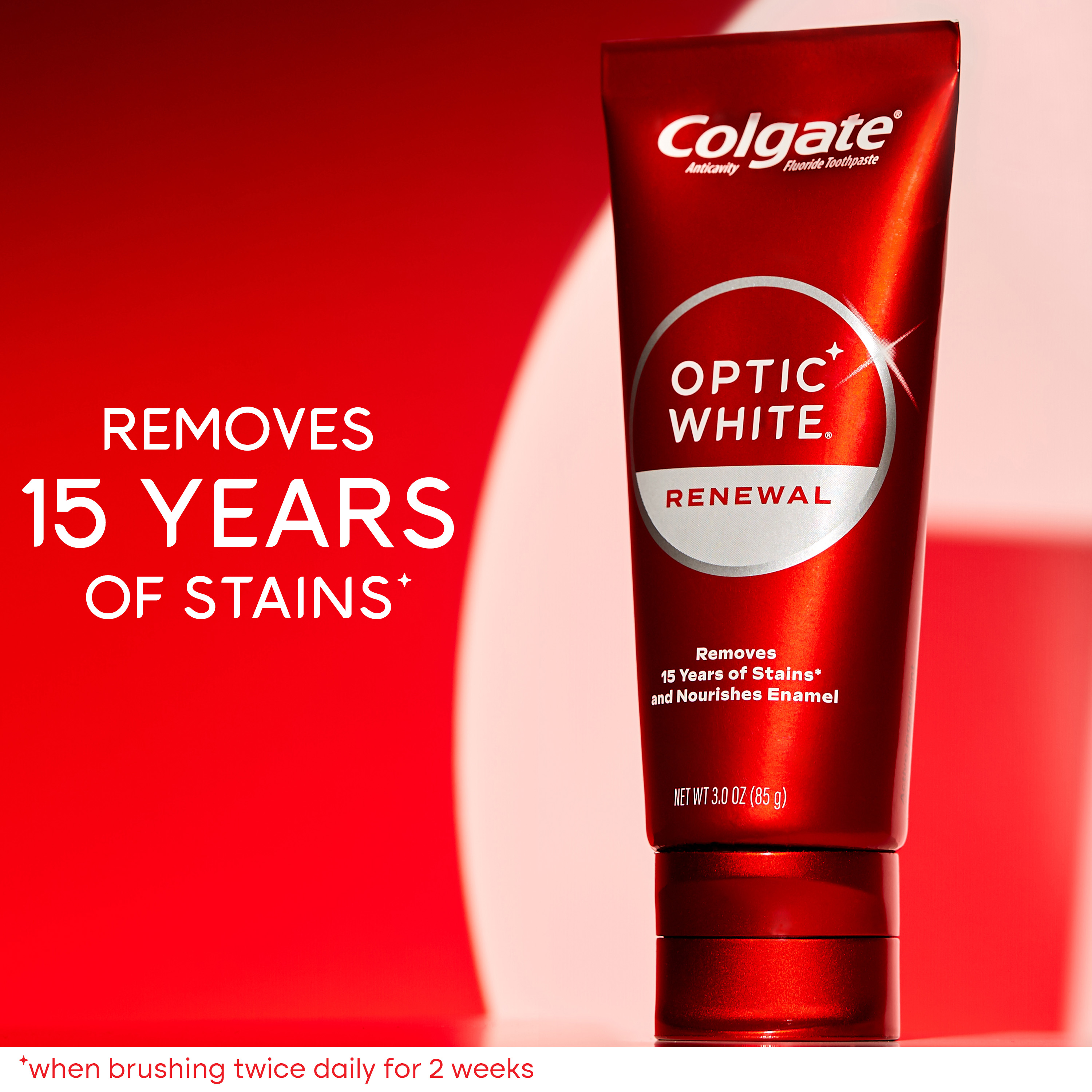 | Bullet 2 | Remove 15 years of stains* with the Colgate Optic White Renewal Toothpaste (*when brushing twice daily for 2 weeks) |