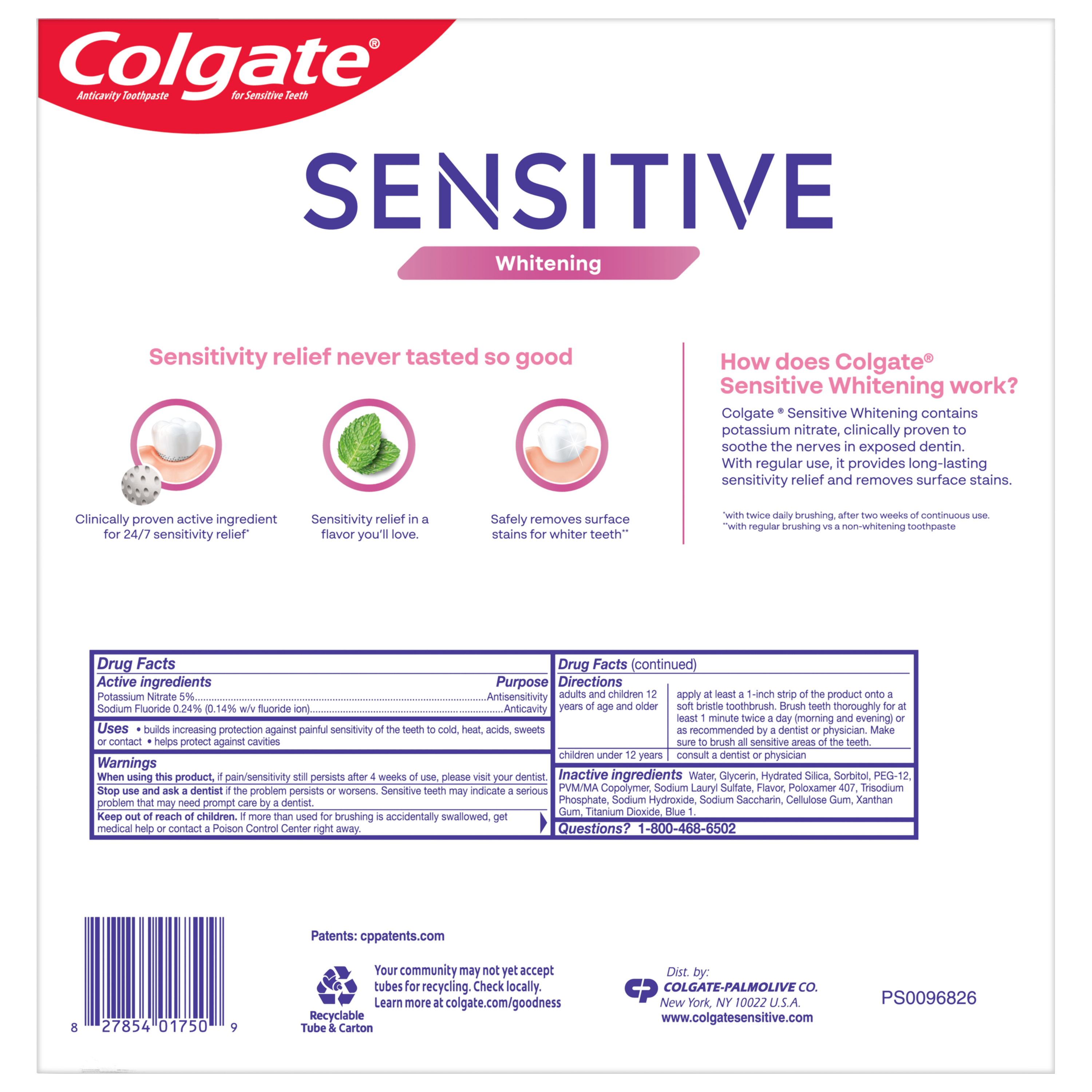 SKU 61044698 Consumer Unit - GTIN 00827854999997 Product Category Oral Care Product Sub Category Toothpaste Product Equity (Brand) Colgate Product Sub Brand Colgate Sensitive TP Product Title Colgate Sensitive Whitening Toothpaste, Cavity Protection Mint Toothpaste Gel, 6oz 4 Pack Product Description Colgate® Sensitive Whitening Toothpaste offers all the benefits of a whitening and sensitive toothpaste in one to start your everyday smile care routine. Brushing to restore a naturally brighter smile and getting clinically-proven sensitivity relief for your sensitive teeth pain should be anything but ordinary. This whitening fluoride toothpaste gel works to polish away surface stains, providing tooth whitening action all while leaving behind fresher breath. Experience a Brighter Smile Without Sensitivity* Daily brushing and flossing are essential habits if you want to prevent oral health issues like early gum disease and cavities. However, if you have sensitive teeth, the Colgate® Sensitive line of sensitive teeth toothpastes with sensitivity relief can help! Formulated to give your teeth 24/7 sensitivity protection** these antisensitivity toothpastes are the proven solution to reduce pain with long-lasting** sensitivity relief, cavity protection and refreshing flavor. Relief is never far away with our Colgate® Sensitive line of products. *Colgate® Sensitive toothpaste helps relieve sensitivity in up to 2 weeks with twice-daily brushing **with twice-daily brushing At Colgate, we make toothpaste that promotes healthy smiles. Not only because having a healthy smile is important to your overall health, but because when you have a healthy smile, you actually smile more – and that’s a powerful thing. Smiles are the simplest form of optimism, something we need now more than ever. That’s why we’re committed to raising oral healthcare standards everywhere. eCommerce Copy- Long Description Sensitivity relief never tasted so good with Colgate Sensitive Whitening Toothpaste Gel. This Clean Spearmint flavored fluoride toothpaste for sensitive teeth whitens teeth, offers 24/7 sensitivity relief*, and helps shield tooth enamel against erosion and cavities. This Colgate sensitive toothpaste pack contains potassium nitrate, a dentist recommended active ingredient for sensitivity relief. Potassium nitrate is clinically proven to offer long-term sensitivity protection.* Colgate Sensitive Whitening Spearmint Toothpaste is designed for daily use and safely removes surface stains for whiter teeth**. Because it’s formulated with 5% potassium nitrate, this sensitive toothpaste offers sensitivity relief that works so you can enjoy cold, hot, and sweet food and drinks. In addition to offering lasting sensitivity relief, this potassium nitrate toothpaste helps repair and protect teeth against the effects of acid erosion and helps prevent tartar buildup**. Help prevent bad breath, cavities, and tartar buildup*** while repairing weakened enamel and protecting against erosion with Colgate Sensitive Whitening Toothpaste. *with twice daily brushing after two weeks of continuous use **vs. a non-whitening toothpaste***with regular brushing Bullet 1 Four (4) 6oz Packs of Colgate Sensitive Whitening Toothpaste Bullet 2 Cavity protection sensitivity toothpaste that provides 24/7 sensitivity protection (with twice-daily brushing) Bullet 3 Builds protection against future sensitivity (with continued use and twice-daily brushing) Bullet 4 Cavity protection toothpaste freshens breath Bullet 5 Clinically proven sensitivity relief Active Ingredients Potassium Nitrate 5 % Sodium Fluoride 0.24 % (0.14% w/v fluoride ion)