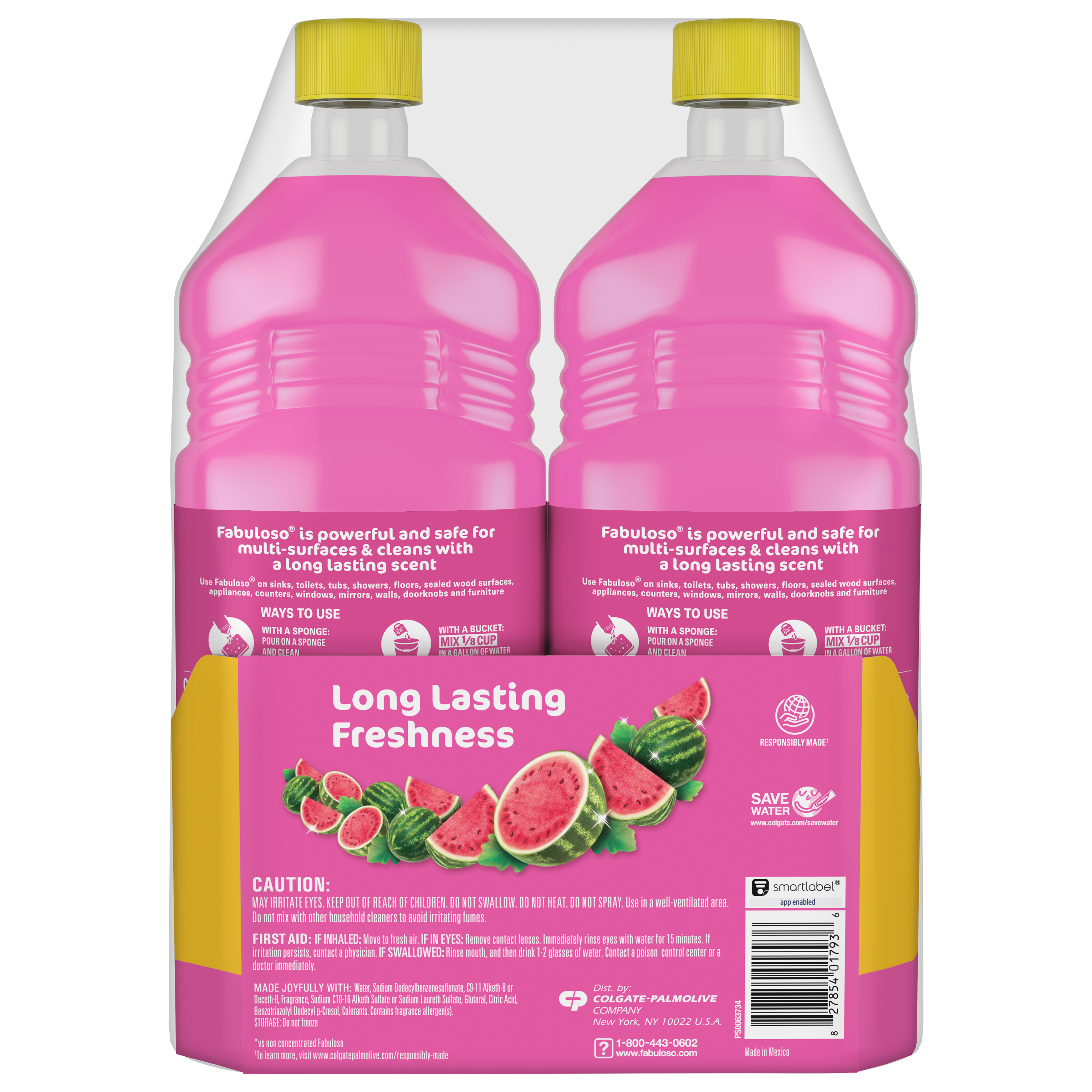 SKU 61044756 Consumer Unit - GTIN 00827854017936 Case - GTIN 10827854017933 Product Category Home Care Product Sub Category Cleaners Liquid / Gel Product Equity (Brand) Fabuloso Product Sub Brand Fabuloso Liq Cln Product Title Fabuloso® Multi-Purpose Cleaner, 2X Concentrated Formula, Watermelon Scent, 33.8 Fl Oz, 2 Pack Product Description Introducing Fabuloso 2X Watermelon with its watermelon scent, designed to make your cleaning routine as fun and refreshing as a fresh cut watermelon at a summer picnic. This vibrant pink cleaner will transform your cleaning experience, leaving your home smelling like a warm summer day. Fabuloso Multi-Purpose Cleaner is the perfect solution for anyone looking for an effective way to keep their home clean and smelling great. Whether used as a bathroom cleaner, kitchen cleaner, or floor cleaner, the long lasting watermelon scent will fill your home with joy. Our multi-purpose cleaner cuts through grease, grime, and dirt. Its easy-pour bottle delivers a colorful and satisfying pour every time. We understand that life isn't always easy, but cleaning it up can be with Fabuloso multi-purpose cleaner. Our 2X concentrated formula provides 2x more active ingredients vs our non-concentrated Fabuloso Original. It's important to use Fabuloso cleaning products safely, please follow the instructions on the label. Mix 1/8 cup in a gallon of water or pour on a sponge and clean. Enjoy the pink burst of vibrant watermelon fragrance as you clean, turning your chores into a delightful, paradise escape. Bullet 1 Two 33.8 Oz Bottles of Fabuloso Multi-Purpose Cleaner, 2X Concentrated Formula, Watermelon Scent Bullet 2 2X concentrated formula provides 2X more active ingredients compared to non-concentrated Fabuloso Original Bullet 3 Powerful and safe for multi-surfaces and cleans with a long lasting watermelon scent that brings a touch of sweet summer to your home Bullet 4 Our multi-purpose cleaner cuts through grease, grime, and dirt. Great to use in the bathroom or kitchen Family Dollar RPC 1497800
