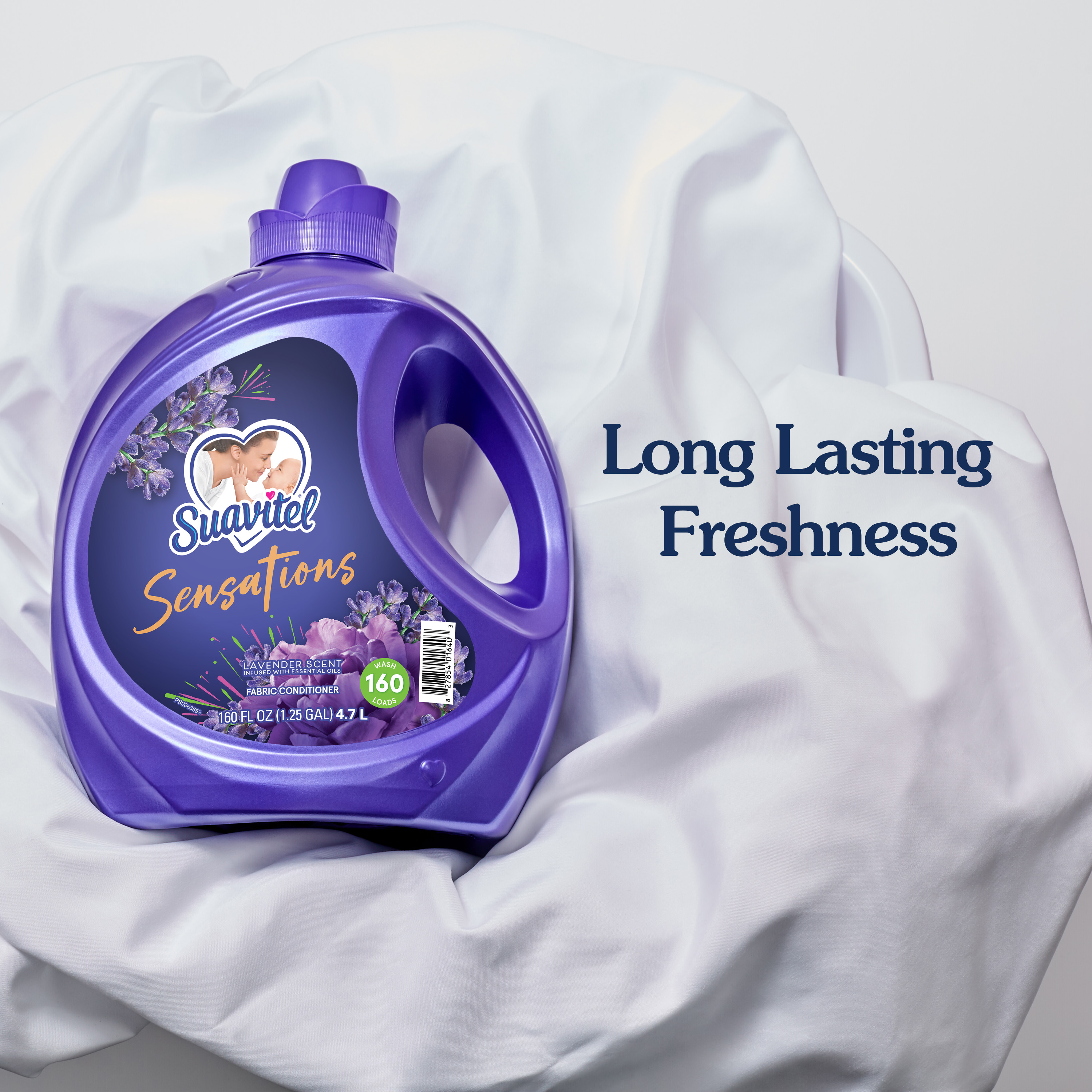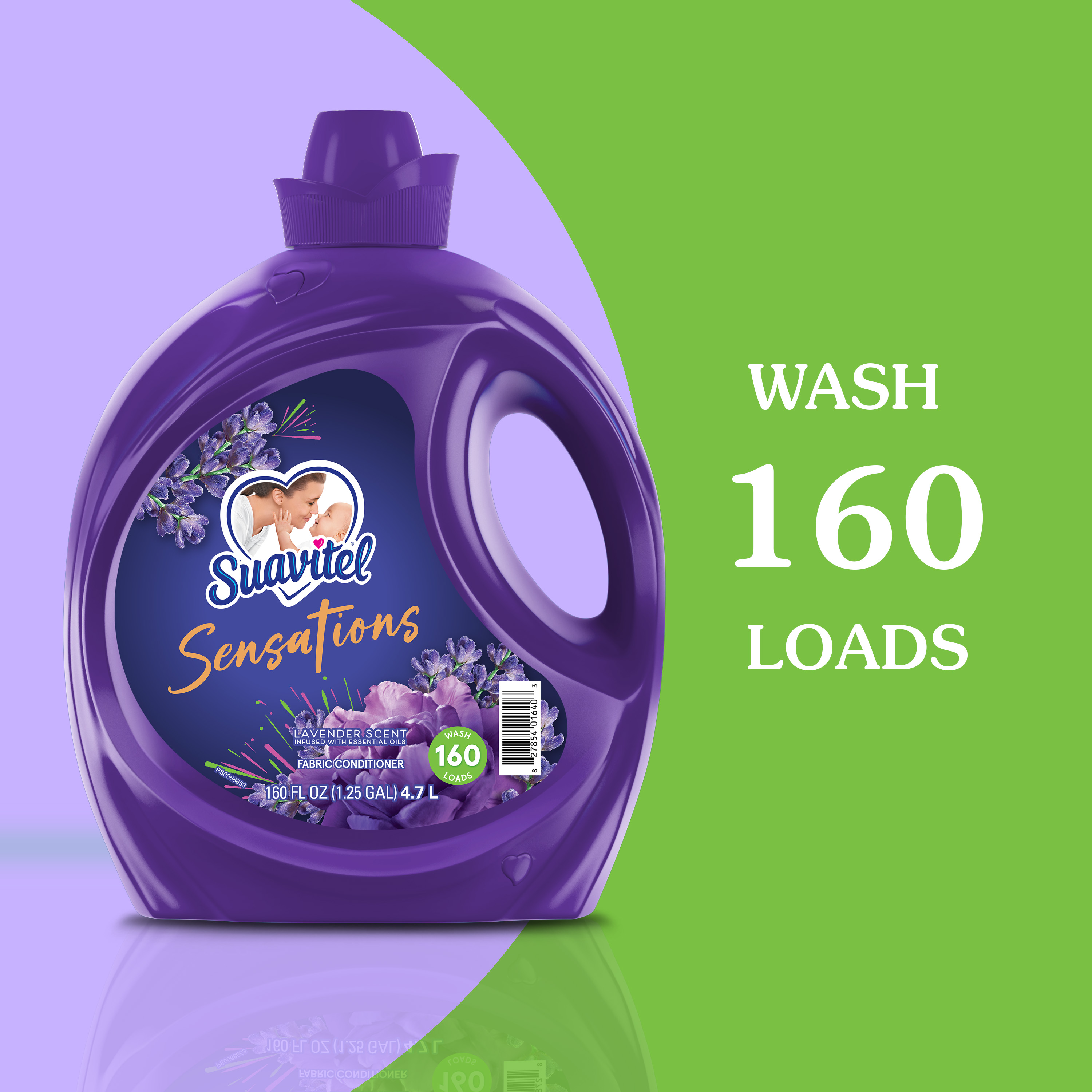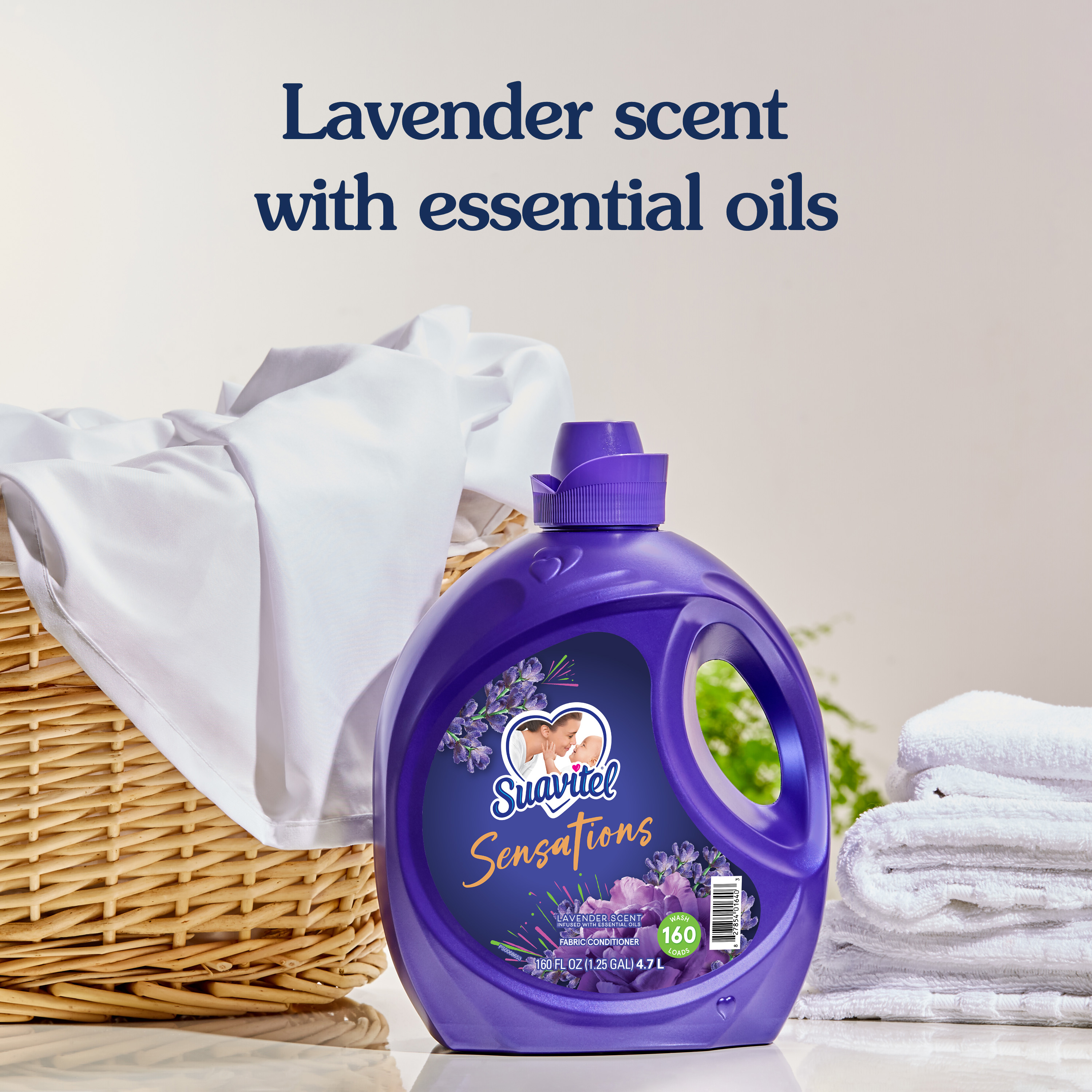 SKU 61044819 Consumer Unit - GTIN 00827854016403 Product Category Home Care Product Sub Category FC Liquids Product Equity (Brand) Suavitel Product Sub Brand Suavitel Liq FC Product Title Suavitel Sensations Lavender Fabric Softener - 160oz eCommerce Copy- Long Description Experience the irresistible softening power of Suavitel Sensations Liquid Fabric Conditioner, enriched with a captivating Lavender scent with essential oils. Each bottle is designed to elevate your fabric care routine, merging irresistible softening and freshness with each wash. This liquid fabric softener not only ensures your clothes and linens emerge supremely soft but also imbues them with long lasting freshness that endures well beyond the laundry room. Ideal for up to 160 wash loads*, our unique formula keeps each load feeling fresh and smelling delightful. Embrace the sensory delight of Suavitel Sensations and allow the long lasting freshness to transform your daily routine into an expression of love for your wardrobe, making every wash a testament to the quality and care you expect. Indulge in the luxury of softness and scent that lingers, making every piece of fabric feel cherished and refreshed. Whether you're freshening up your everyday wear, bed linens, or special garments, this fabric conditioner provides a touch of luxury with every cycle, ensuring your textiles maintain their texture and color vibrancy. Trust in Suavitel to deliver exceptional fabric care, leaving your laundry not only softer but also wonderfully infused with the essence of nature. *1 wash load = 1 fl. oz