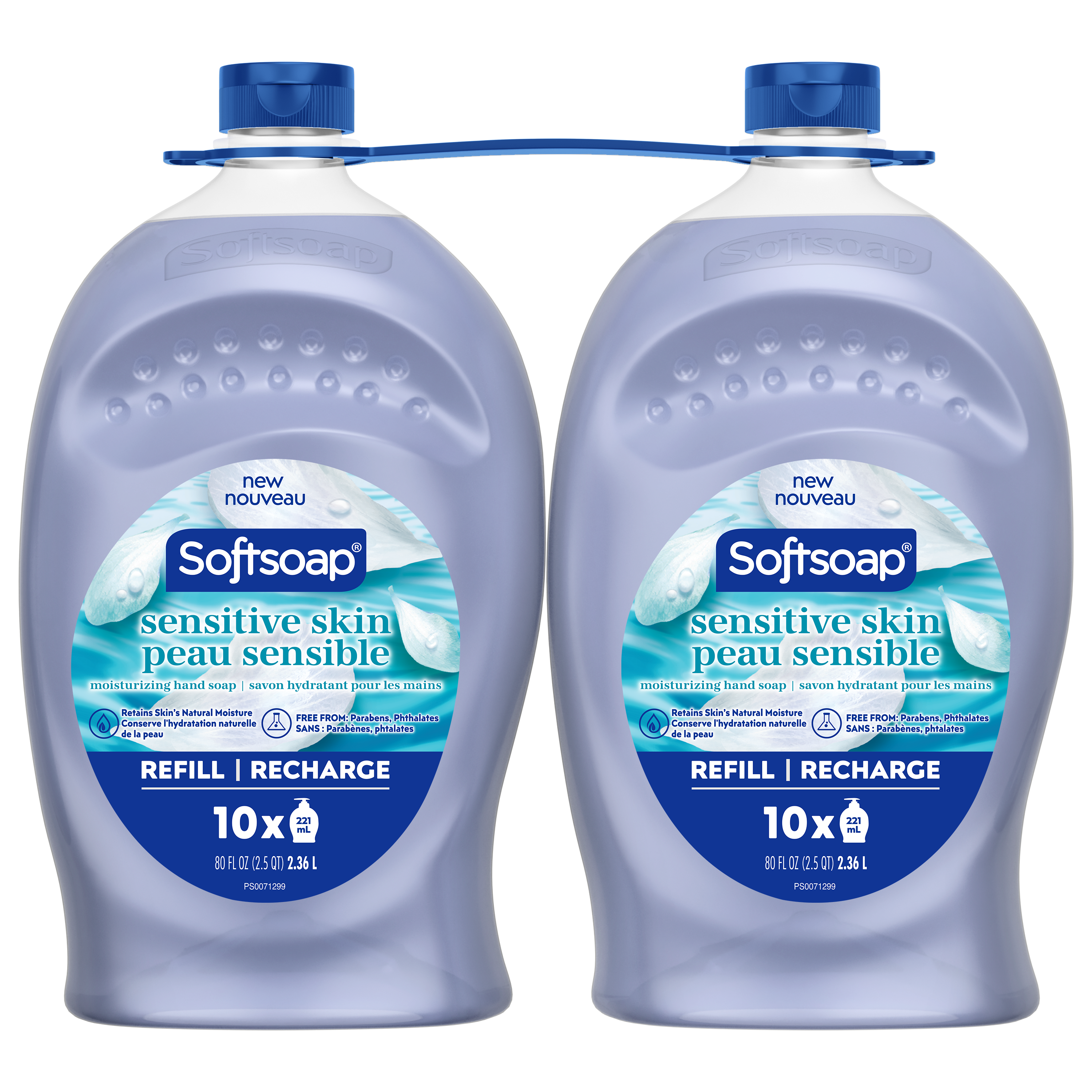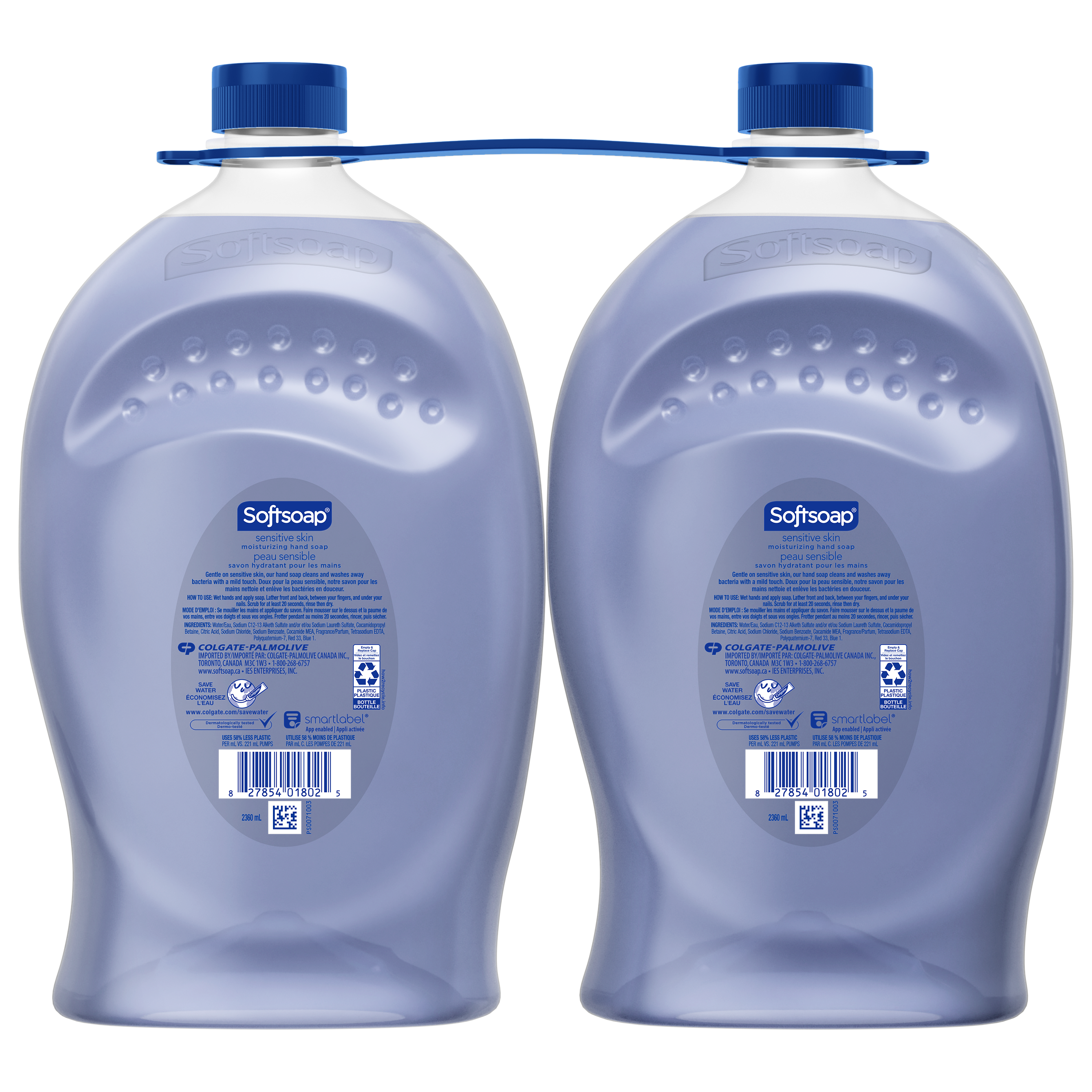 SKU 61044859 Consumer Unit - GTIN 00827854018025 Product Category Personal Care Product Sub Category Liquid Hand Wash Product Equity (Brand) Softsoap Product Sub Brand Softsoap LHW Product Title Softsoap Sensitive Skin Liquid Hand Soap Refill Bottle, Moisturizing Hand Soap, 2 Pack, 2.36 L Product Description From Canada’s #1 liquid hand soap brand (1) comes Softsoap Sensitive Skin liquid hand soap. Gentle on sensitive skin, our hand soap cleans and washes away bacteria with a mild touch. Two 2.36 L of liquid hand soap refill bottles are included in this package so you can have fresh scents on hand when you need a refill. Each refill bottle holds enough liquid to refill a standard 221 mL liquid hand soap pump bottle 10x. Whether you use them to restock your kitchen hand soap bottle or your bathroom soap bottles, Softsoap Sensitive Skin Hand Soap is a delightful way to enjoy a light, fresh scent. This dermatologically tested and pH balanced hand soap washes away bacteria, helps retain skin’s natural moisture, and is paraben-free and formulated without phthalates. Health care agencies recommend washing hands with soap and clean running water for 20 seconds to wash away dirt and bacteria. These refreshing liquid hand soap refill bottles are great for the kitchen, bathroom, or anywhere else you want to add a touch of freshness to your routine. (1) Based in part on data reported by Nielsen through its Market Track Service for the Liquid Hand Soap Category for the 52 week period ending 31/7/24, for the All Outlet market. Copyright © 2024 Nielsen. Bullet 1 Two 2.36 liter refill bottles of Softsoap Sensitive Skin Liquid Hand Soap Bullet 2 Each refill bottle holds enough hand soap to refill a standard 221 mL liquid hand soap pump bottle 10x Bullet 3 Gentle on sensitive skin, our hand soap cleans and washes away bacteria with a mild touch Bullet 4 Canada’s #1 Liquid Hand Soap Brand (1) Bullet 5 Dermatologically tested hand soap formula helps retain skin’s natural moisture Bullet 6 Paraben-free and formulated without phthalates with a gentle scent for sensitive skin Bullet 7 Versatile liquid hand wash soap refill bottles for the kitchen, bathroom or any other space